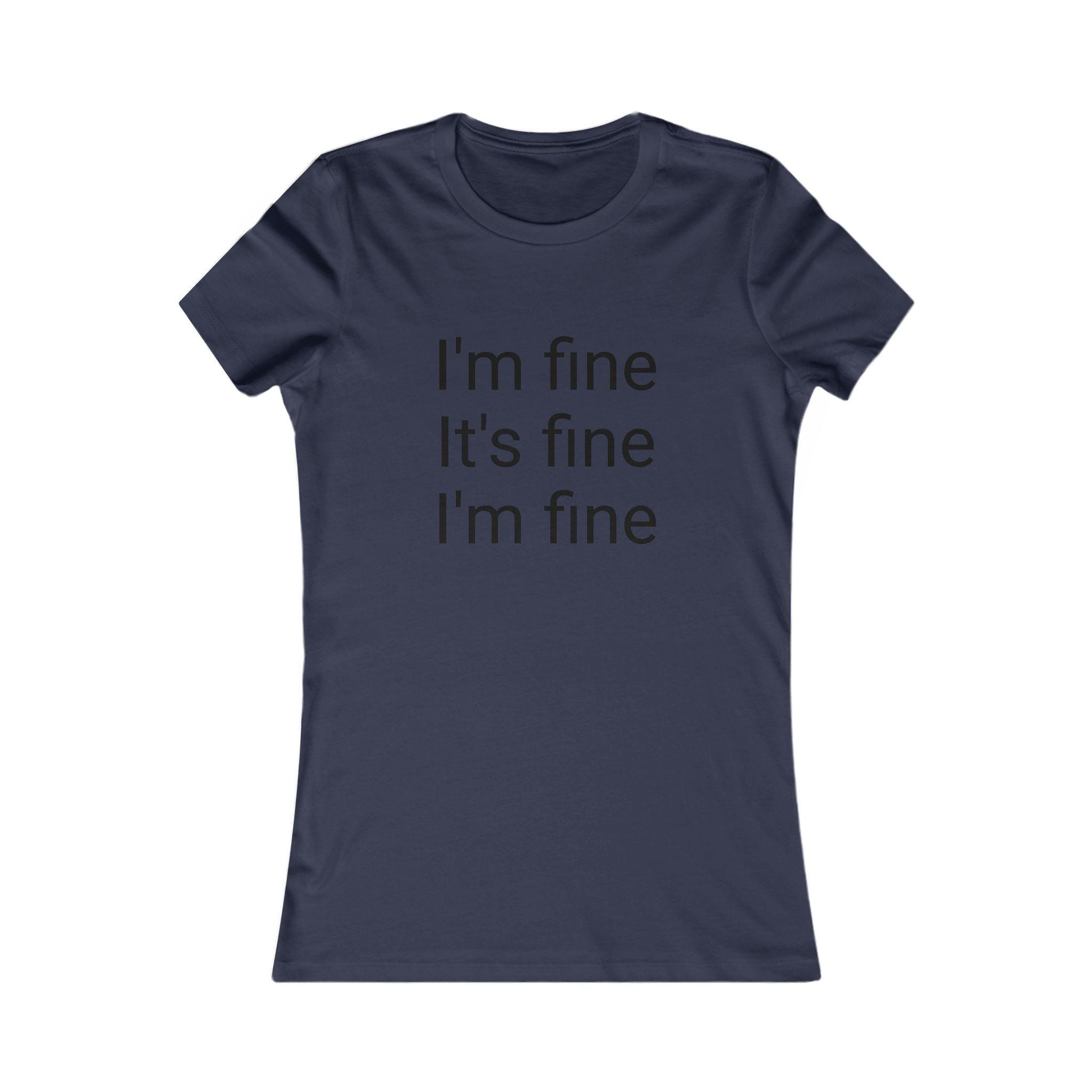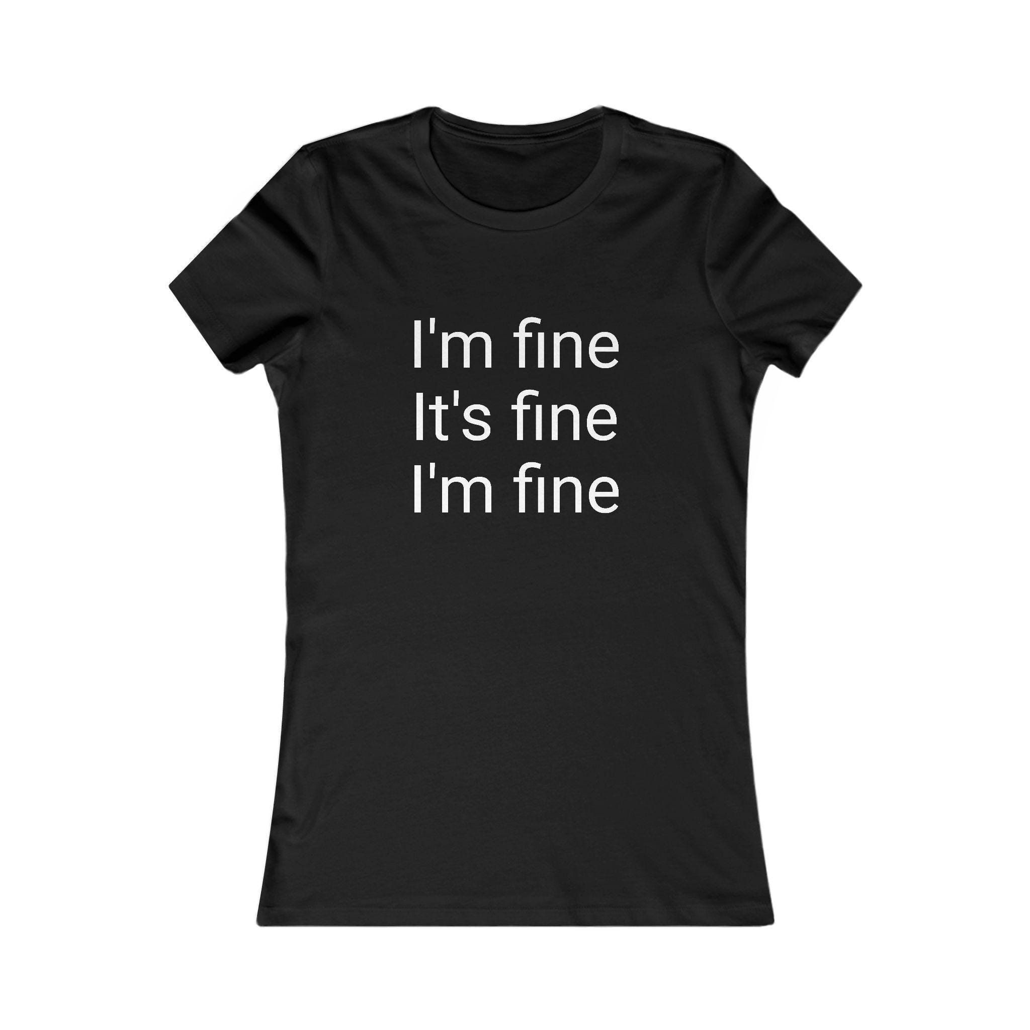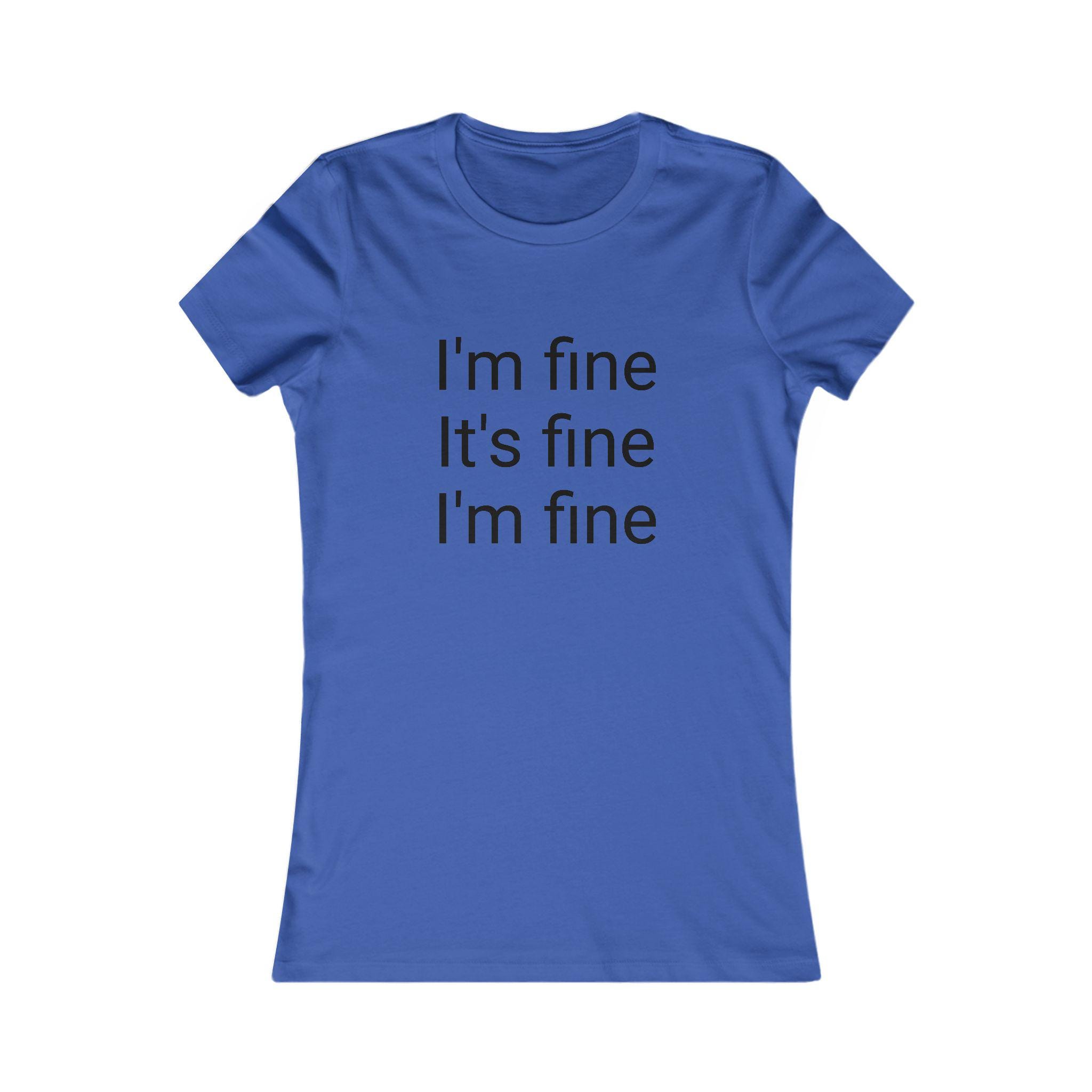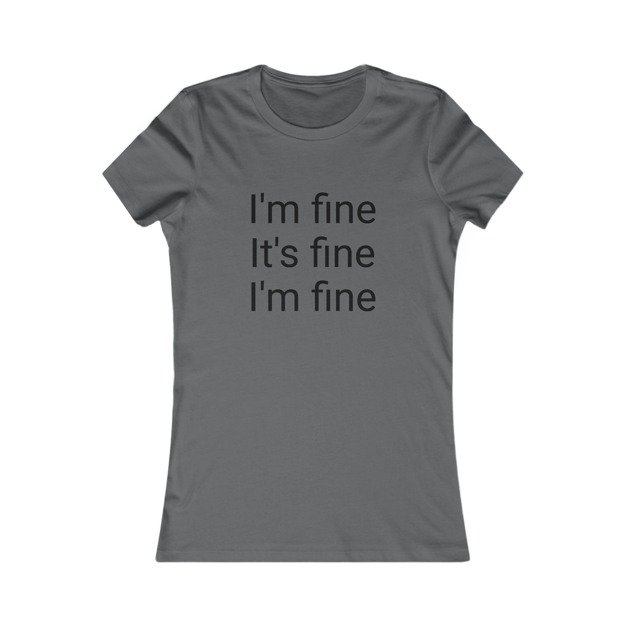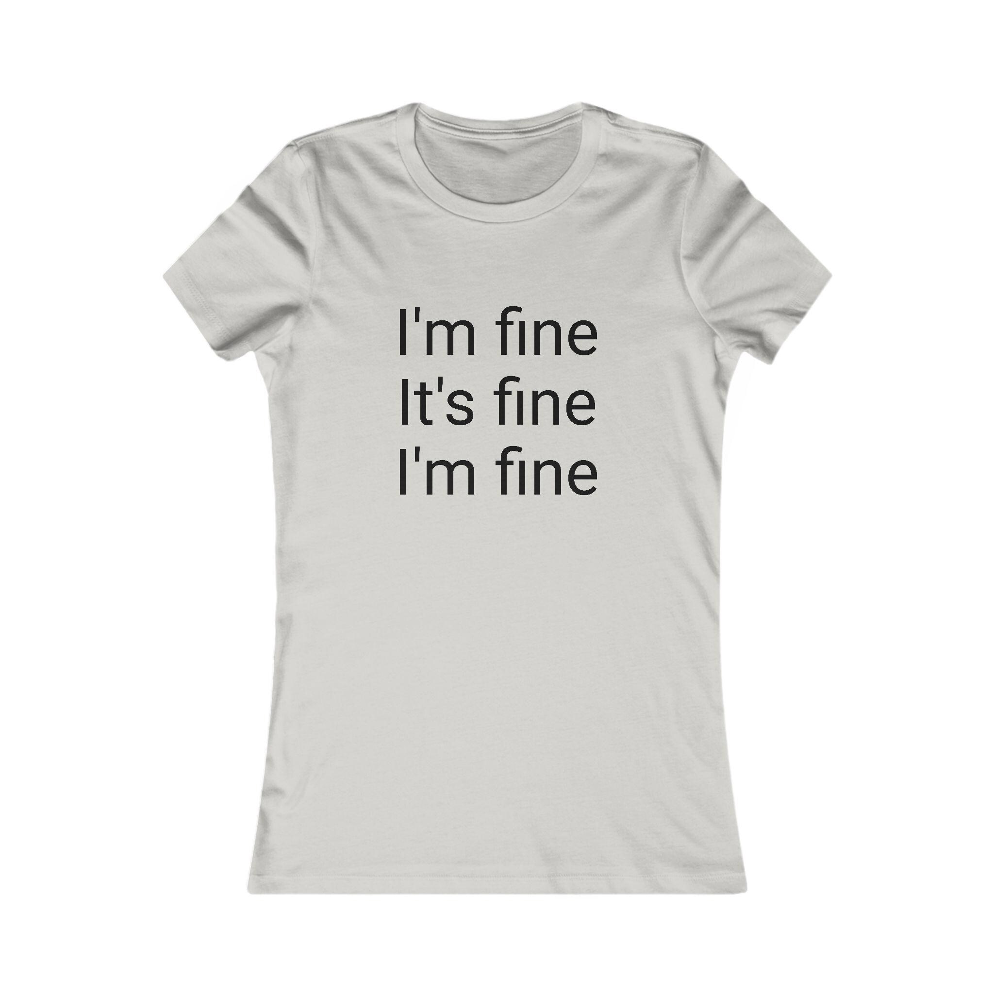 This Women's Favorite Tee features a humorous design that says 'I'm fine, It's fine, I'm fine'. It is made of 100% airlume combed and ringspun cotton, with a slim fit and longer body length. Perfect for women looking for a comfortable and stylish tee to wear in casual settings or as loungewear. Great for those who appreciate a touch of humor in their wardrobe. Ideal for everyday wear, lounging at home, or as a casual outfit for running errands or meeting up with friends. Suitable for adults and perfect for gifting on birthdays, holidays, or as a fun surprise for a friend.