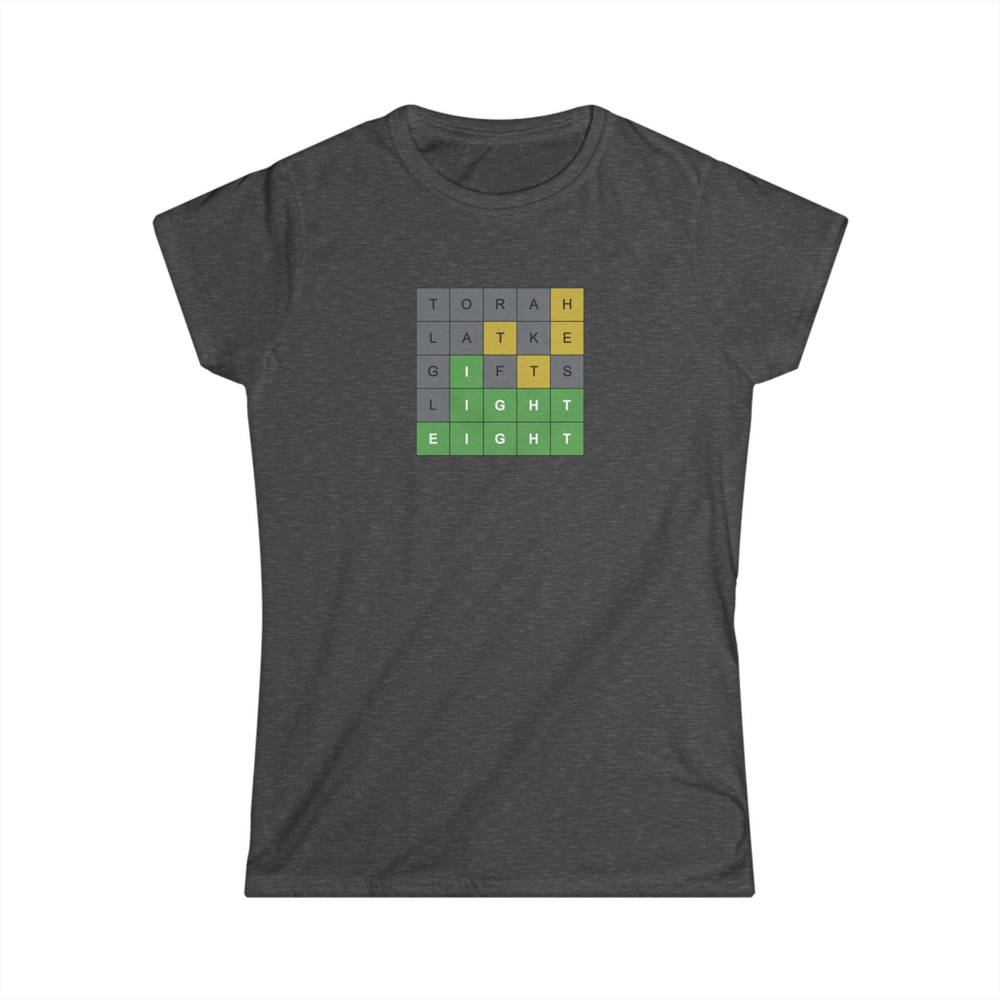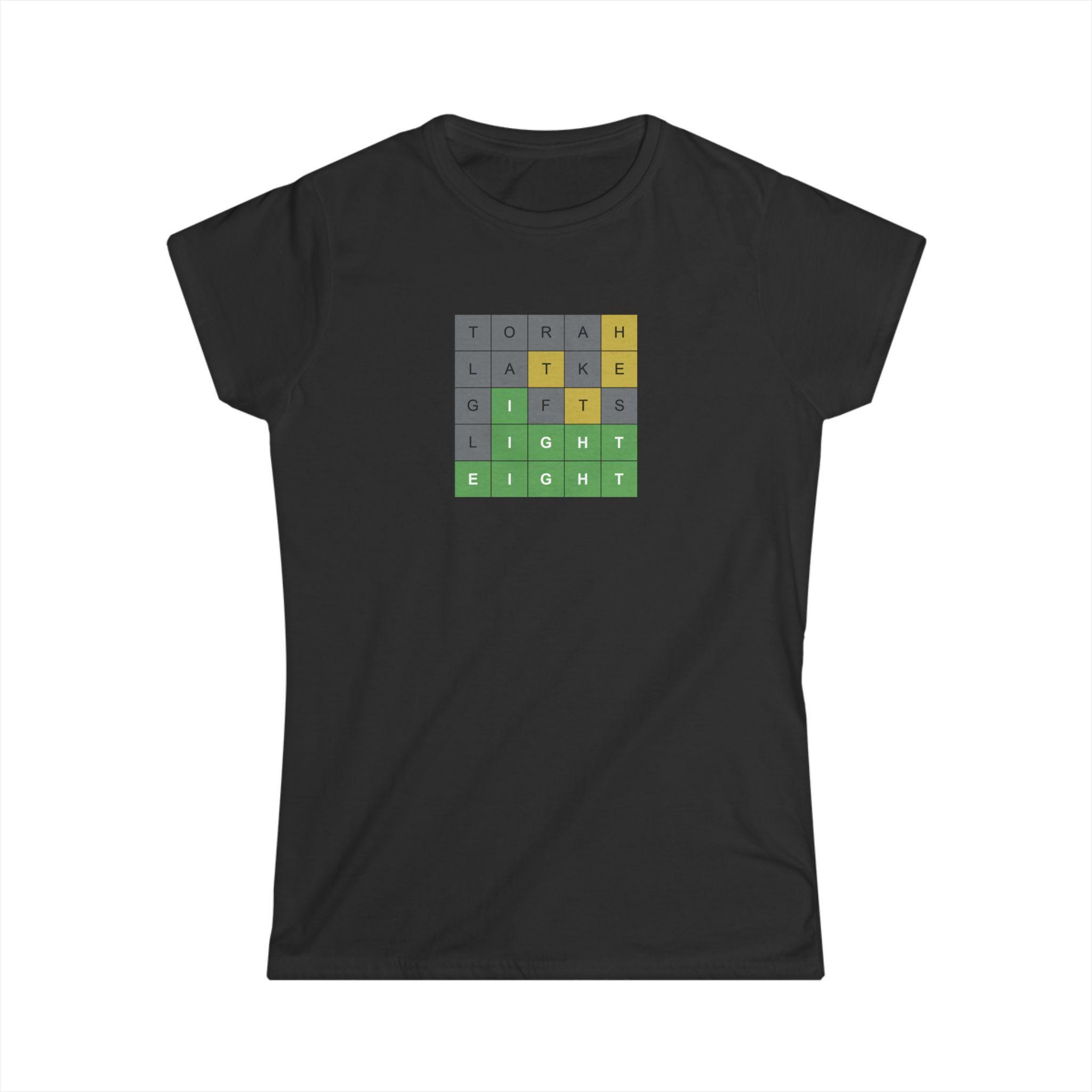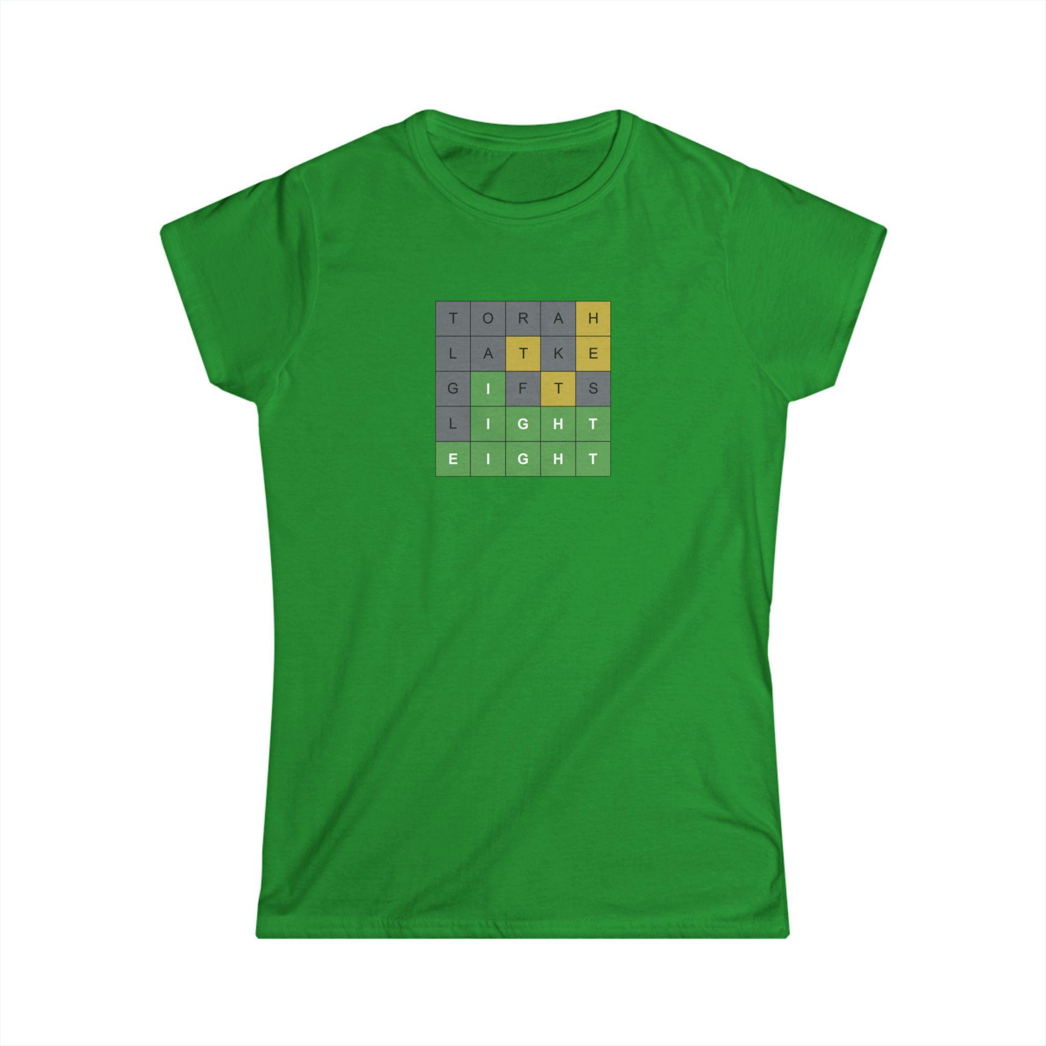 Celebrate Hanukkah in style with this Women's Softstyle Tee featuring a Wordle design. This semi-fitted tee is made of light fabric and runs true to size, perfect for adults looking for a comfortable and festive shirt to wear during the Hanukkah holiday.
