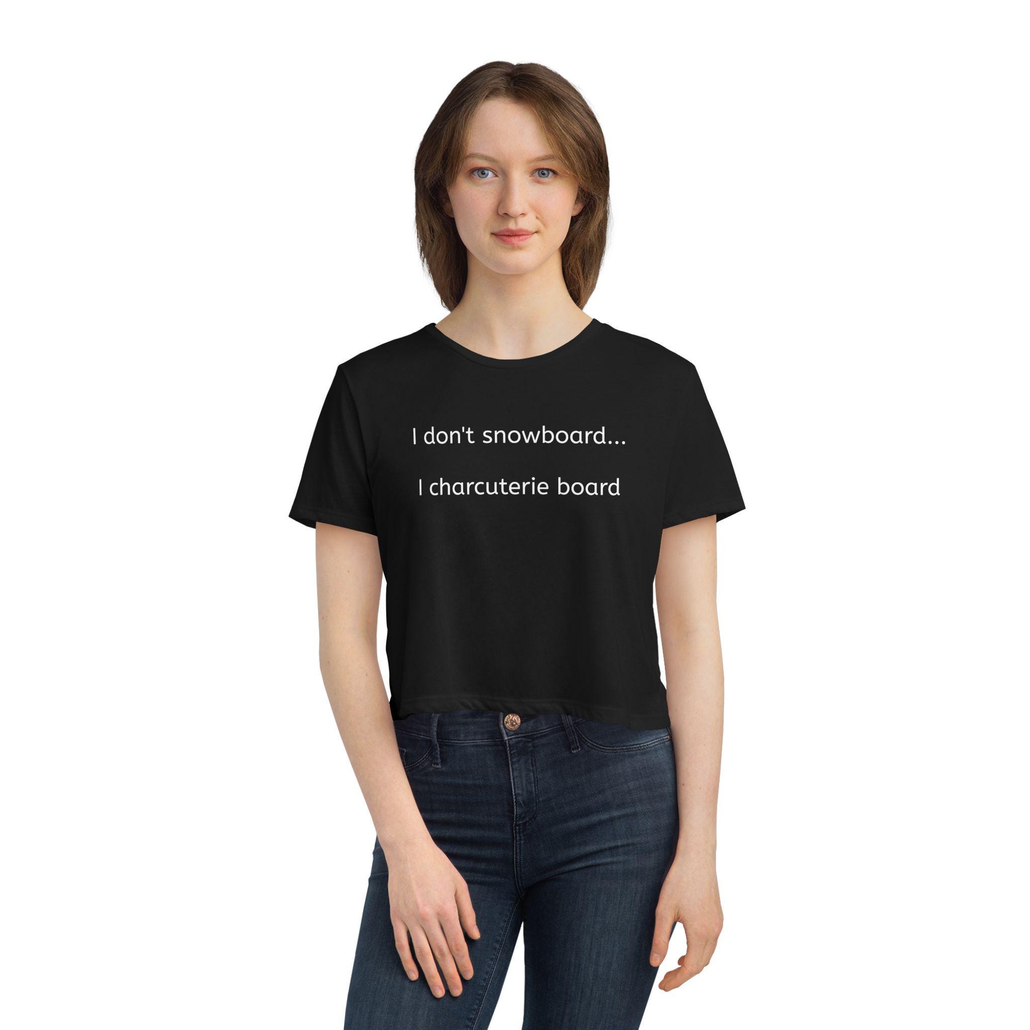 This Women's Flowy Cropped Tee features the humorous phrase 'I don't snowboard I charcuterie board'. The flowy fit and modest crop give it a casual and trendy vibe, perfect for lounging or pairing with high-waisted bottoms. Ideal for women who enjoy charcuterie boards and have a playful sense of humor. Great for casual gatherings, wine nights, and girls' nights in.
