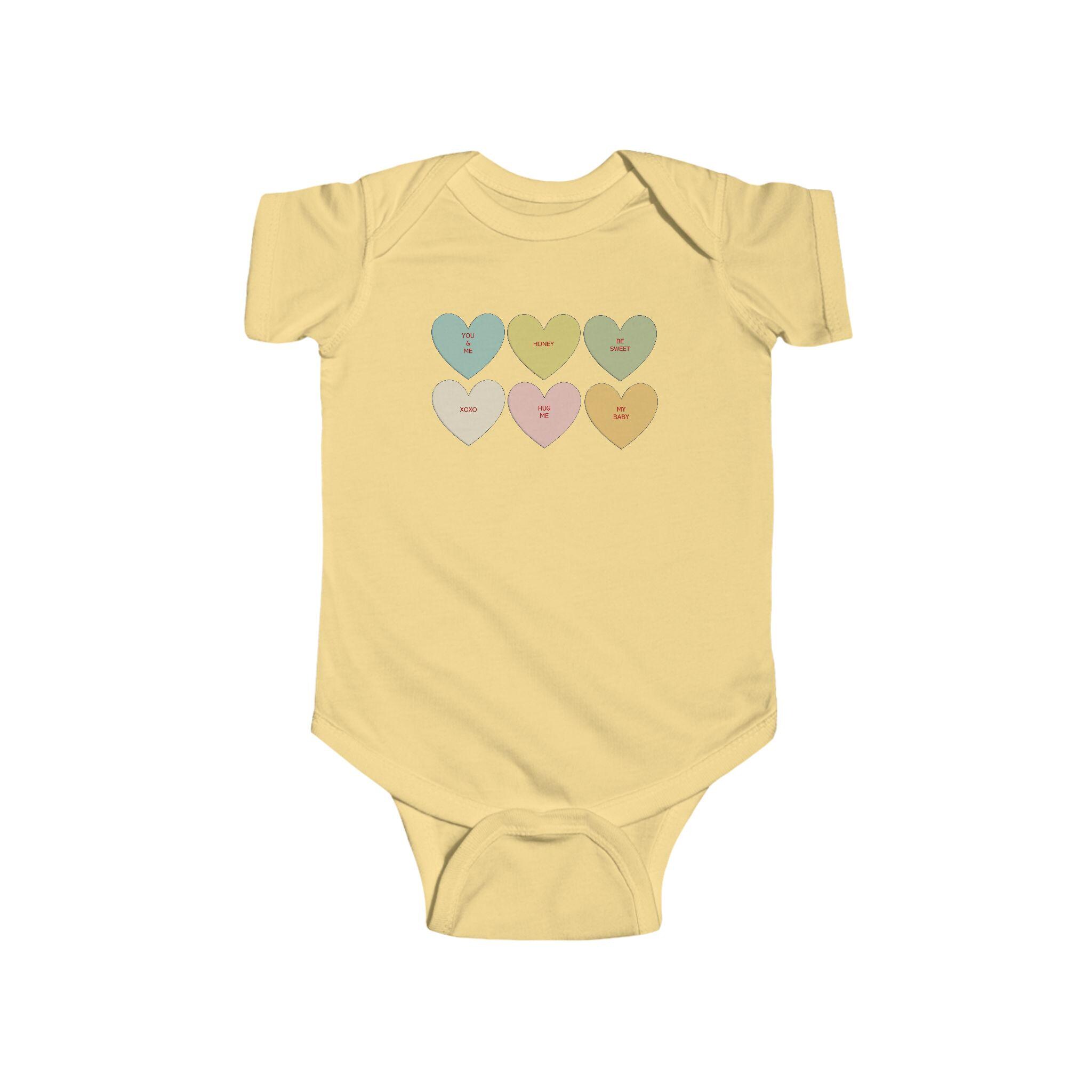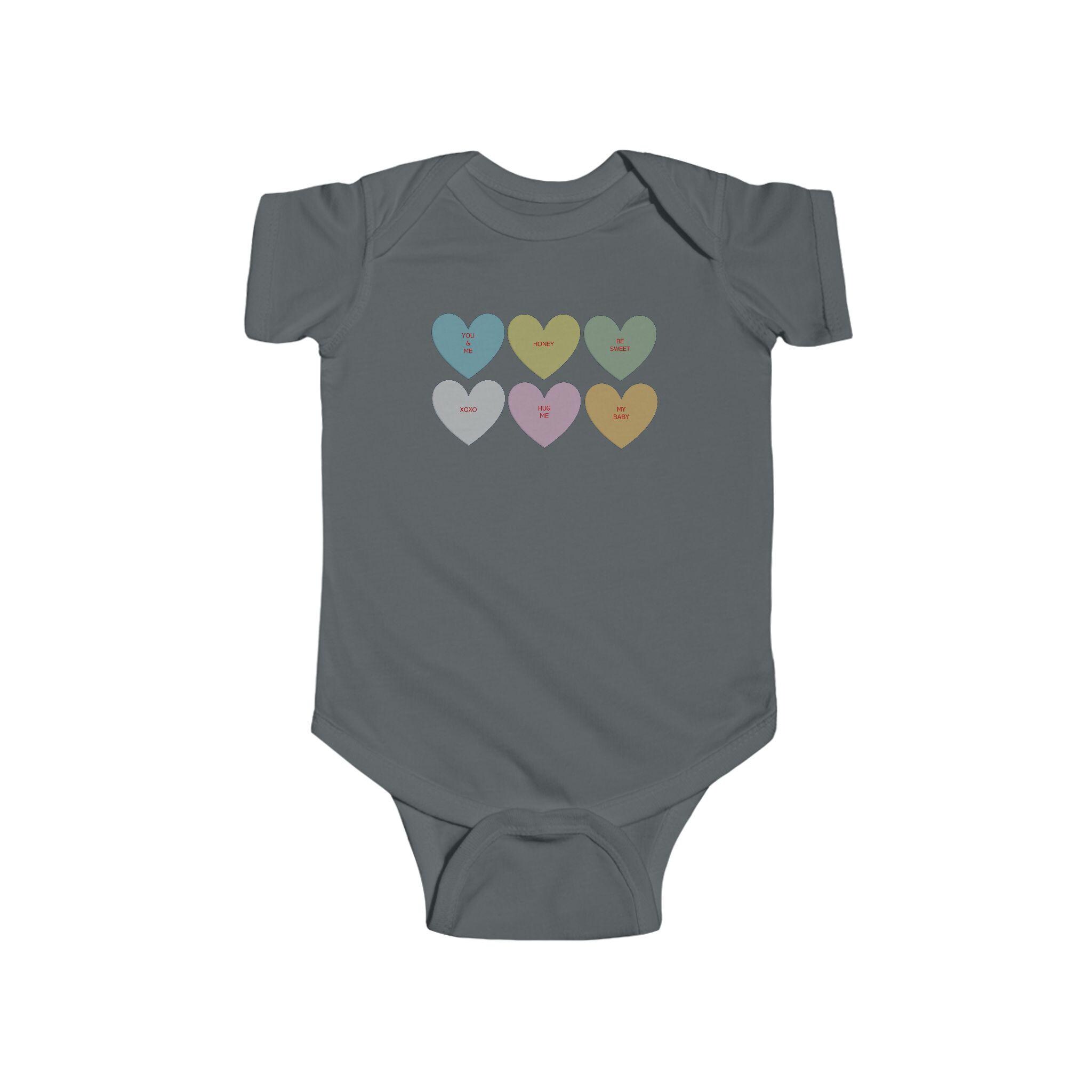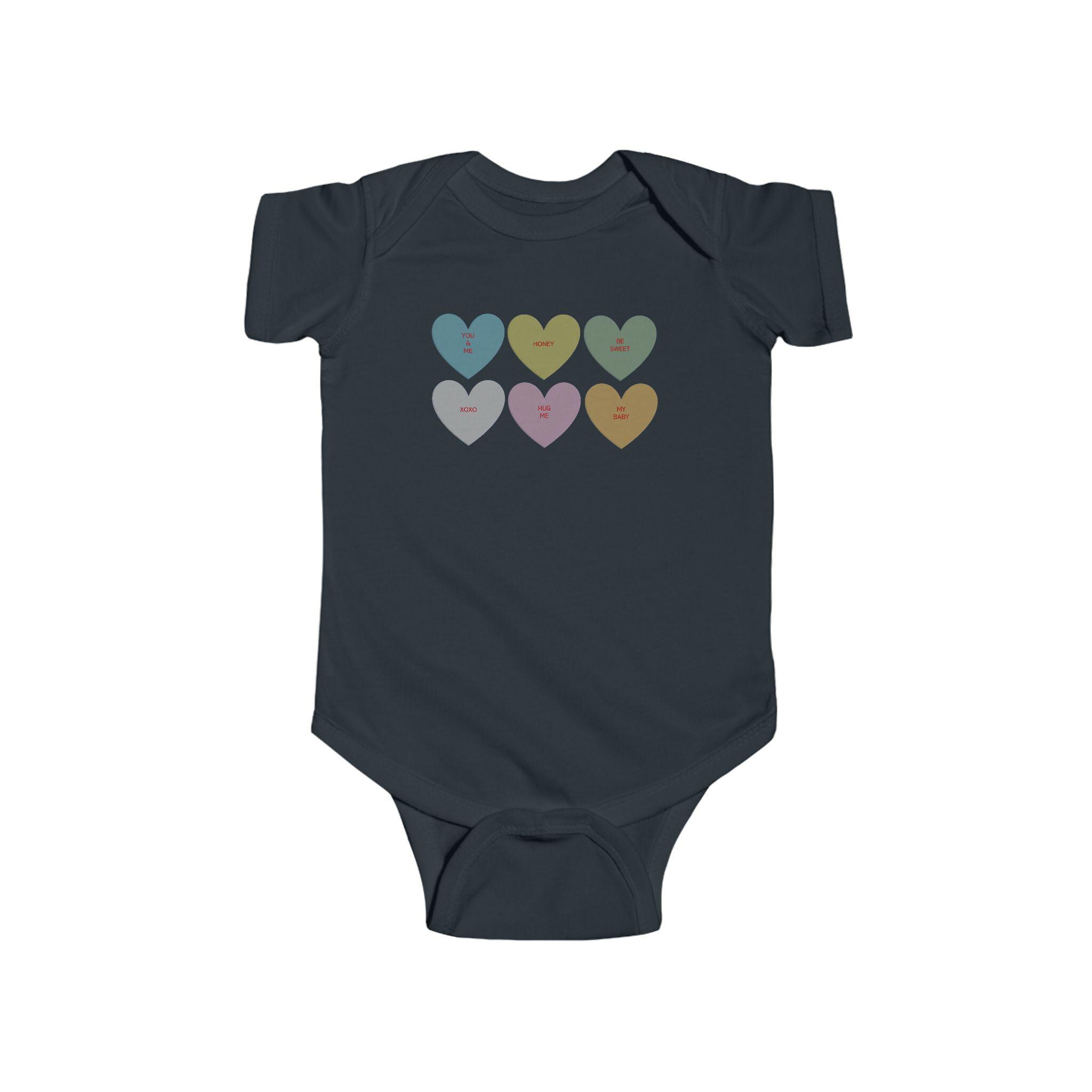 Little hearts and tiny declarations — this infant bodysuit brings Valentine’s sweetness into everyday moments. Soft, light fabric wraps a baby in gentle comfort while candy-heart graphics speak in short, sincere phrases. It’s the kind of piece parents reach for when they want a photo-ready outfit for a date-night at home, a family card, or to tuck under a cardigan for a neighborhood stroll. Quietly durable construction and thoughtful details mean it survives washes and tumbles without losing its shape or softness. Breathable cotton keeps newborn skin comfortable, while the ribbed neck and snap closure make diaper changes quick and fuss-free. Let this bodysuit be the small, joyful touch that carries the feeling of the holiday into ordinary days.