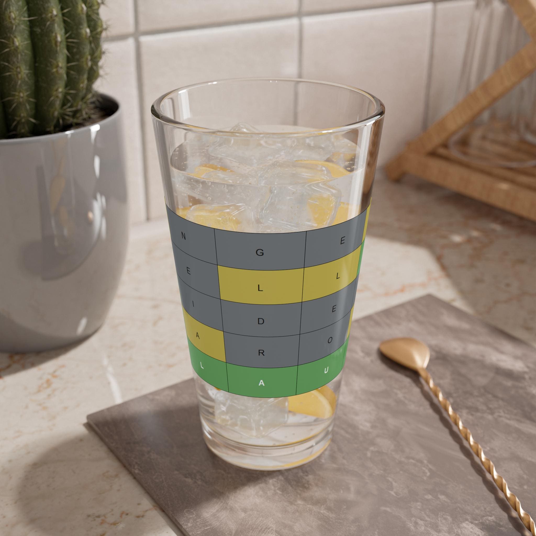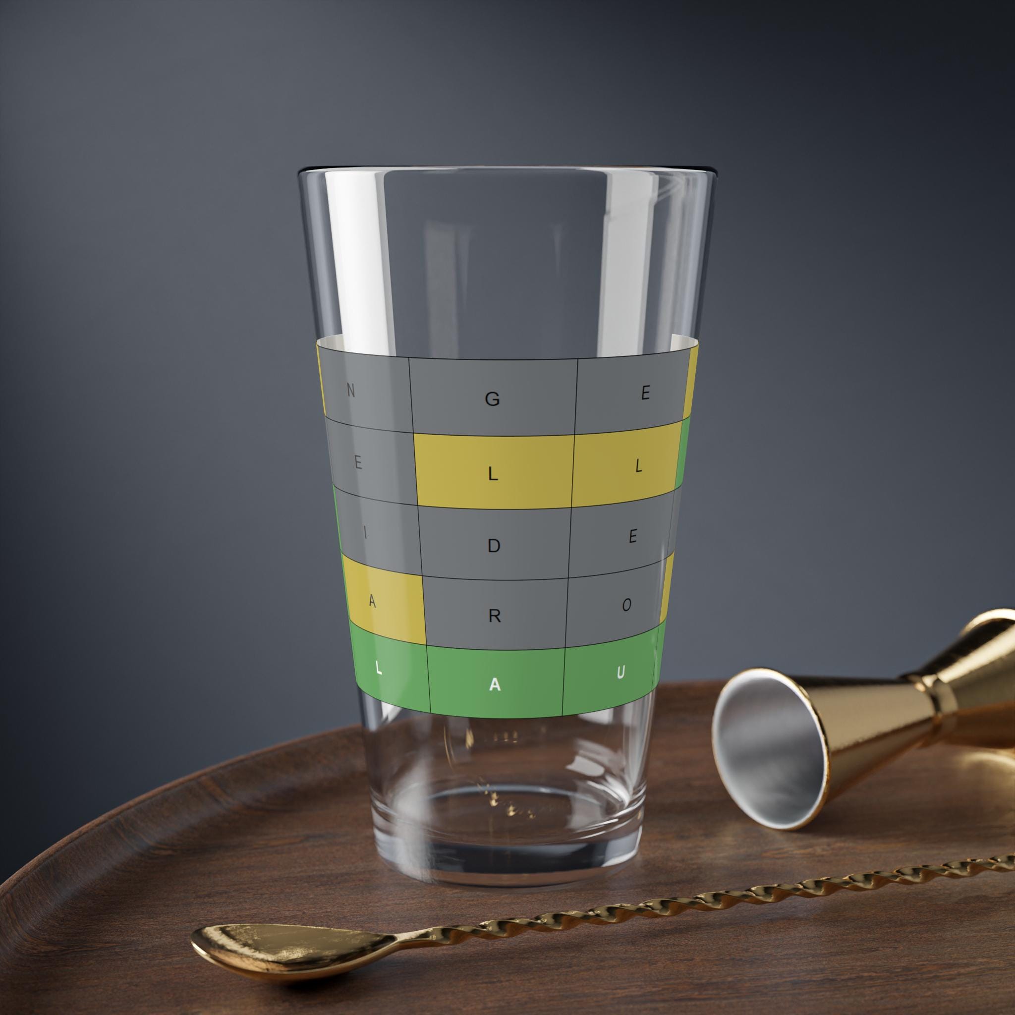 This 16oz mixing glass brings warm, festive energy to holiday evenings. The Christmas Wordle artwork pops in bright, durable color on clear glass, so each sip feels playful and intentional. It sits solidly in the hand thanks to a heavy base, whether you’re stirring a stirred cocktail, measuring ingredients, or using it as an everyday drinking glass. It’s built to handle the bustle of seasonal gatherings — dishwasher-safe and made from sturdy clear glass so the colors stay crisp through many washes. Keep it on the bar cart during caroling and cookie swaps, or set it out while you puzzle through Wordle with friends and a glass in hand.