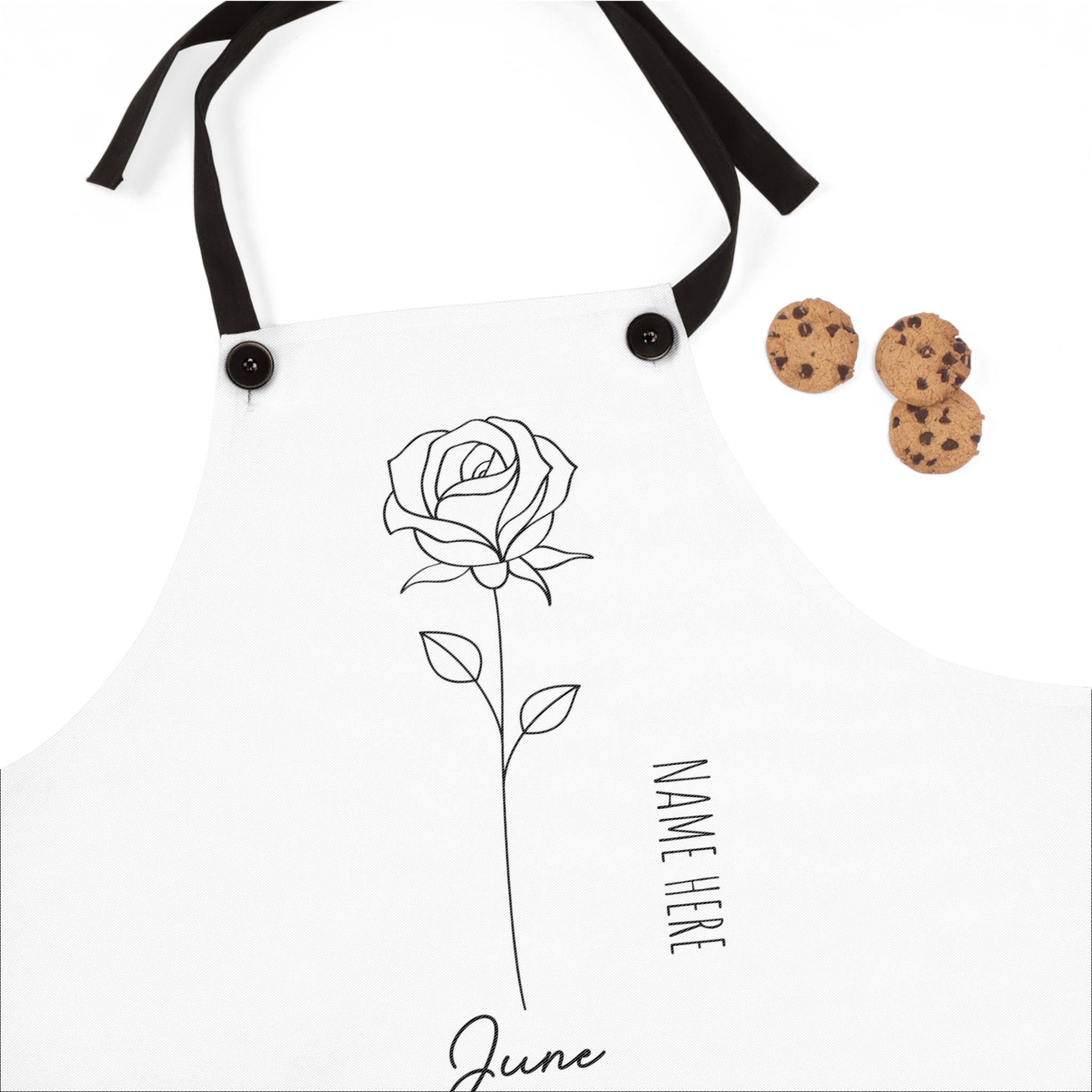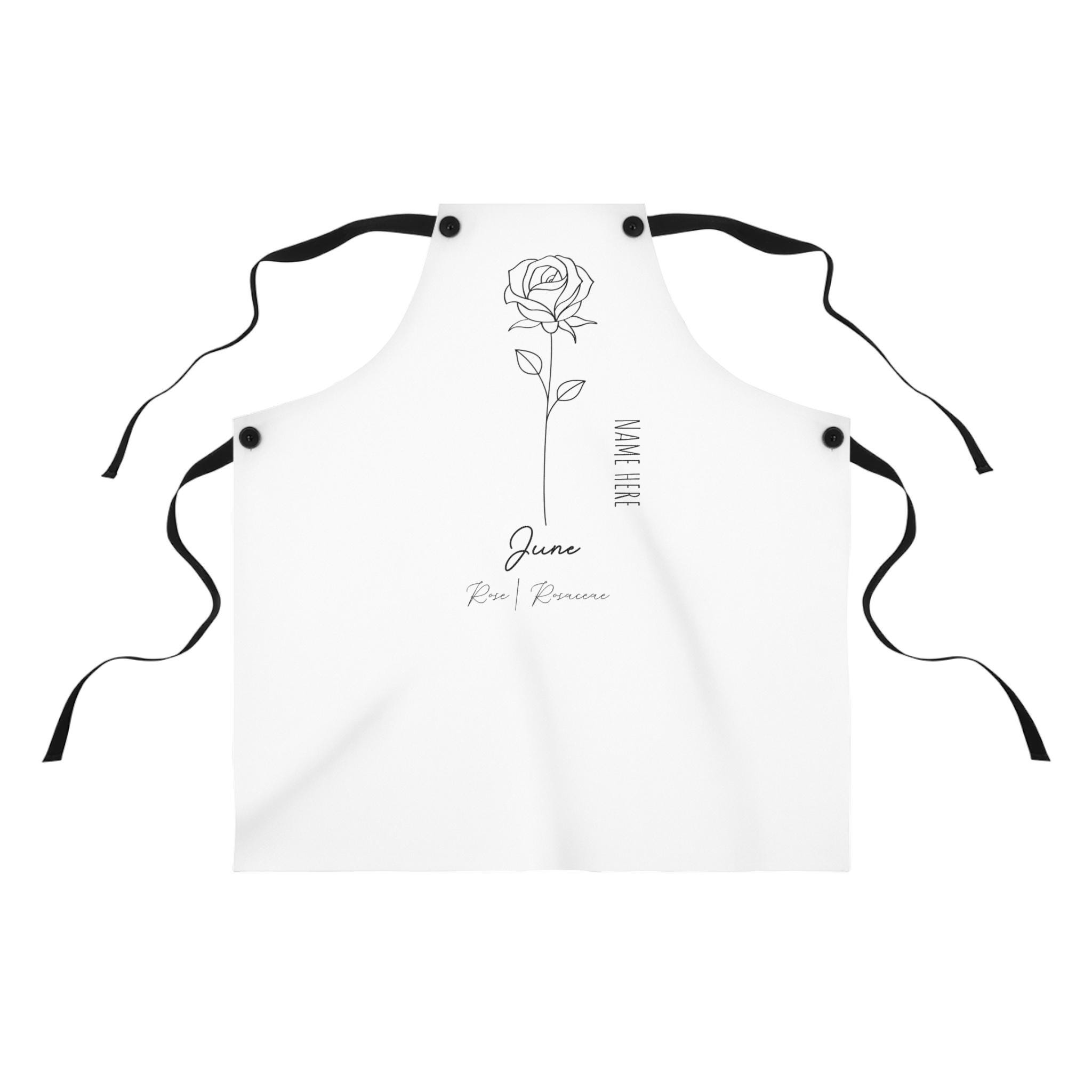 June Birth Flower - Rose - CUSTOMIZABLE - Apron. This apron exudes a charming and personal touch perfect for any kitchen enthusiast. Ideal for those celebrating a June birthday or those who love roses.