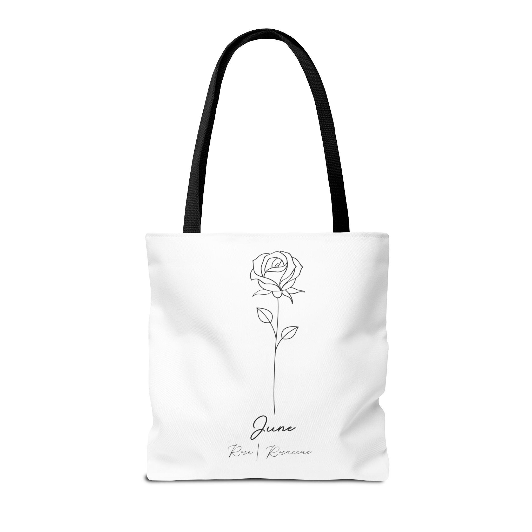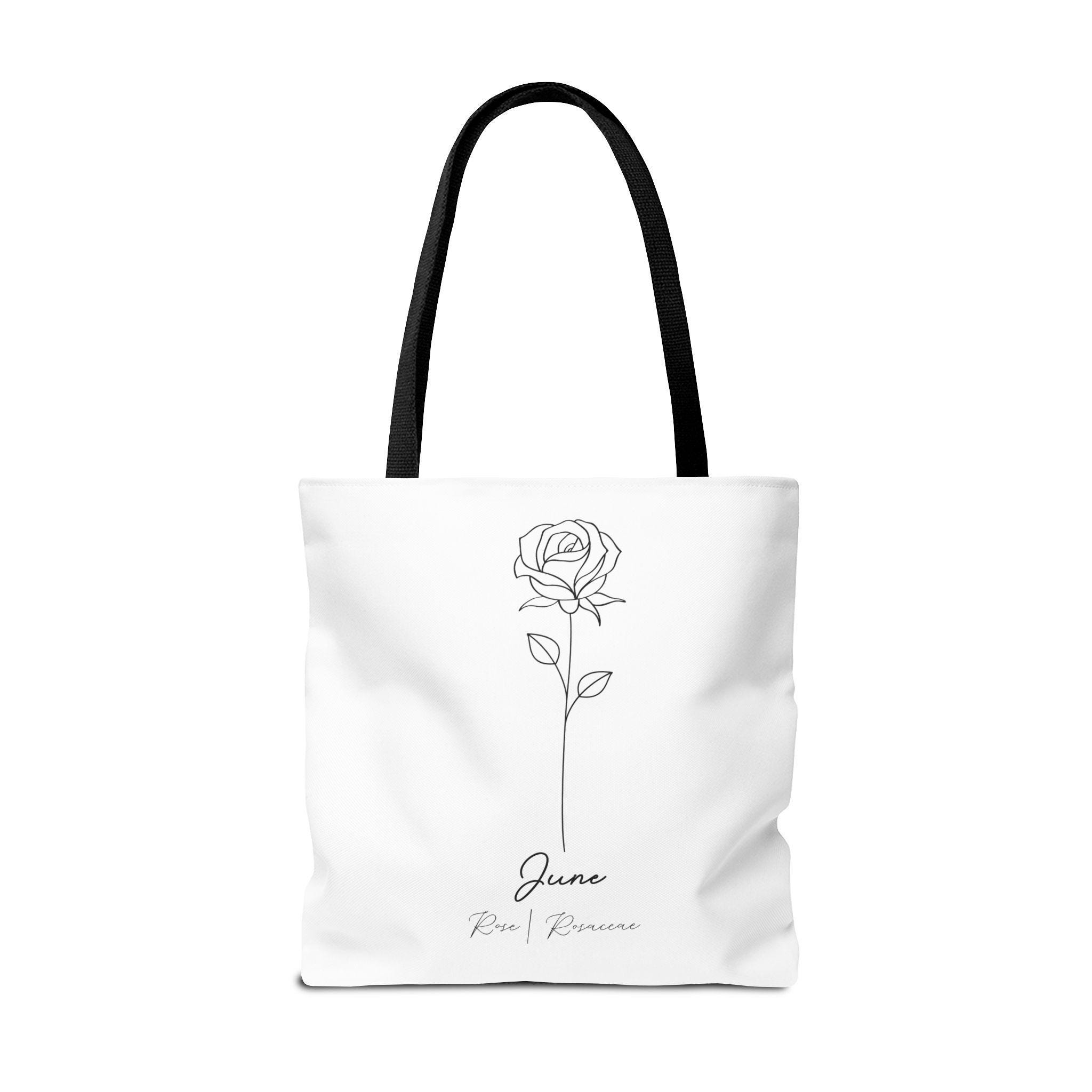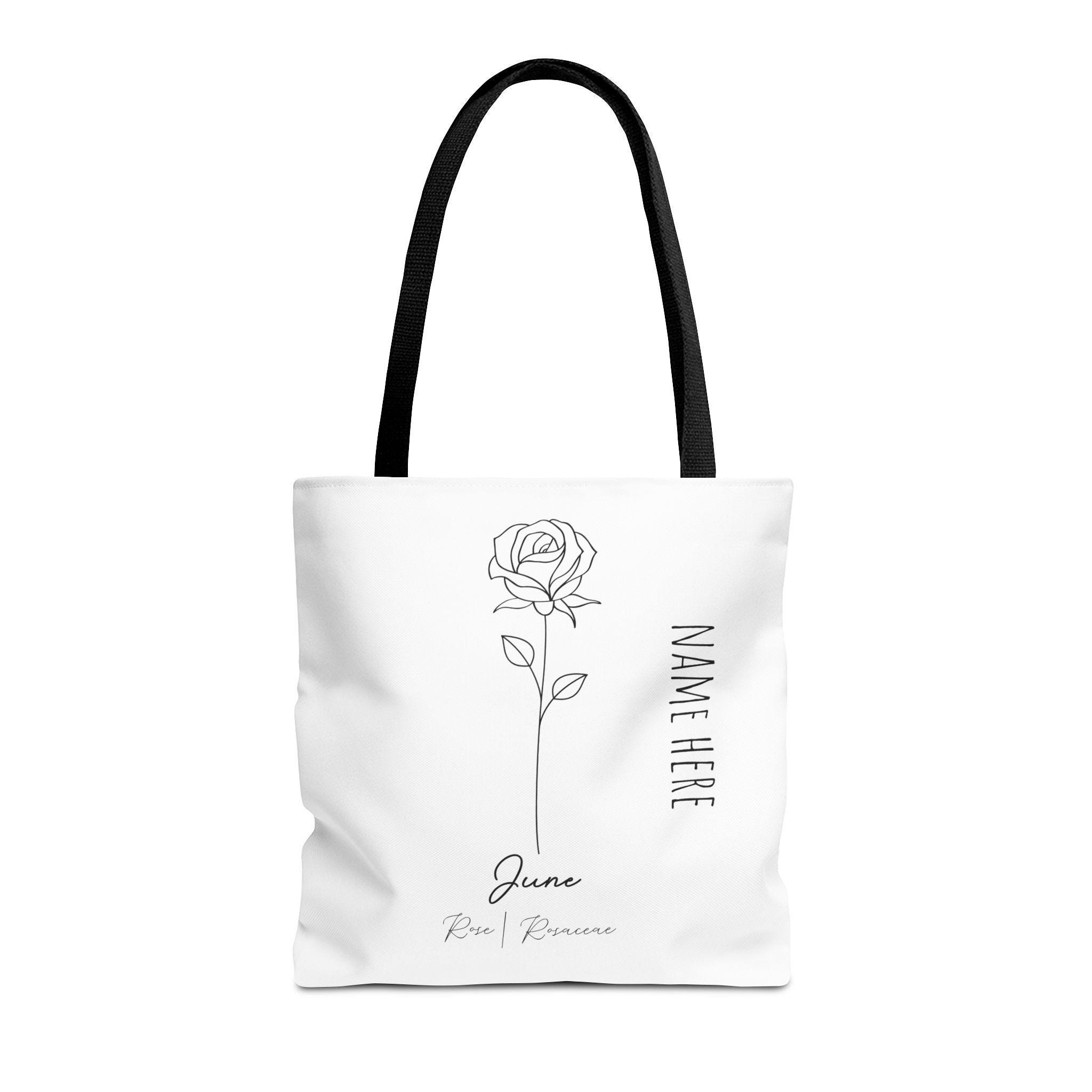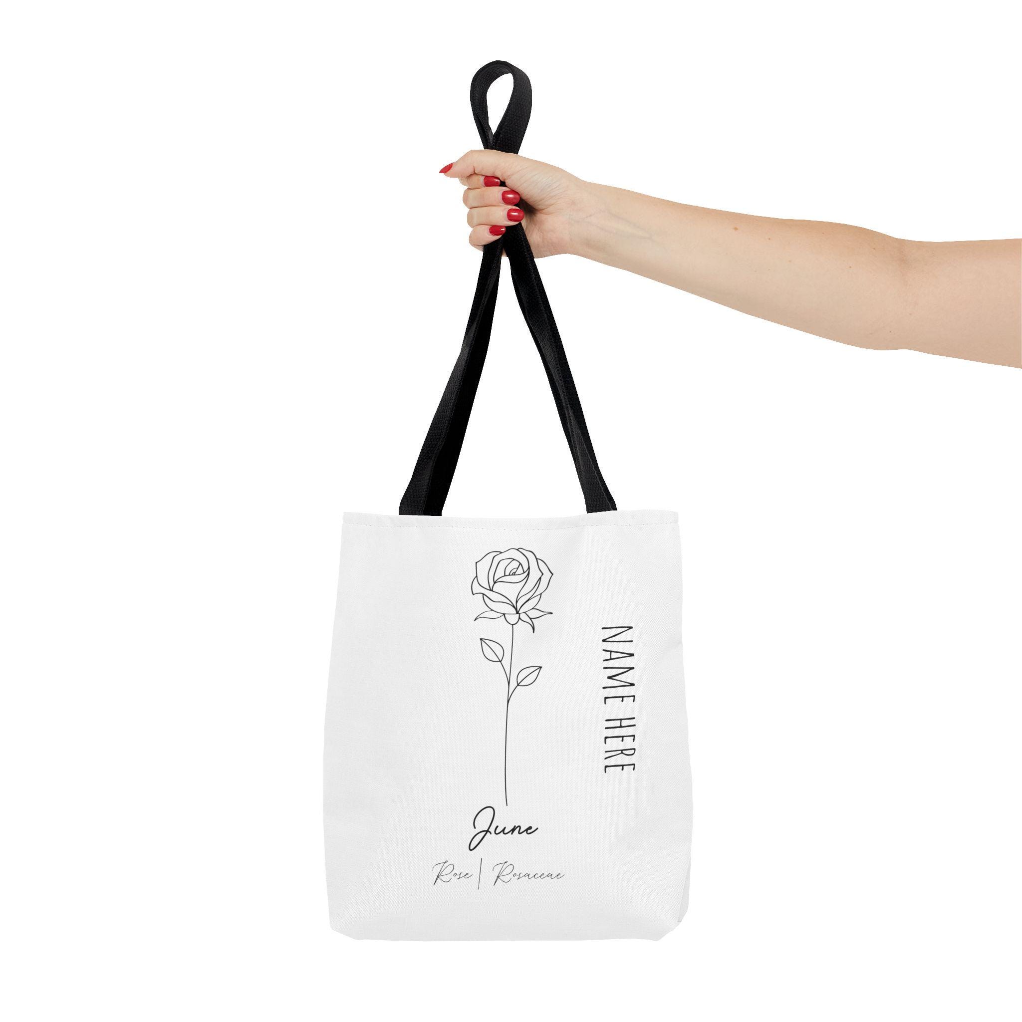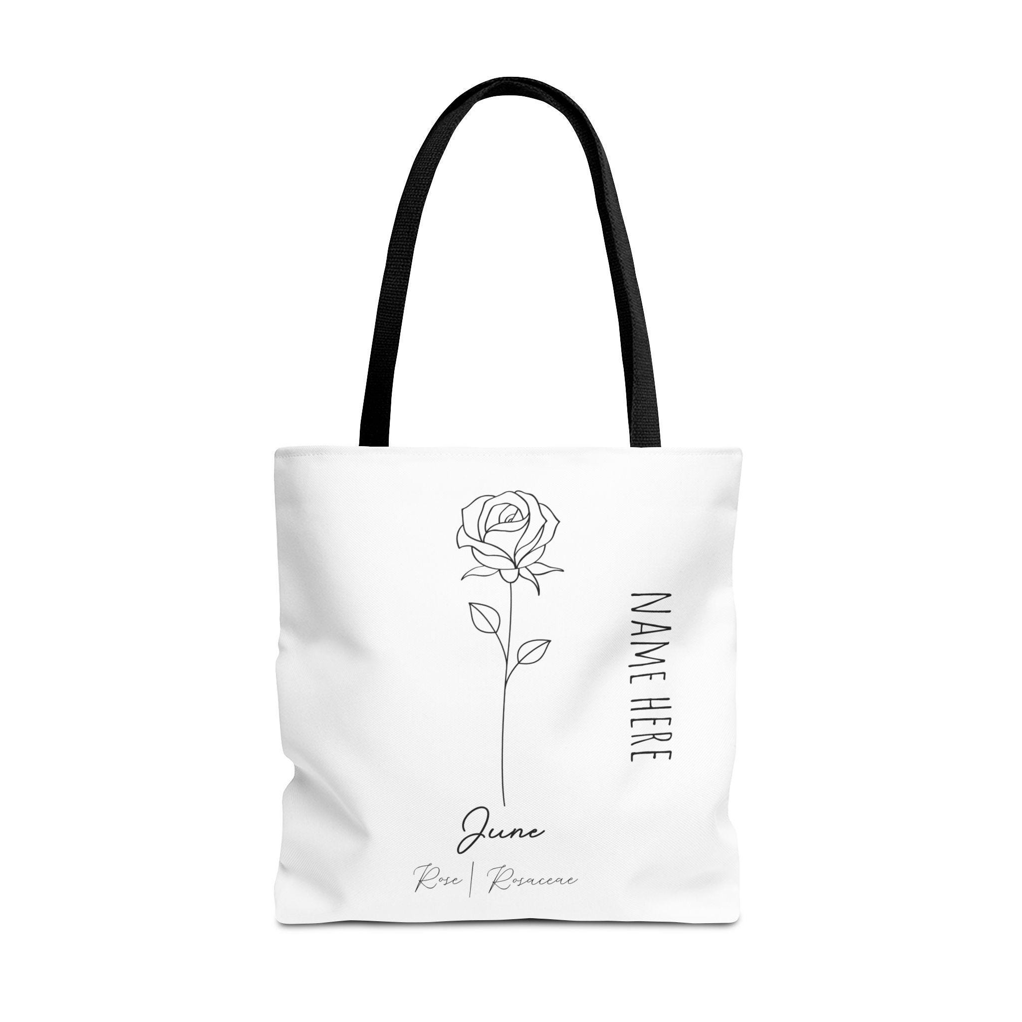 Celebrate a June birthday with this customizable Tote Bag featuring the June Birth Flower - Rose. Made with 100% polyester, this durable bag with reinforced stitching and boxed corners is perfect for everyday use. It adds a touch of personalization and charm to your outfits, making it a great gift for someone born in June.