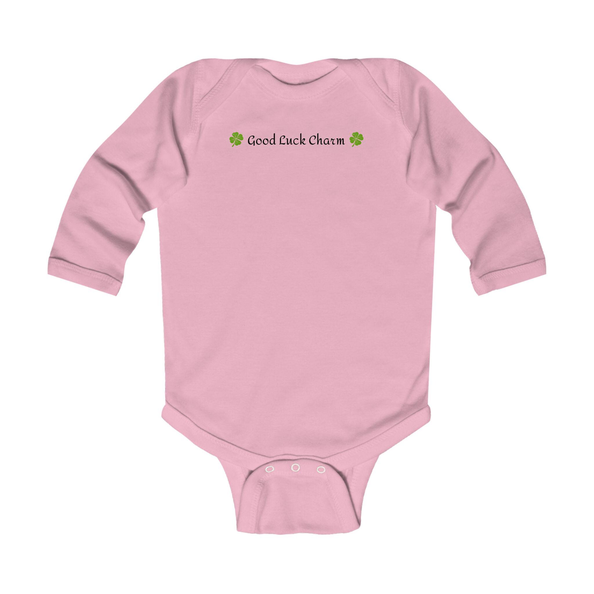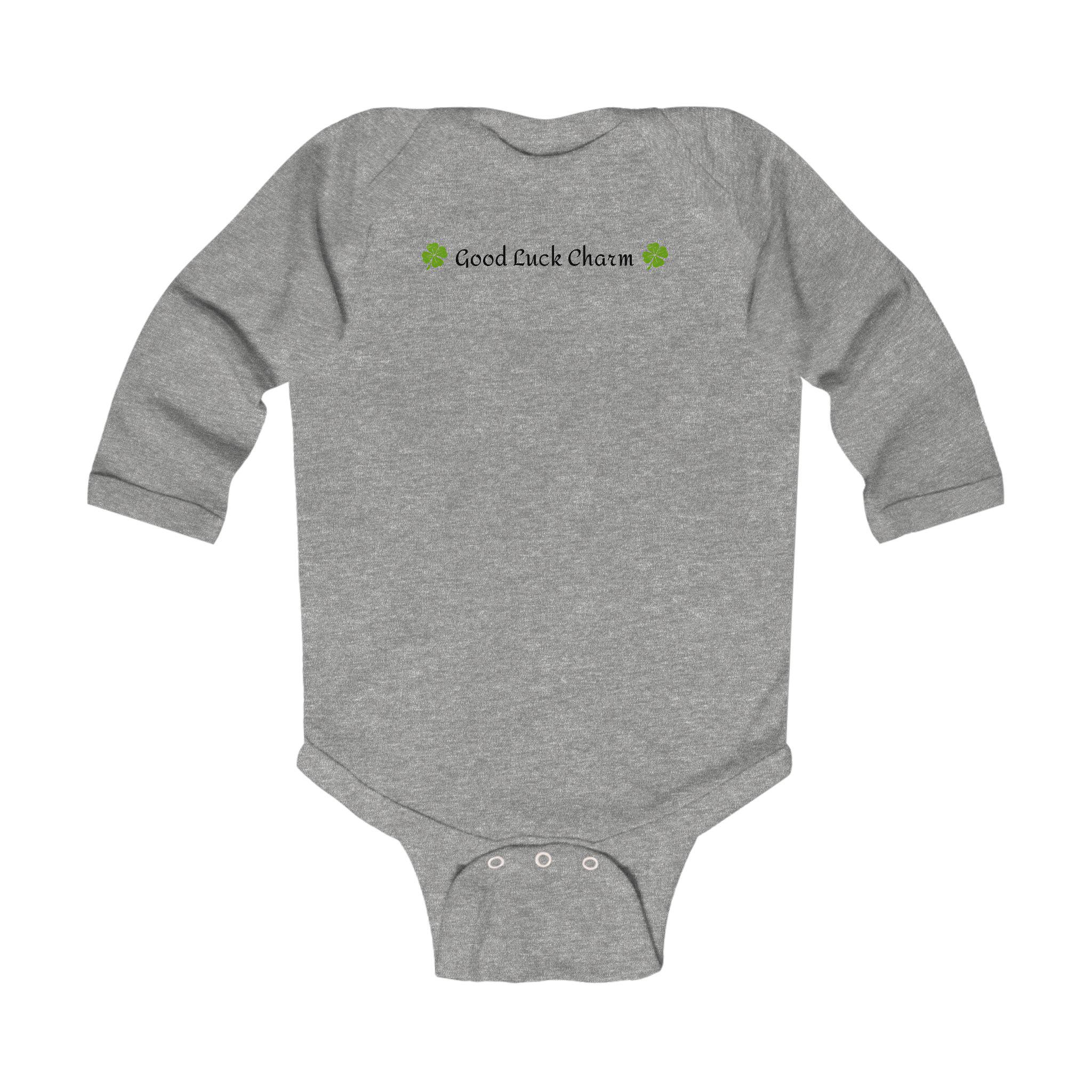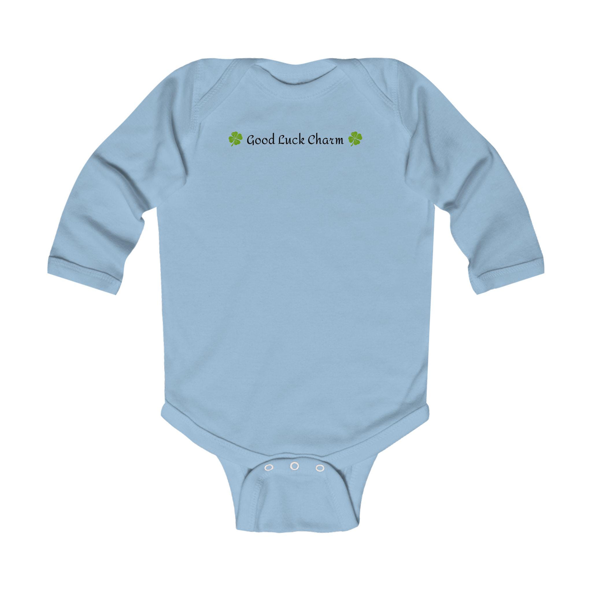 This adorable Bodysuit features a good luck charm design with a funny baby quote, perfect for St. Patrick's Day or to bring some luck into your little one's life. The Bodysuit is made from soft and comfortable fabric, with ribbed knit binding for added softness and freedom of movement. It has 3 snaps for easy changing and is made from 100% combed, ring-spun cotton. This Classic fit Bodysuit is light and perfect for everyday wear.