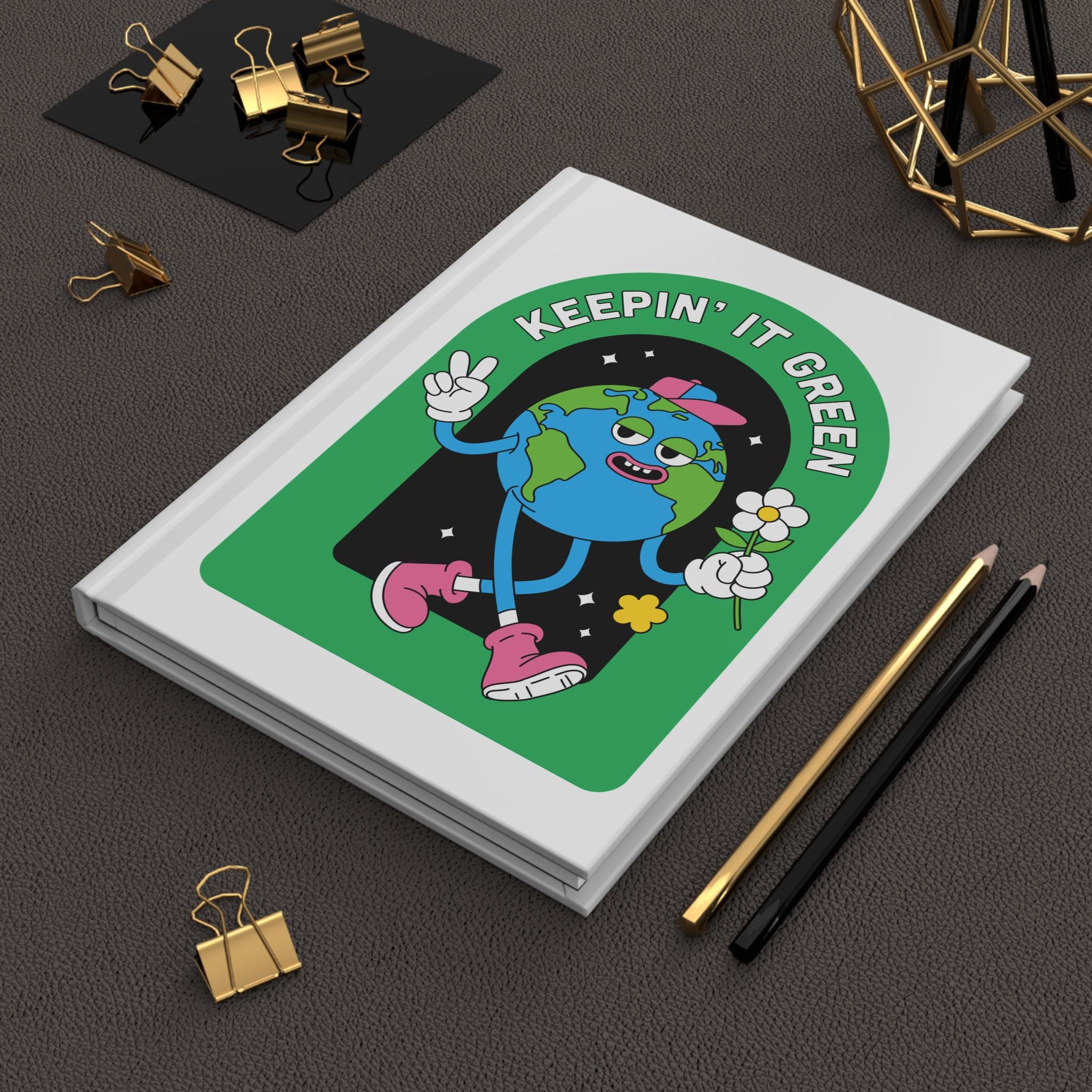 This matte hardcover journal features a vibrant 'earth day keepin' it green' design, giving off a fresh and eco-friendly vibe. Perfect for those who love nature and sustainability, this journal is great for jotting down ideas, notes, and sketches. Ideal for Earth Day celebrations and environmentally conscious individuals.