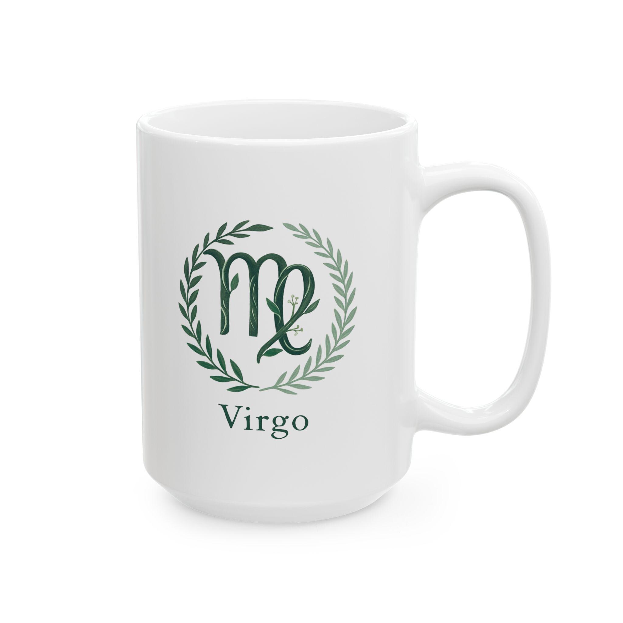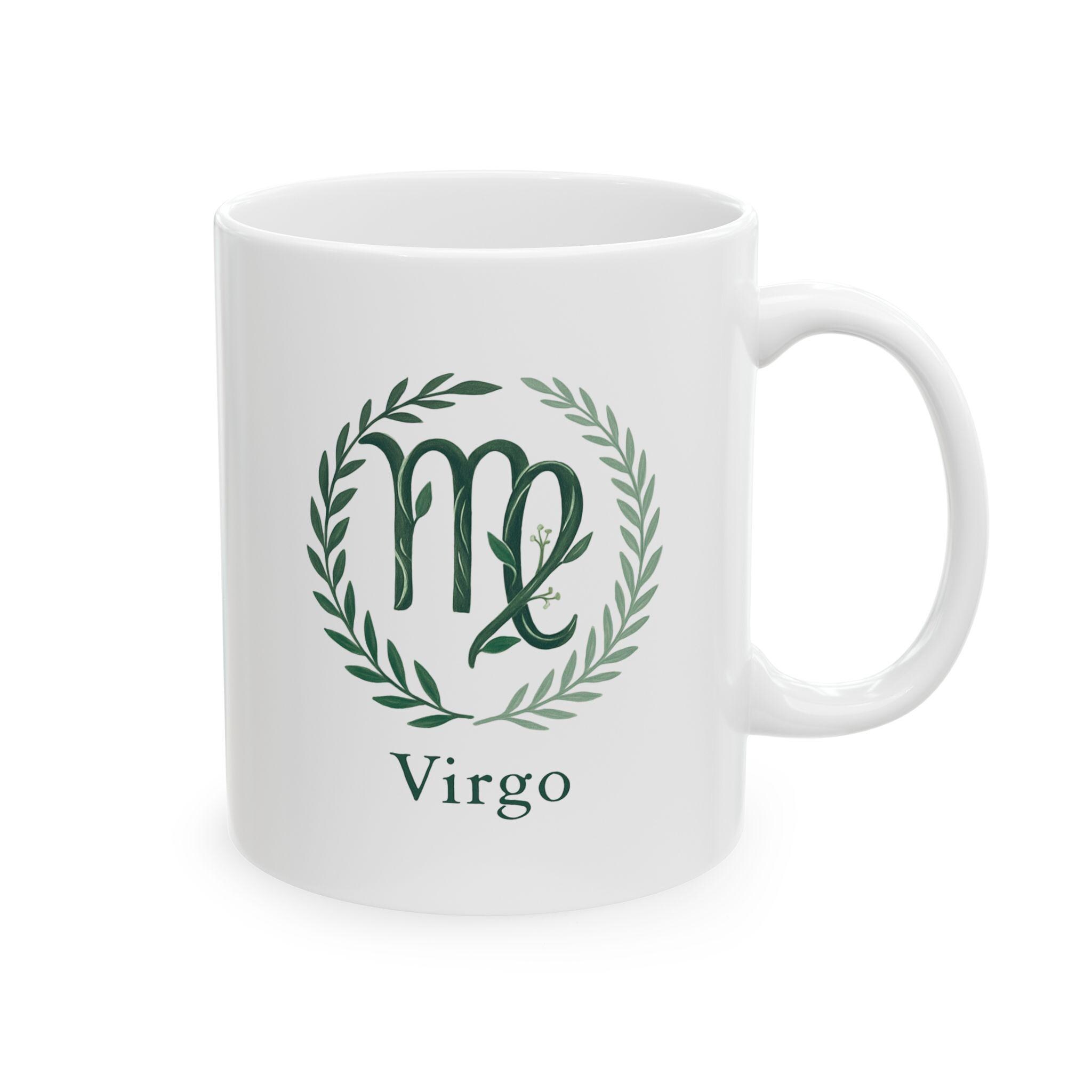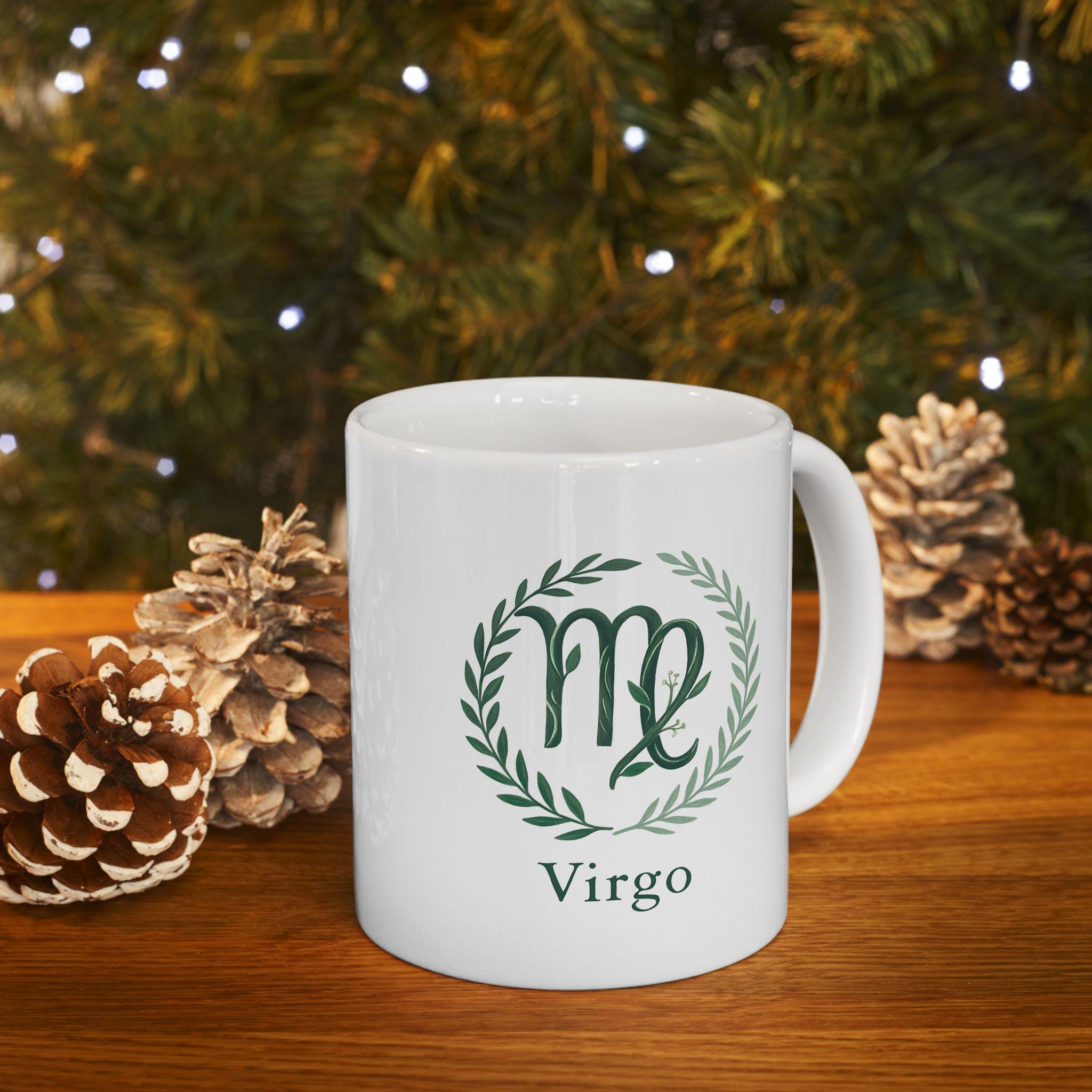 Elegant Virgo Zodiac ceramic mug perfect for nature lovers. Custom drinkware for coffee and tea, adding a unique touch to your home decor. Ideal as a gift for someone who values astrology and earthy vibes. Relevant for birthdays, astrology themed parties, or any occasion.