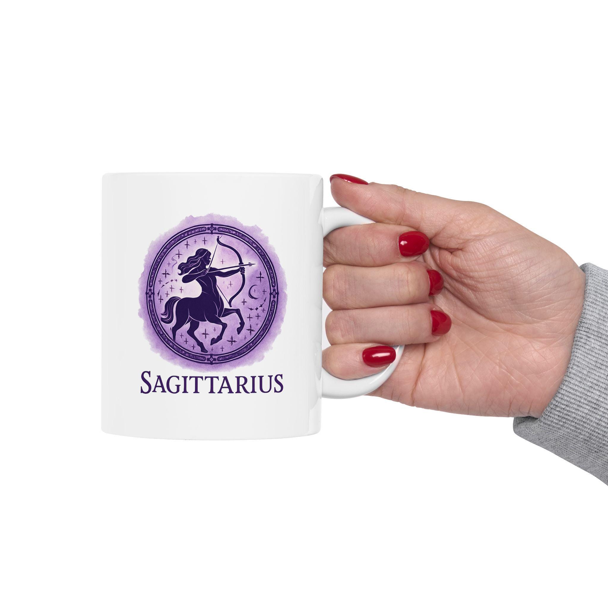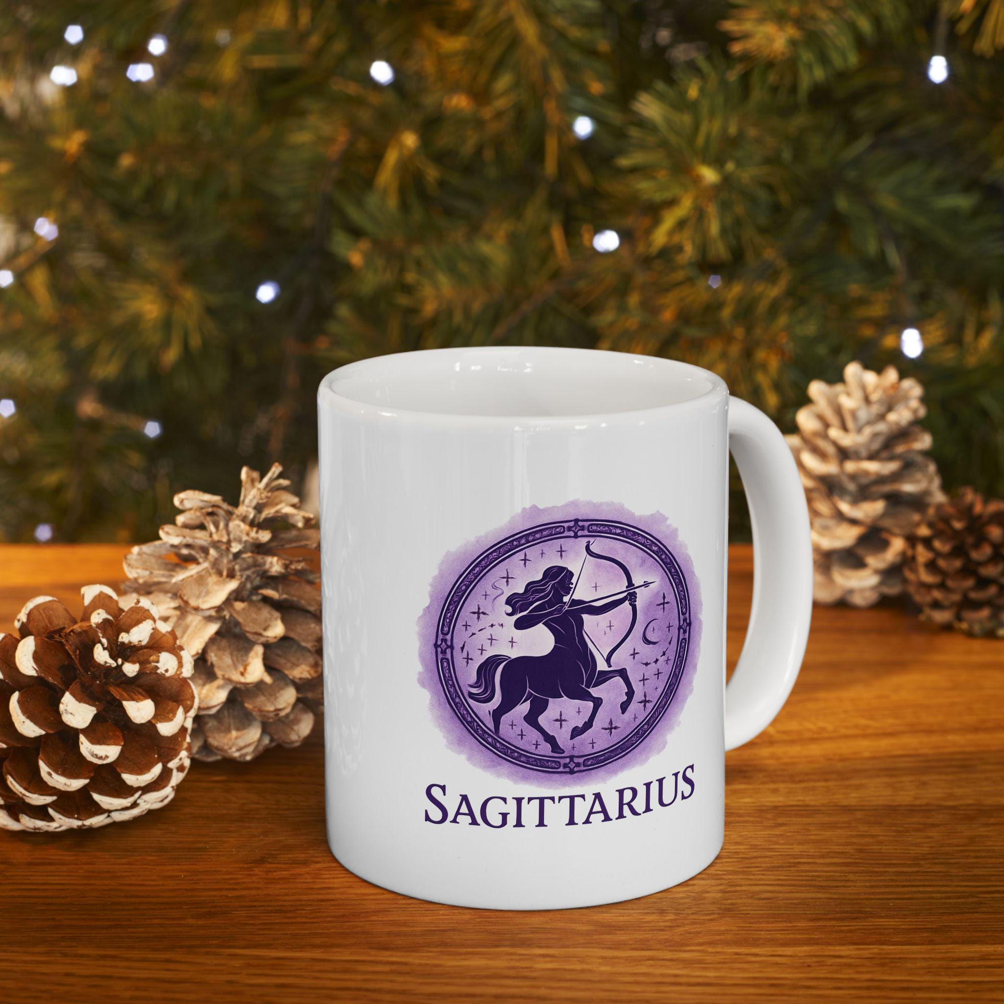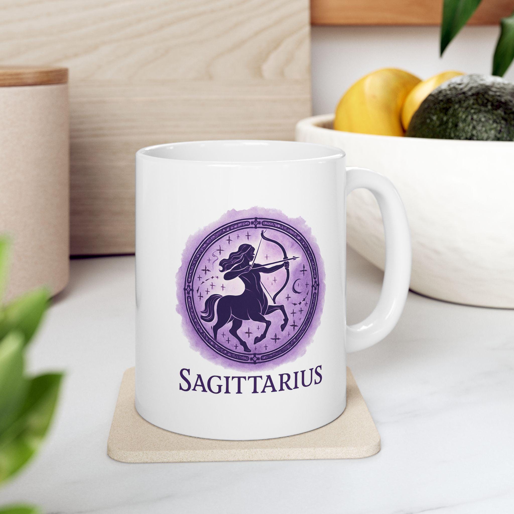 Elegant Sagittarius Zodiac ceramic mug perfect for nature lovers. Custom drinkware for coffee and tea, adding a unique touch to your home decor. Ideal as a gift for someone who values astrology and earthy vibes. Relevant for birthdays, astrology themed parties, or any occasion.