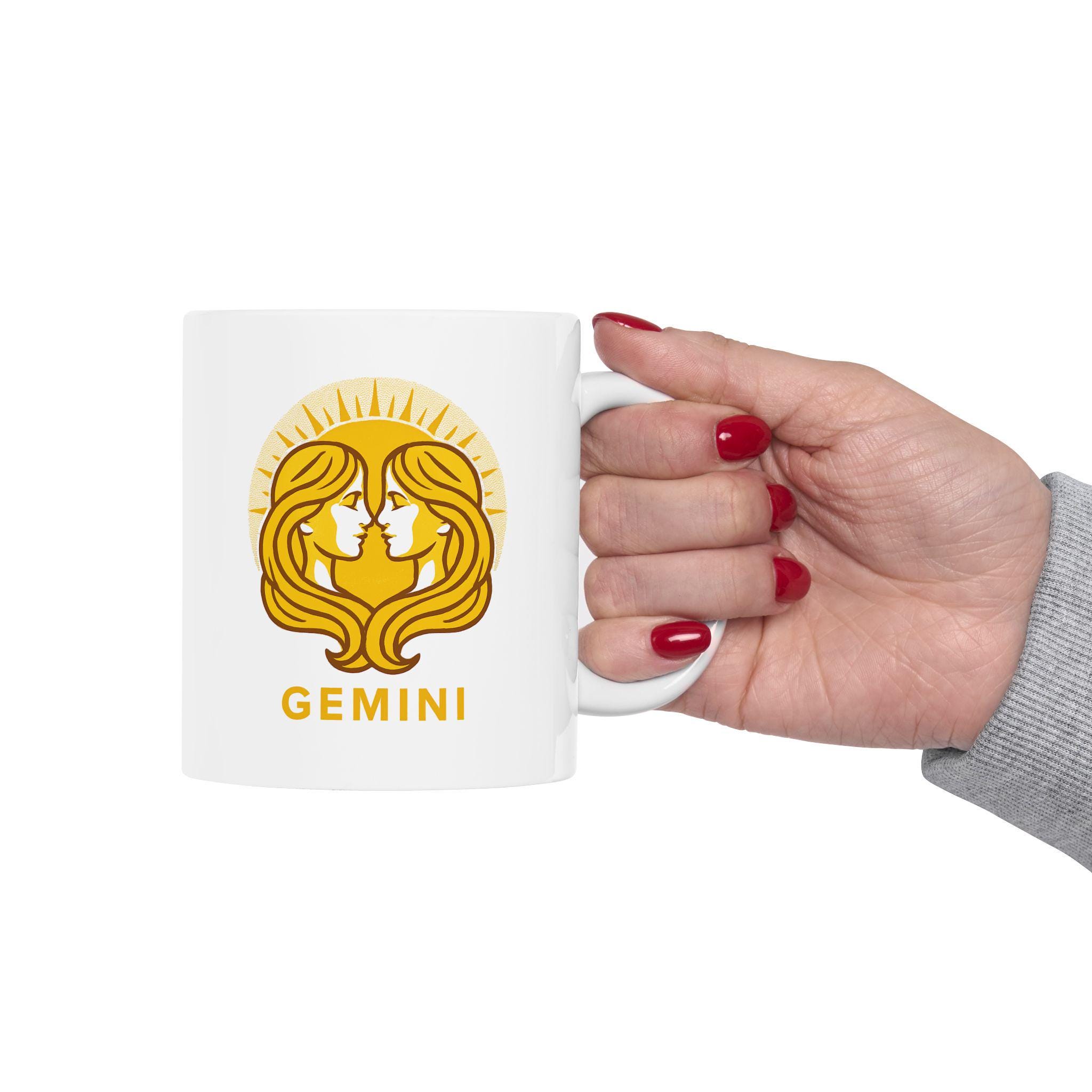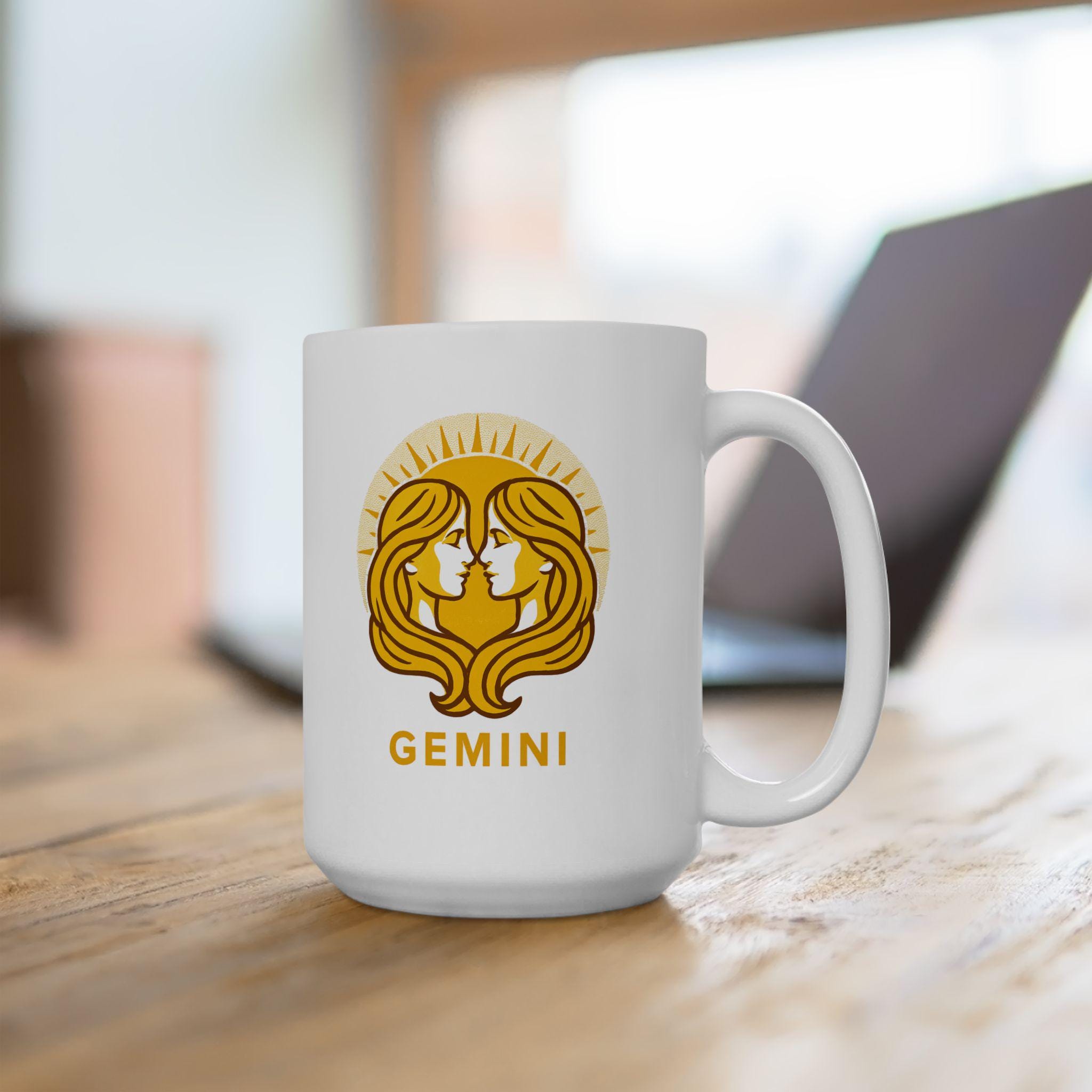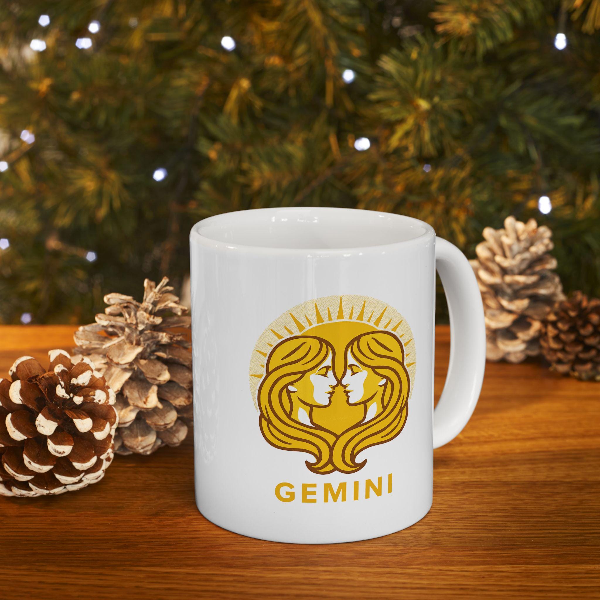 Elegant Gemini Zodiac ceramic mug perfect for nature lovers. Custom drinkware for coffee and tea, adding a unique touch to your home decor. Ideal as a gift for someone who values astrology and earthy vibes. Relevant for birthdays, astrology themed parties, or any occasion.