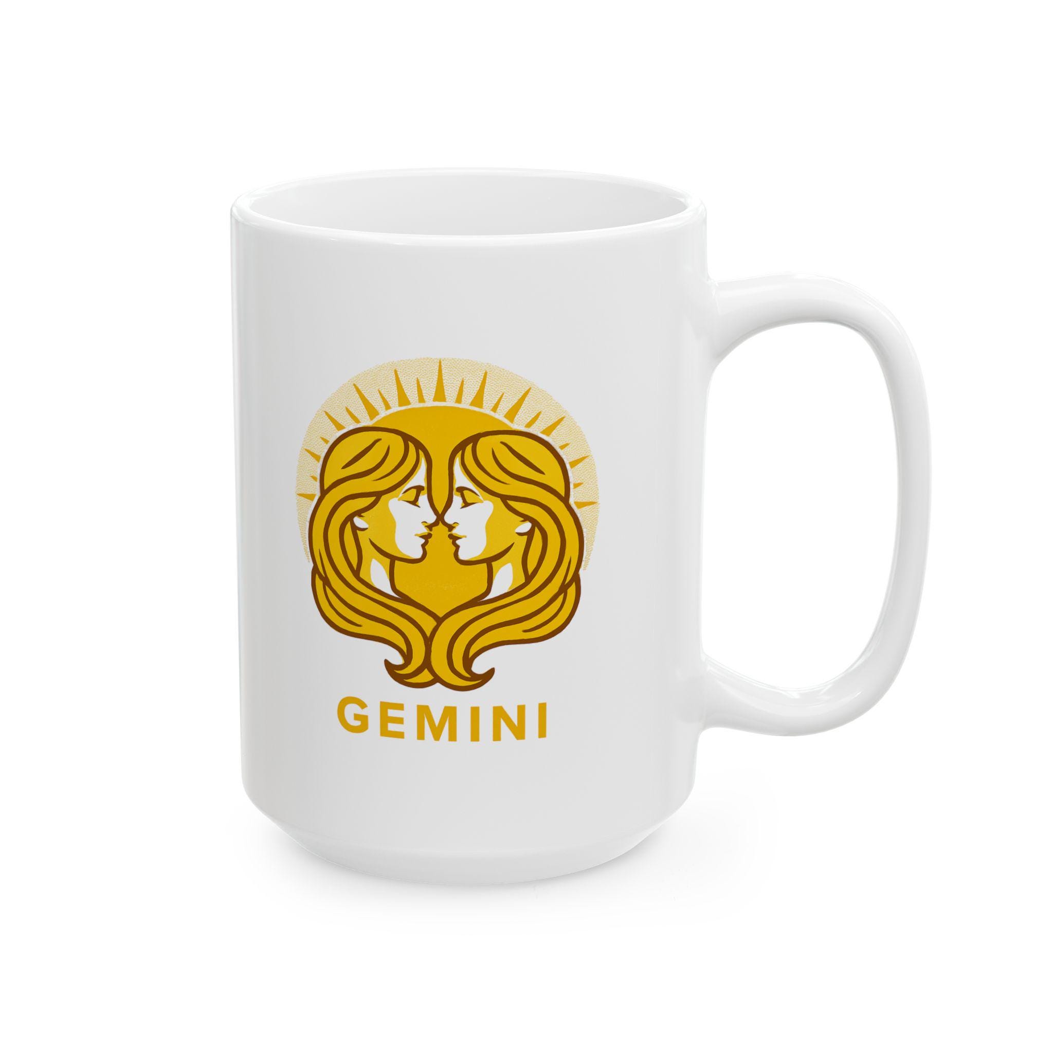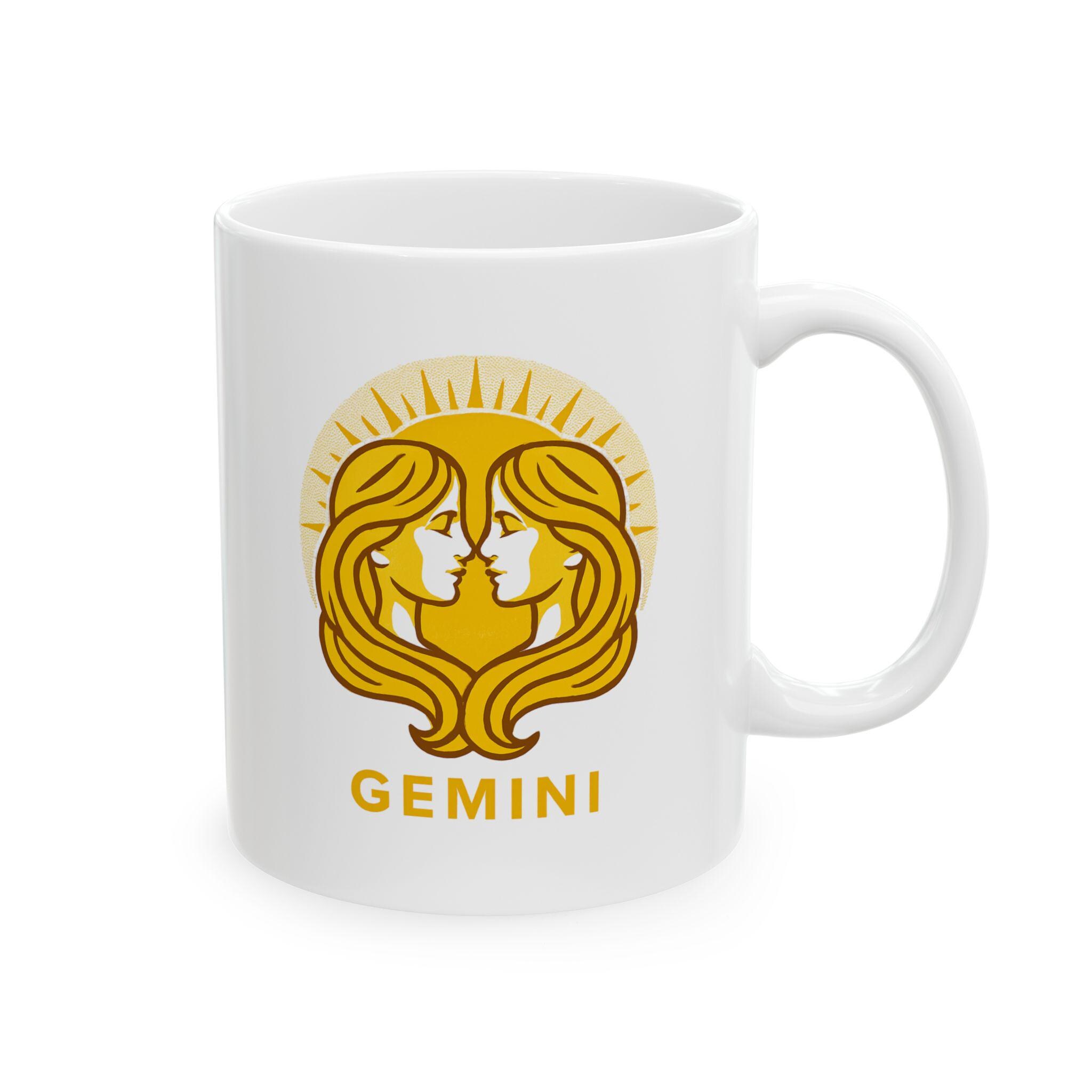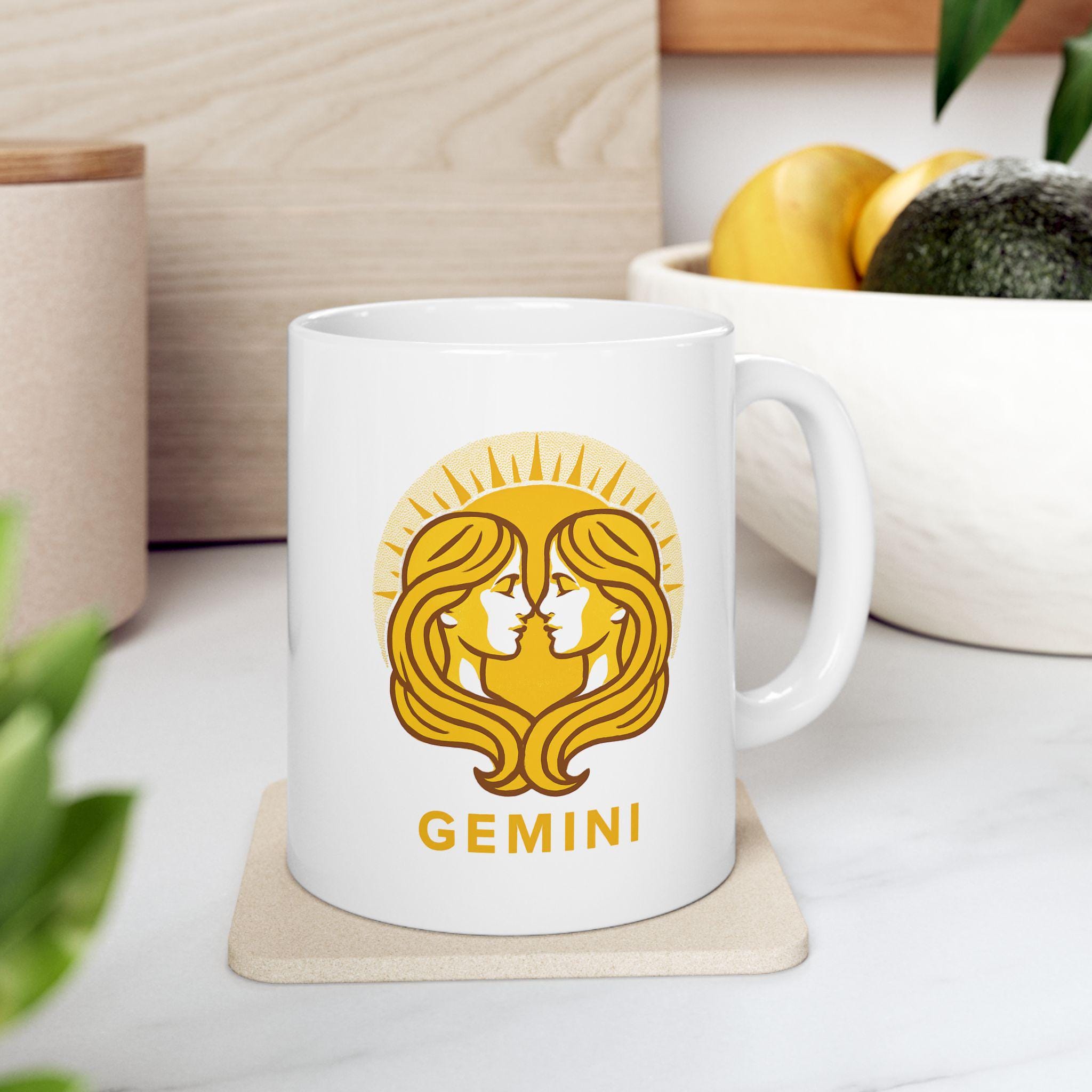 Elegant Gemini Zodiac ceramic mug perfect for nature lovers. Custom drinkware for coffee and tea, adding a unique touch to your home decor. Ideal as a gift for someone who values astrology and earthy vibes. Relevant for birthdays, astrology themed parties, or any occasion.
