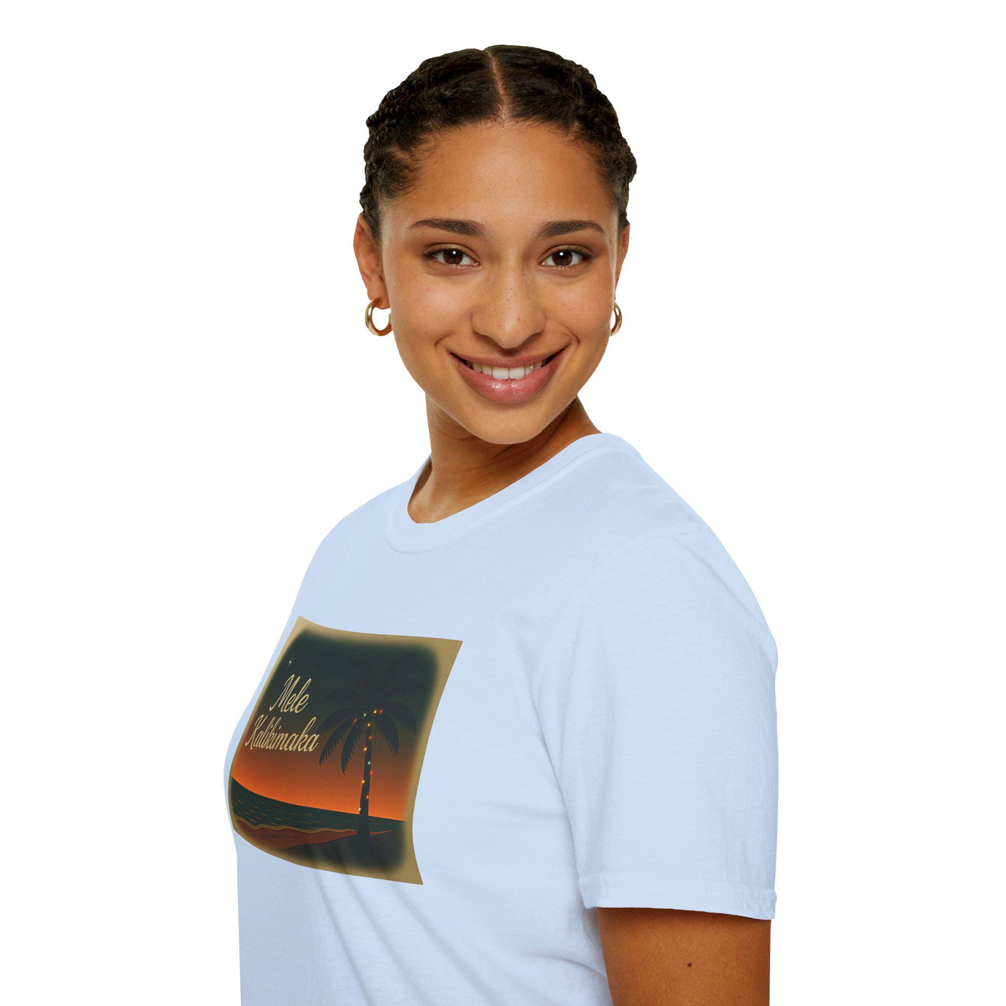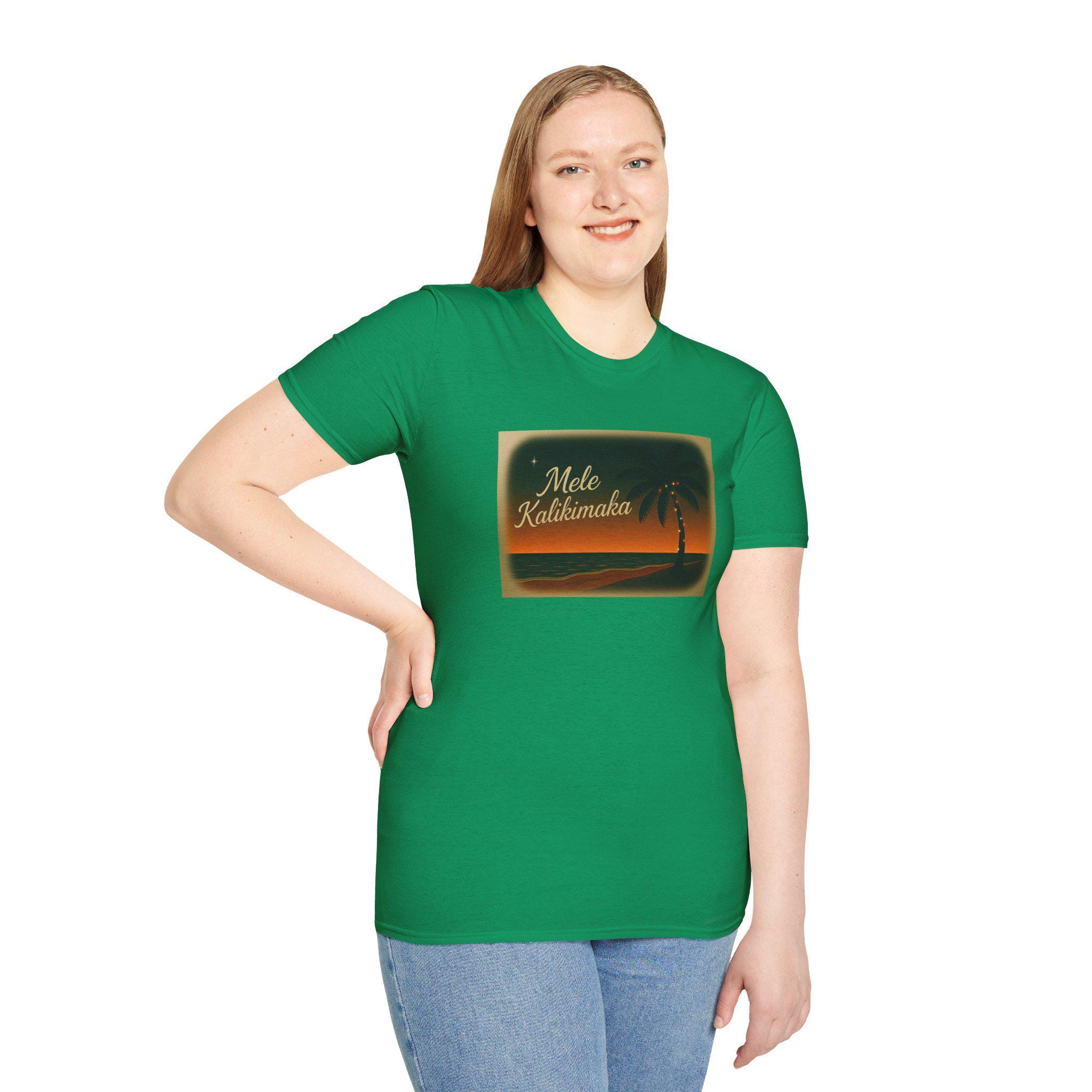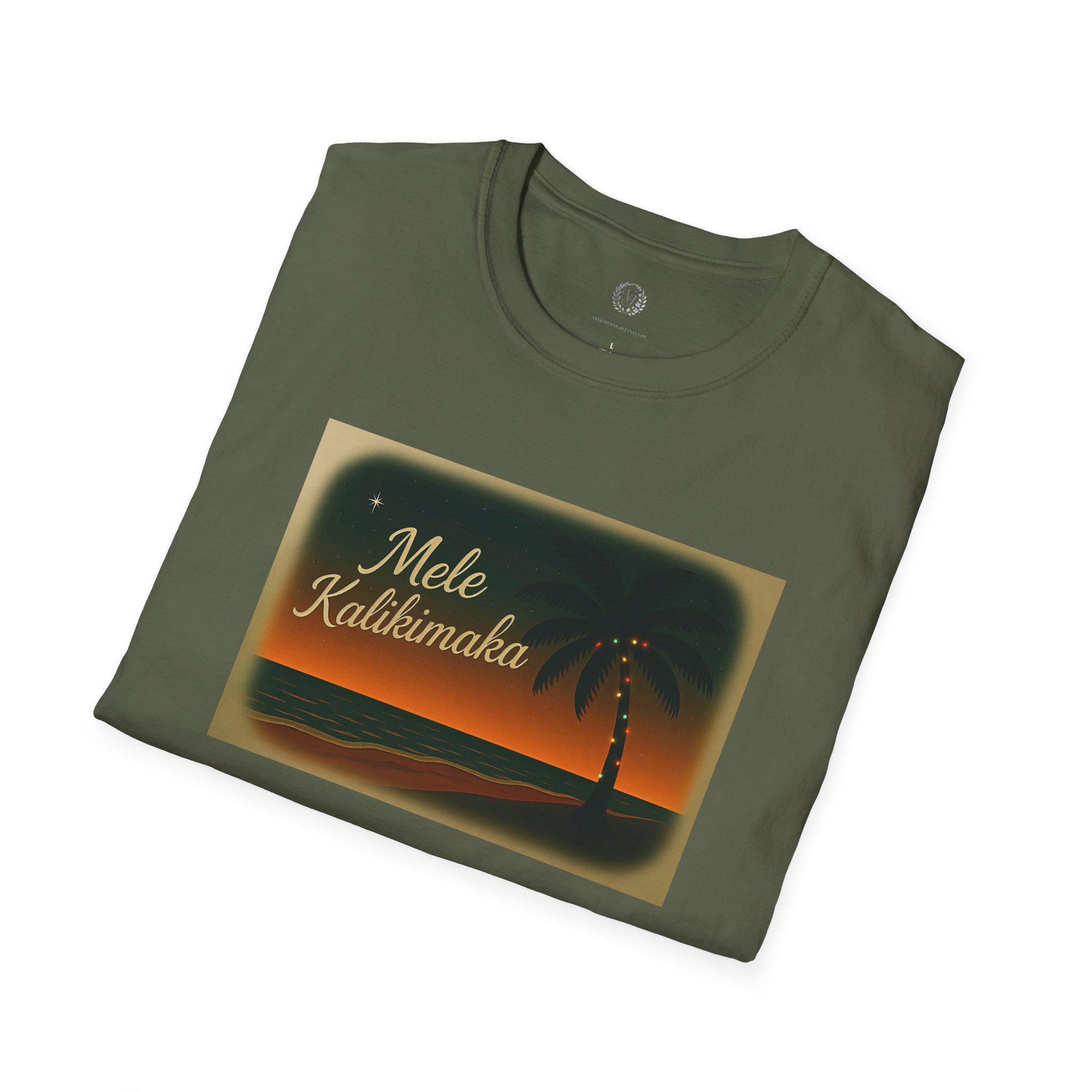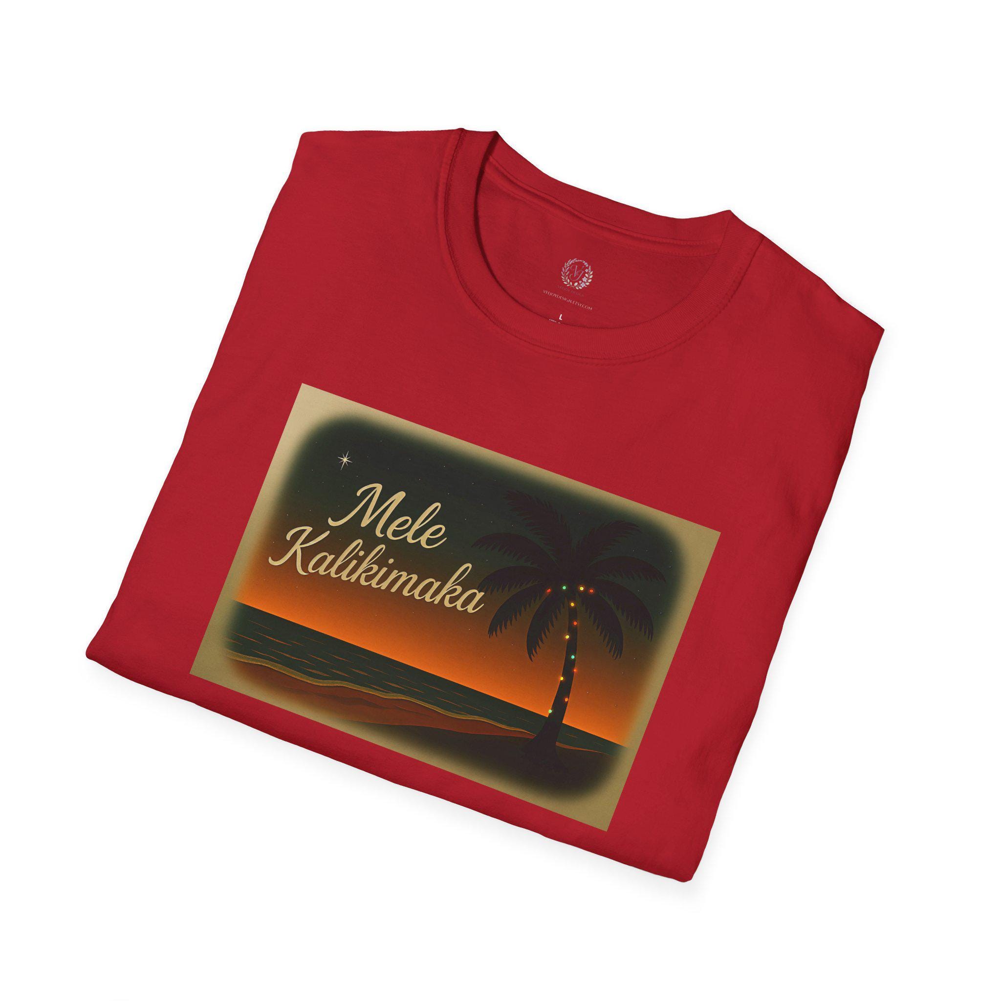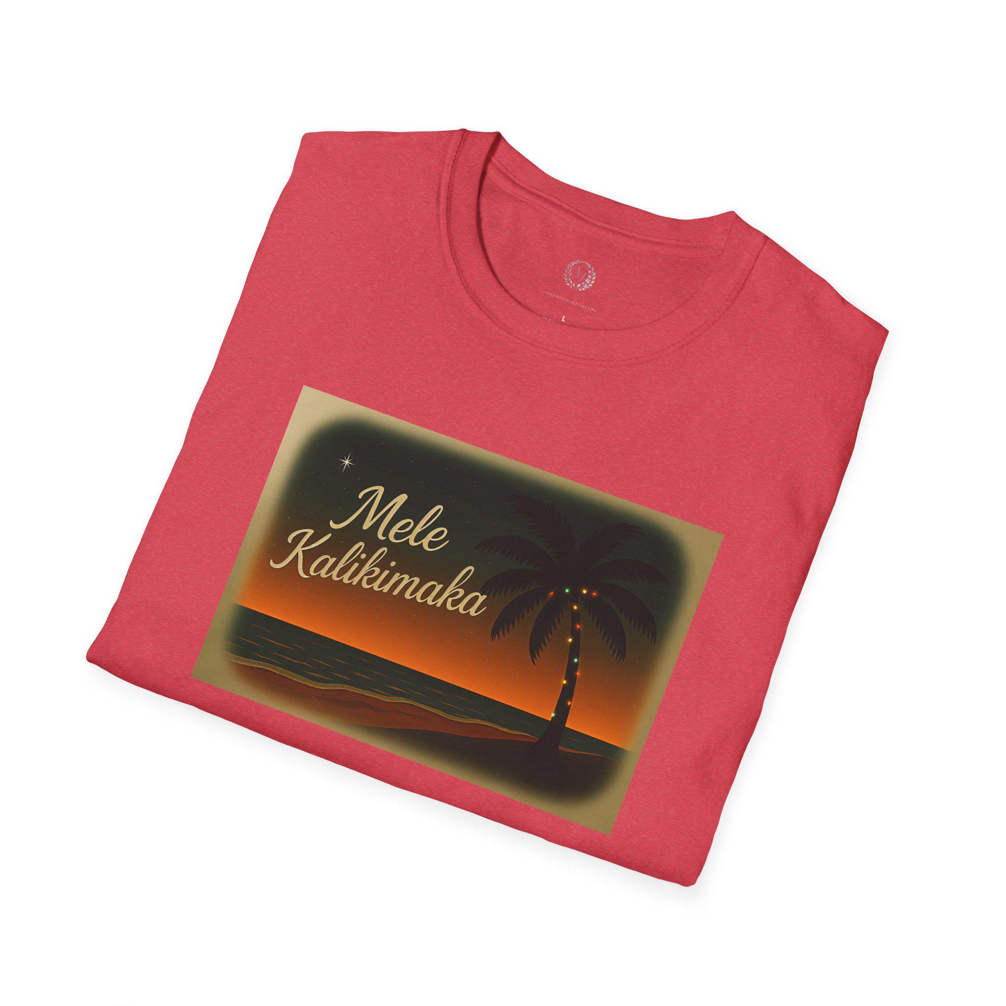 A soft, lightweight tee that carries the quiet warmth of island evenings. The design washes your chest in a vintage sunset—muted oranges, deep teals and a lone palm leaning over shoreline script that reads “Mele Kalikimaka.” Wear it when you want a little Hawaiian calm in your day: draped over shorts for a relaxed stroll, layered under a jacket on cool nights, or kept in rotation for vacation memories that linger. The fabric feels smooth against skin and the print keeps its soft, weathered look rather than shouting. It’s for people who collect small moments—salt air, late light, easy conversation—and like their clothes to tell a single gentle story.