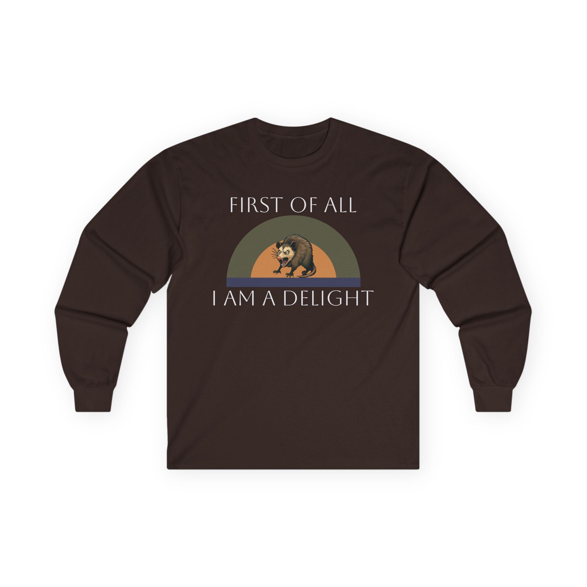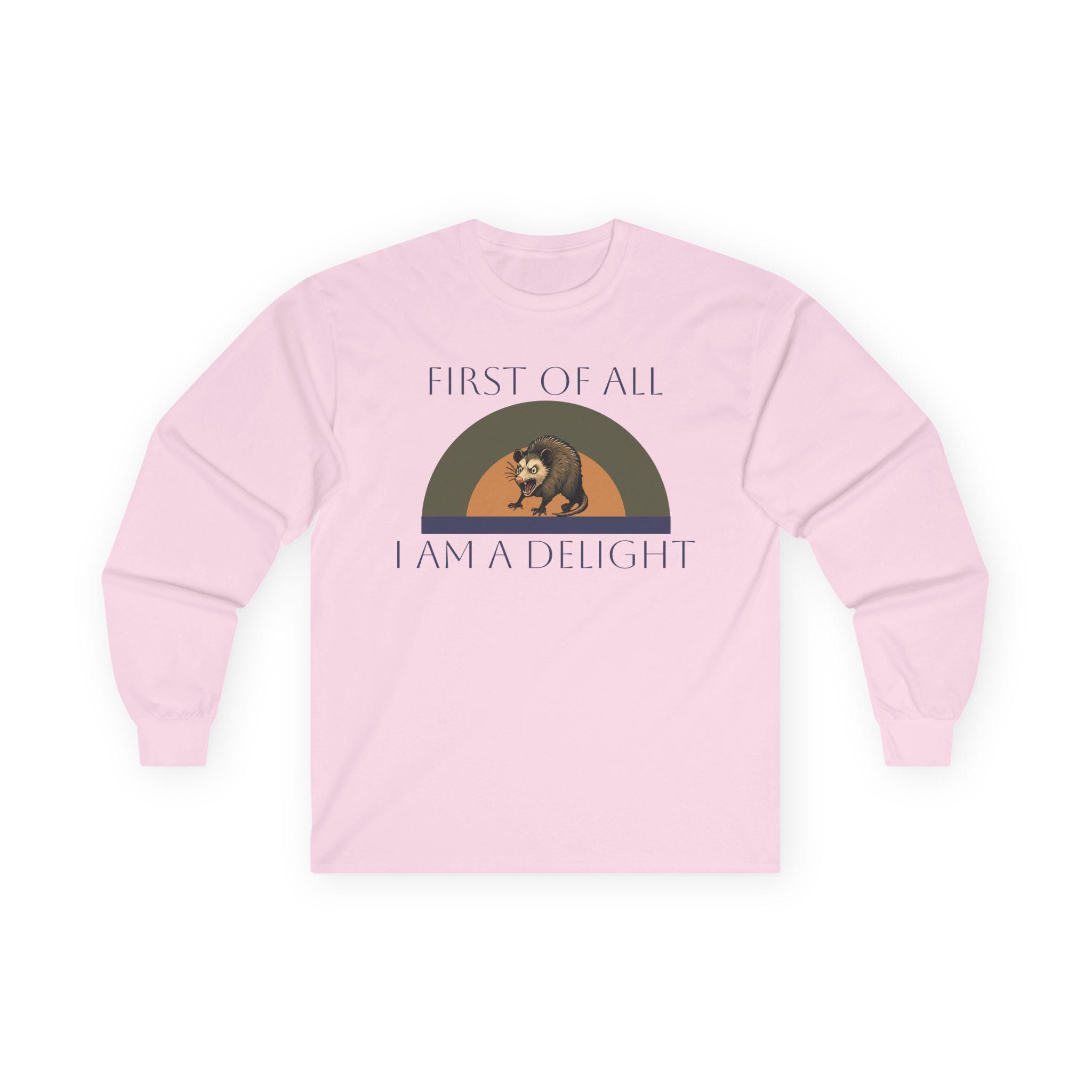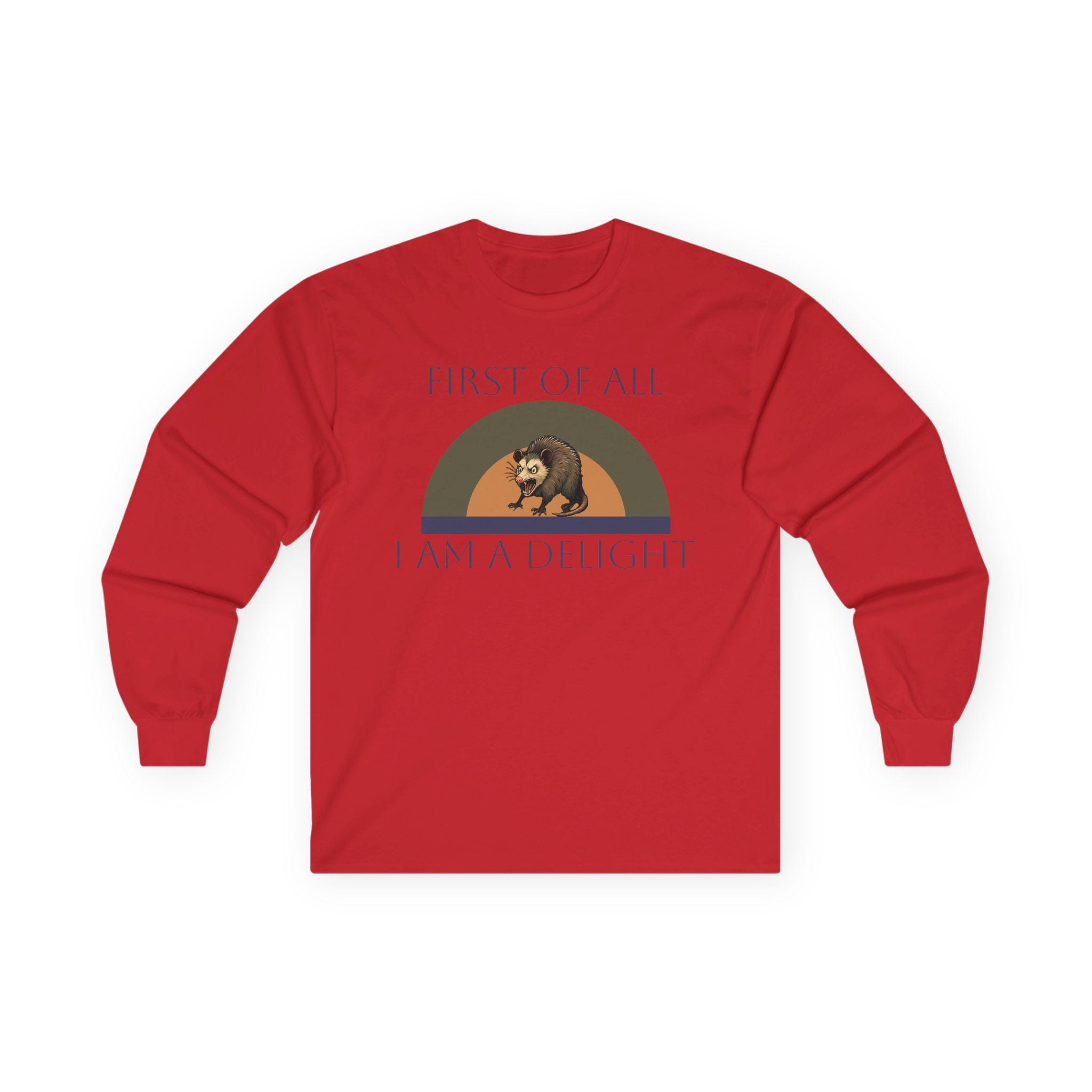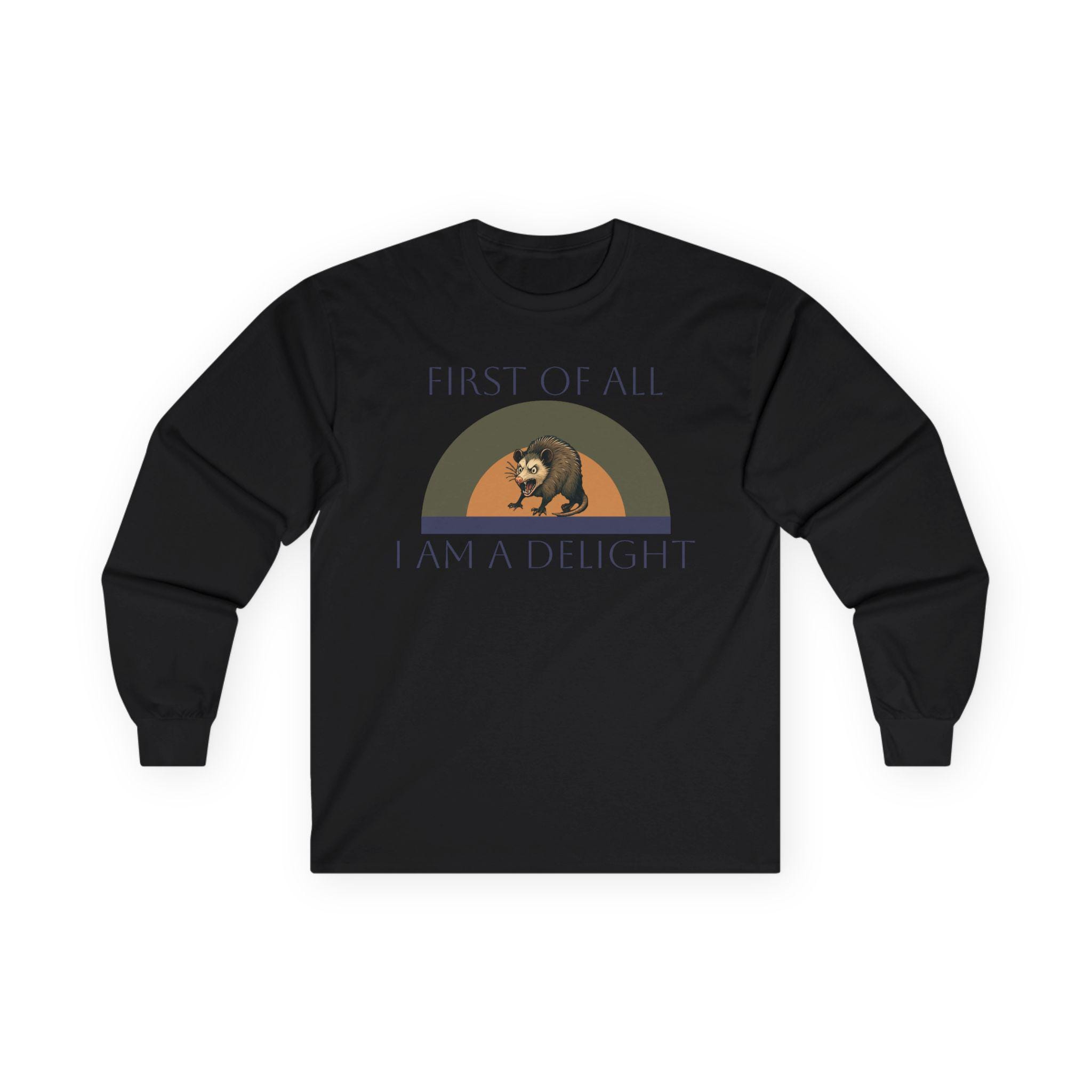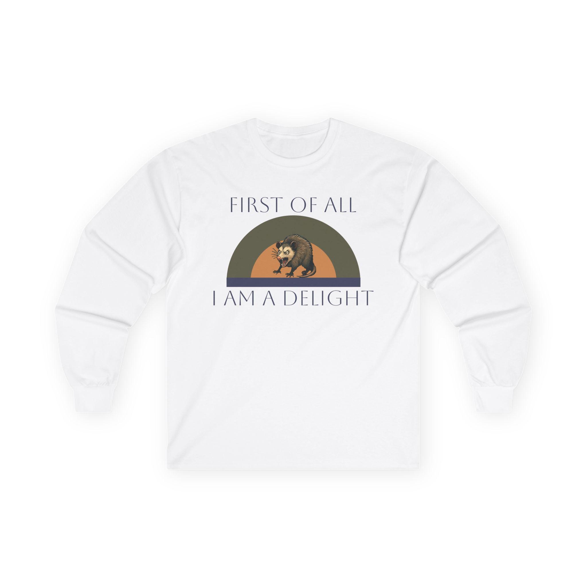 This long-sleeve tee carries a quiet, witty confidence — soft vintage-weight cotton with a calm white canvas and a small, nostalgic graphic across the chest. The design shows a relaxed bear under a muted rainbow with the words “FIRST OF ALL / I AM A DELIGHT,” giving the shirt a warm, slightly tongue-in-cheek personality. Wear it layered under a jacket on cool mornings or solo when you want your outfit to say, slowly and kindly, that you know your worth. The fabric has a substantial, broken-in feel that settles around the body without clinging. Because it’s knit as a single tube with reinforced shoulders and a stretchy ribbed collar, it keeps a clean silhouette wash after wash. Note the classic fit and medium weight — it drapes like a lived-in favorite rather than a stiff, new piece.