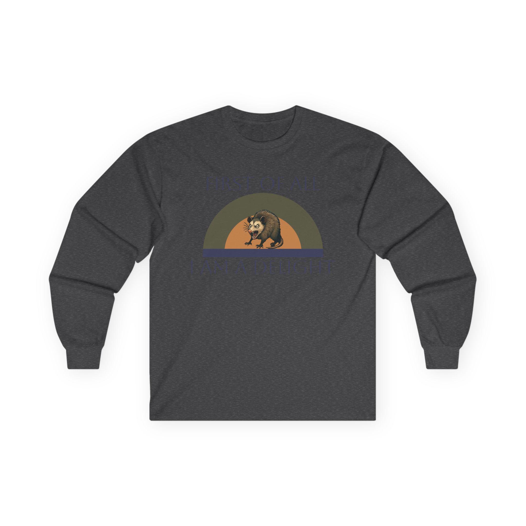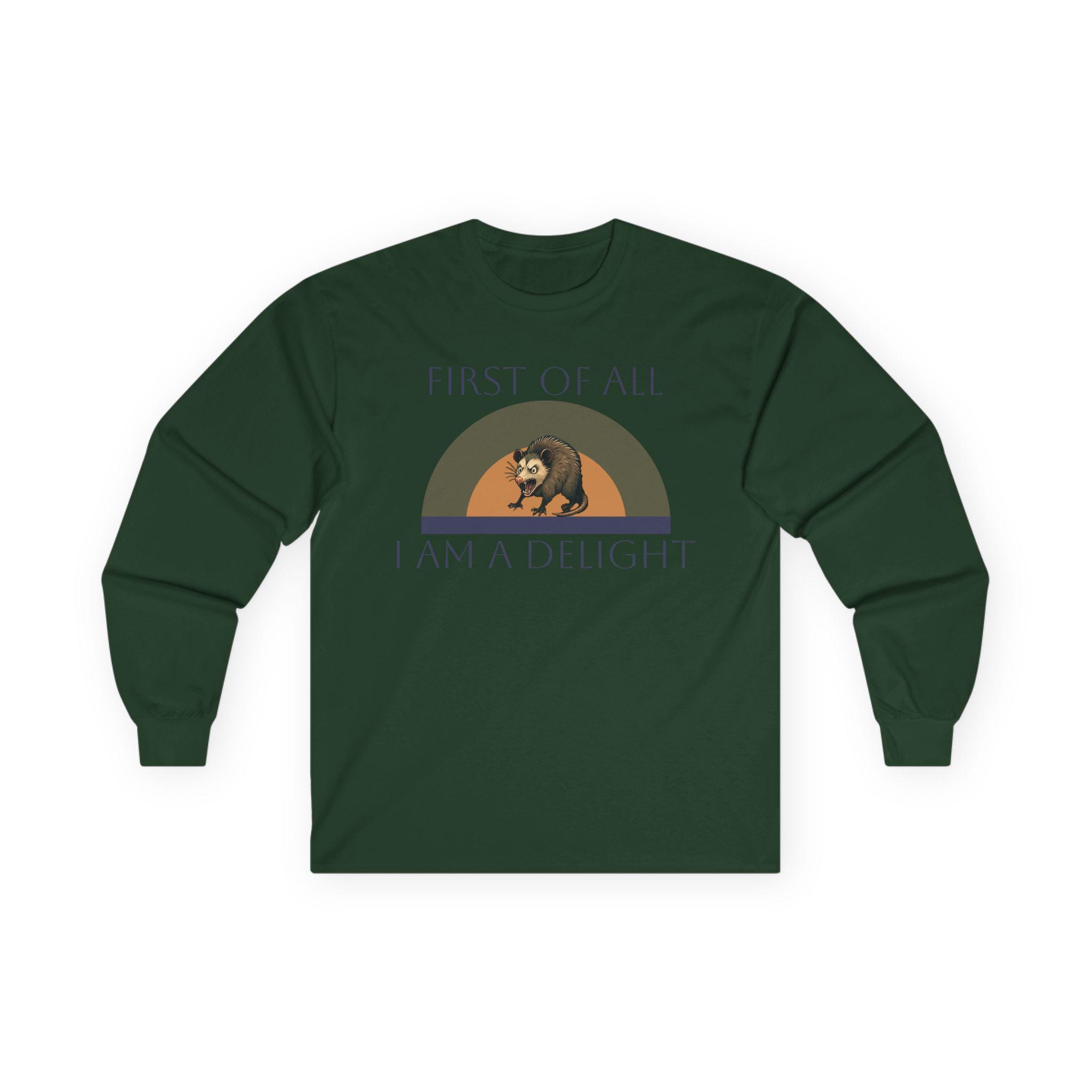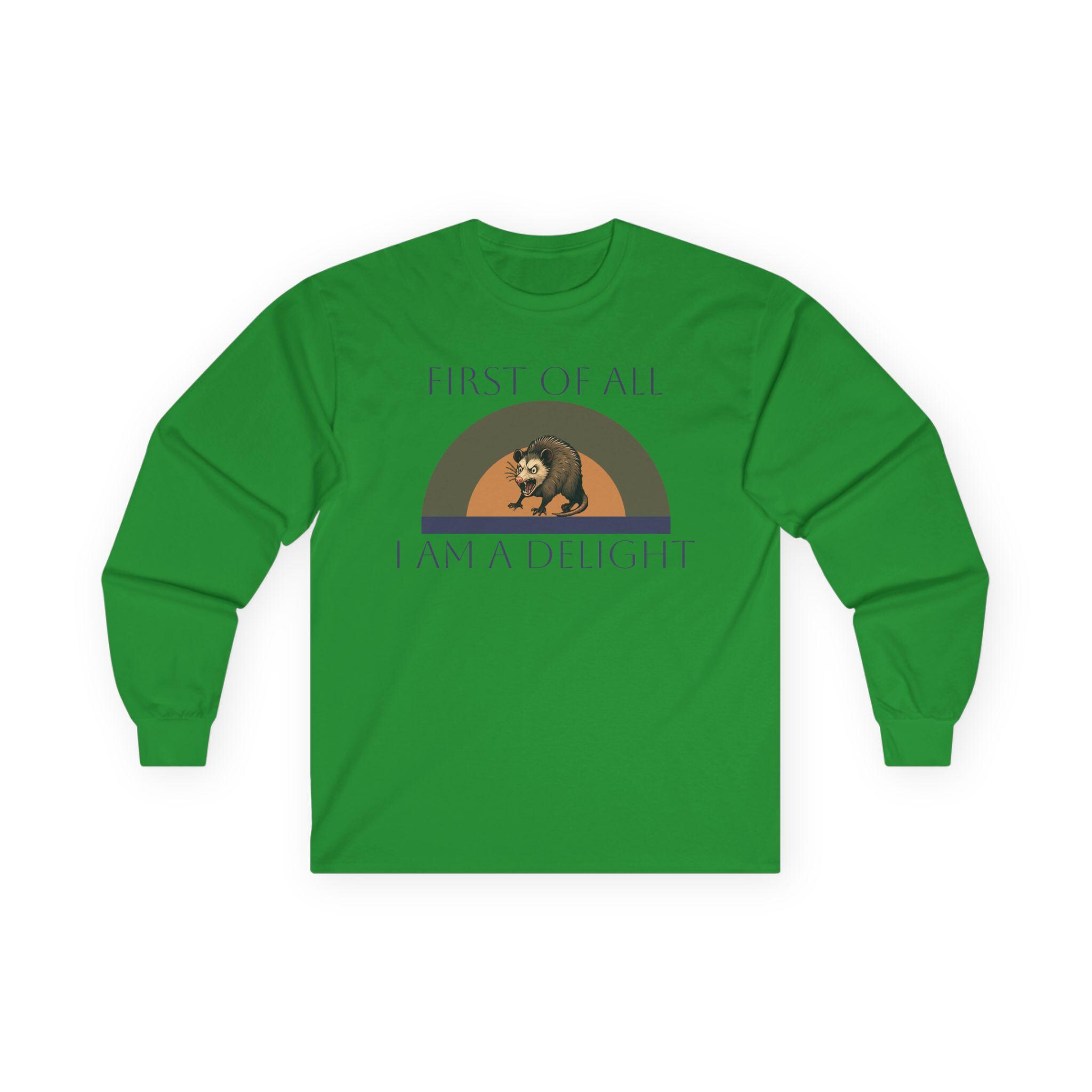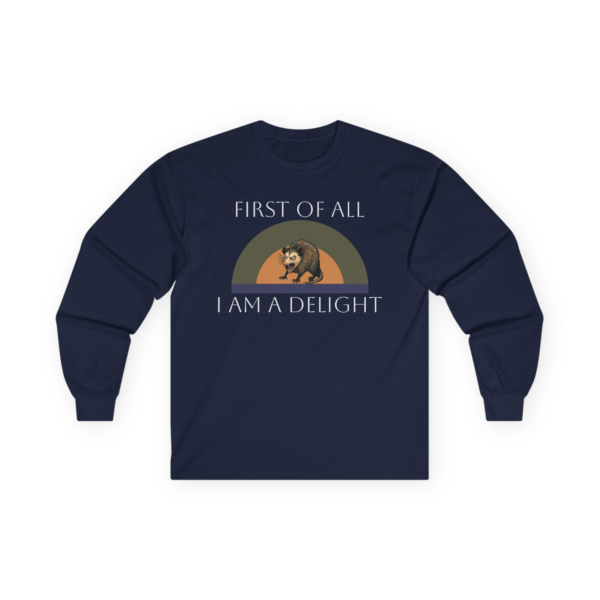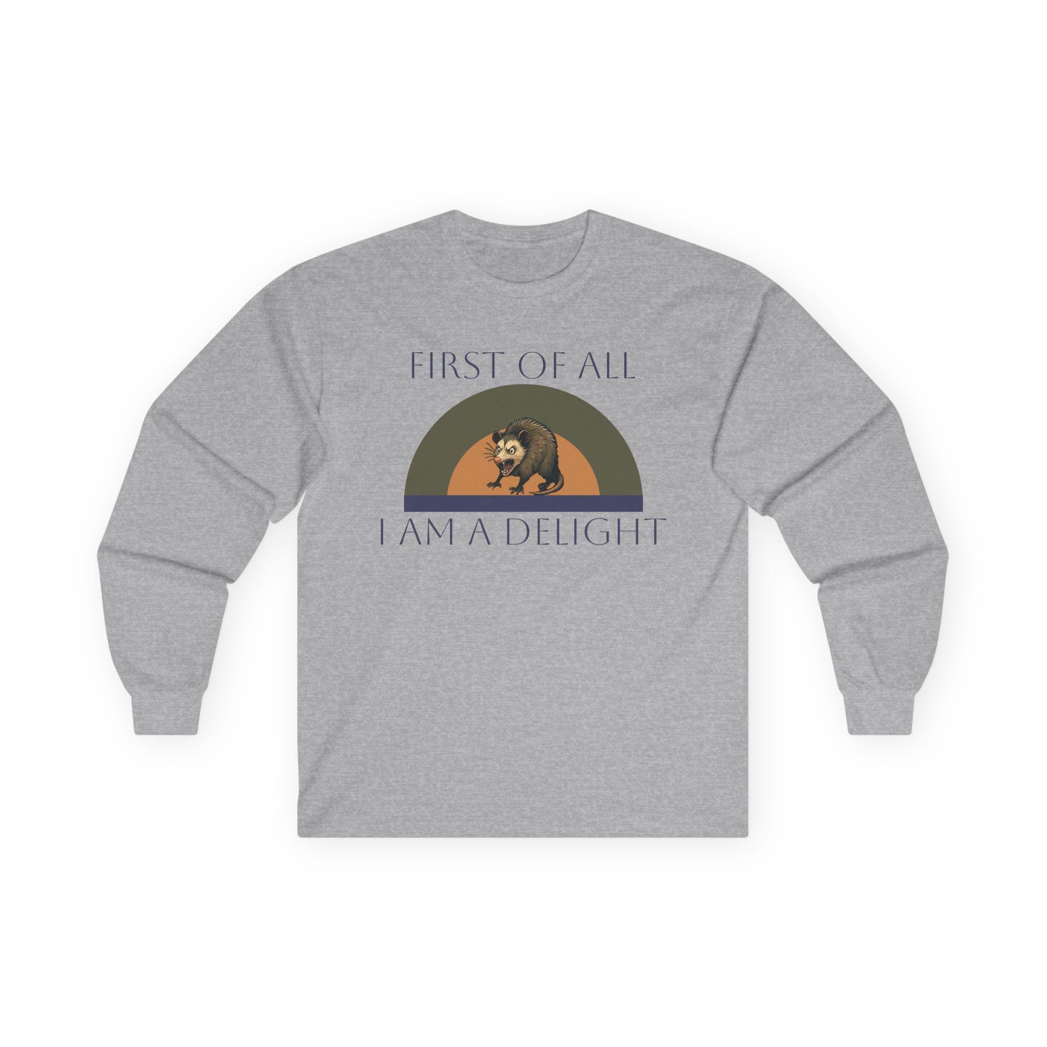 This long-sleeve tee carries a quiet, witty confidence — soft vintage-weight cotton with a calm white canvas and a small, nostalgic graphic across the chest. The design shows a relaxed bear under a muted rainbow with the words “FIRST OF ALL / I AM A DELIGHT,” giving the shirt a warm, slightly tongue-in-cheek personality. Wear it layered under a jacket on cool mornings or solo when you want your outfit to say, slowly and kindly, that you know your worth. The fabric has a substantial, broken-in feel that settles around the body without clinging. Because it’s knit as a single tube with reinforced shoulders and a stretchy ribbed collar, it keeps a clean silhouette wash after wash. Note the classic fit and medium weight — it drapes like a lived-in favorite rather than a stiff, new piece.