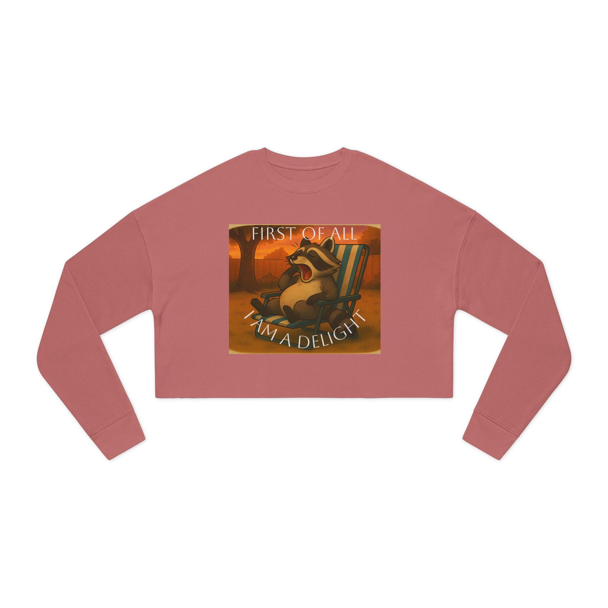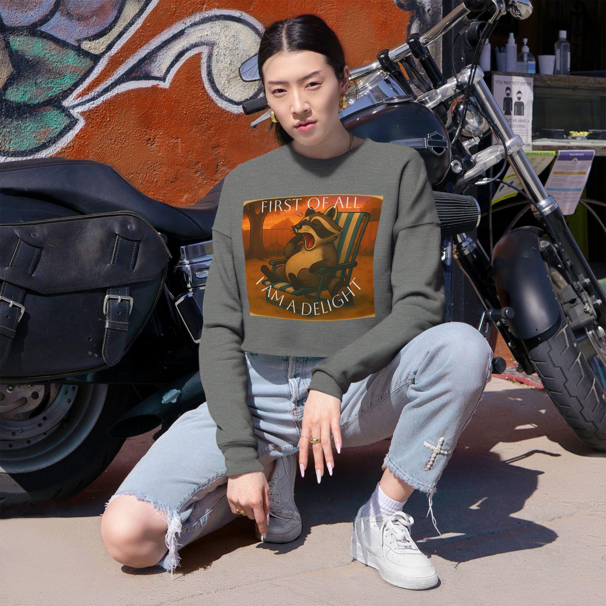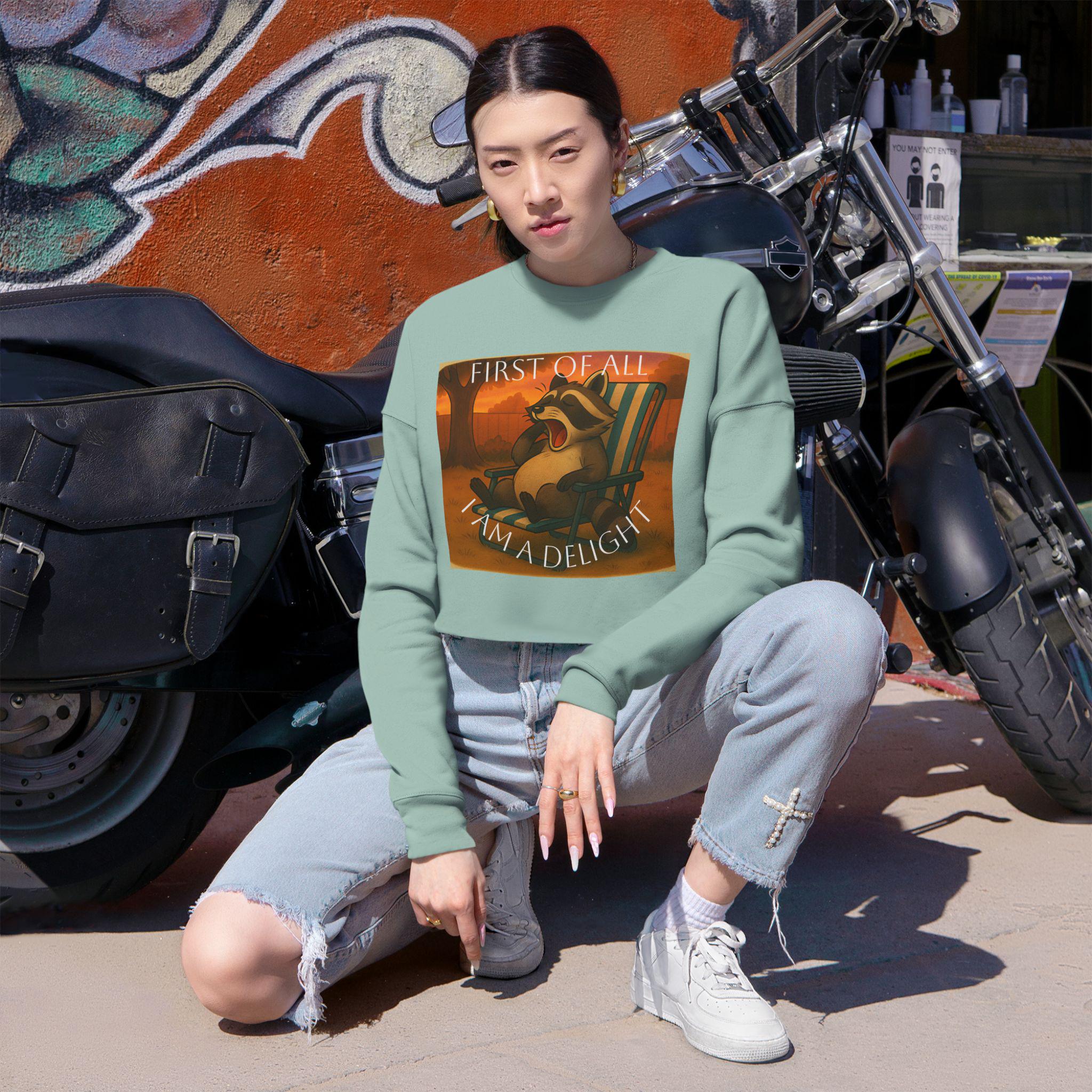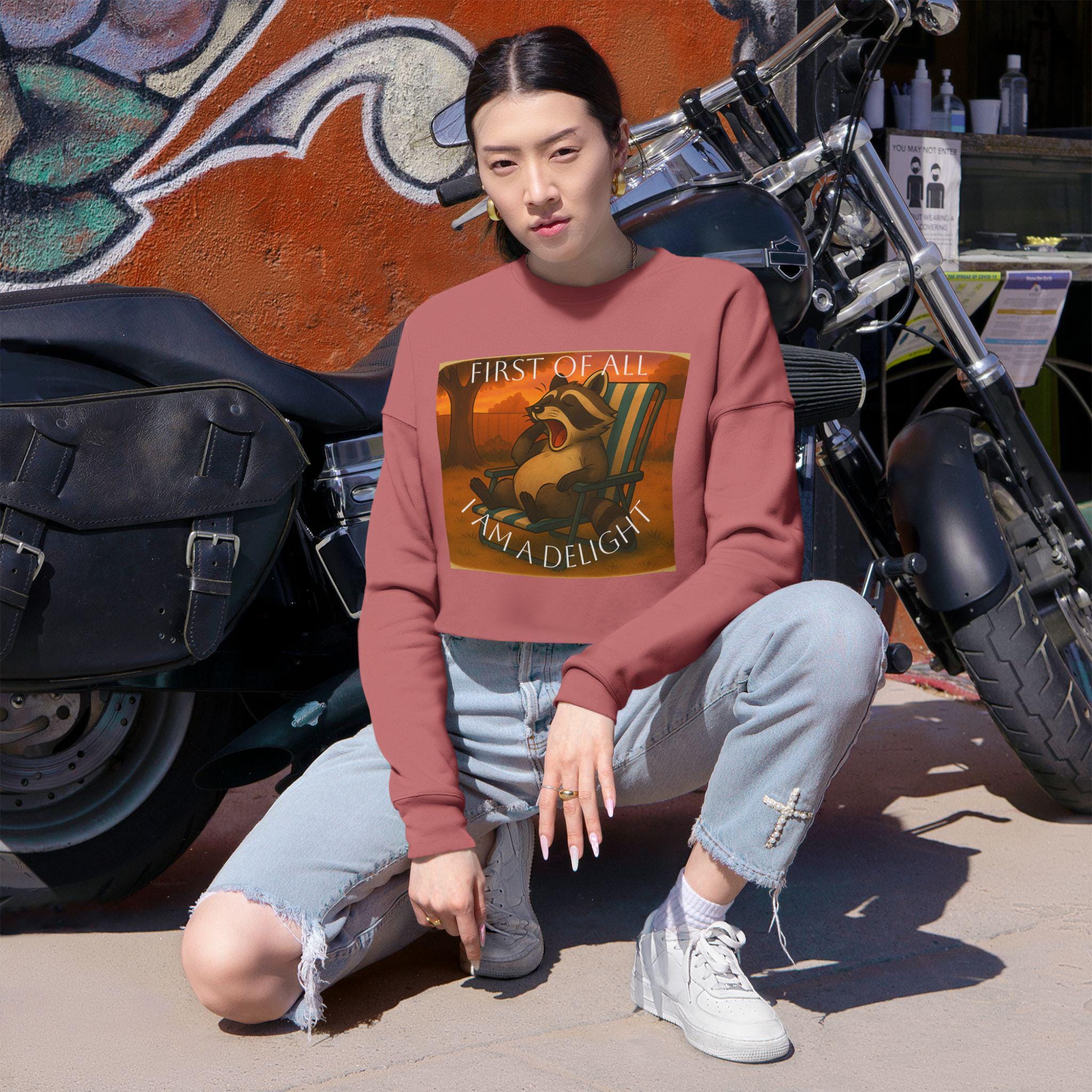 This cropped sweatshirt is soft, relaxed, and quietly playful — a cropped silhouette in a warm rose tone with a lounging racoon during sunset graphic. It feels lived-in from the first wear: the medium-weight, combed ring-spun cotton blend has a smooth, slightly luxurious hand while the dropped shoulders and raw hem give it an easy, off-duty edge. Wear it with high-waisted jeans, layered over a slip dress, or tossed on for slow, cozy mornings. The sloth artwork and subtle lettering create a slow-living vibe that speaks to people who favor comfort, humor, and laid-back style.