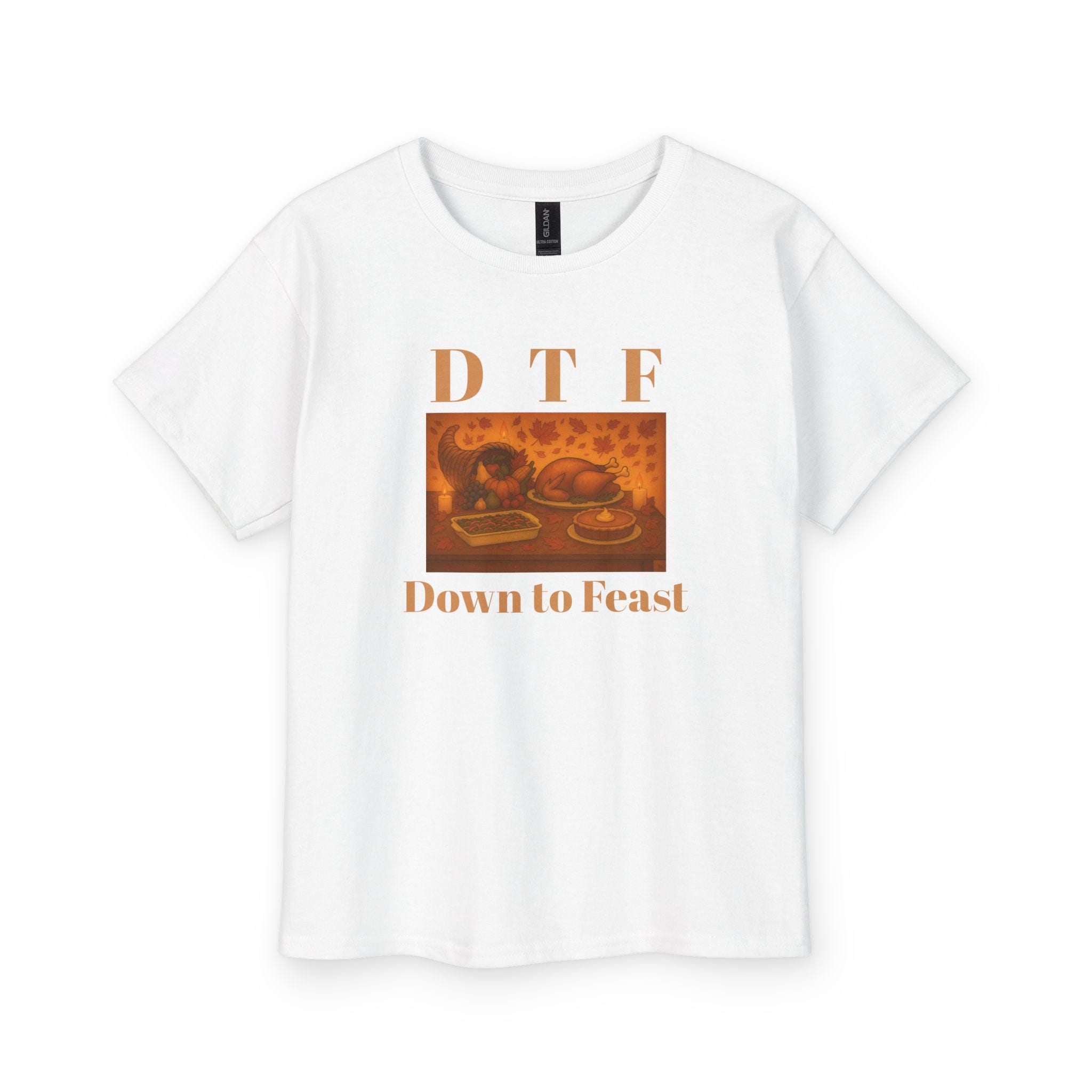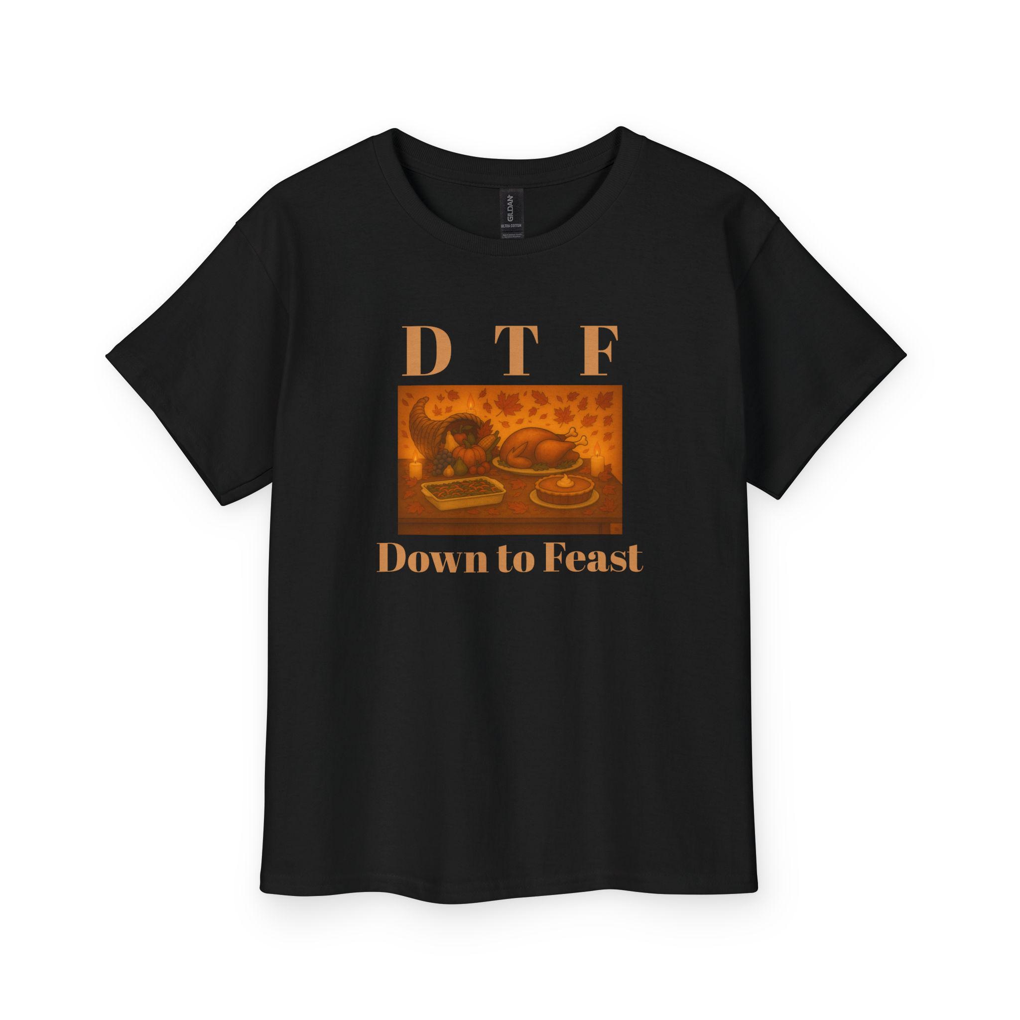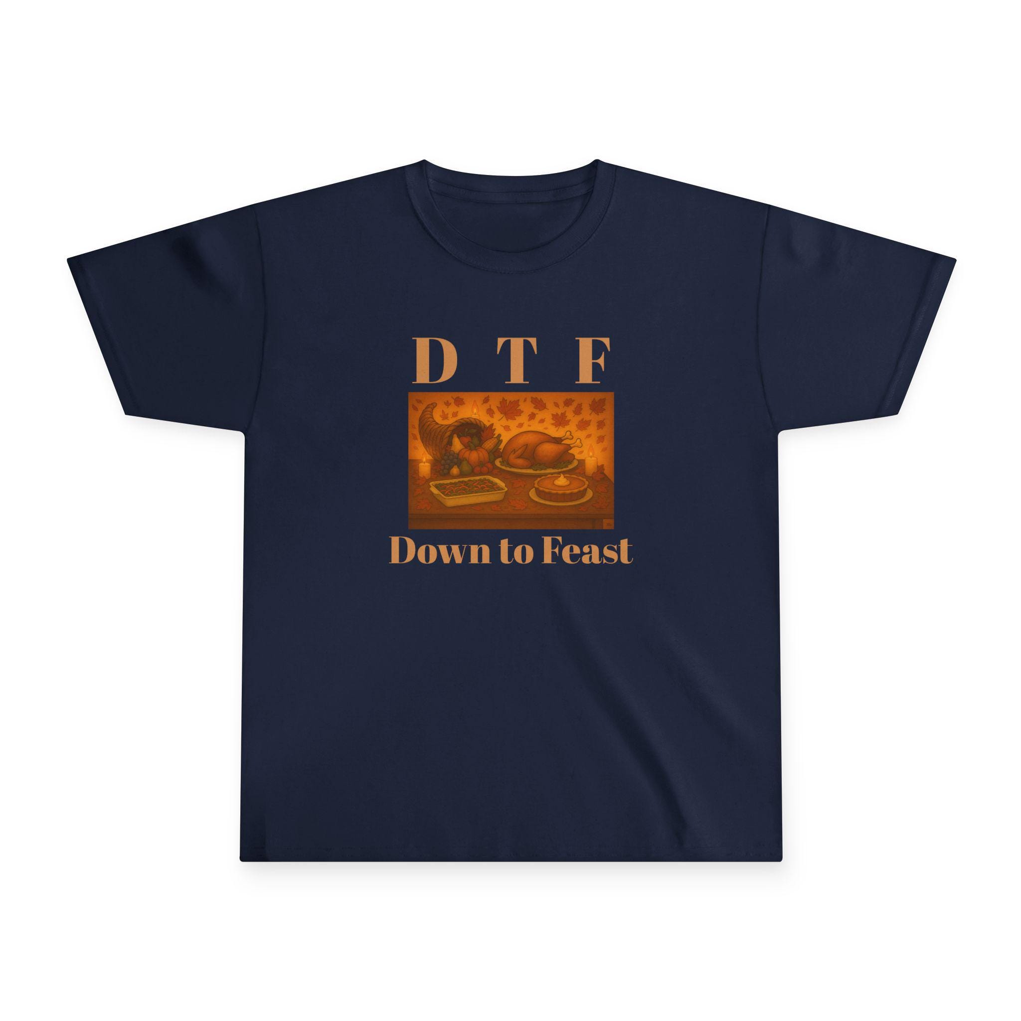 This soft, vintage-feel tee brings warm, playful energy to a child's everyday wardrobe. The front features a sunset-orange graphic with the bold letters “DTF” above a cozy still-life of a family-style feast, and the phrase “Down to Feast” beneath — a lighthearted nod to coming together over good food. The lightweight 100% cotton body has a relaxed, regular fit that lets kids move freely during play and mealtime. Subtle vintage texture and a tear-away label keep comfort front and center, while the sturdy ribbed collar and shoulder-taped seams help the shirt hold its shape wash after wash. It’s a casual tee that blends homey charm with durable, kid-friendly construction.