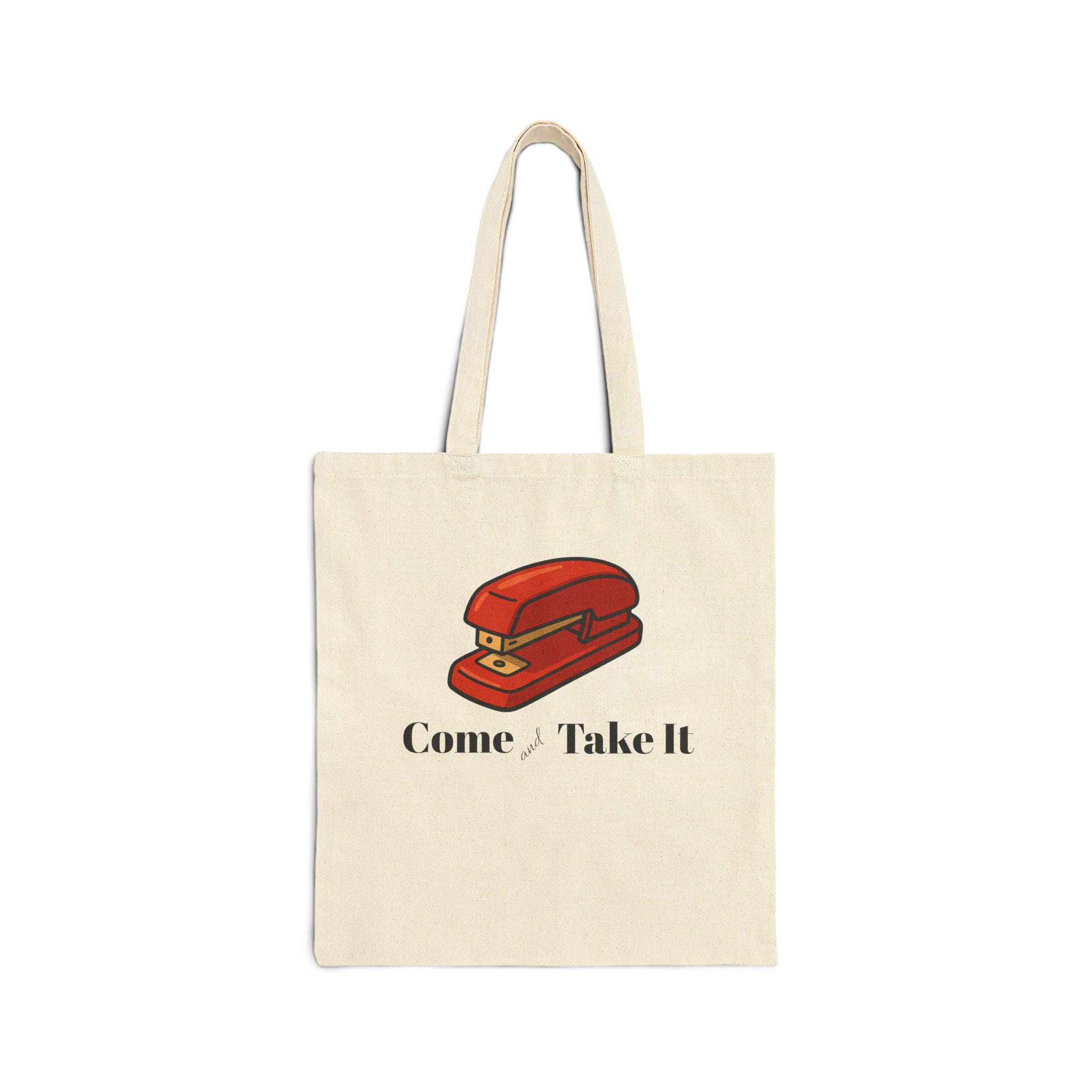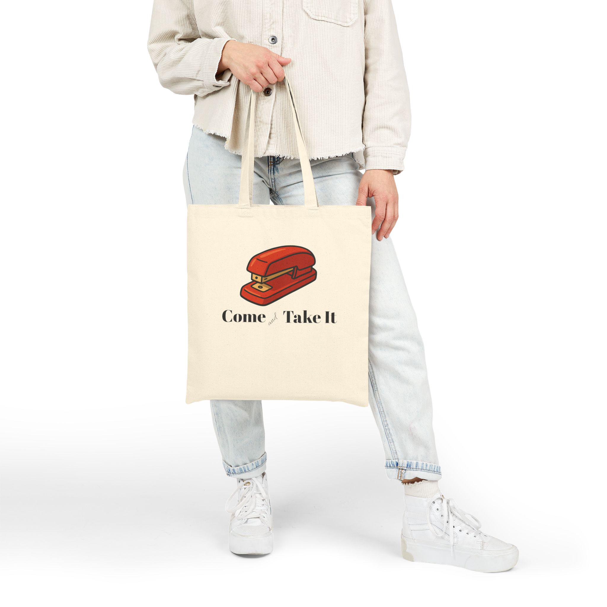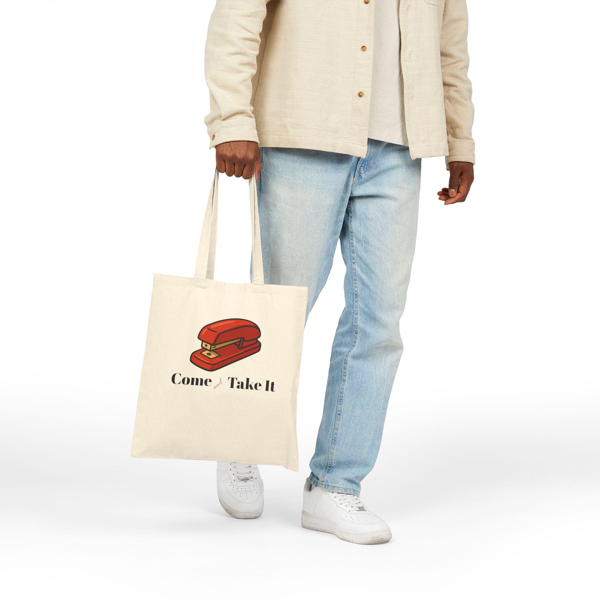 A sturdy cotton canvas tote with a playful, vintage-inspired graphic — a bright red stapler paired with the cheeky line “Come n’ Take It.” Lightweight to carry yet rugged enough for daily use, it brings a wink of office humor to errands, classes, or commute days. The natural canvas gives the illustration room to breathe while the long, reinforced handles sit comfortably over the shoulder. It’s the kind of bag that sparks small smiles in checkout lines and turns routine outings into a moment of private amusement.