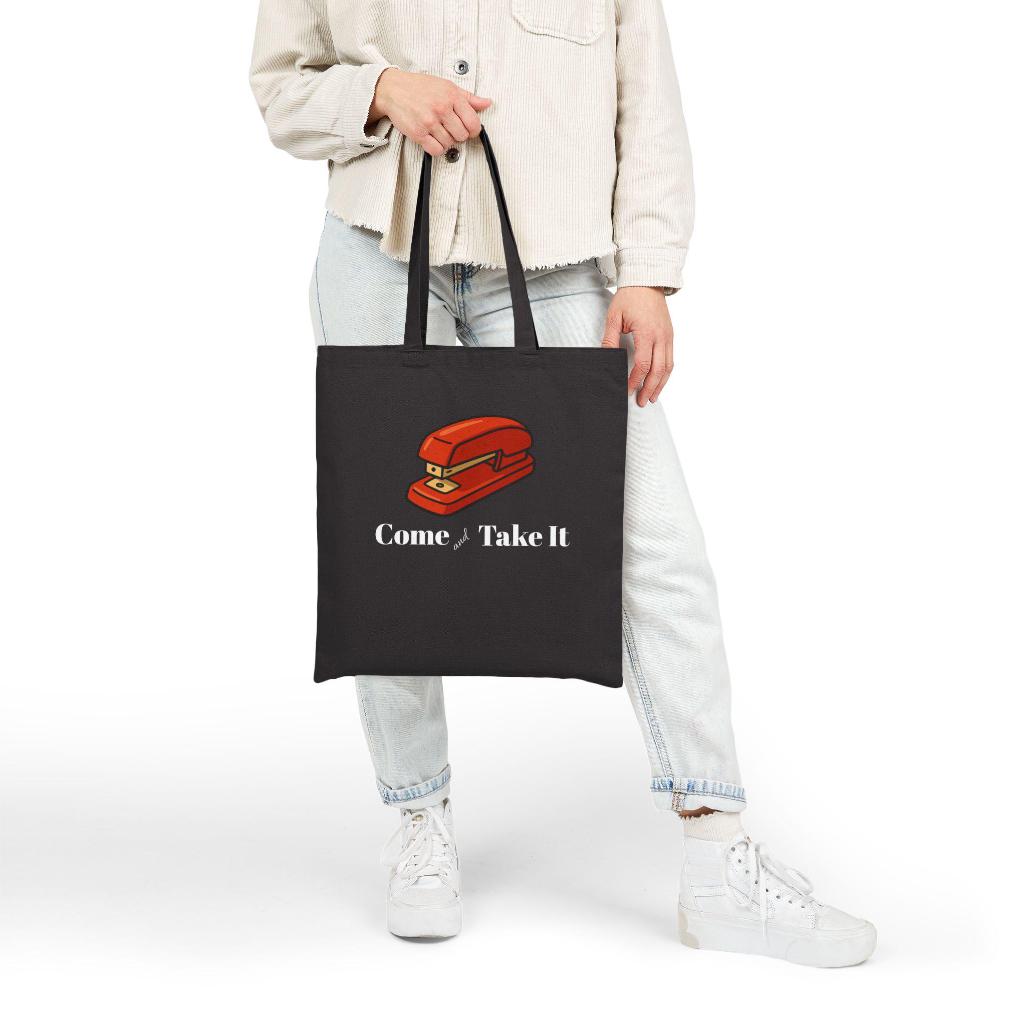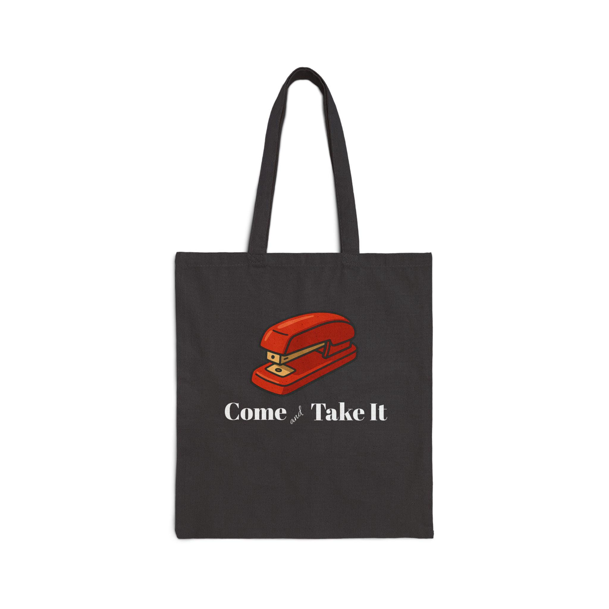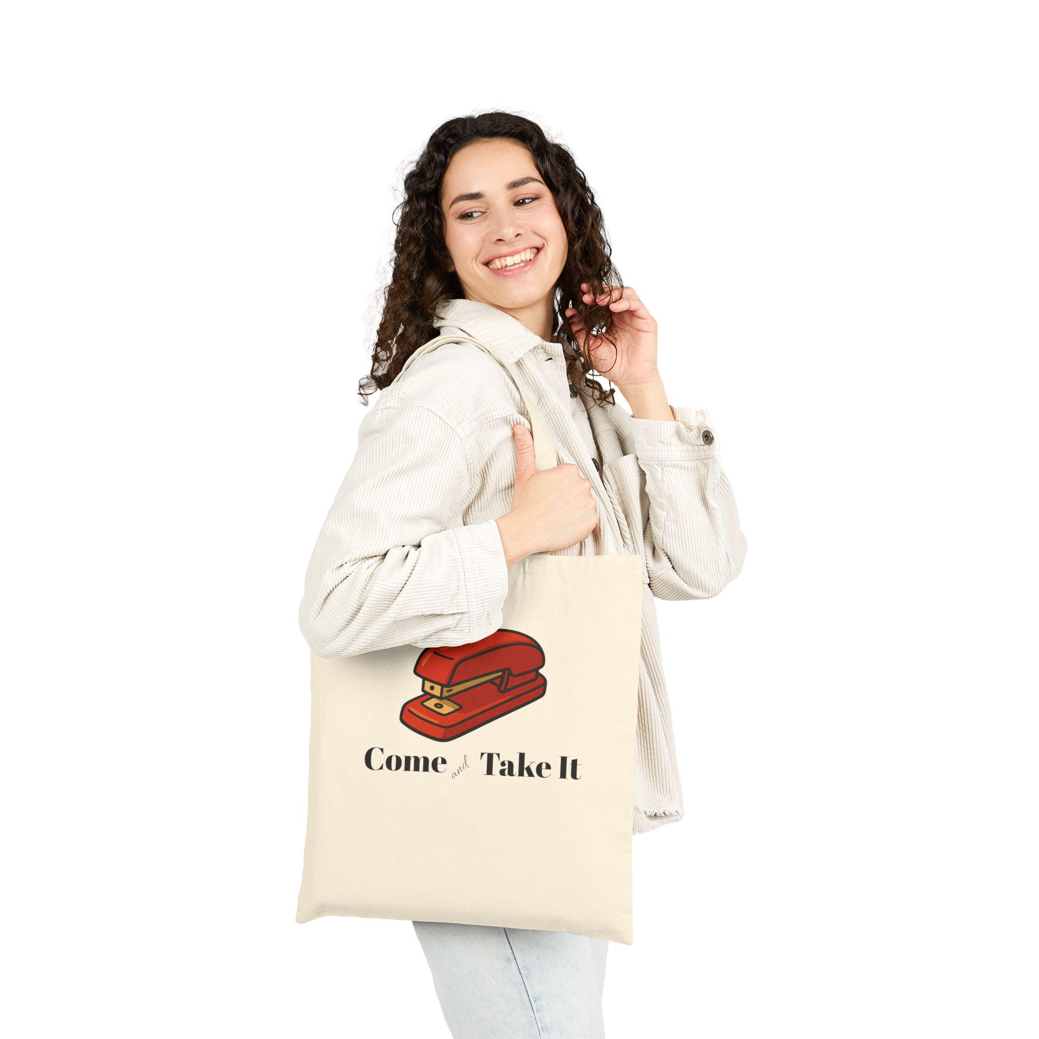 A sturdy cotton canvas tote with a playful, vintage-inspired graphic — a bright red stapler paired with the cheeky line “Come n’ Take It.” Lightweight to carry yet rugged enough for daily use, it brings a wink of office humor to errands, classes, or commute days. The natural canvas gives the illustration room to breathe while the long, reinforced handles sit comfortably over the shoulder. It’s the kind of bag that sparks small smiles in checkout lines and turns routine outings into a moment of private amusement.