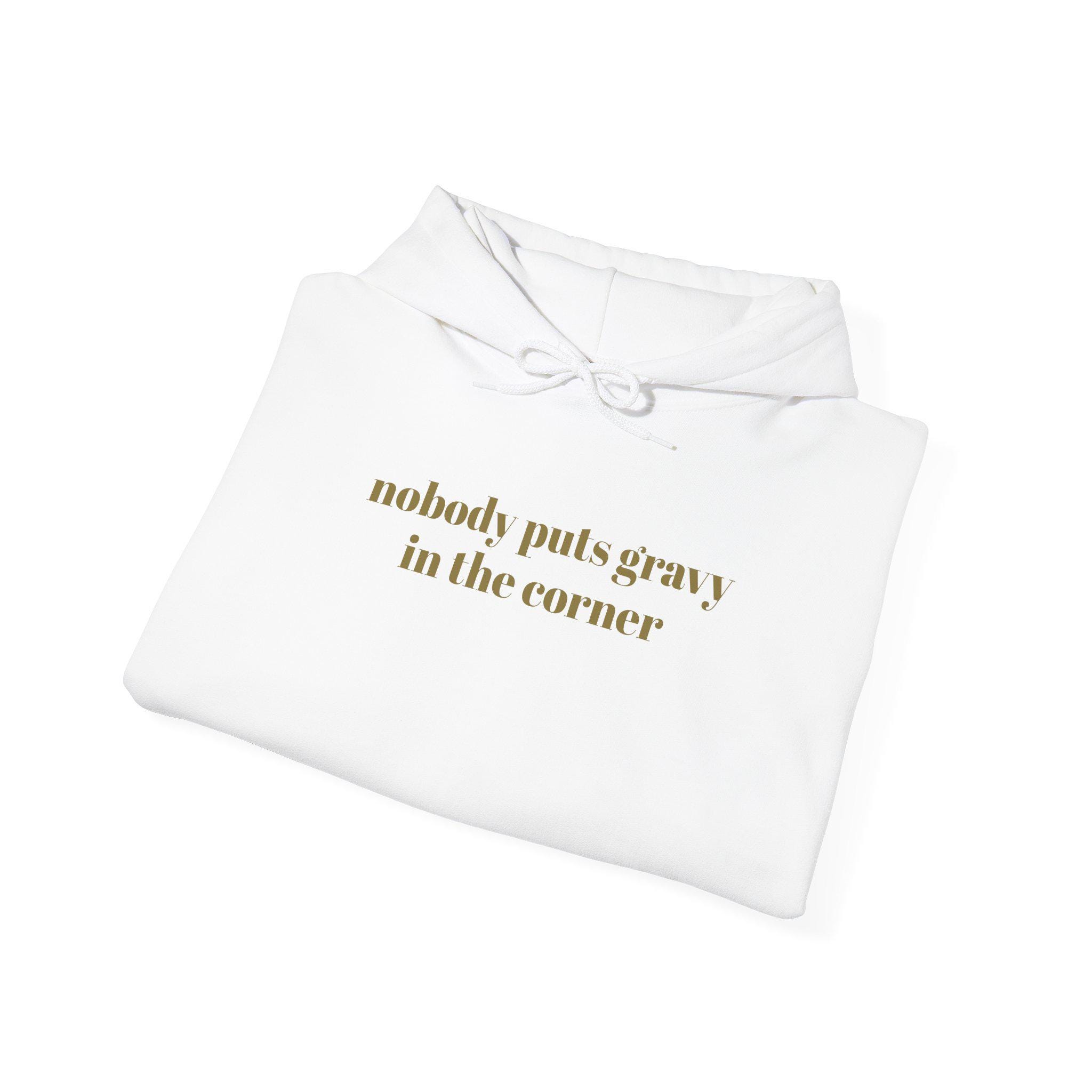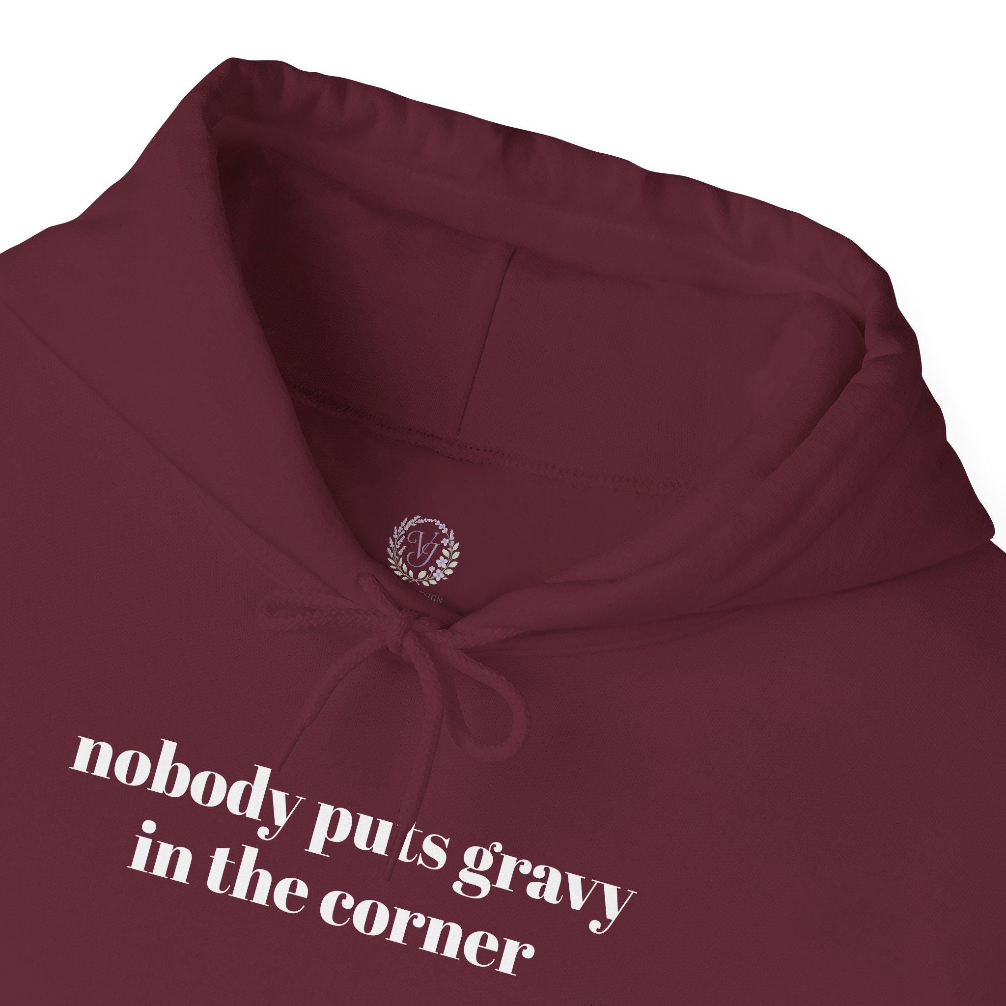 Stay cozy and funny this Thanksgiving with our 'nobody puts gravy in the corner' hoodie. This sweatshirt is perfect for anyone looking to add some holiday humor to their wardrobe. Ideal for adults celebrating Thanksgiving and looking for a comfortable and humorous outfit.