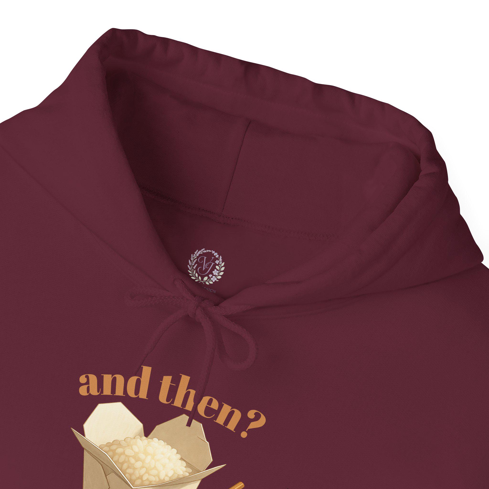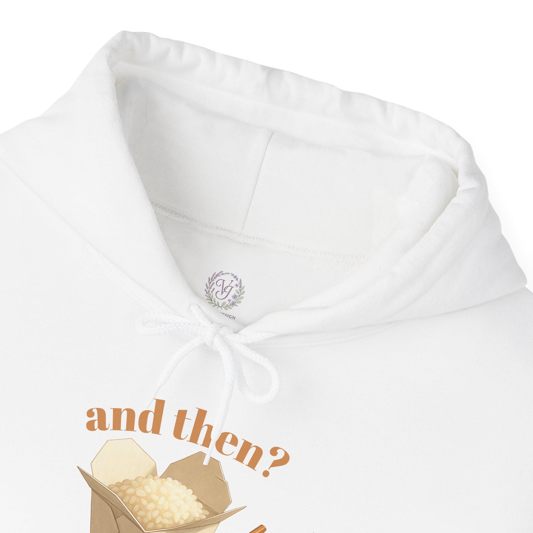 Soft, cozy, and quietly playful — this hoodie feels like a warm pause between errands and late-night takeout runs. The small, vintage-style illustration of an open takeout box with chopsticks and the whisper of text above it creates a gentle, ironic moment on the chest. Wear it over a favorite tee or layer it under a coat; the roomy pouch pocket and double-lined hood make it a go-to on crisp mornings, rainy afternoons, and slow evenings in. The muted, earthy print tones sit subtly against the clean white fabric, giving the piece a minimal, lived-in look that reads more like a memory than a logo.