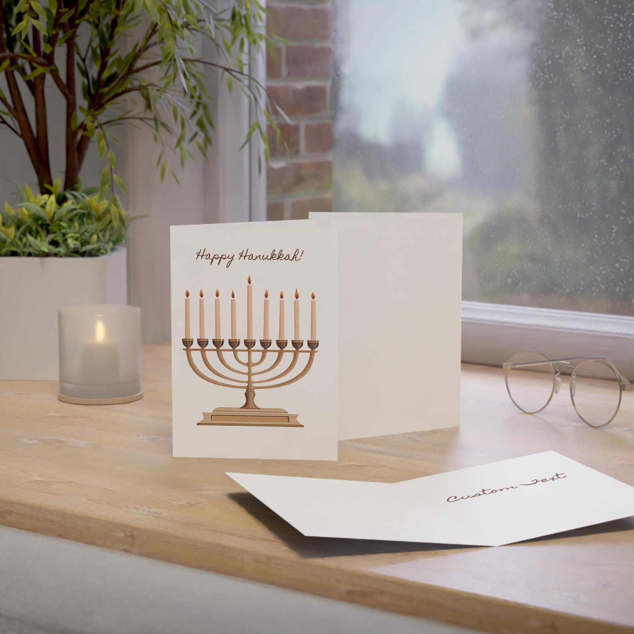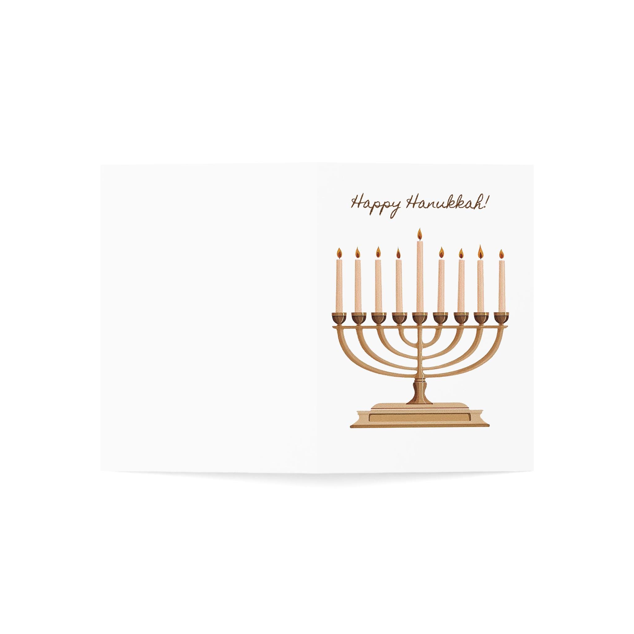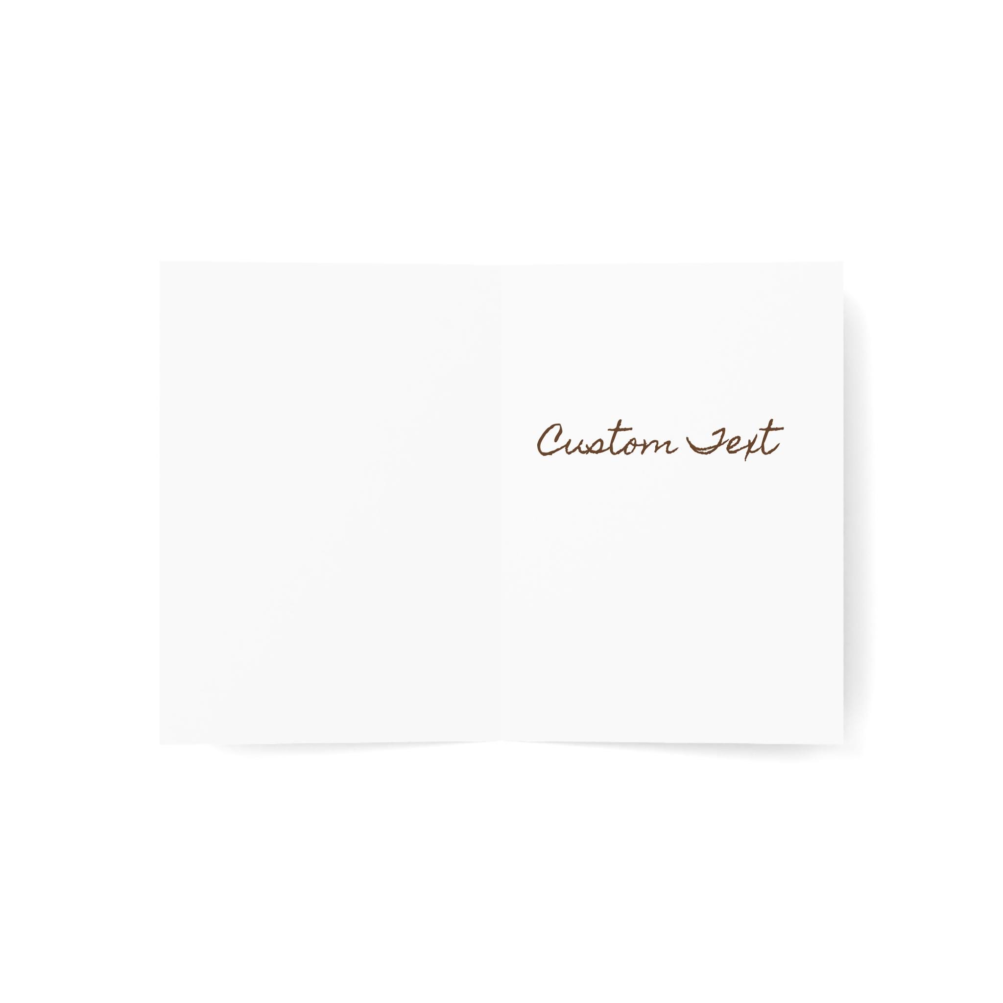 Light this Hanukkah with a card that speaks from the heart. The design reads “Happy Hanukkah!” with a personalized inside message waiting for your words. Hold it and feel the weight of thick 270gsm paper, the colors popping in vibrant, crisp detail. The subtle overlap of the front cover gives a refined, hand-finished look, while the satin-like coated option adds a soft glow to your greeting. Choose horizontal or vertical layout, and pick the finish that suits your style — uncoated for a natural feel or coated for a smoother sheen. Each card comes with a coordinating envelope and is printed double-sided on high-quality stock sourced from the USA. Send warmth, light, and a truly personal note this holiday.
