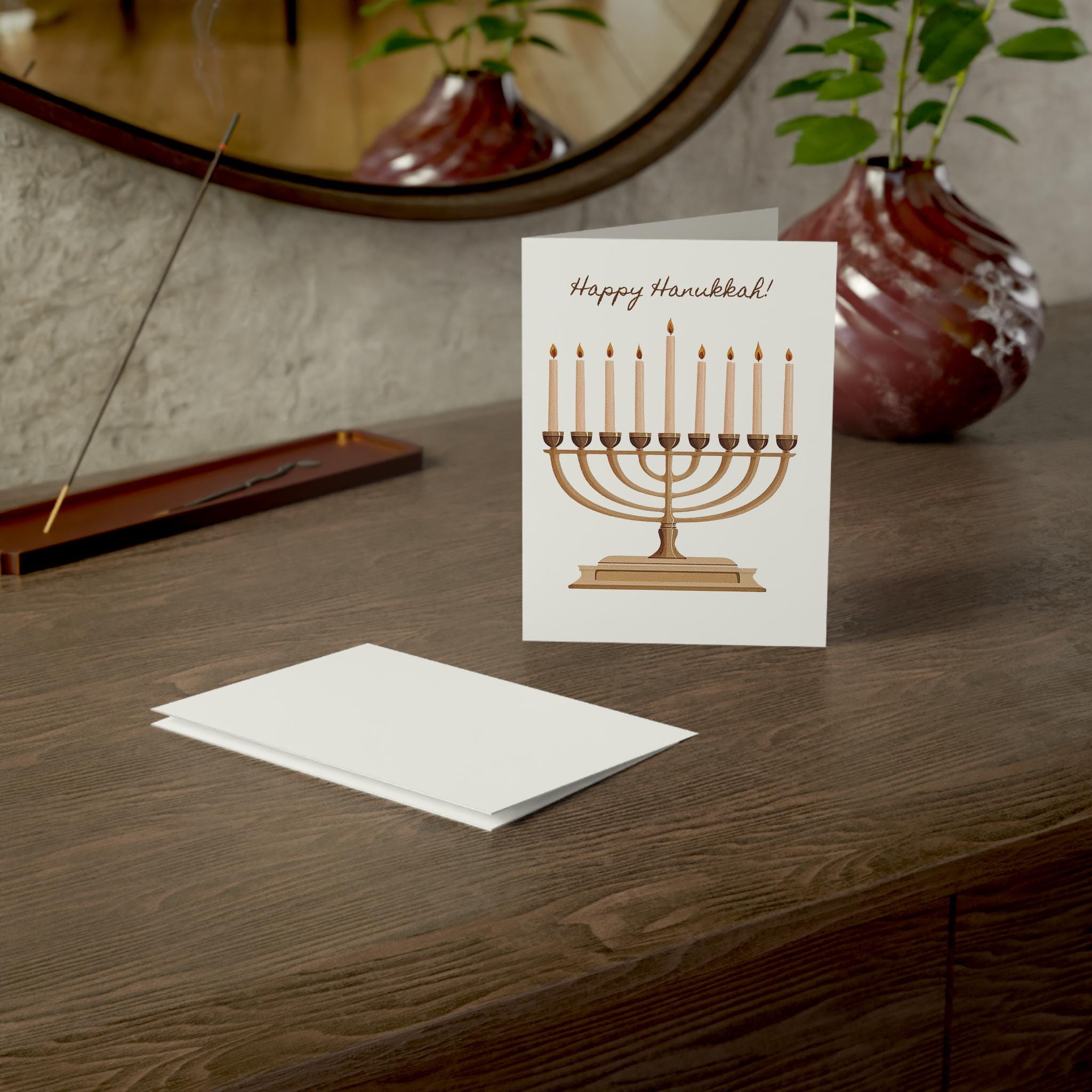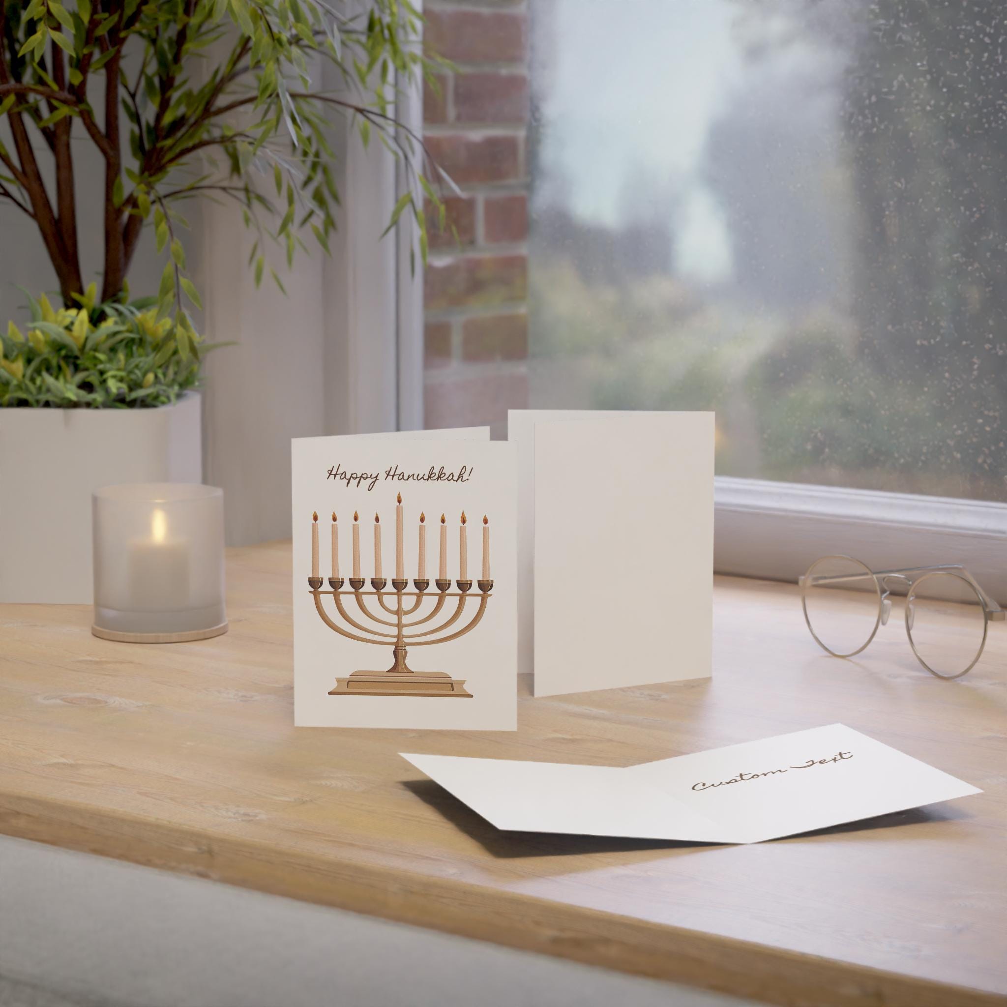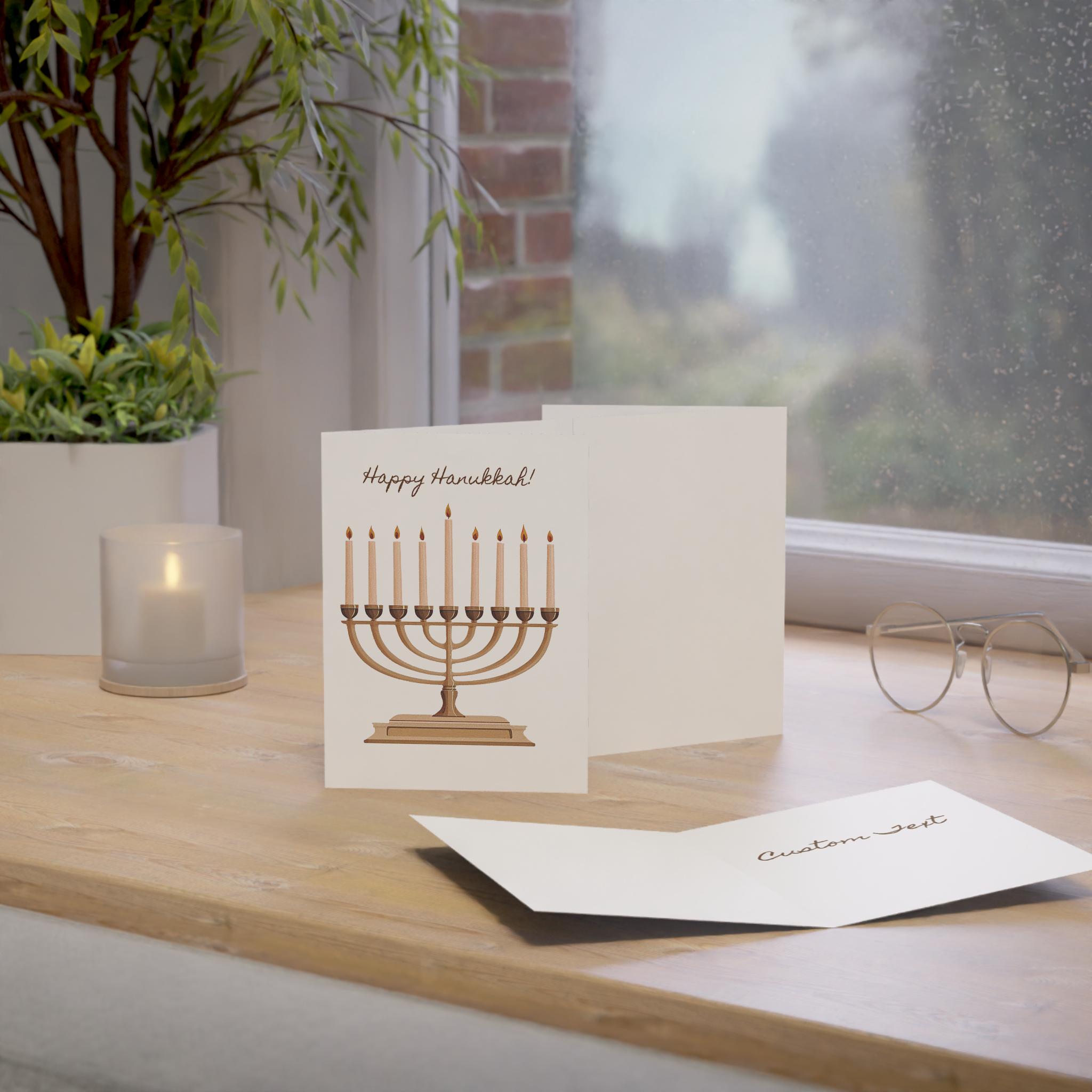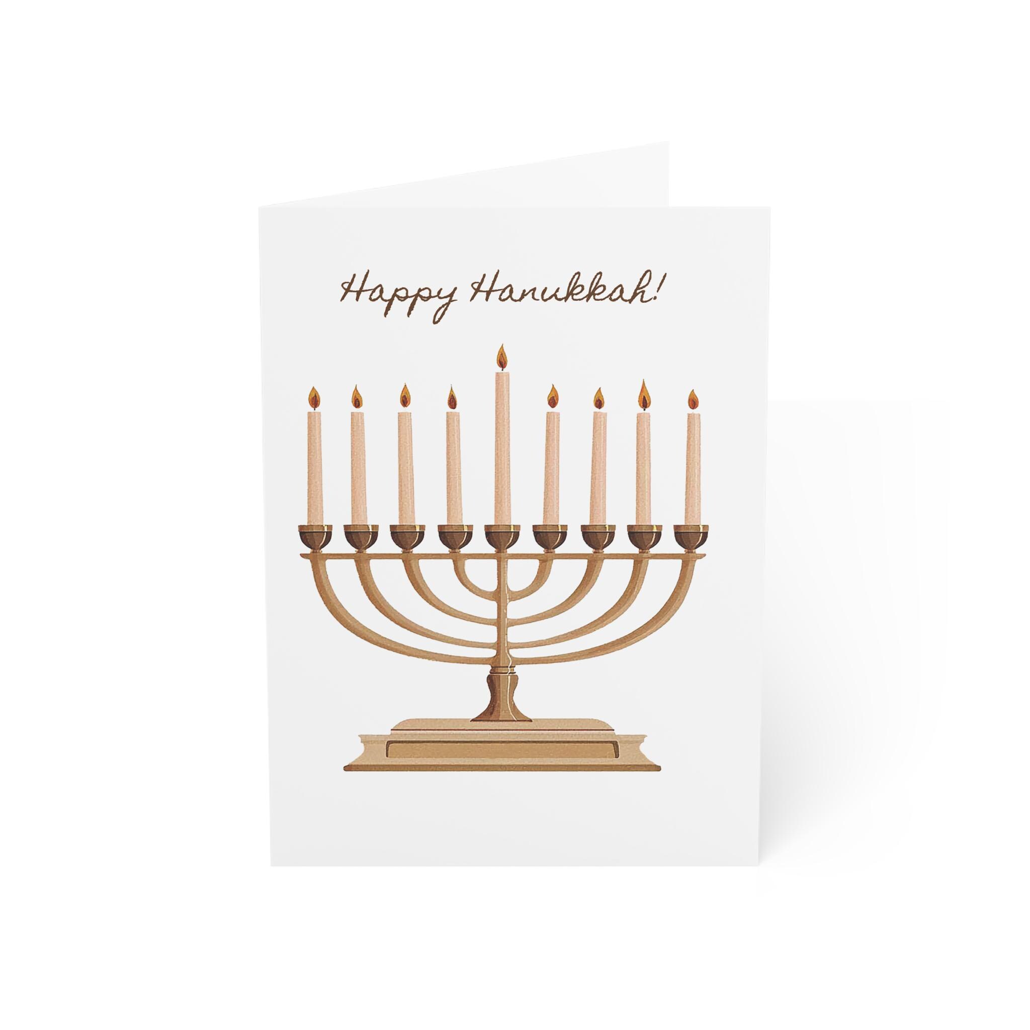 Light this Hanukkah with a card that speaks from the heart. The design reads “Happy Hanukkah!” with a personalized inside message waiting for your words. Hold it and feel the weight of thick 270gsm paper, the colors popping in vibrant, crisp detail. The subtle overlap of the front cover gives a refined, hand-finished look, while the satin-like coated option adds a soft glow to your greeting. Choose horizontal or vertical layout, and pick the finish that suits your style — uncoated for a natural feel or coated for a smoother sheen. Each card comes with a coordinating envelope and is printed double-sided on high-quality stock sourced from the USA. Send warmth, light, and a truly personal note this holiday.