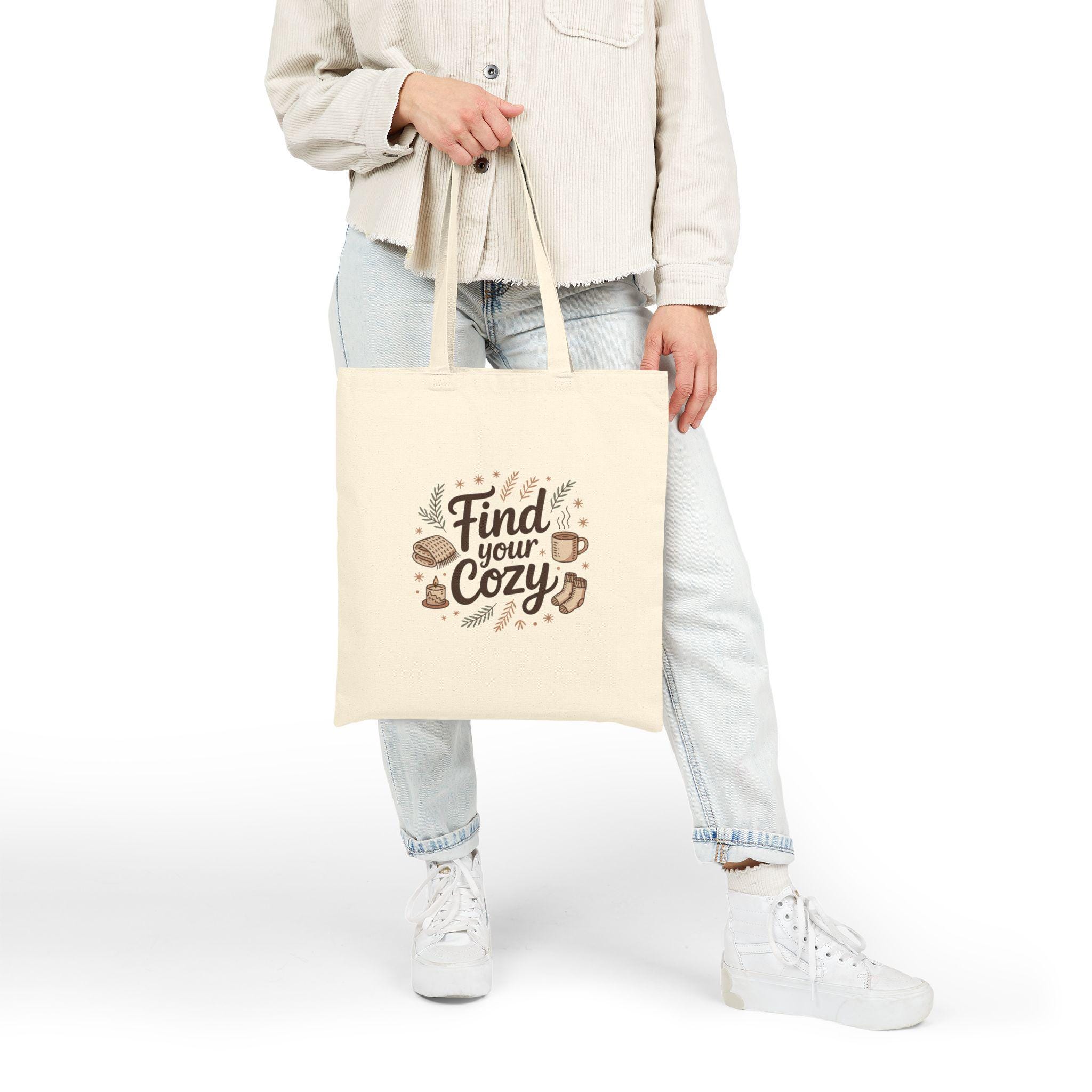 This cotton canvas tote carries a quiet, cozy mood wherever you go. The soft natural canvas and hand-lettered “Find your cozy” design invite slow mornings, bookshop afternoons, and coffee-scented walks. It’s the kind of bag that slips over your shoulder for errands, farmers’ markets, or a tucked-away reading session in a park. The flat, roomy shape keeps the print front-and-center while reinforced handles hold groceries, notebooks, and warm layers without sagging. Available in natural or black, it feels lived-in from day one and grows more familiar with every outing — a simple, comforting companion for anyone who loves small, intentional moments.