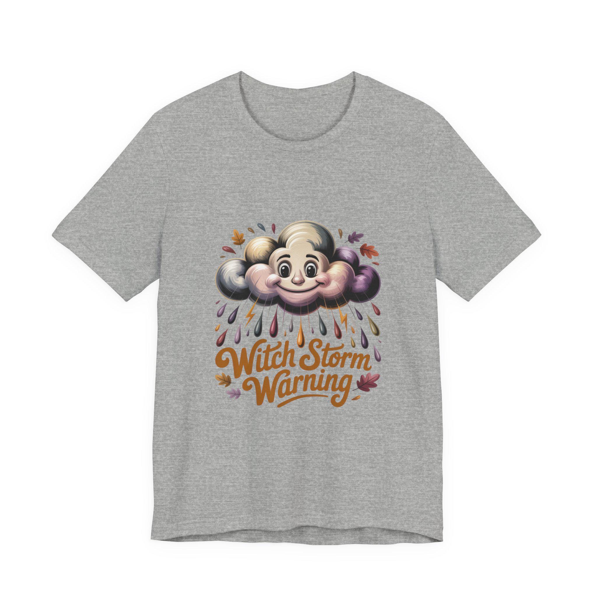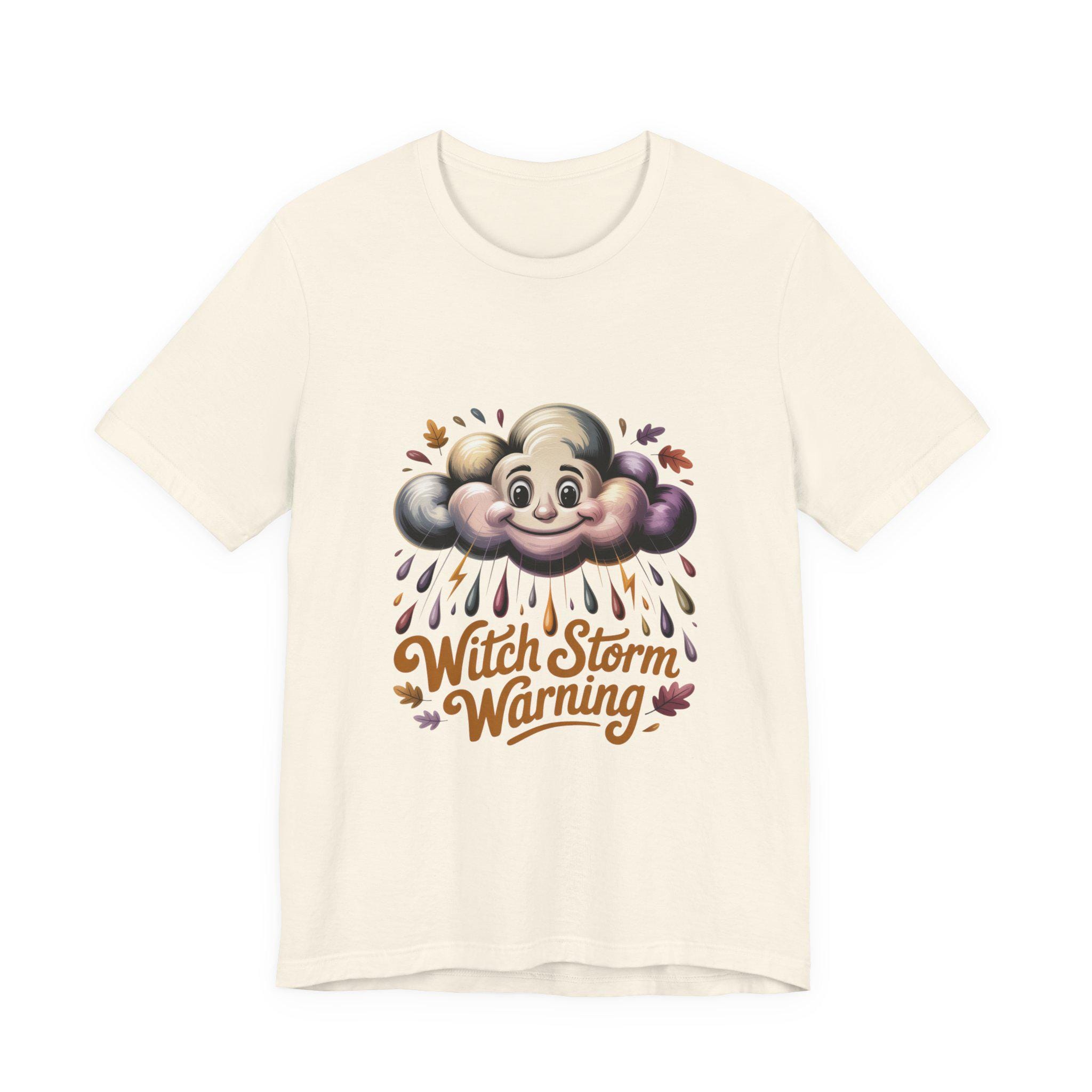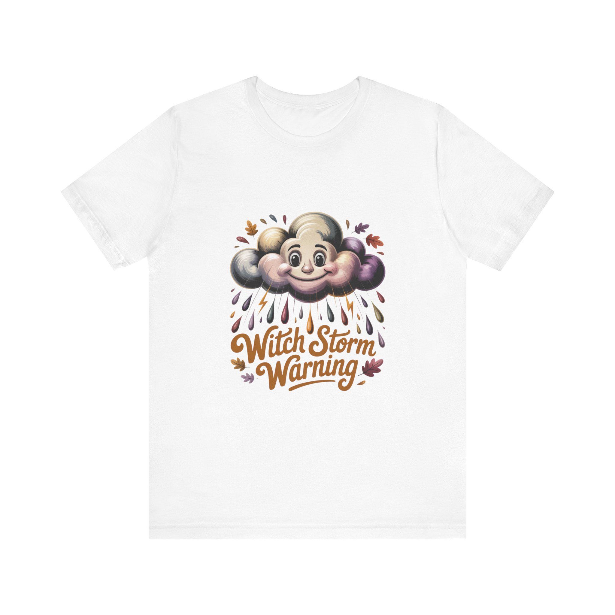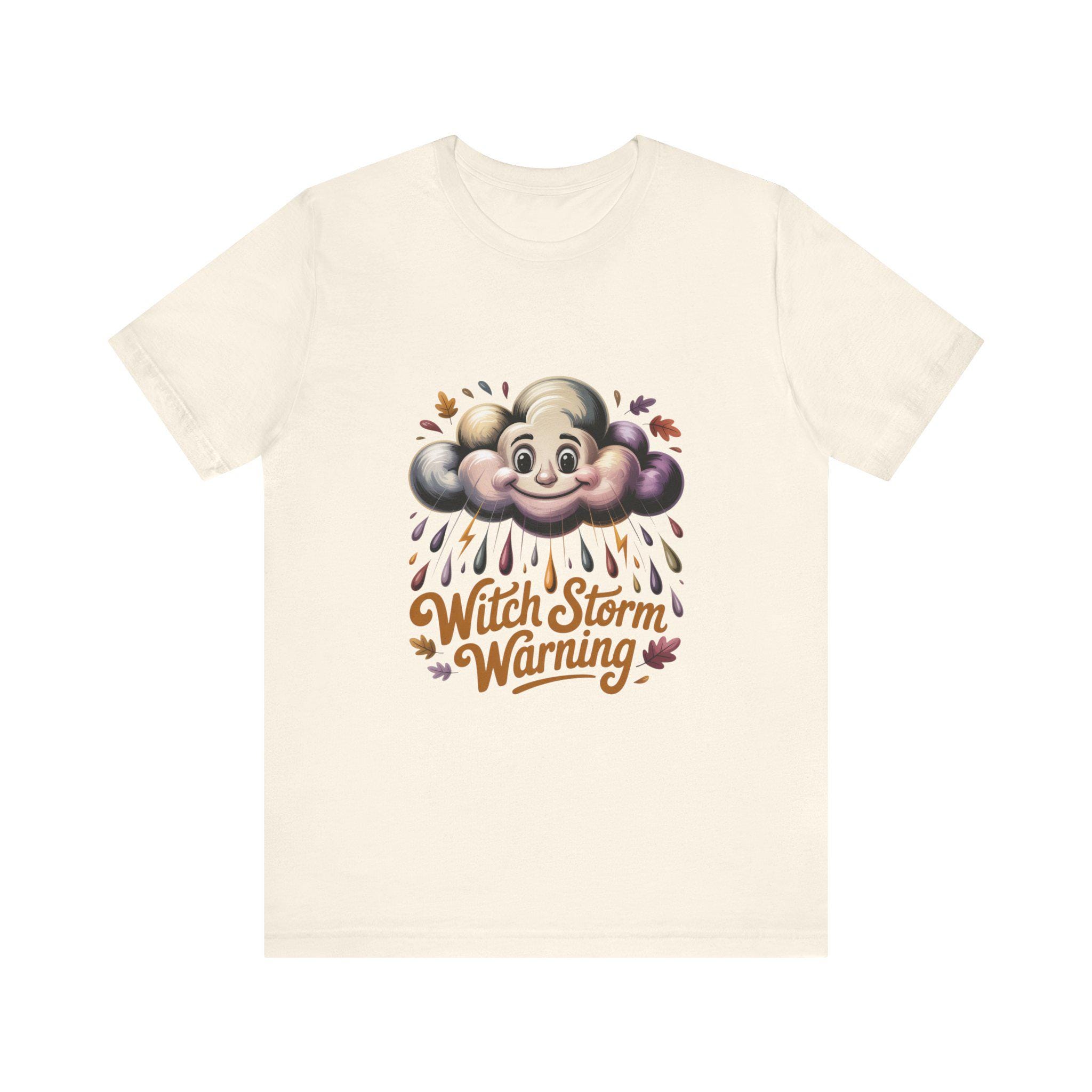 Soft, breathable tee meets cozy autumn charm. This lightweight Jersey tee carries a cheeky, vintage-inspired cloud illustration above hand-lettered text reading “Witch Storm Warning,” surrounded by tiny falling leaves and raindrops. The muted autumn palette and rounded, friendly face on the cloud give it a playful, slightly spooky vibe that sits comfortably between seasonal flair and everyday wear. Wear it to signal your love of crisp walks, pumpkin spice rituals, and cozy nights in. The retail fit layers easily under jackets or stands alone with jeans. It’s a subtle way to bring Halloween energy into casual moments without going full costume.