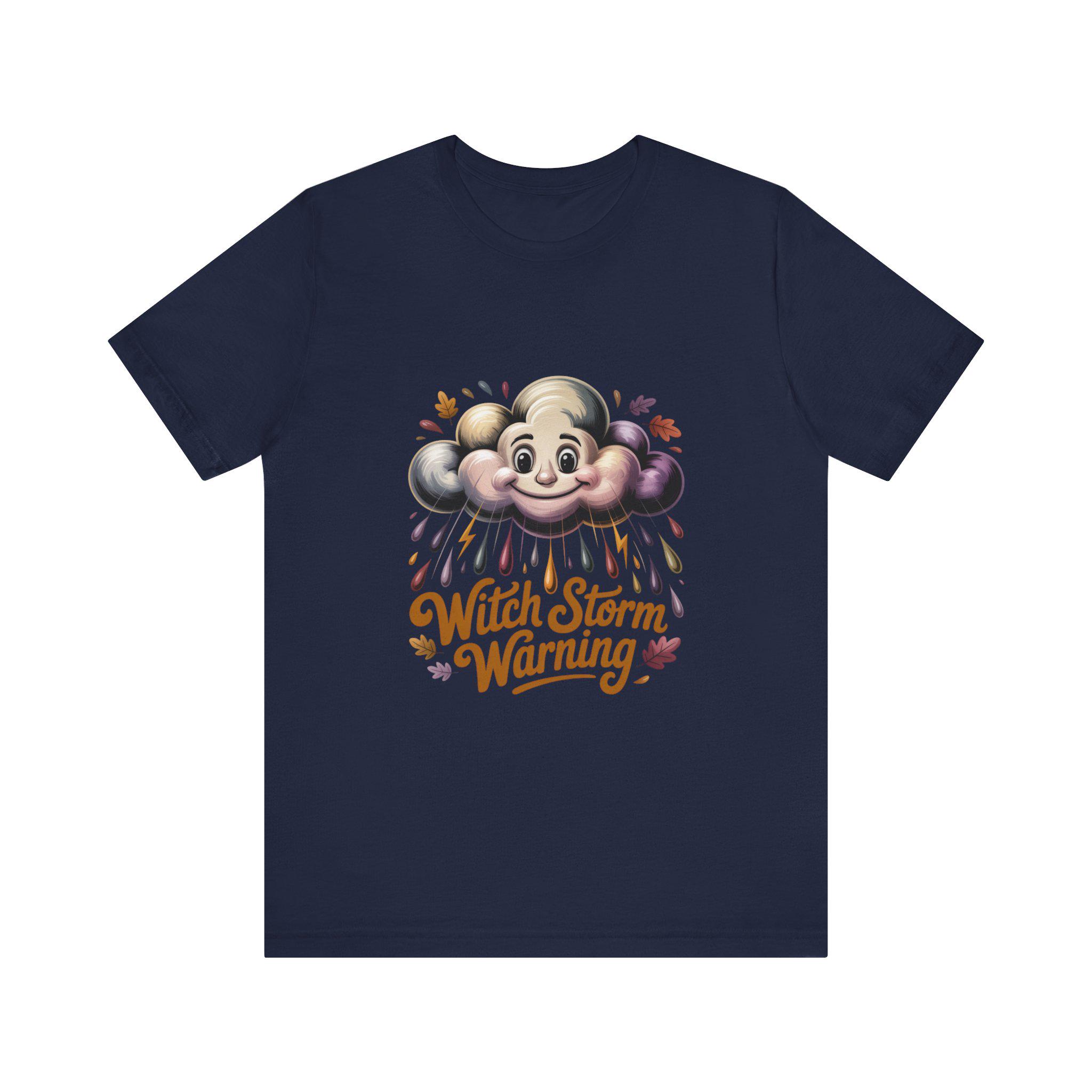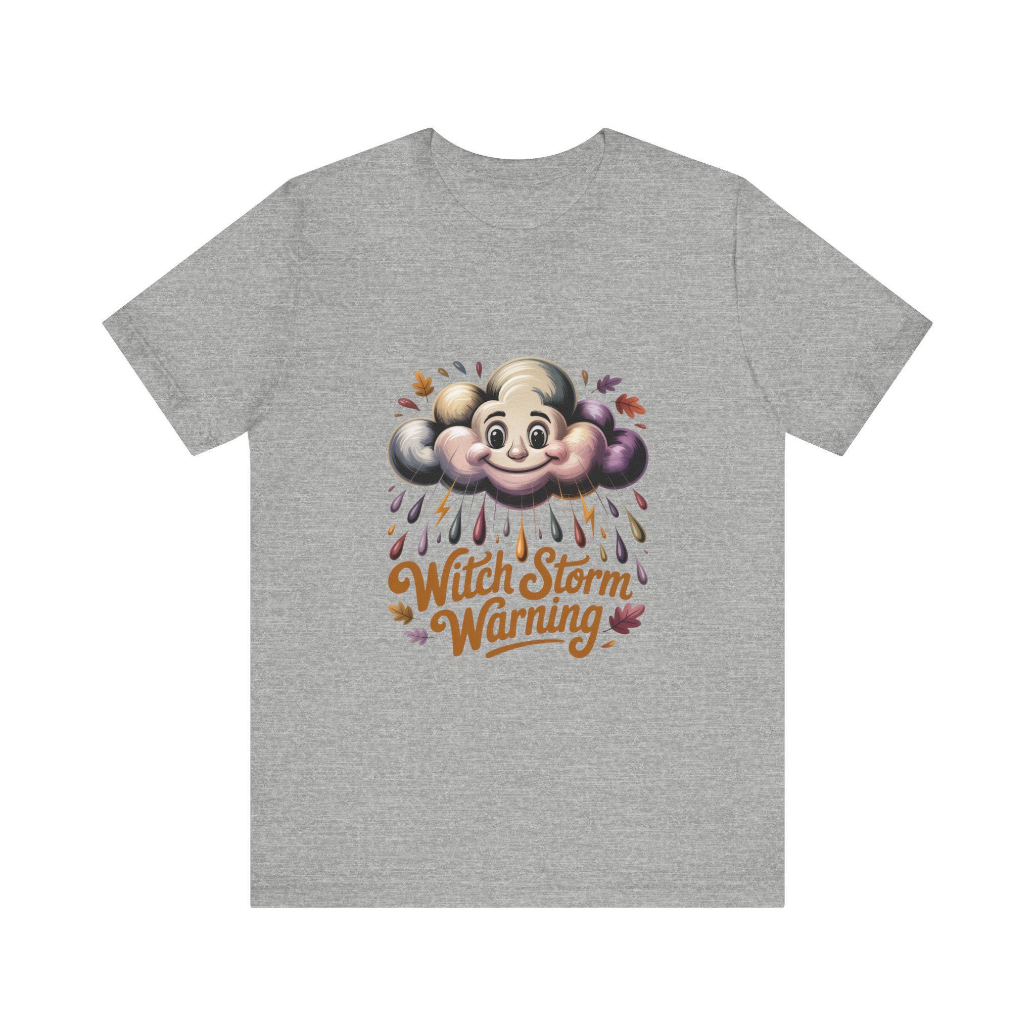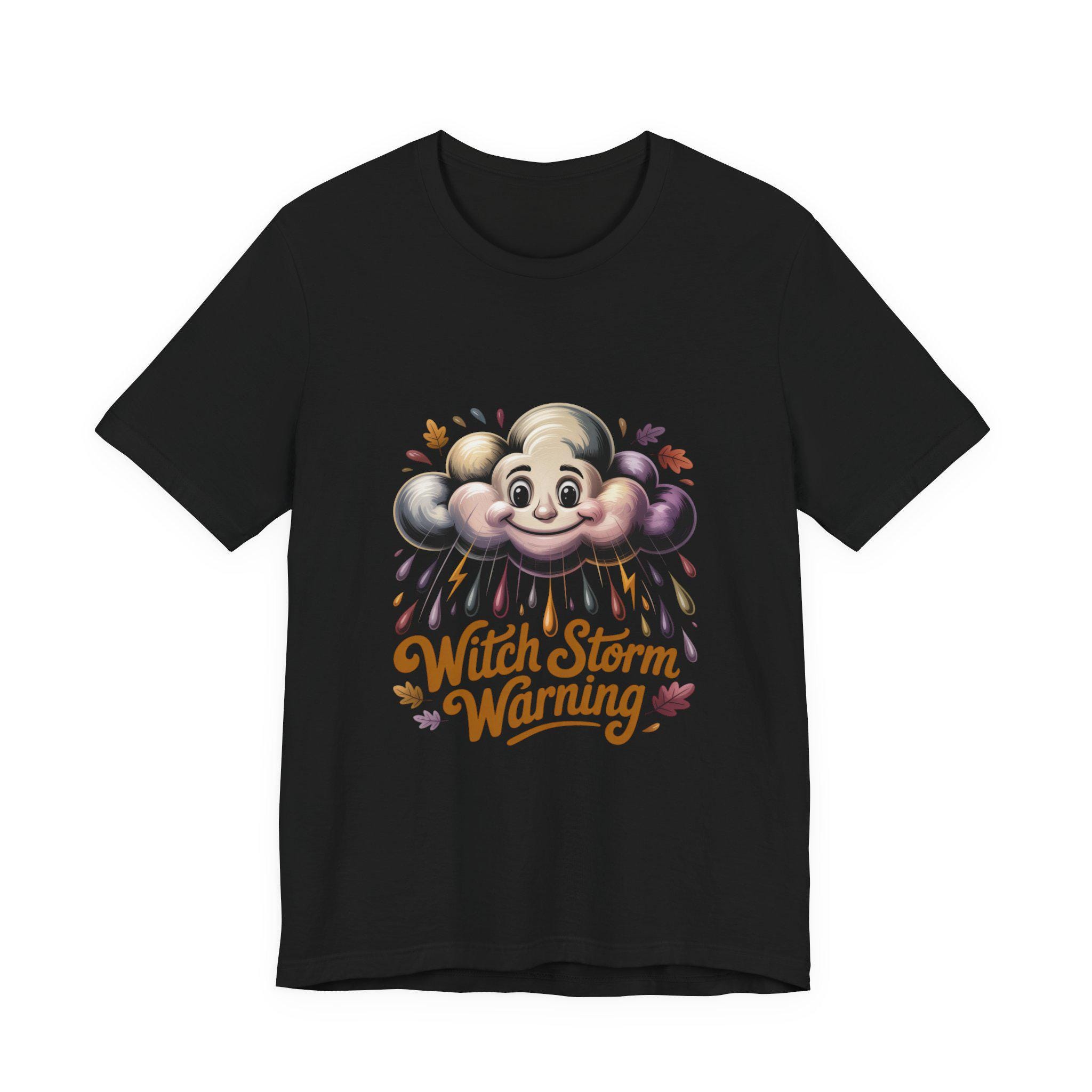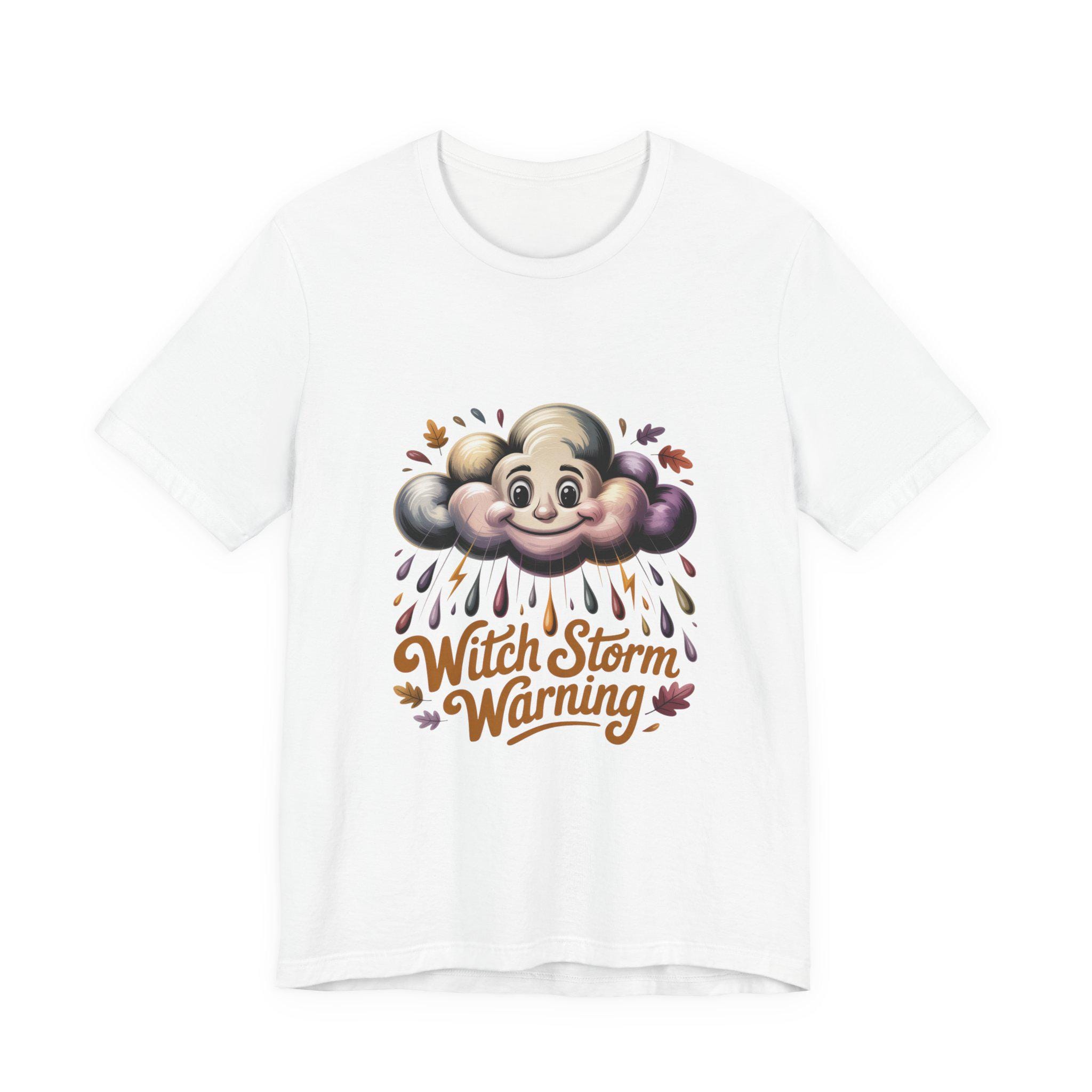 Soft, breathable tee meets cozy autumn charm. This lightweight Jersey tee carries a cheeky, vintage-inspired cloud illustration above hand-lettered text reading “Witch Storm Warning,” surrounded by tiny falling leaves and raindrops. The muted autumn palette and rounded, friendly face on the cloud give it a playful, slightly spooky vibe that sits comfortably between seasonal flair and everyday wear. Wear it to signal your love of crisp walks, pumpkin spice rituals, and cozy nights in. The retail fit layers easily under jackets or stands alone with jeans. It’s a subtle way to bring Halloween energy into casual moments without going full costume.