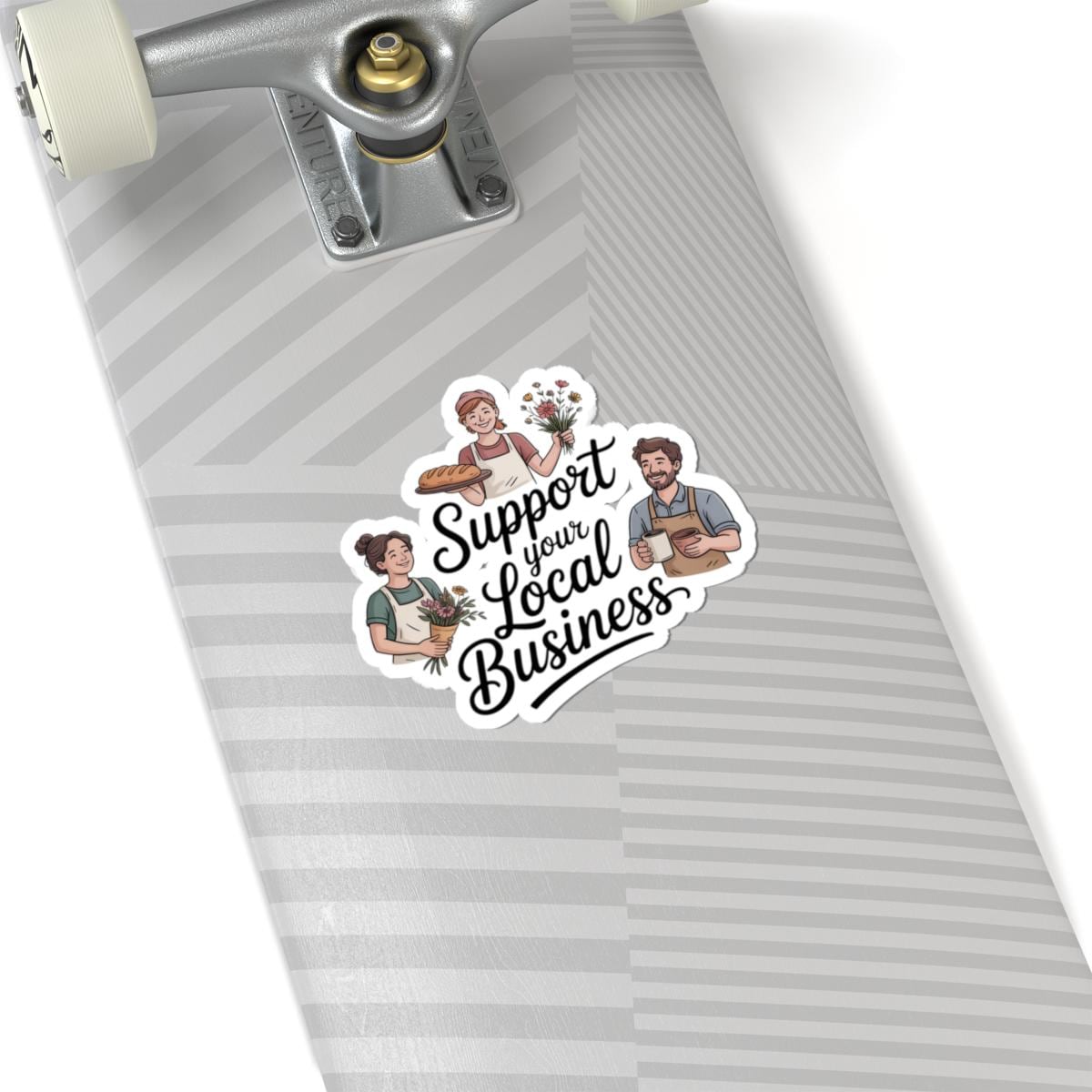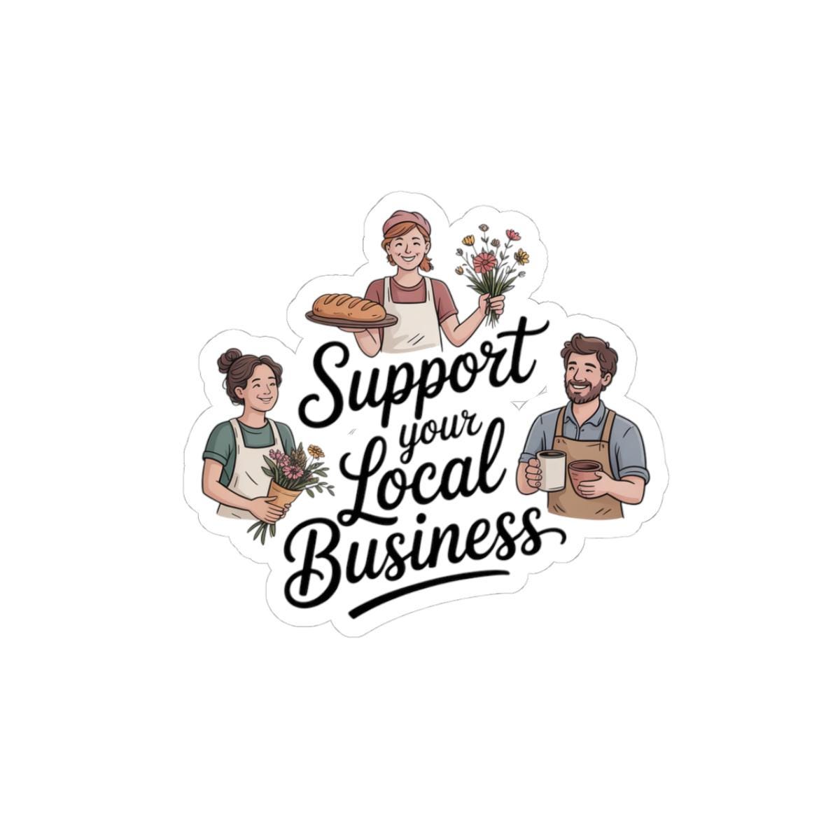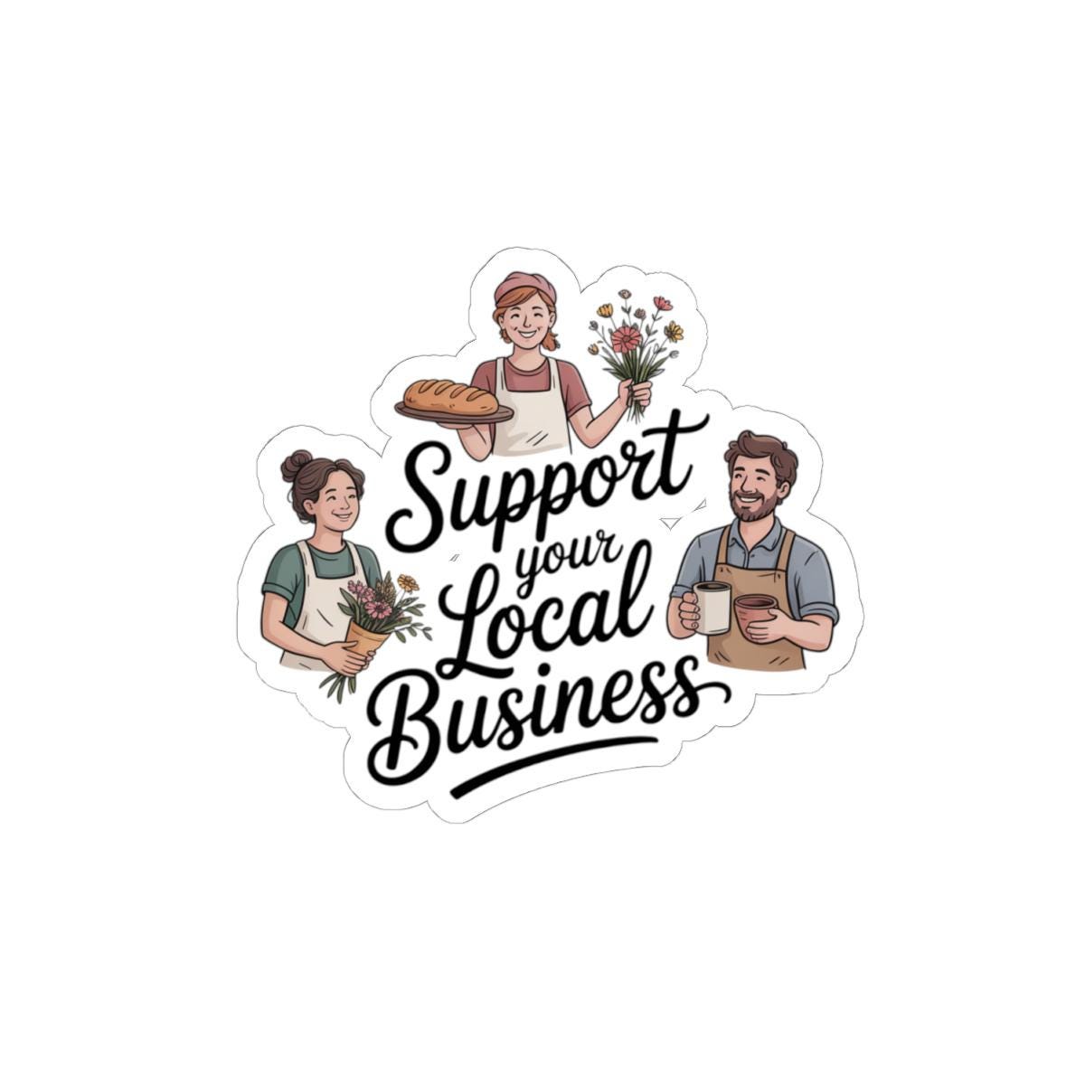 A glossy kiss-cut vinyl sticker that celebrates small businesses and the people who run them. Soft, hand-drawn illustrations of a baker, florist, and barista surround a warm, cursive “Support your Local Business” message — a quiet reminder to choose community and craft. The glossy finish makes the colors pop on laptops, journals, and windows while the durable vinyl and strong adhesive keep it looking fresh through daily use. Comes in multiple sizes and background options so you can place it exactly where it belongs: on your gear, storefront glass, or gifting envelope to show local love.