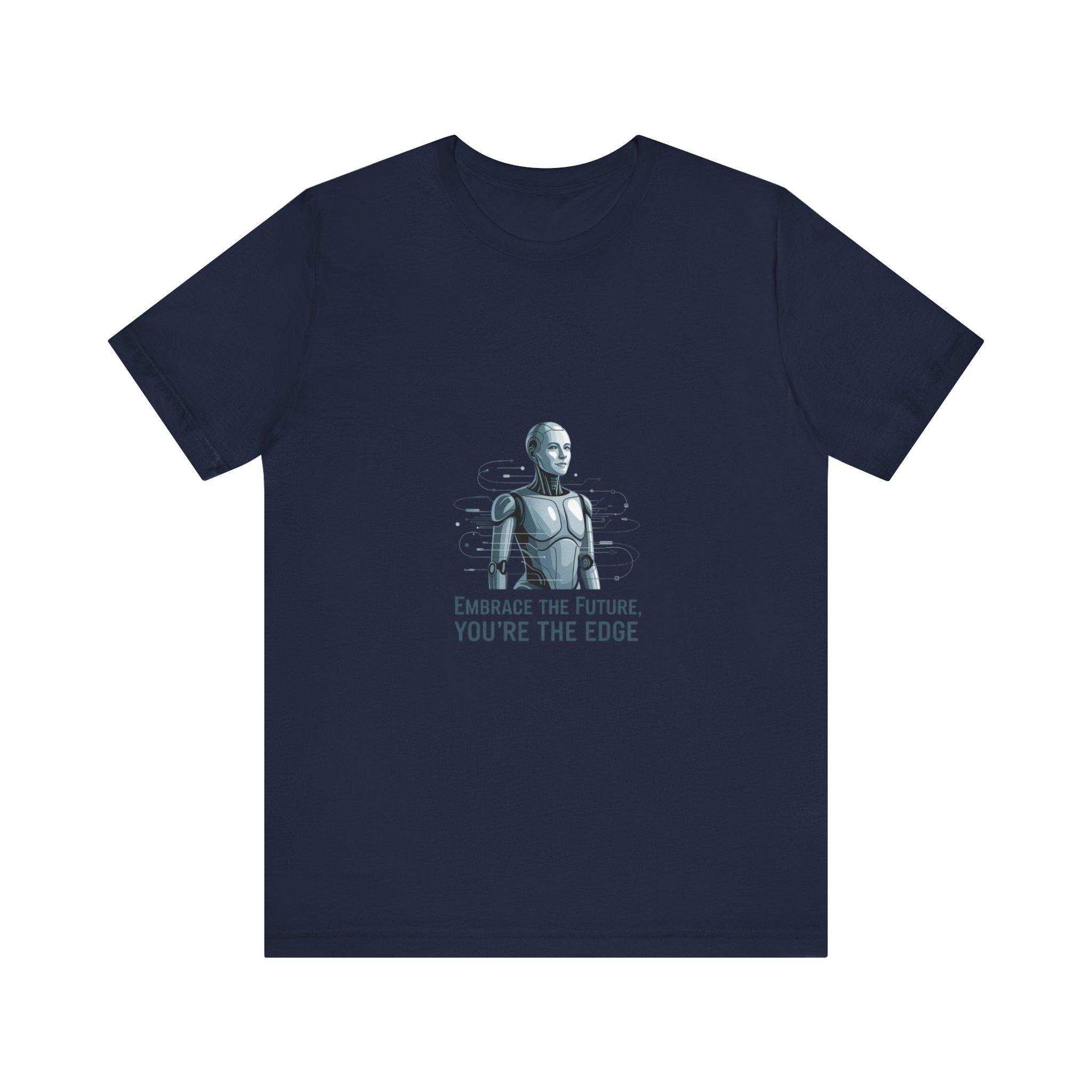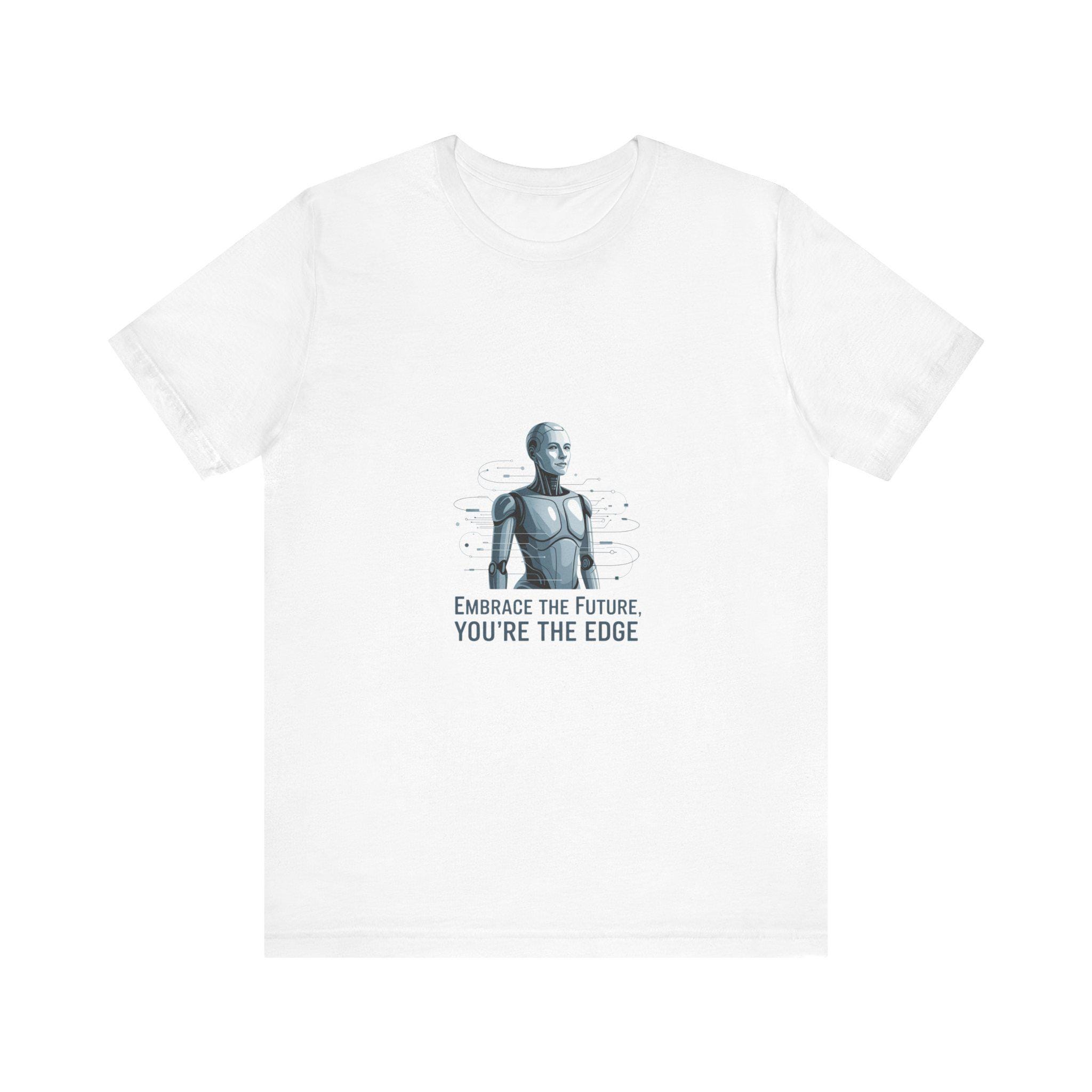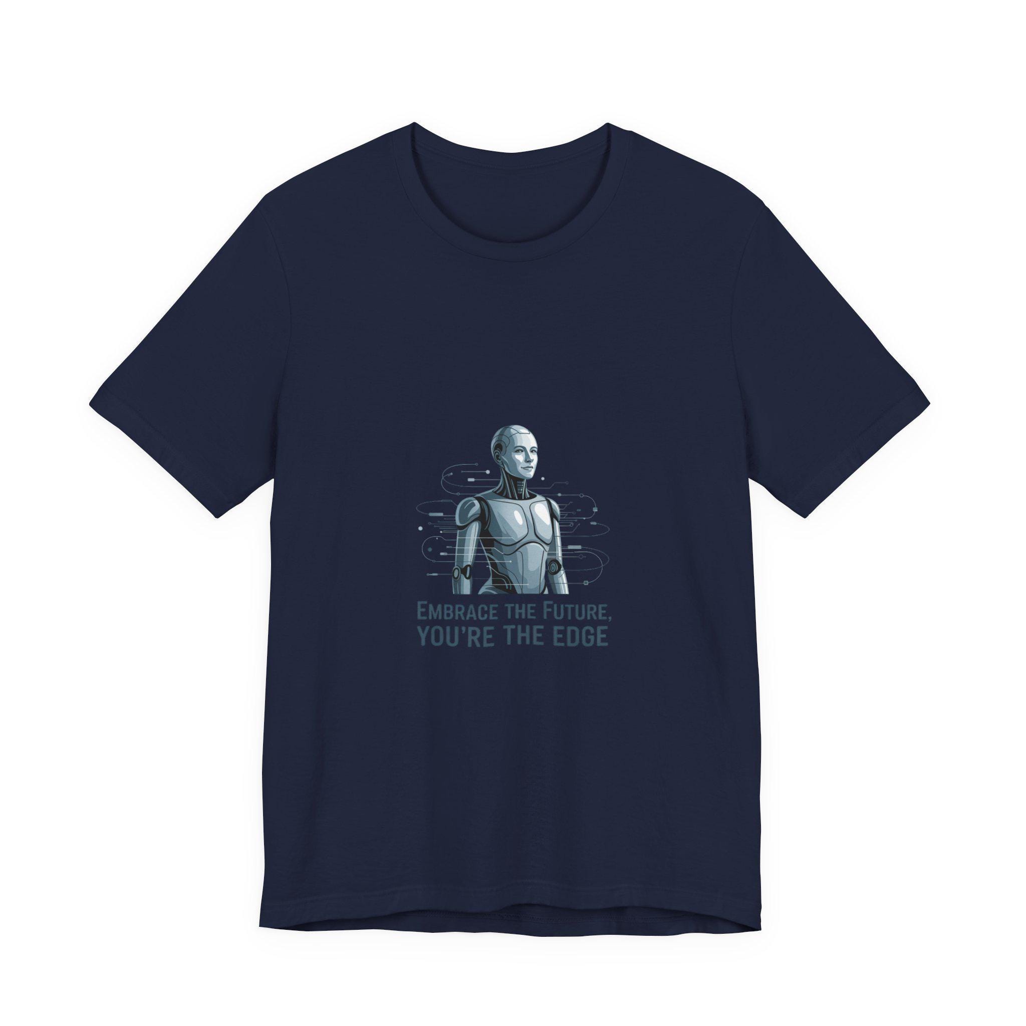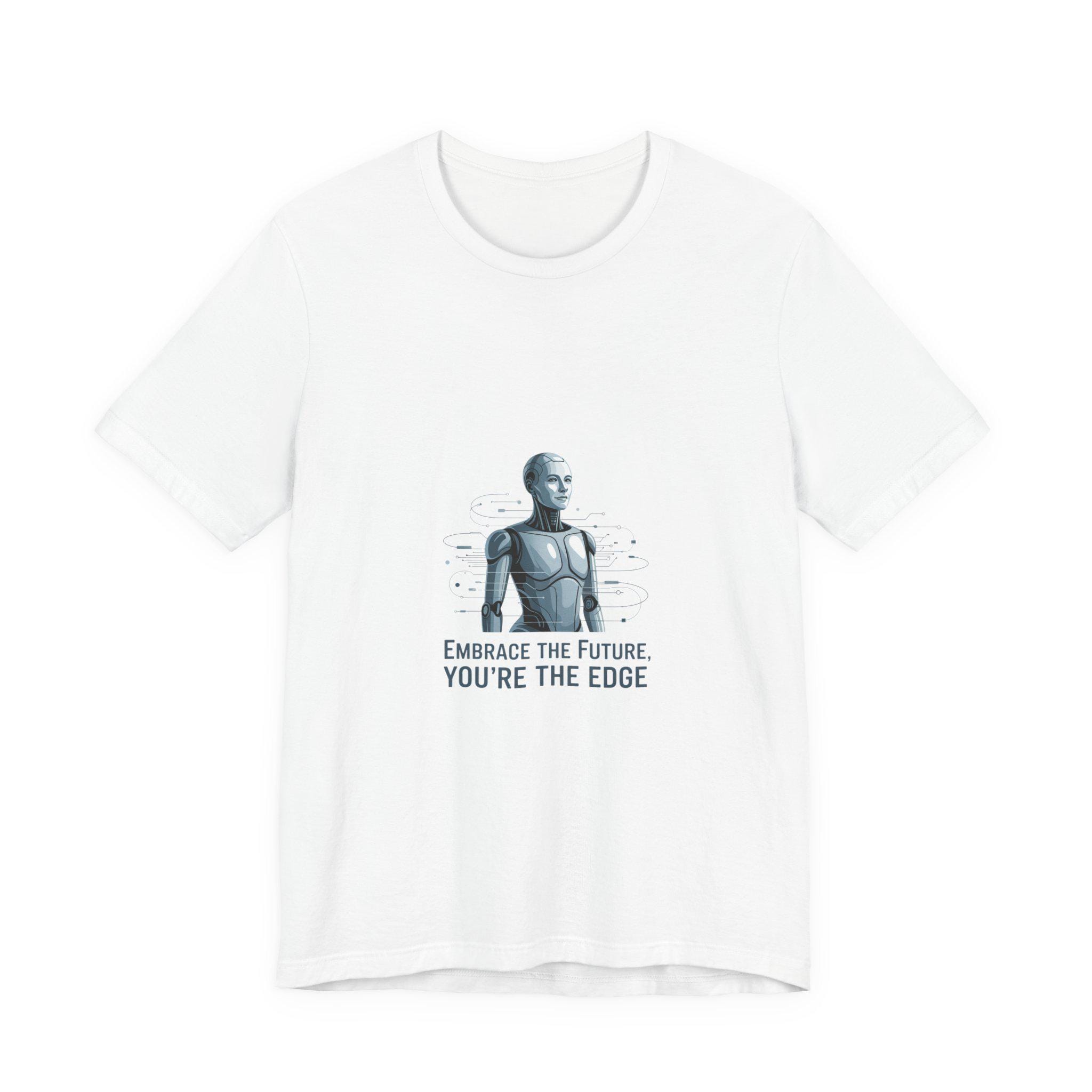 A clean, lightweight crew tee that speaks to forward-thinkers. A minimalist robotic figure stands at the center, framed by subtle tech-inspired dots and the words “Embrace the Future — You're the Edge.” The soft, breathable cotton keeps the silhouette crisp while the ribbed collar and shoulder tape hold its shape through everyday wear. Wear it to signal curiosity — whether you’re coding late, sketching concepts, or meeting friends at a weekend maker market. It layers easily under jackets and pairs with jeans or joggers for a look that’s simple but intentionally modern.