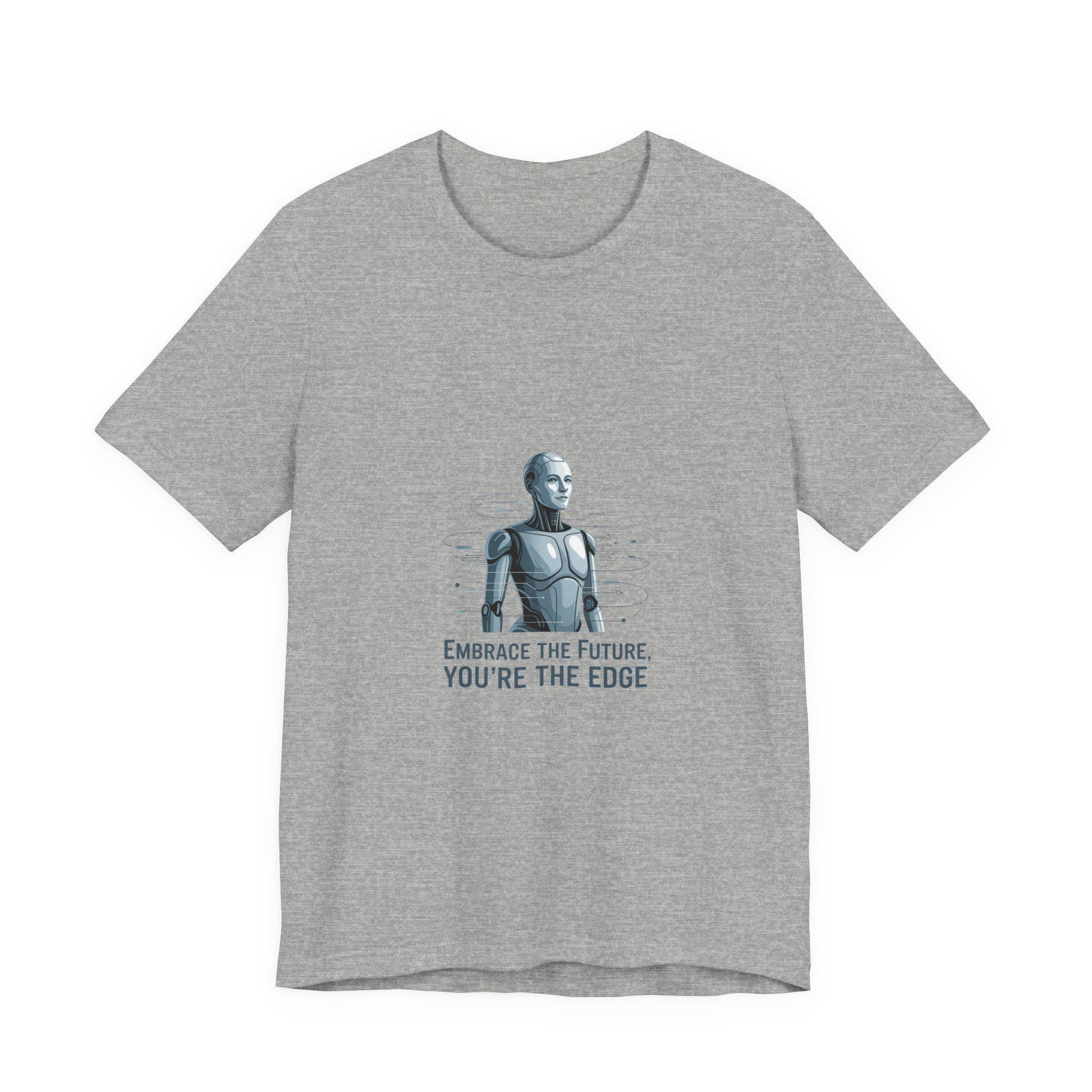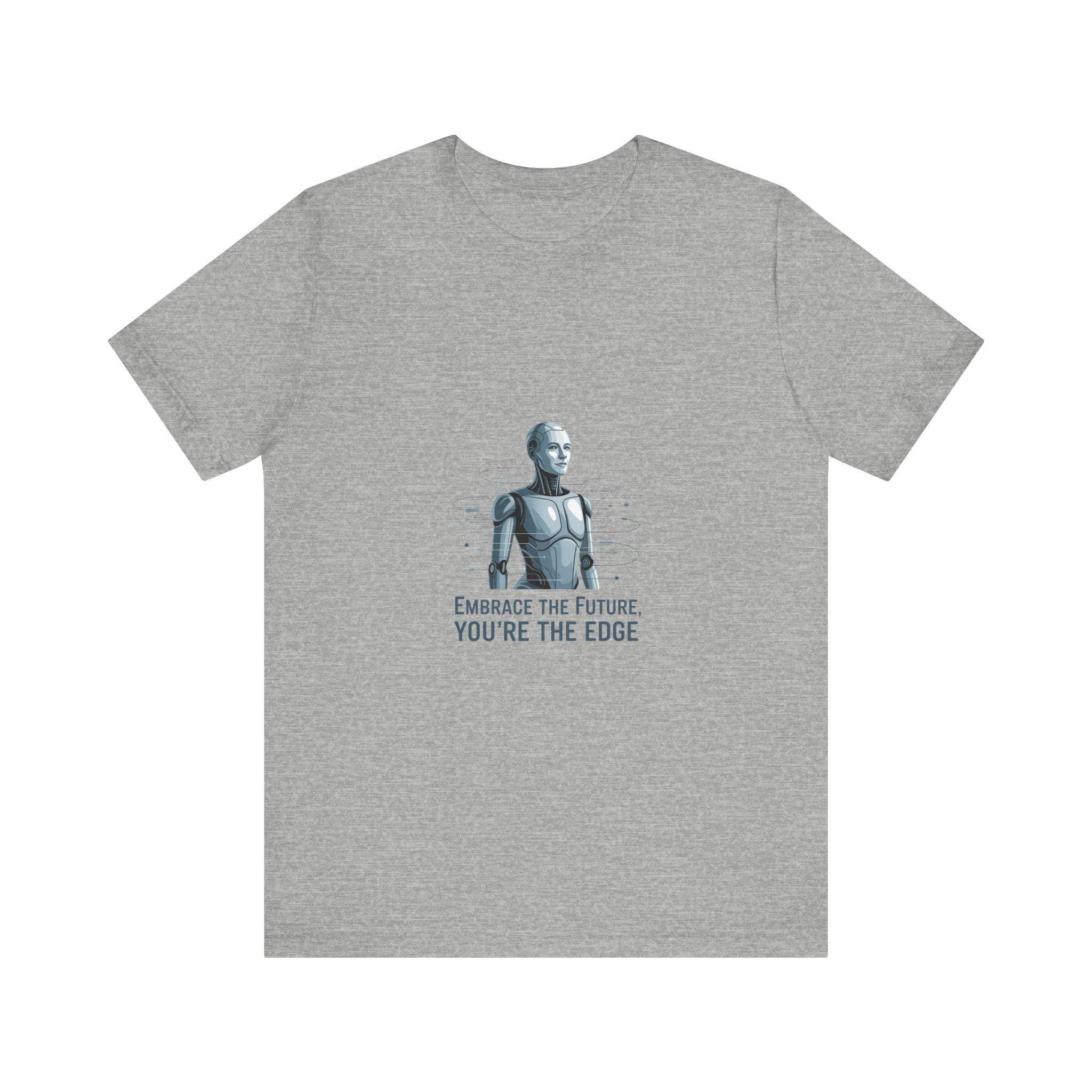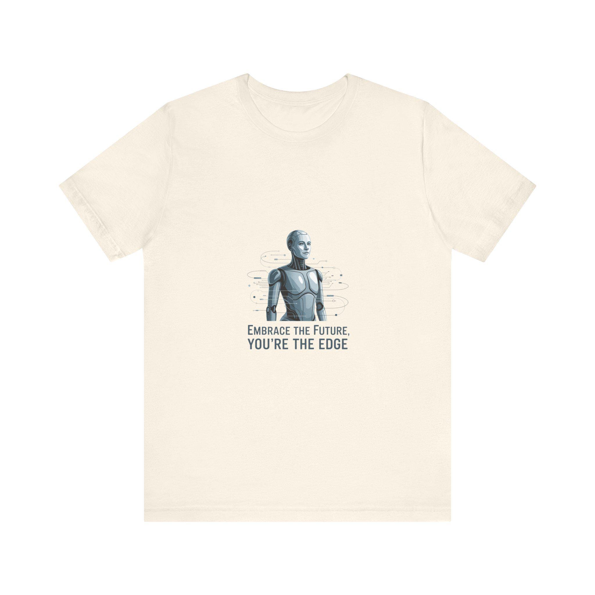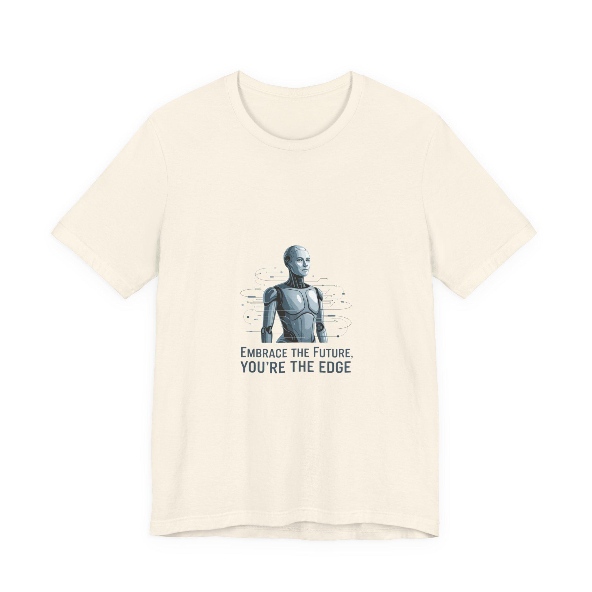 A clean, lightweight crew tee that speaks to forward-thinkers. A minimalist robotic figure stands at the center, framed by subtle tech-inspired dots and the words “Embrace the Future — You're the Edge.” The soft, breathable cotton keeps the silhouette crisp while the ribbed collar and shoulder tape hold its shape through everyday wear. Wear it to signal curiosity — whether you’re coding late, sketching concepts, or meeting friends at a weekend maker market. It layers easily under jackets and pairs with jeans or joggers for a look that’s simple but intentionally modern.