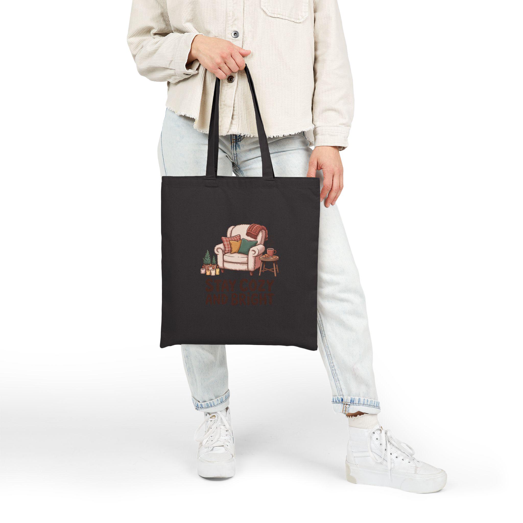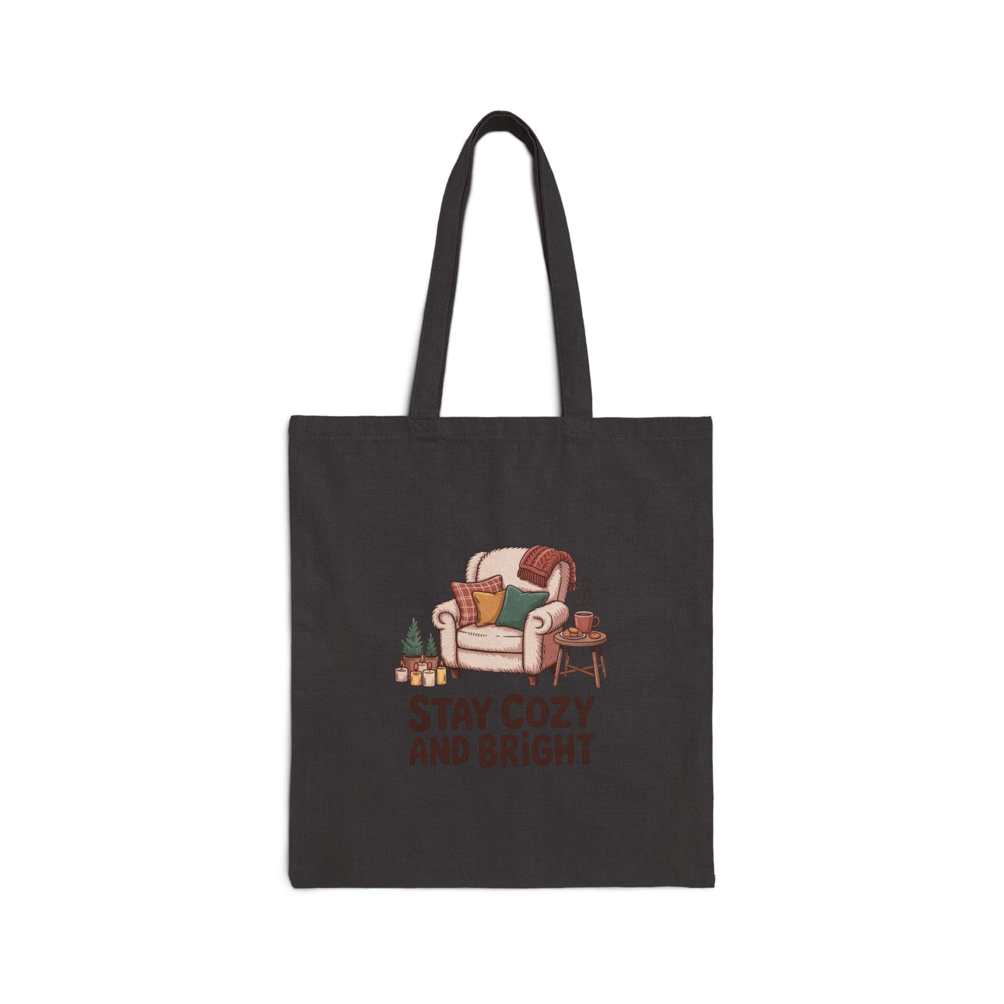A sturdy cotton canvas tote that invites quiet mornings and slow evenings. The natural fabric carries a warm illustration of a cushy armchair, stacked books, a steaming mug, and a soft throw—captioned “Stay Cozy and Bright.” It feels like a pocket of home you can sling over your shoulder: roomy enough for a book, a market haul, or a knitting project, with reinforced handles that hold up to daily use. The heavy 12 oz canvas and flat-corner construction keep its shape, while the sewn-in label and choice of natural or black add a handcrafted touch. Bring a subtle, comforting accent to everyday errands or casual outings.