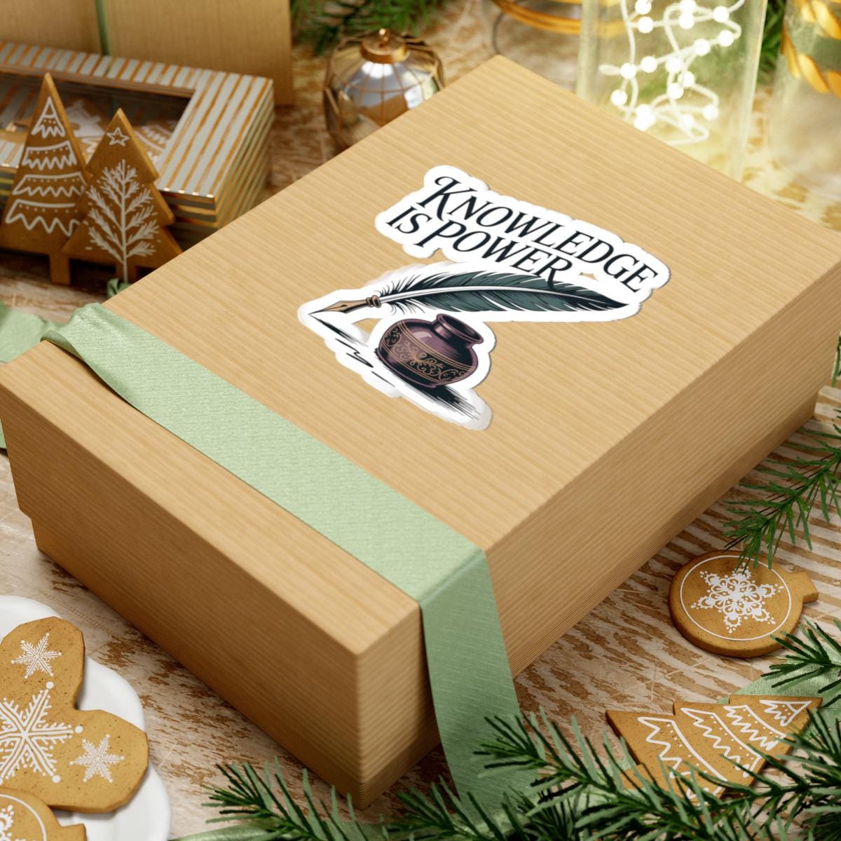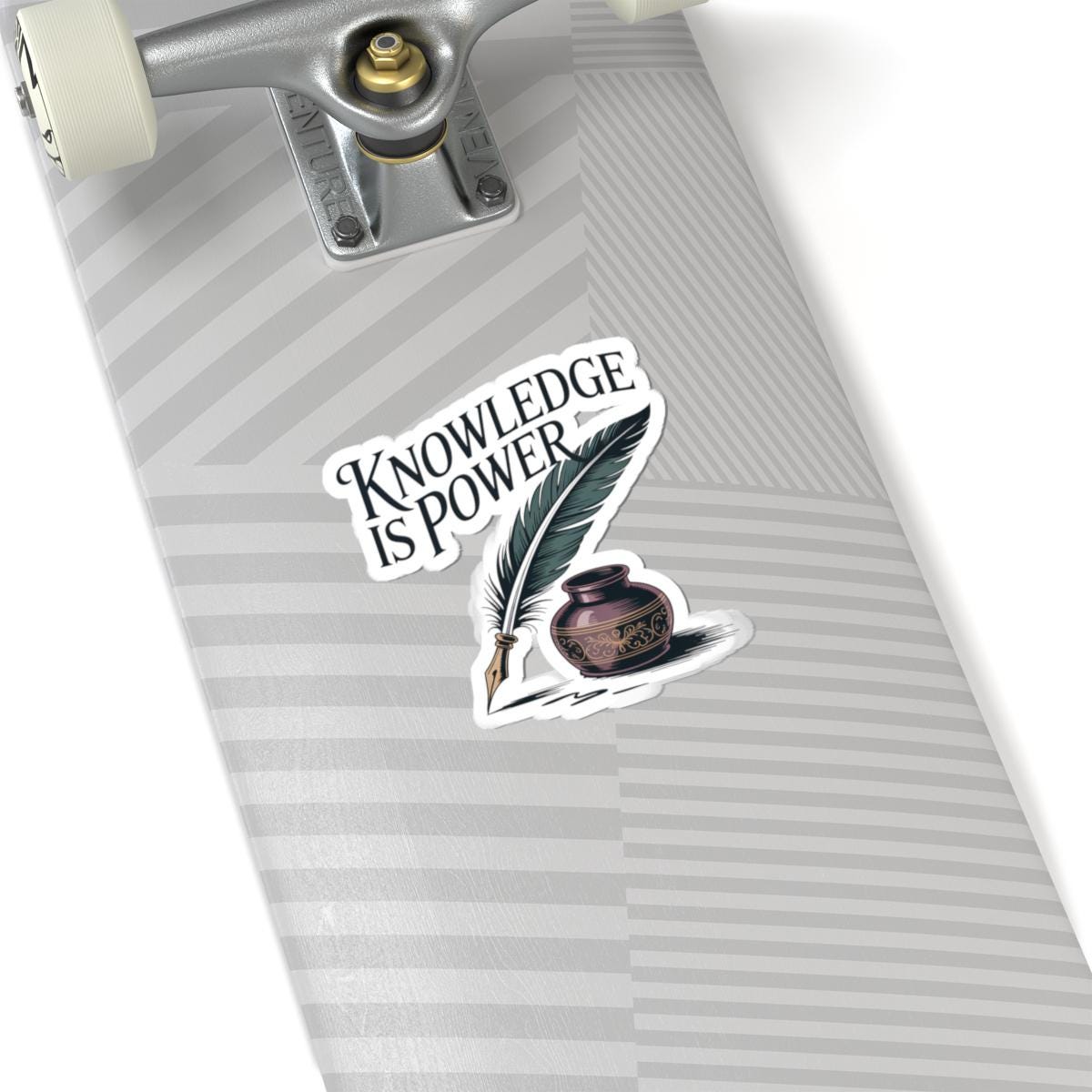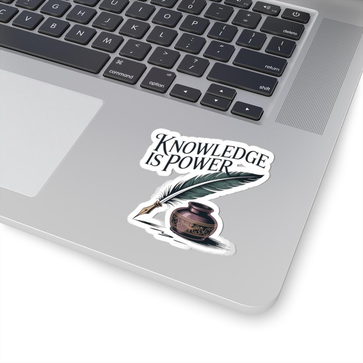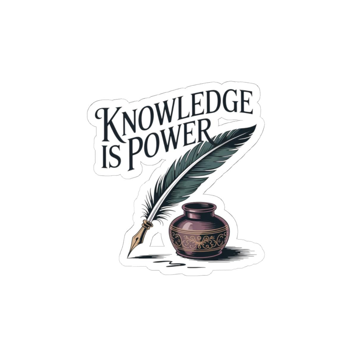 A glossy kiss-cut vinyl sticker that celebrates the quiet strength of learning. The design features a vintage quill and inkwell with hand-lettered type that reads “Knowledge is Power,” printed in vivid eco-solvent inks for deep, lasting color. It adheres smoothly to laptops, journals, water bottles (indoor use), and other flat surfaces, applying bubble-free and staying put with a strong permanent acrylic adhesive. Choose white or transparent backing and four size options to match your look. This sticker brings a touch of scholarly charm to study carts, notebooks, classroom supplies, and workspace corners — a small reminder to keep curiosity close at hand.