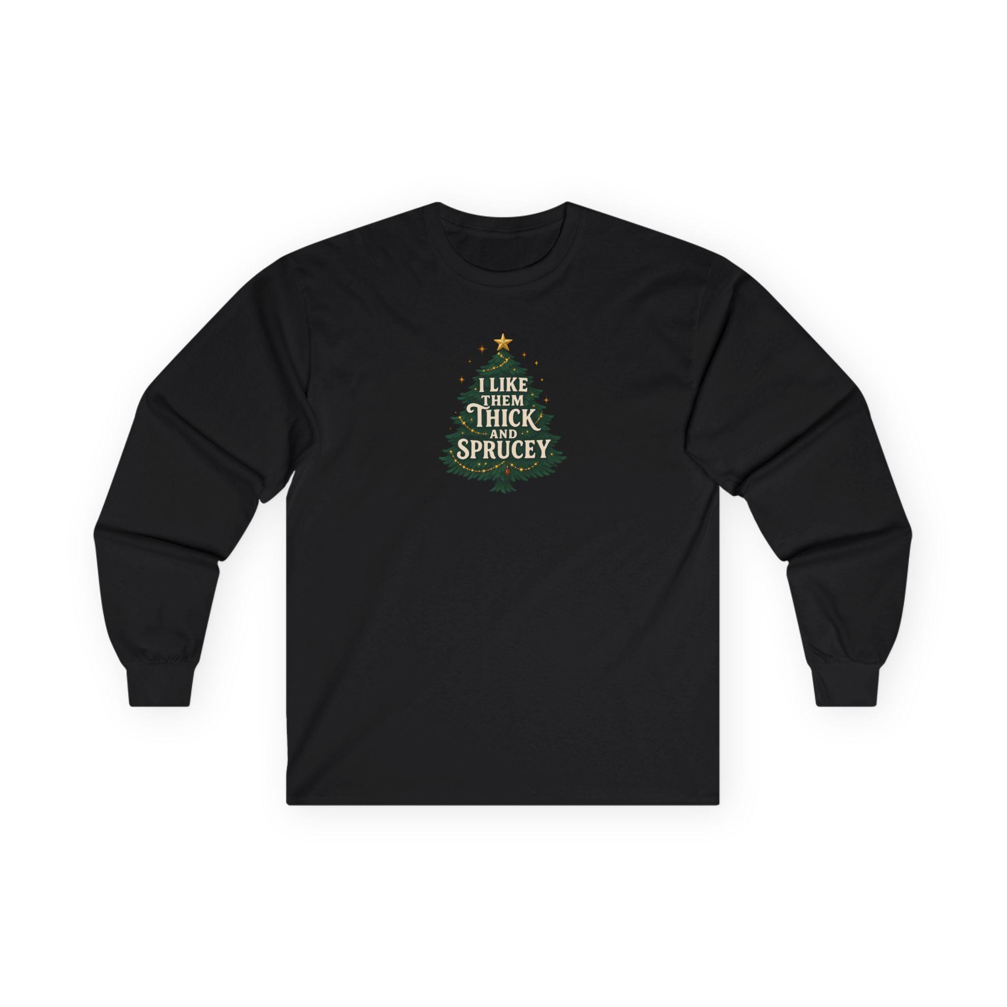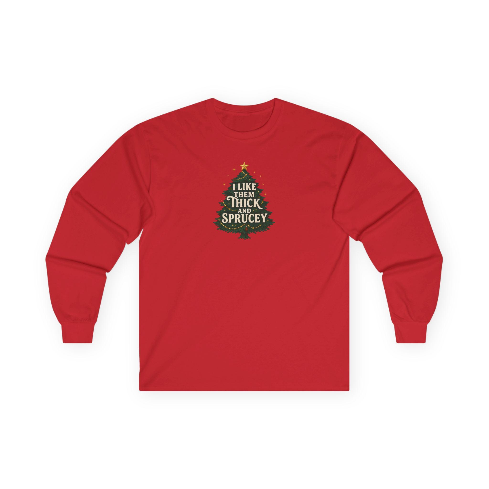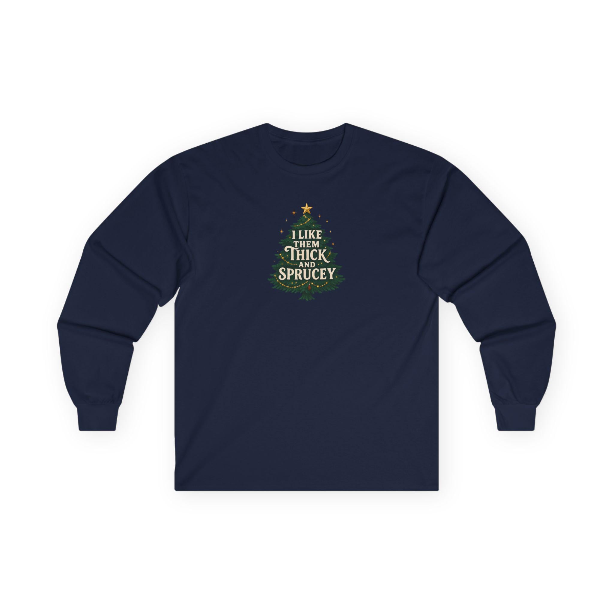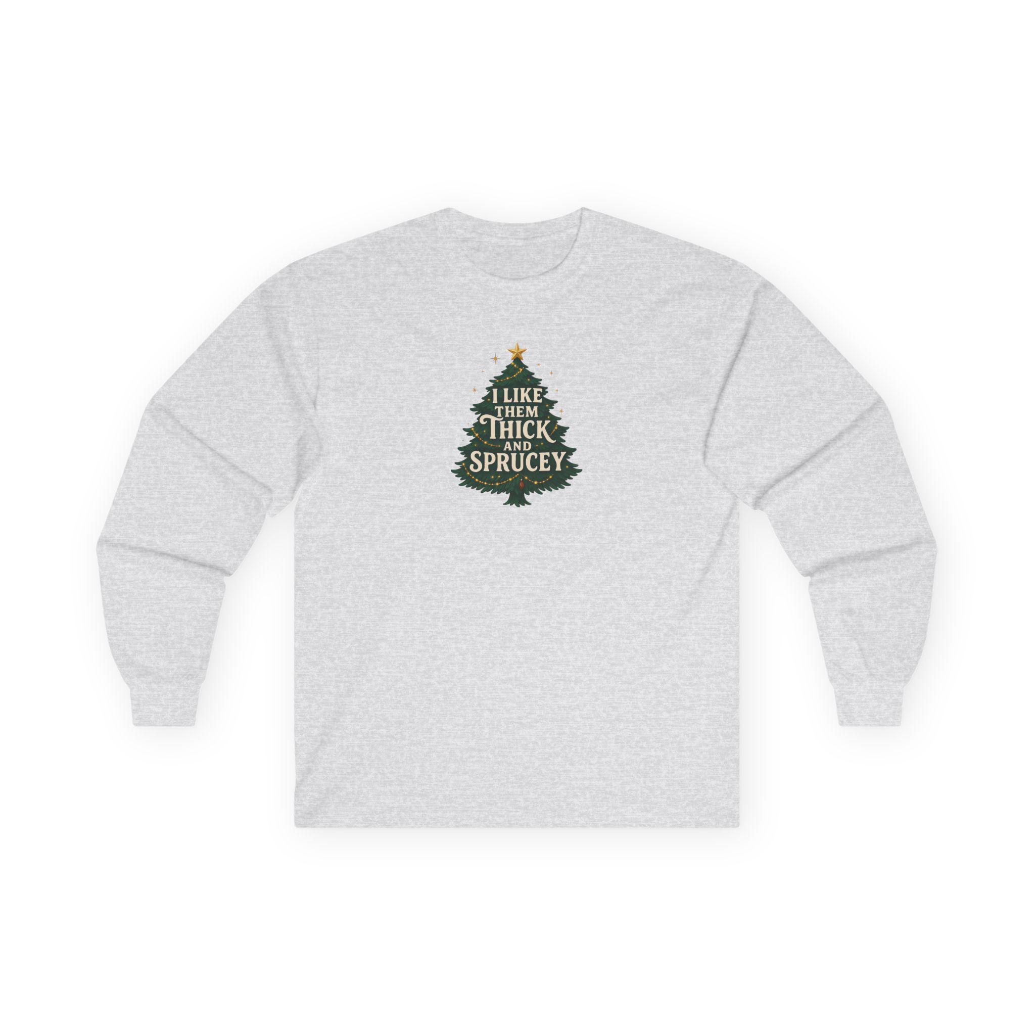 Christmas Funny Holiday Humor Long Sleeve Tee | Unisex Graphic Festive Winter Apparel, I Like Them Thick and Sprucey Shirt, Christmas Humor