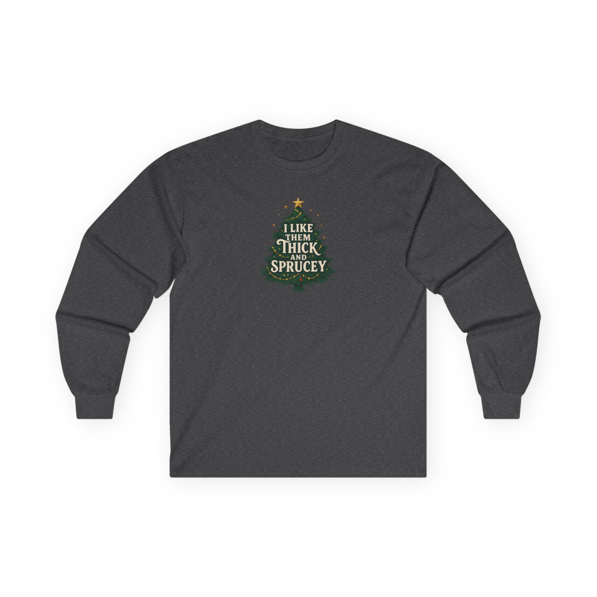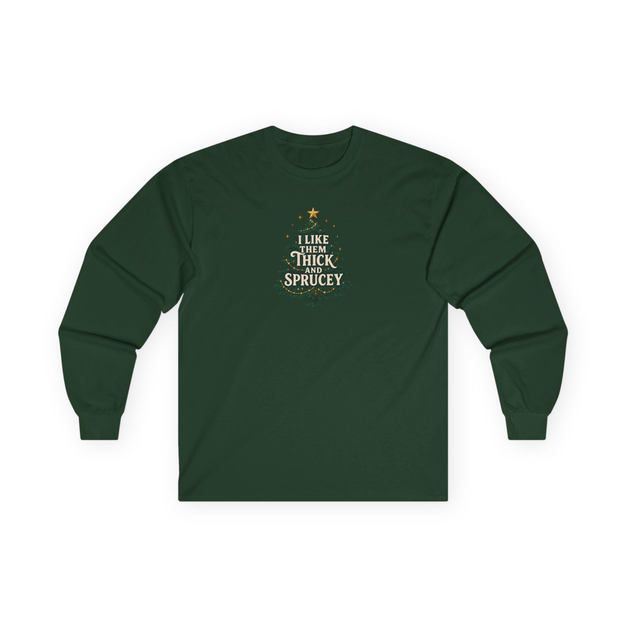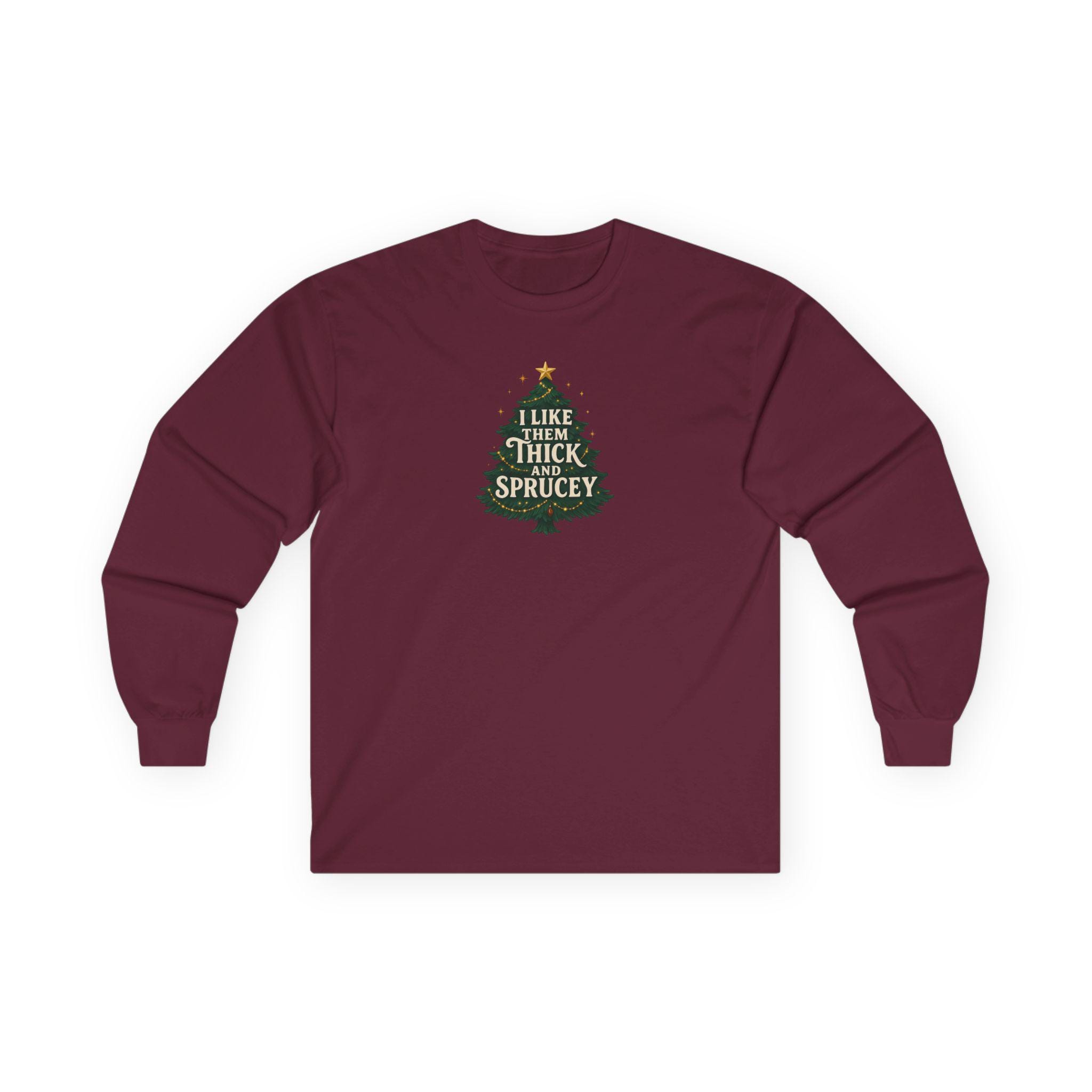Christmas Funny Holiday Humor Long Sleeve Tee | Unisex Graphic Festive Winter Apparel, I Like Them Thick and Sprucey Shirt, Christmas Humor