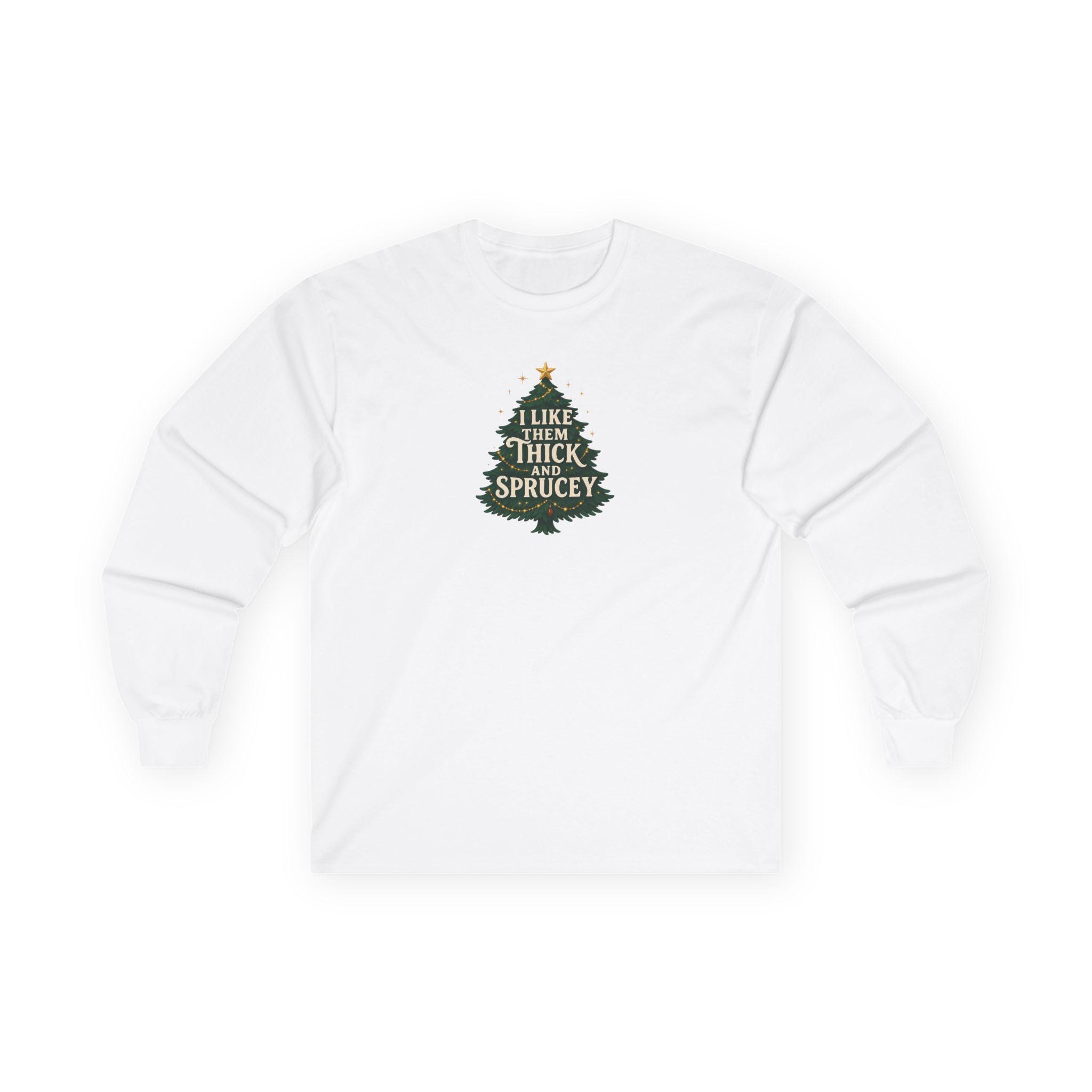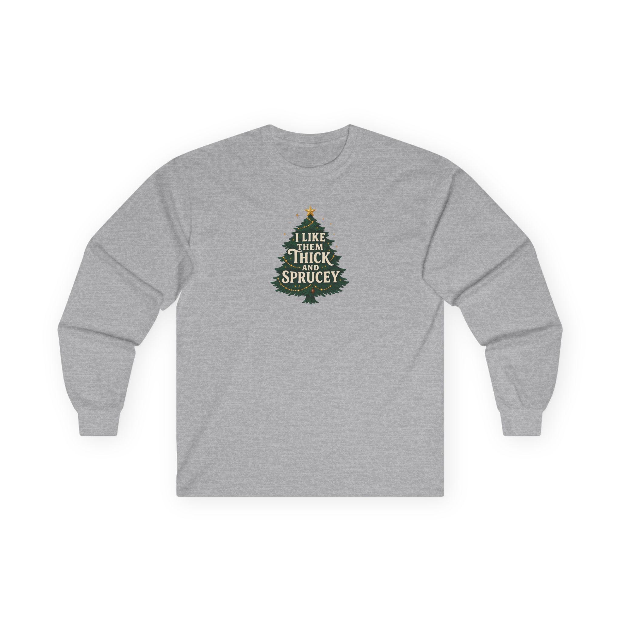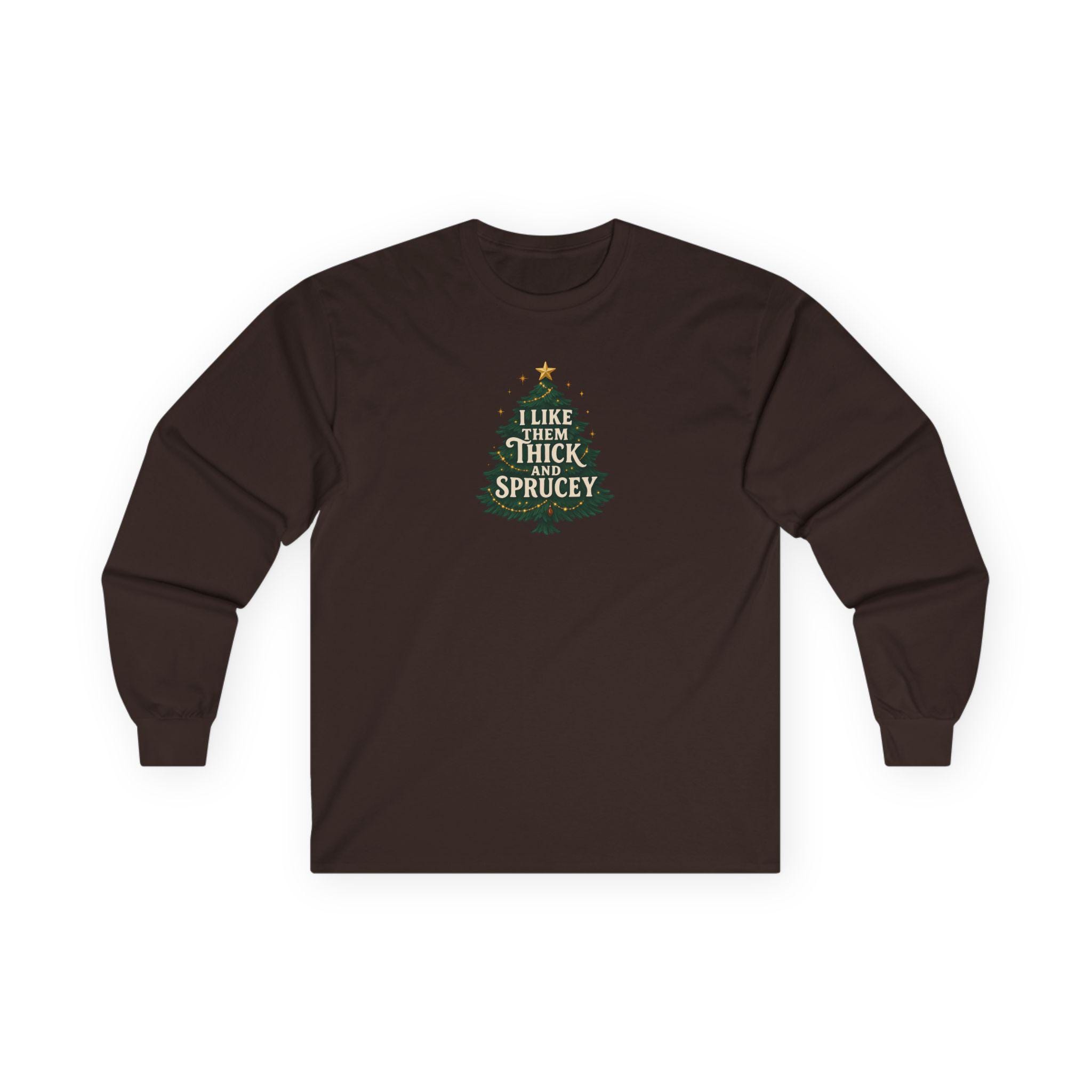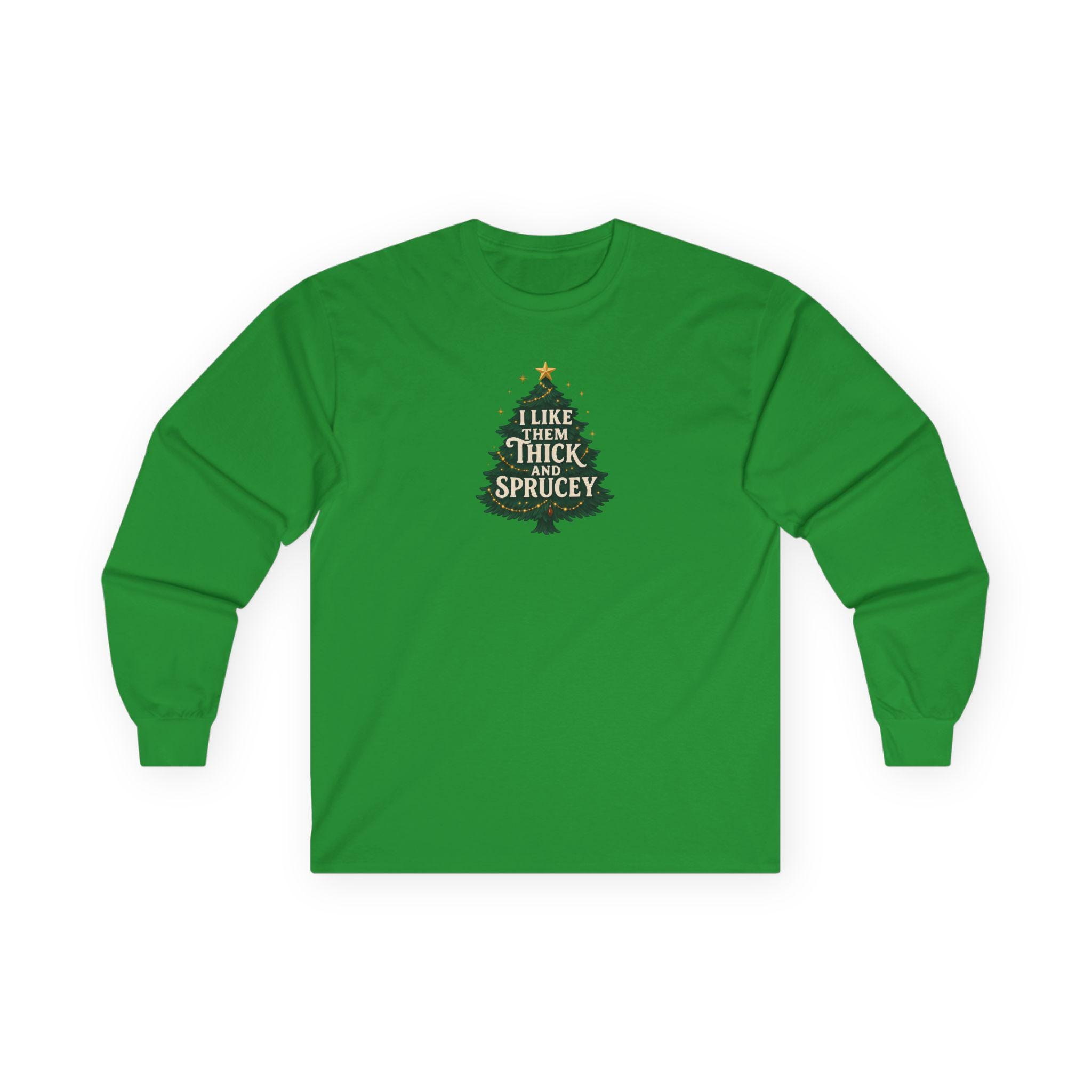 Christmas Funny Holiday Humor Long Sleeve Tee | Unisex Graphic Festive Winter Apparel, I Like Them Thick and Sprucey Shirt, Christmas Humor