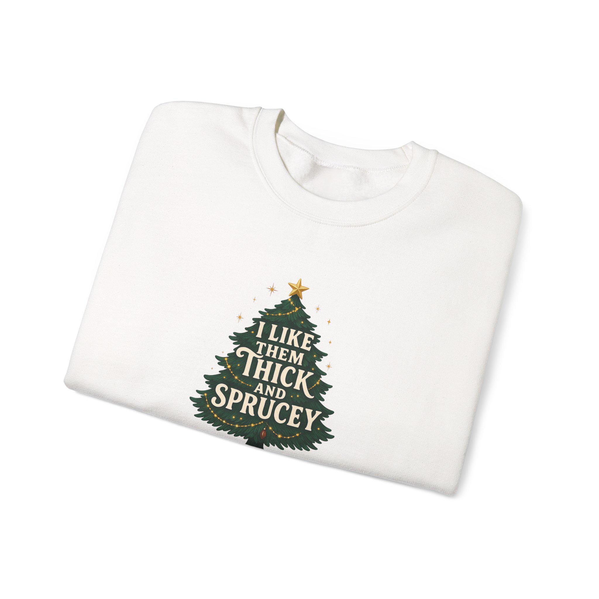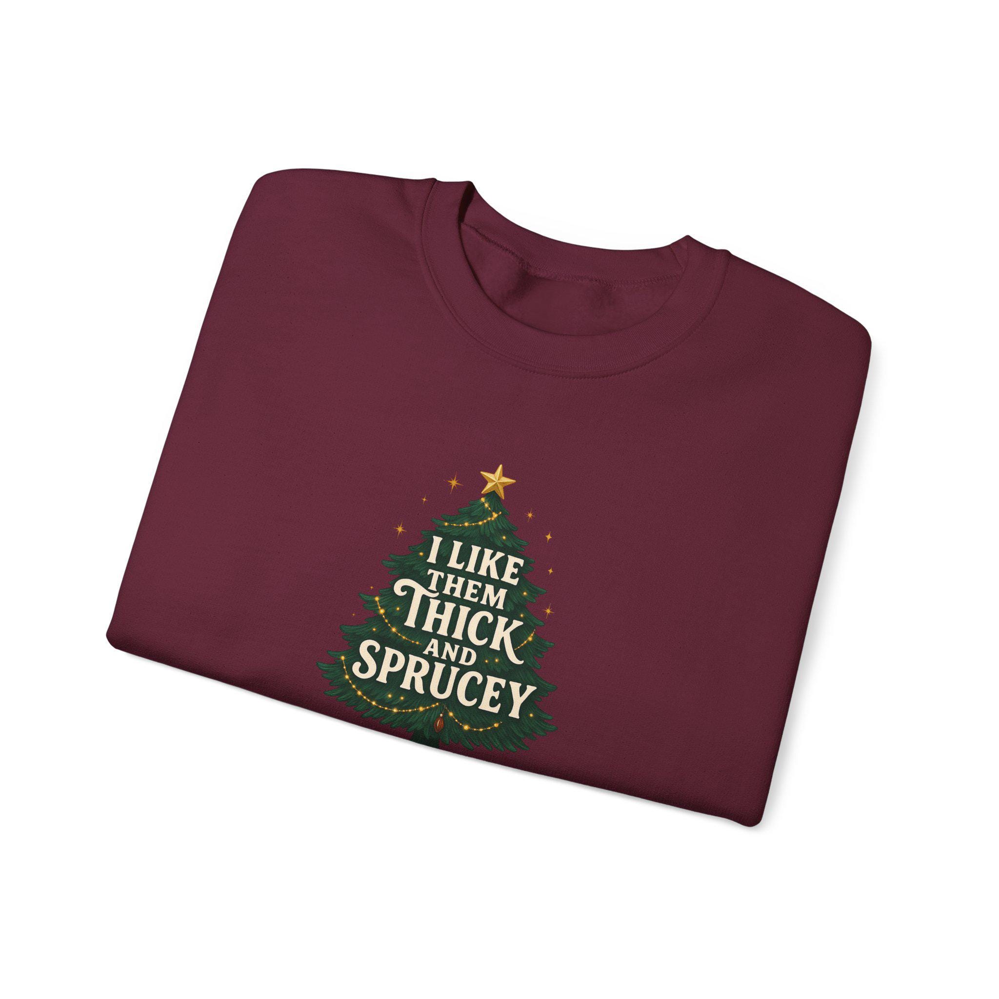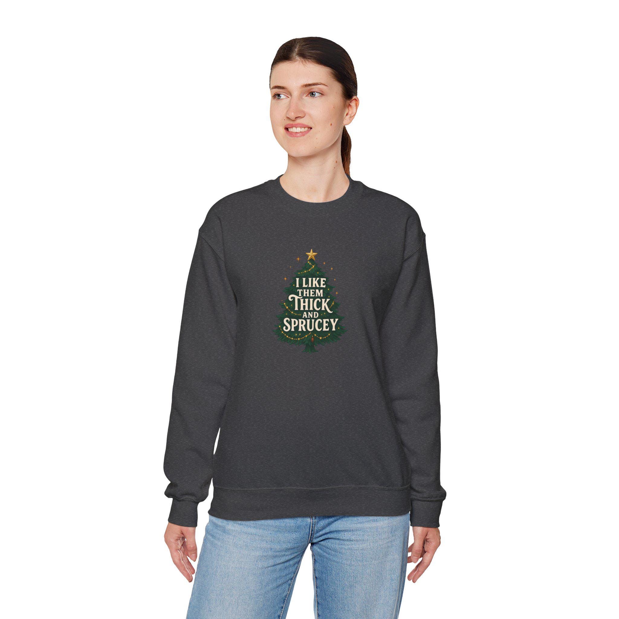 Stay cozy and stylish with this I Like Them Thick and Sprucey Humor Sweatshirt. Perfect for holiday gatherings or just spreading some festive cheer. This unisex sweatshirt is designed for adults with a classic fit and crew neckline for ultimate comfort. The holiday humor print adds a touch of fun to your wardrobe, making it a great gift for friends and family during the holiday season.