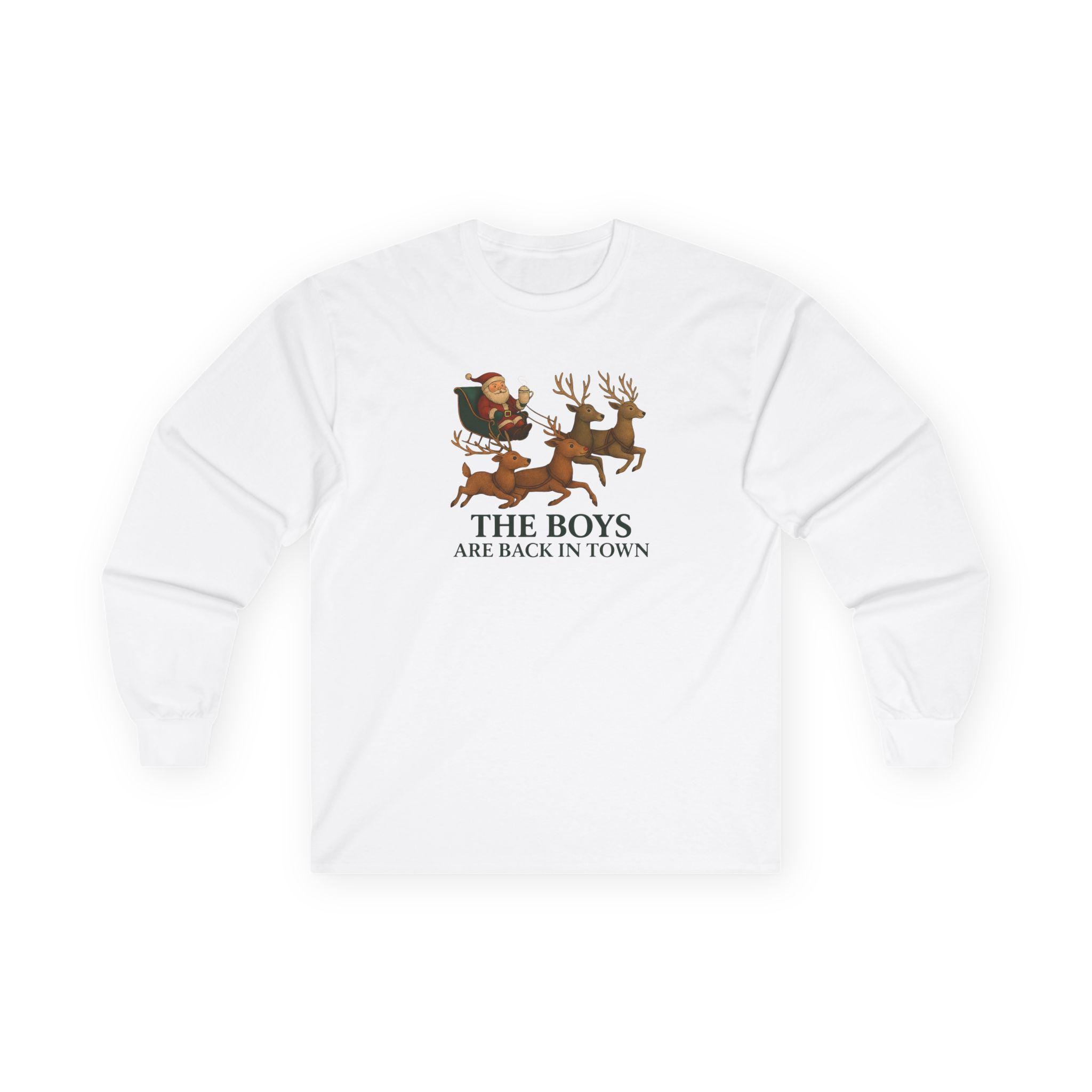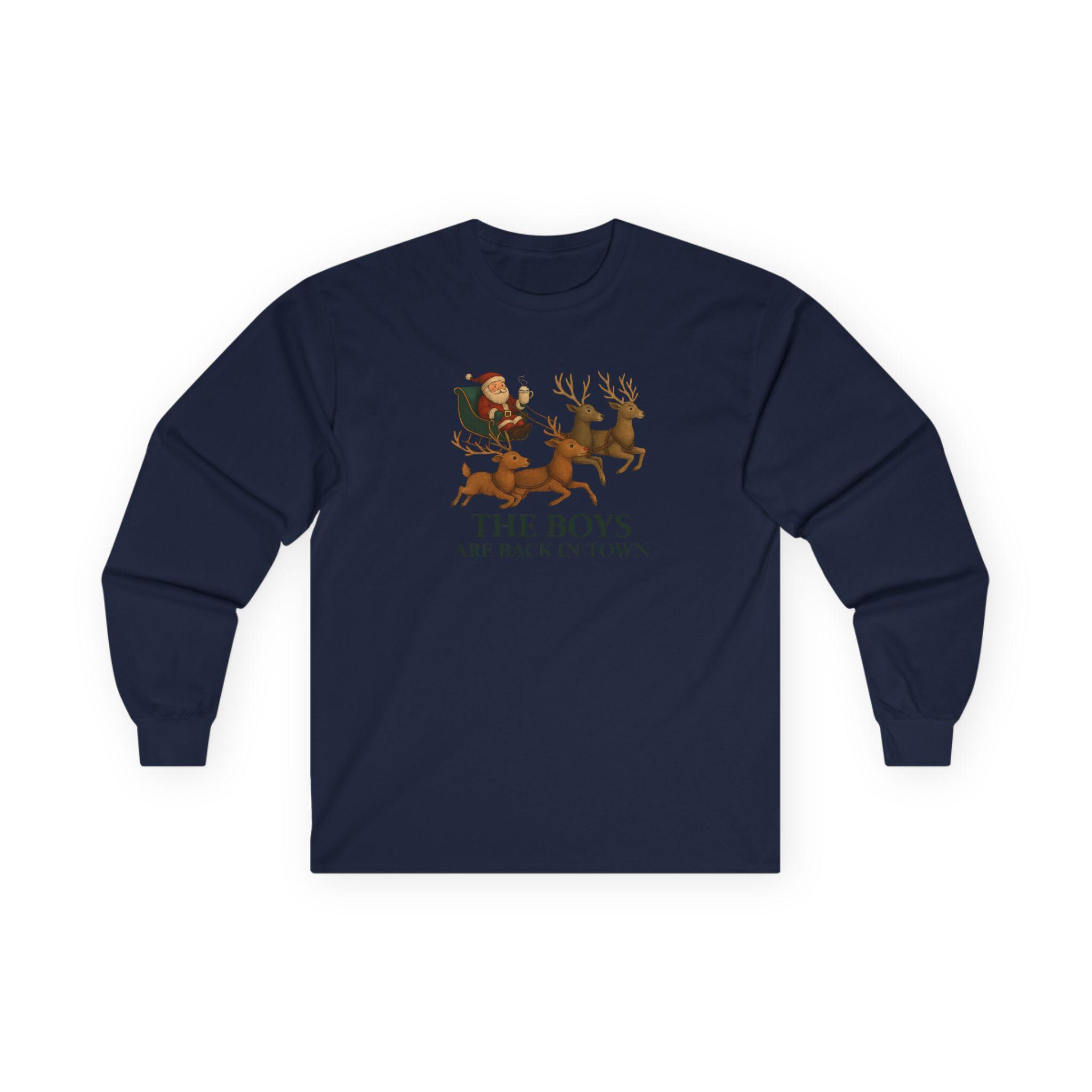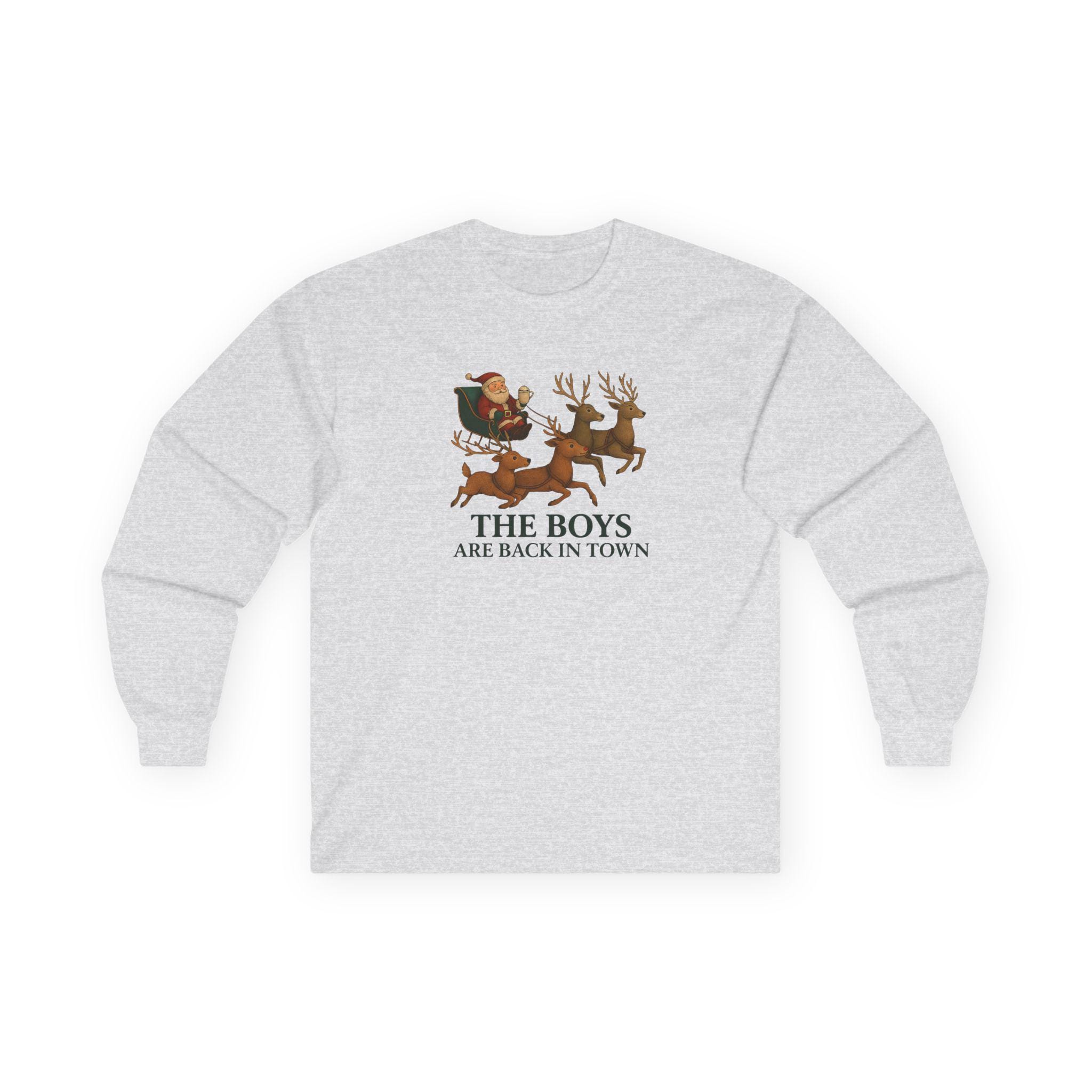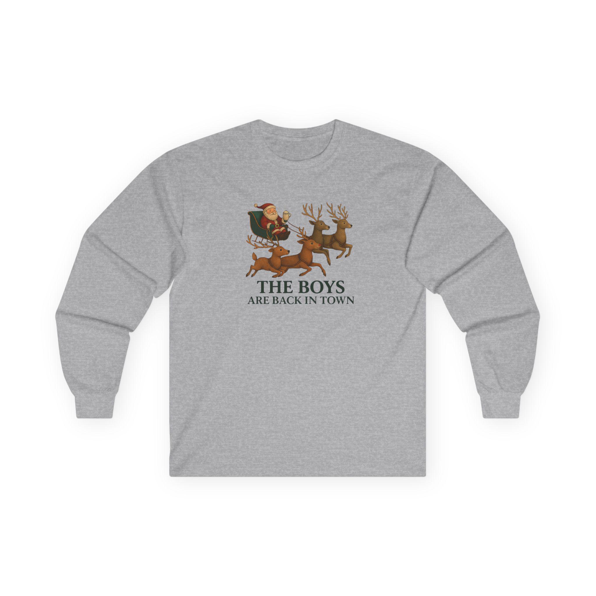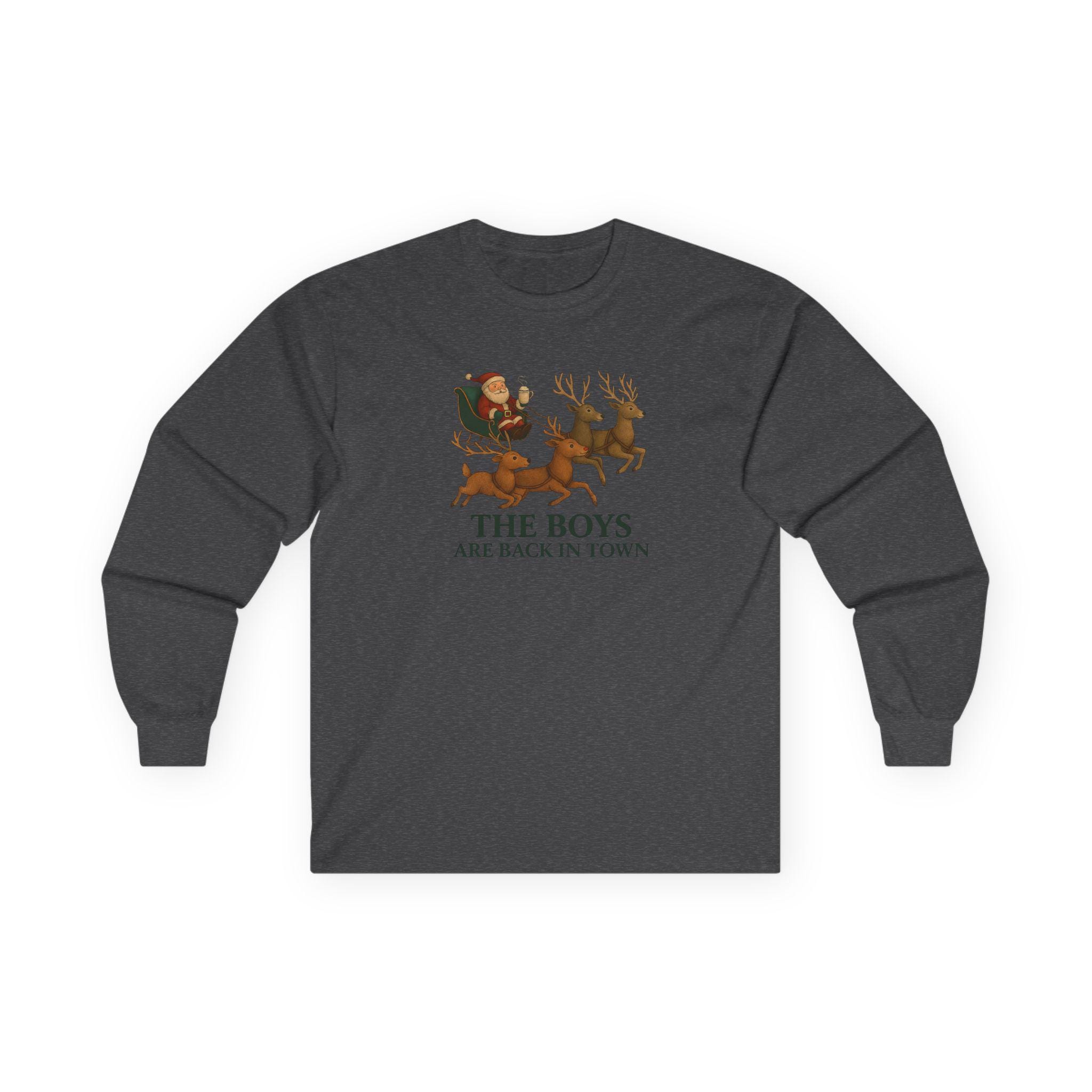 The Boys Are Back In Town Funny Holiday Humor Long Sleeve Tee | Unisex Graphic Festive Winter Apparel, Santa Reindeer Christmas Humor