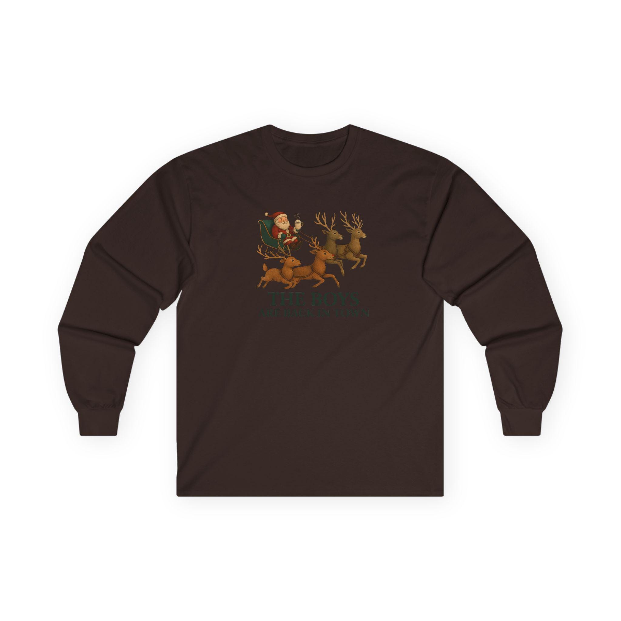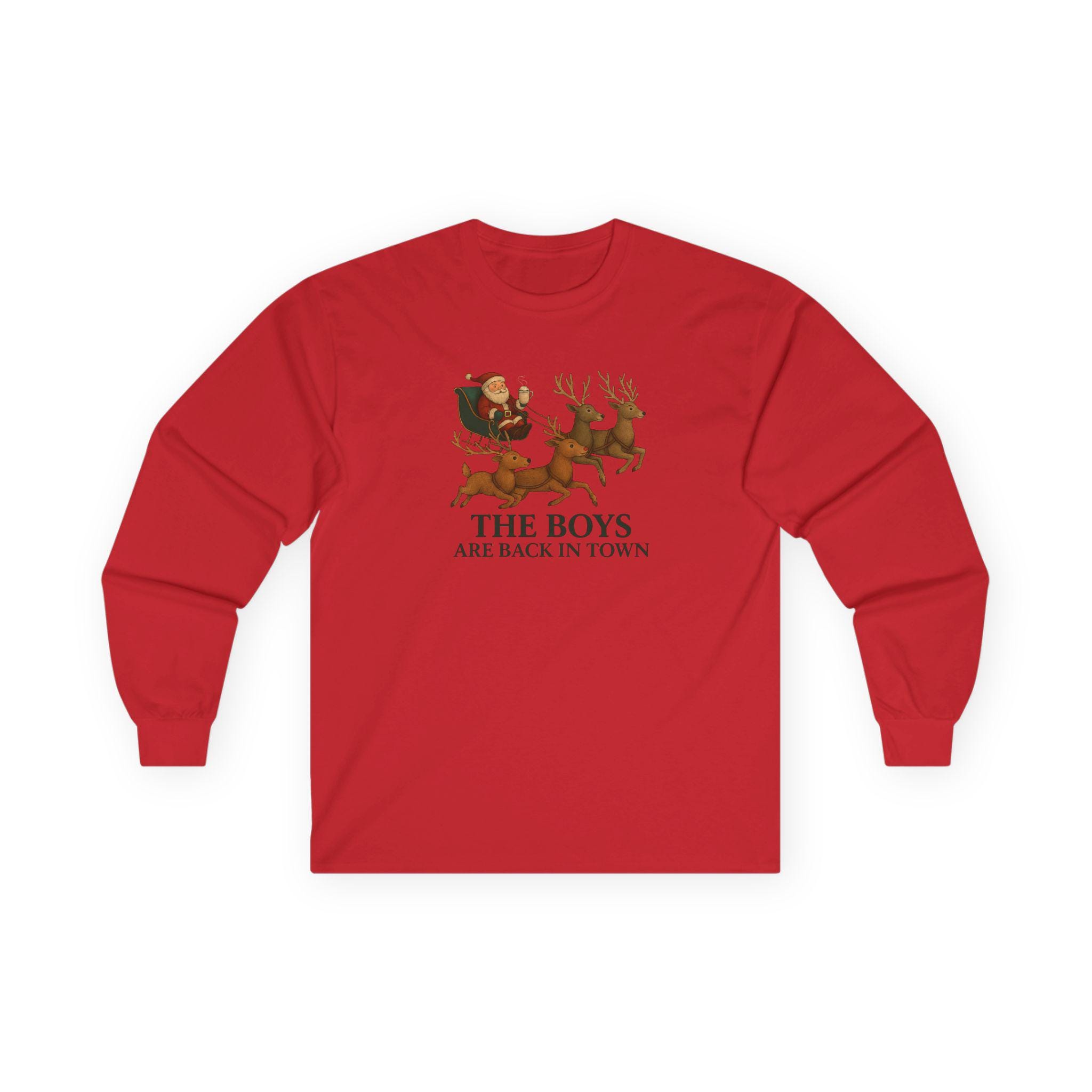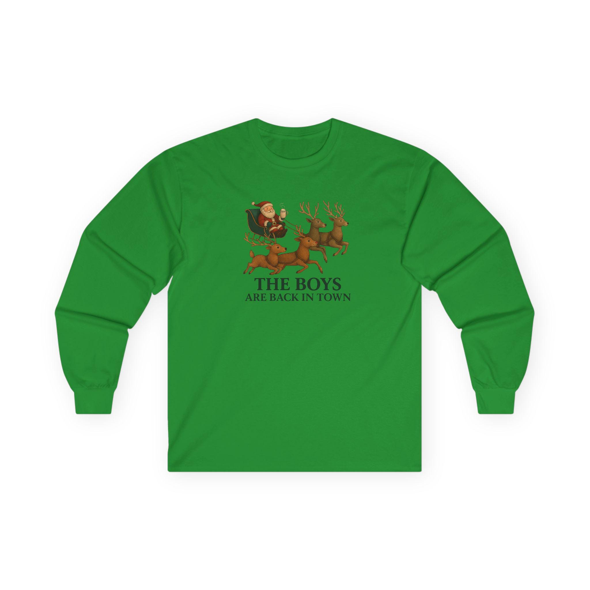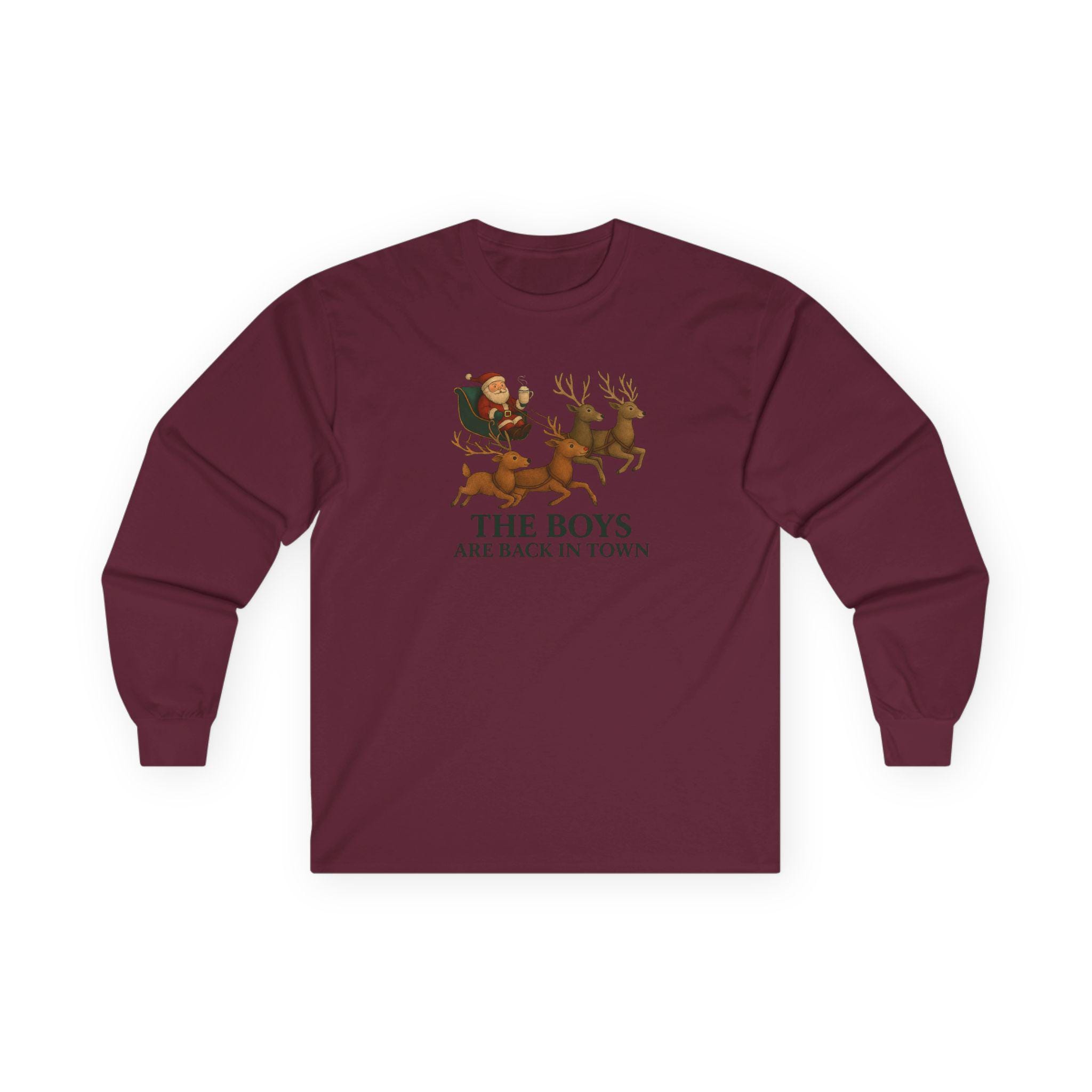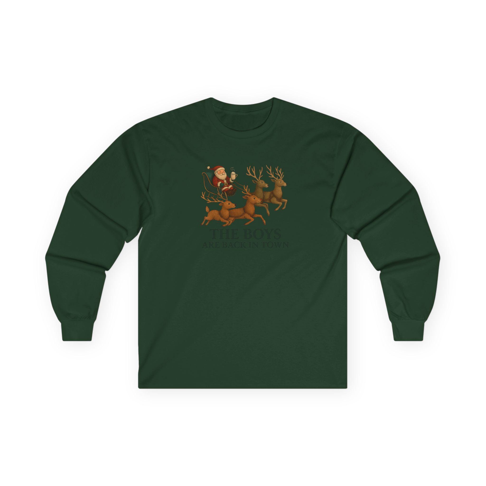 The Boys Are Back In Town Funny Holiday Humor Long Sleeve Tee | Unisex Graphic Festive Winter Apparel, Santa Reindeer Christmas Humor