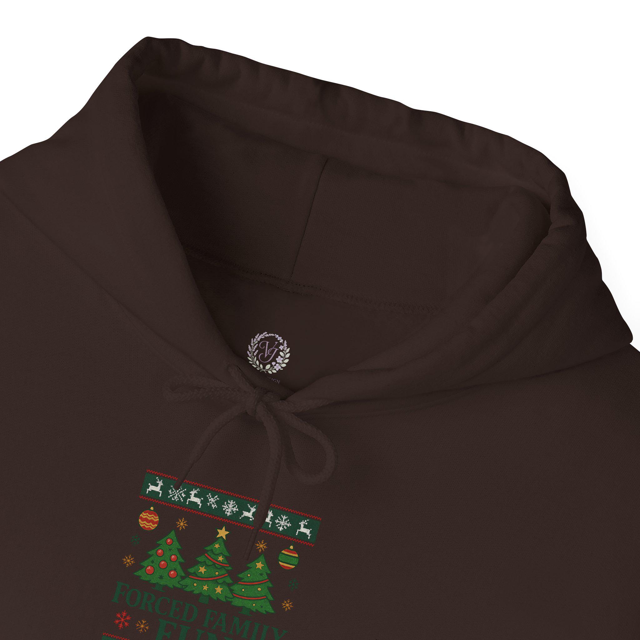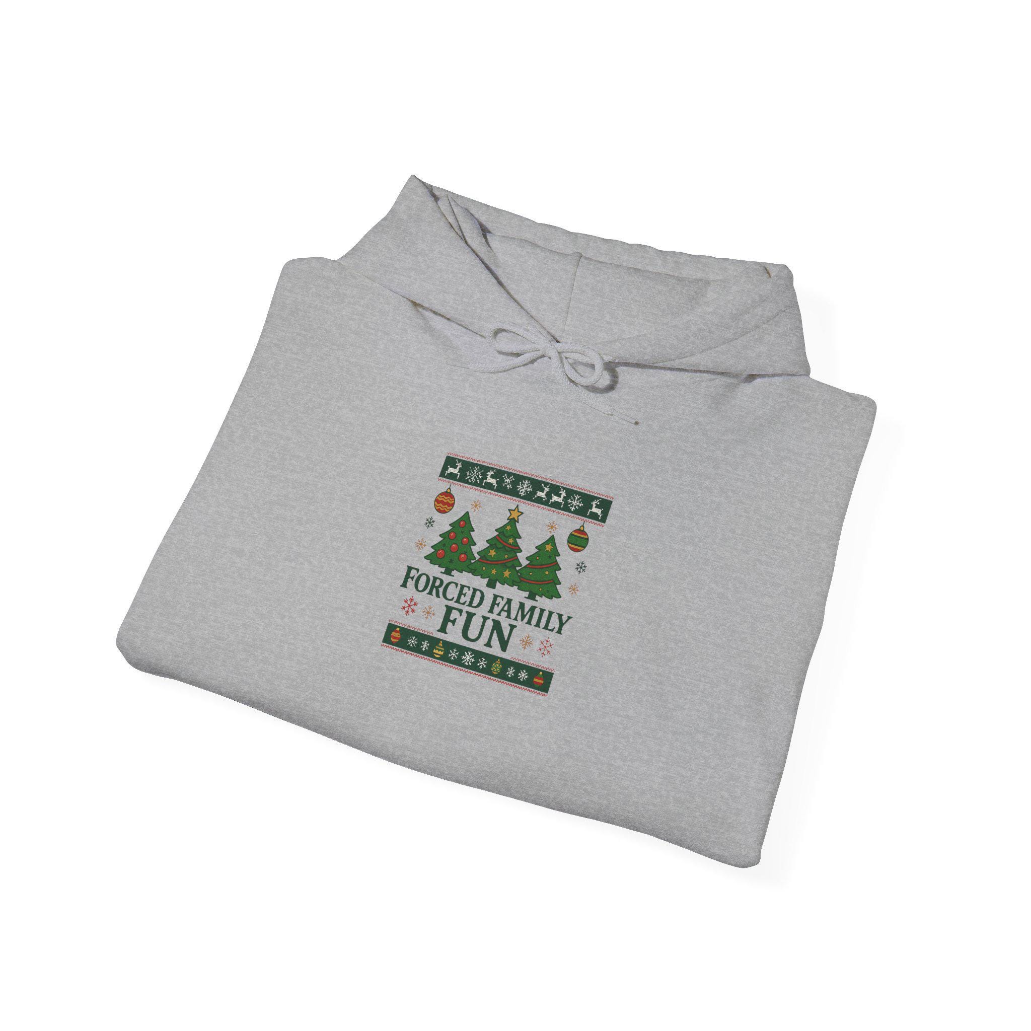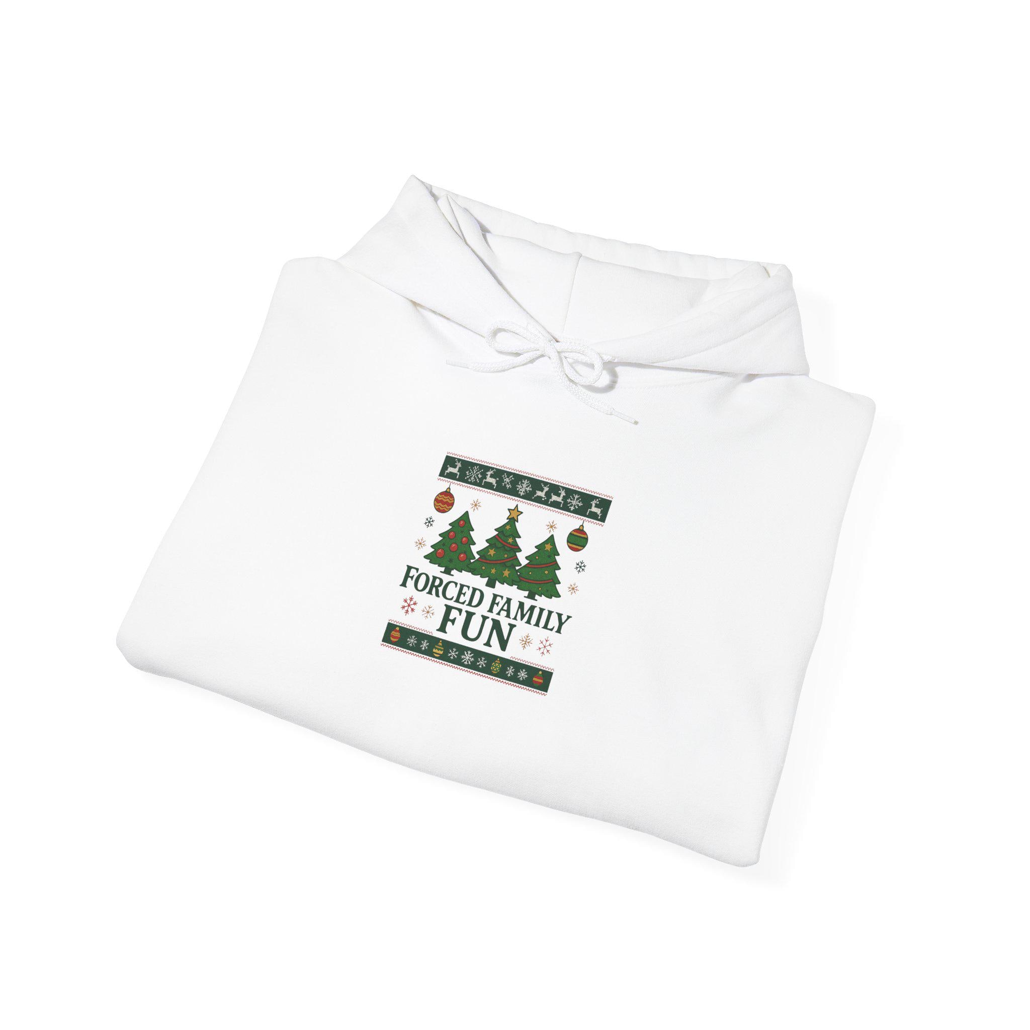 Holiday family humor in a holiday sweatshirt with a humorous slogan "Forced Family Fun" in an ugly sweater take that gives off a festive and fun vibe. Perfect for those who enjoy quirky and playful holiday apparel. Relevant for Christmas and other holiday celebrations.