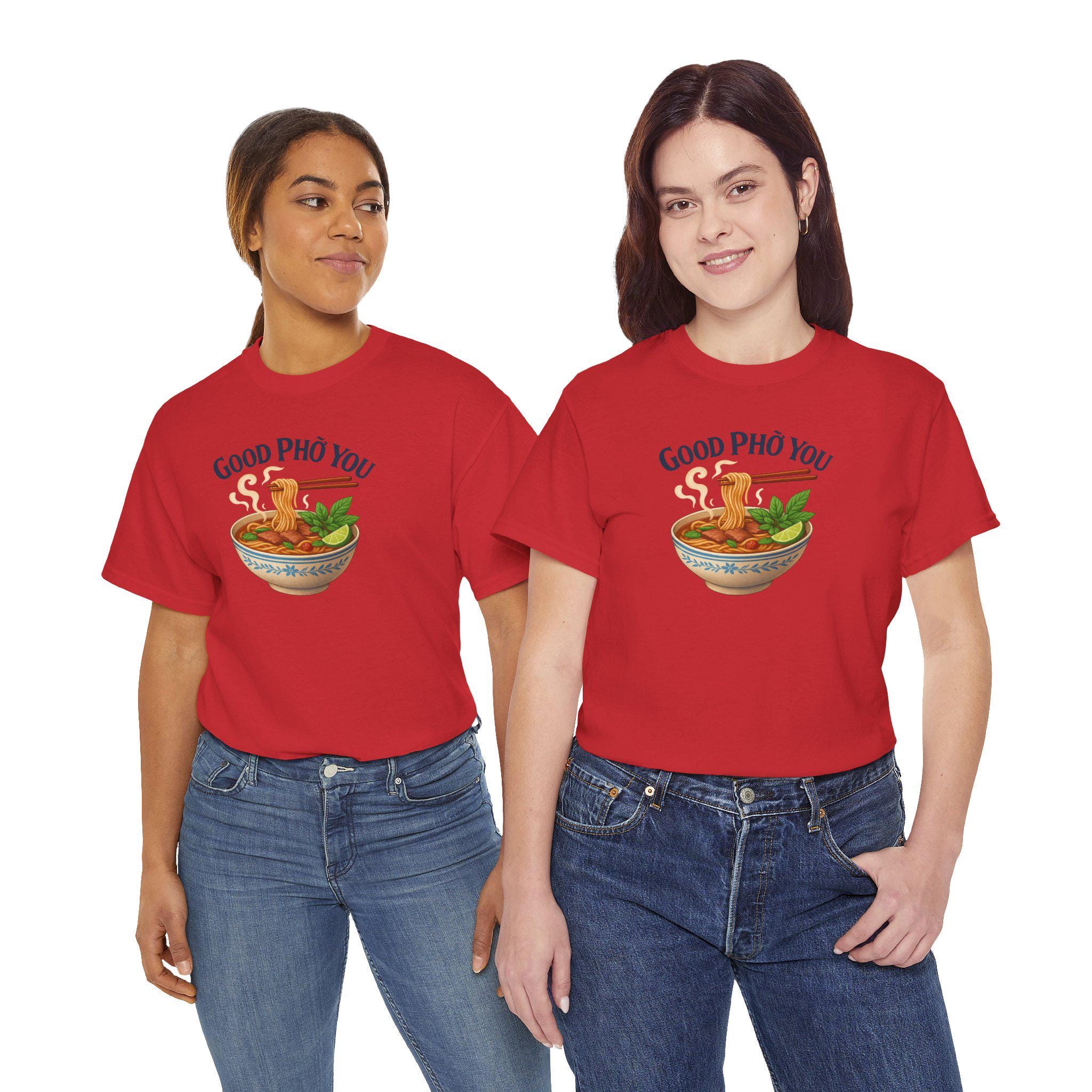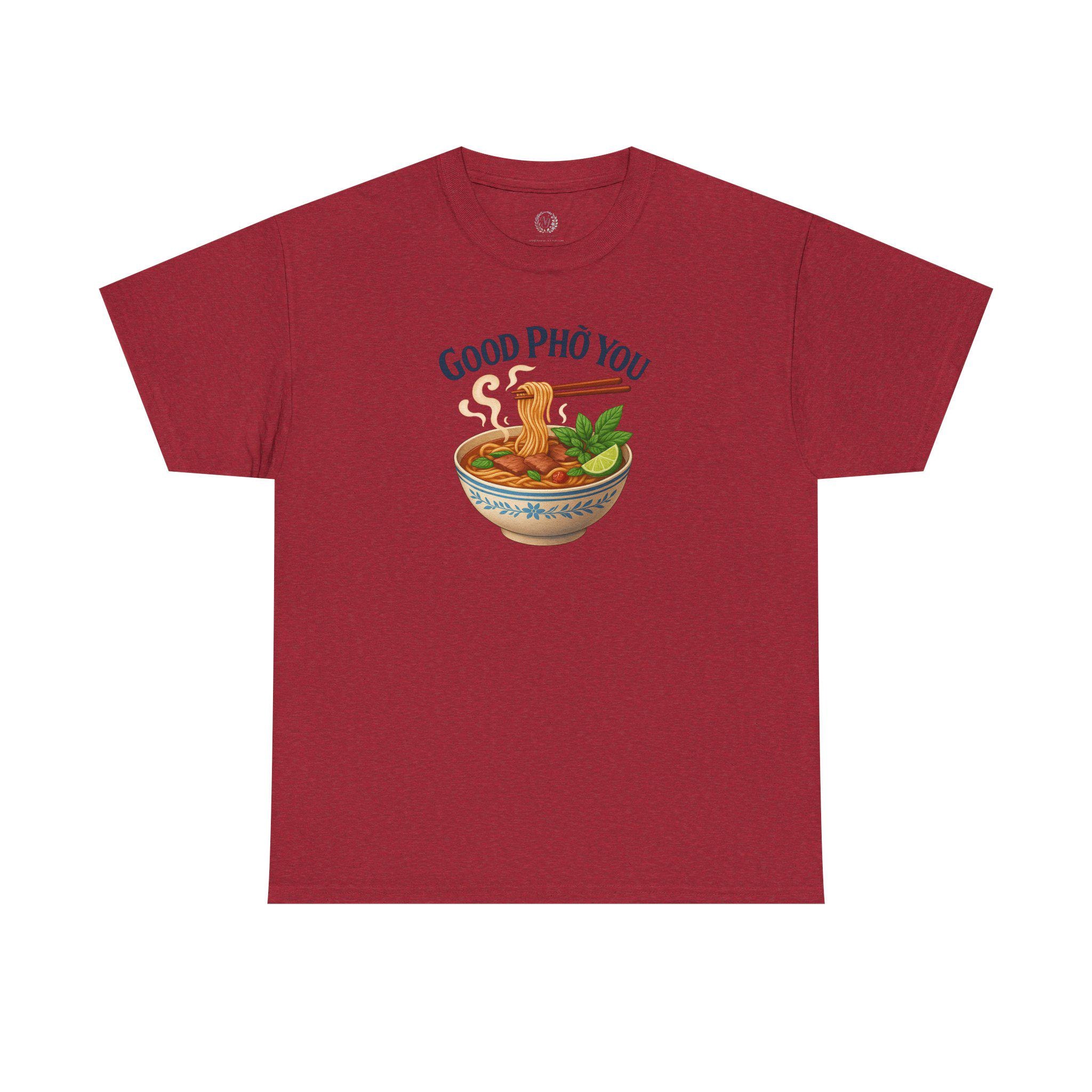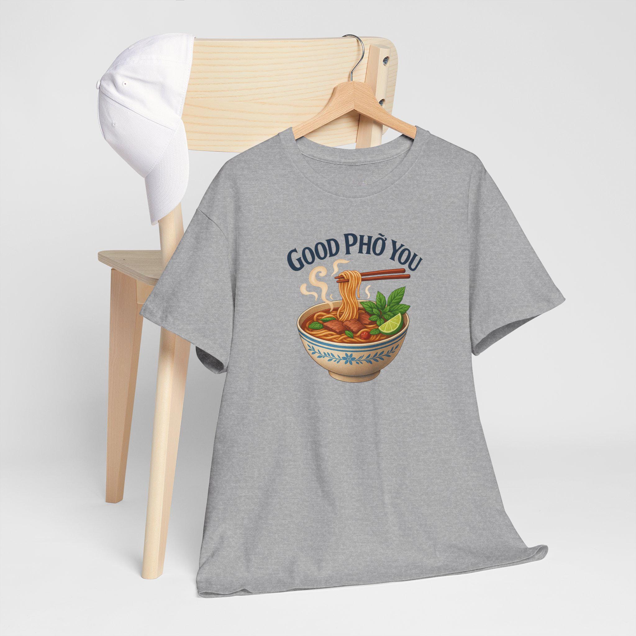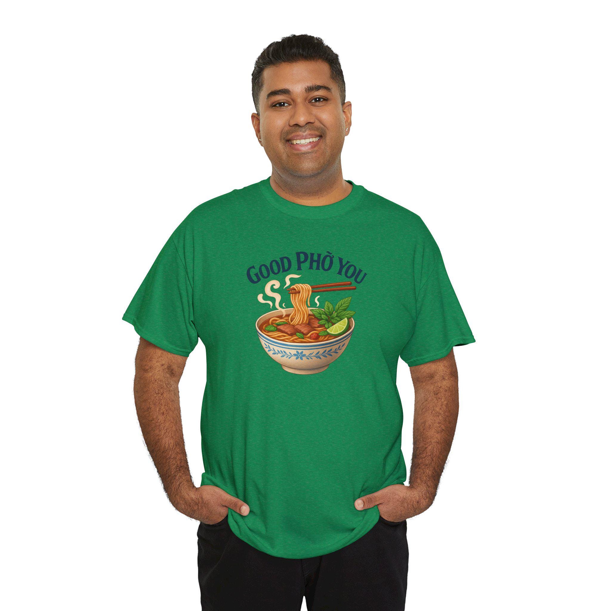 This tee brings a sly, food-loving wink to lazy afternoons and late-night takeout runs. Soft, substantial cotton holds the graphic with clean lines, so the cheeky "Good Pho You" message stays bold wash after wash. Wear it to noodle shops, weekend markets, or while experimenting with broth at home — it feels lived-in from the first wear and ages with character. The relaxed, classic fit layers easily under a jacket or over a long-sleeve for cooler nights. It’s for people who laugh at puns, collect new restaurant recommendations, and treat every meal like a small celebration.