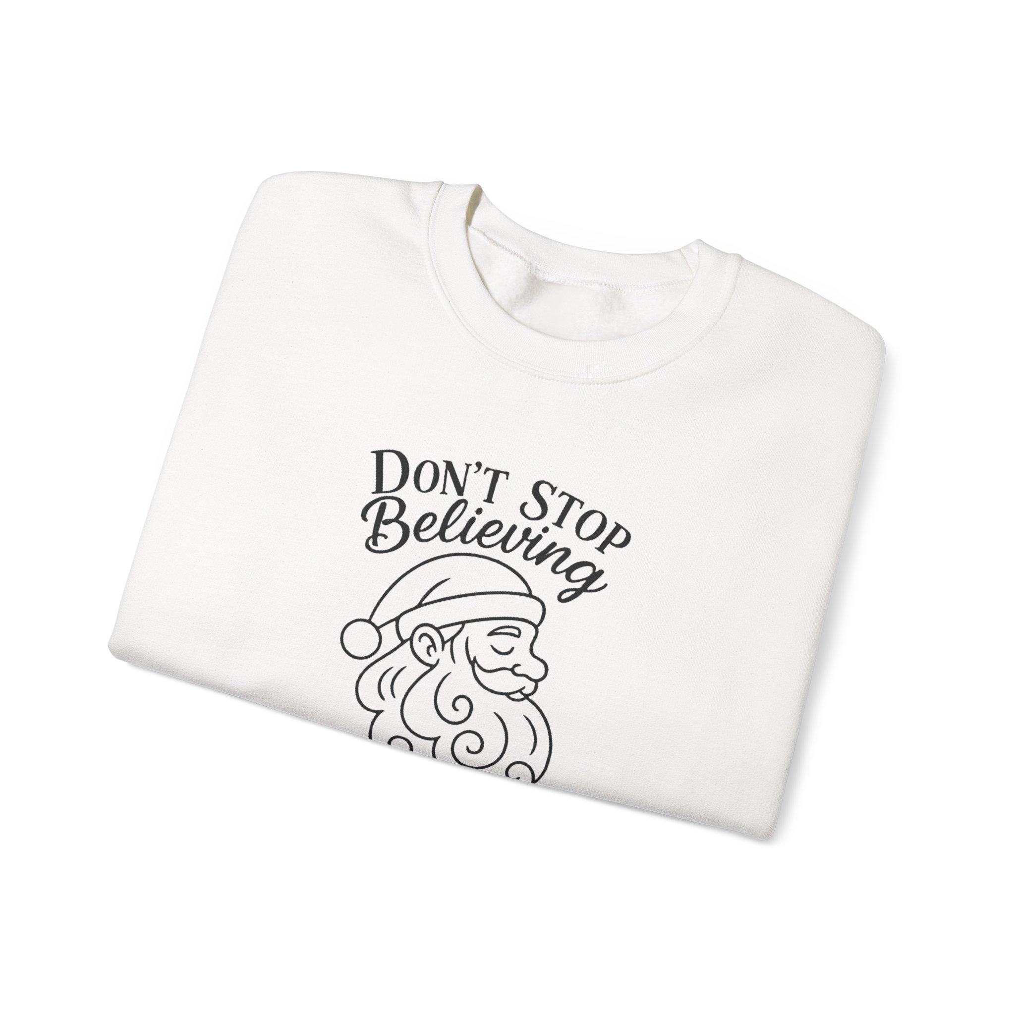 Spread some holiday cheer with this funny Don't Stop Believing Santa Christmas Humor Crewneck Sweatshirt. Perfect for those who love holiday movie humor, this unisex holiday humor pullover is cozy and stylish. It's great for wearing during Christmas celebrations or as a humorous gift for family and friends.