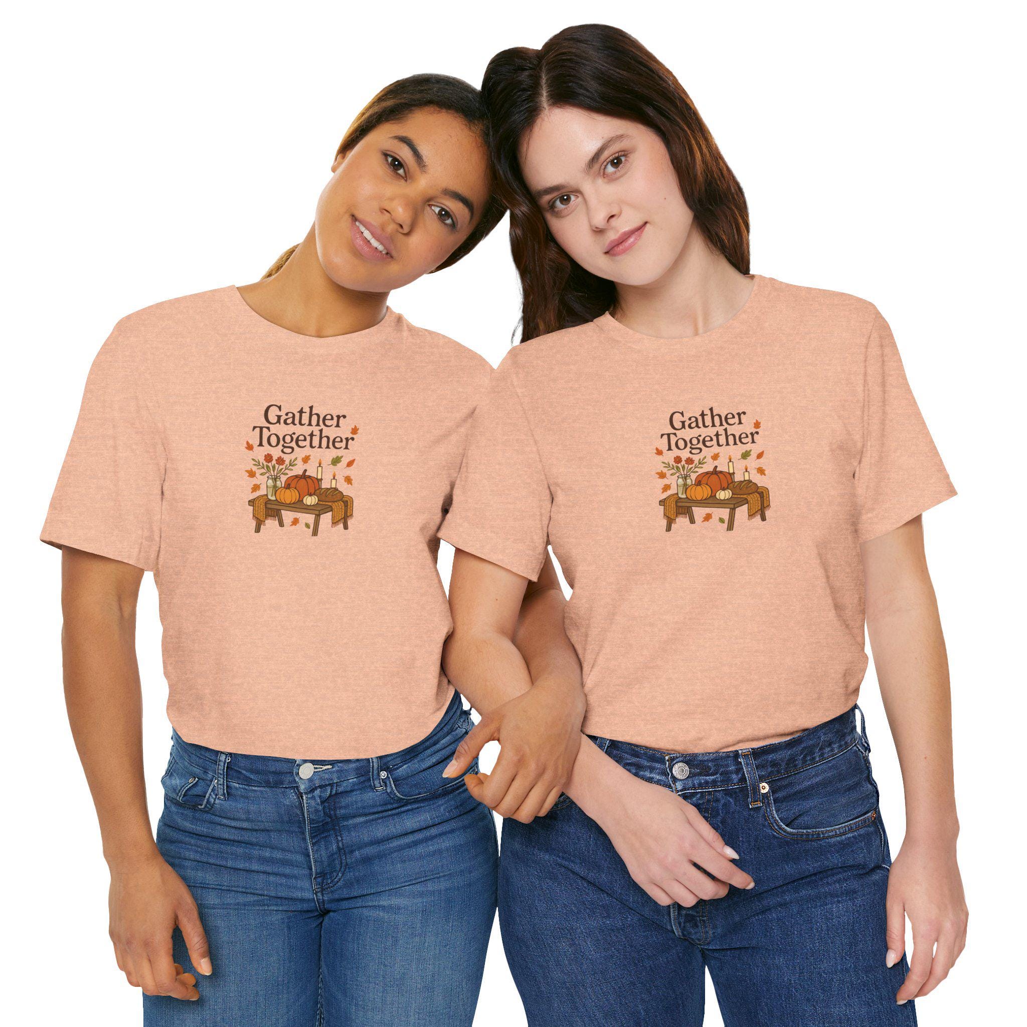 Warmth that feels like a kitchen full of laughter and slow-simmered stew. This lightweight jersey tee wears the season with quiet charm: a rustic table piled with pumpkins, candles, and falling leaves beneath the gentle phrase “Gather Together.” Soft to the touch and breathable, it layers easily under a cardigan or stands on its own while you bring people around the table. It settles into weekend errands, cozy prep for a dinner, or a relaxed evening hosting friends. The look reads homey and handcrafted — a subtle nod to shared meals, long conversations, and the small rituals that make autumn evenings feel complete.