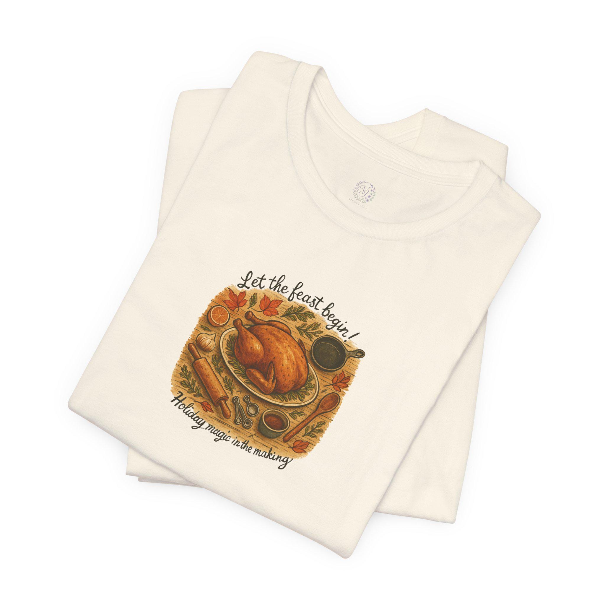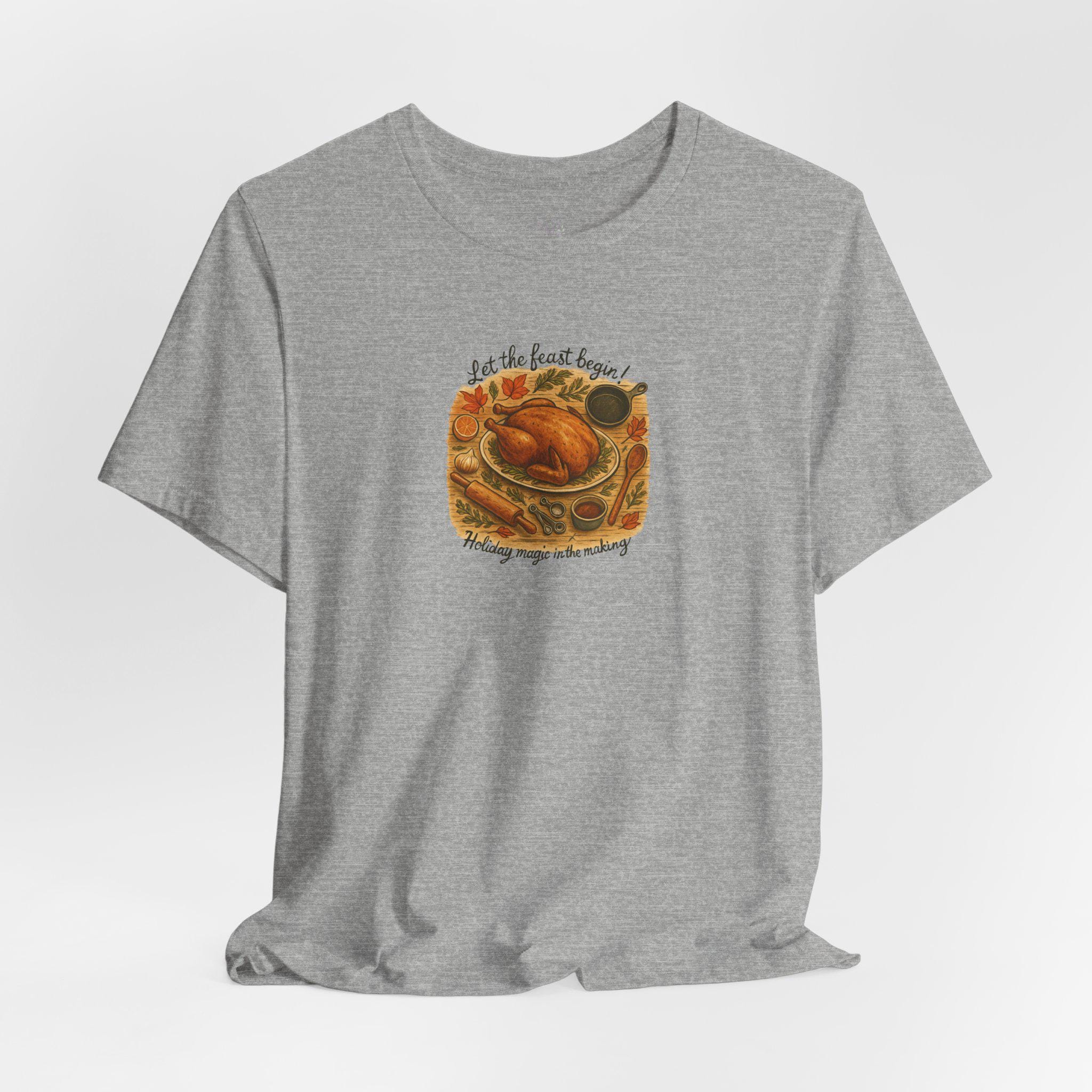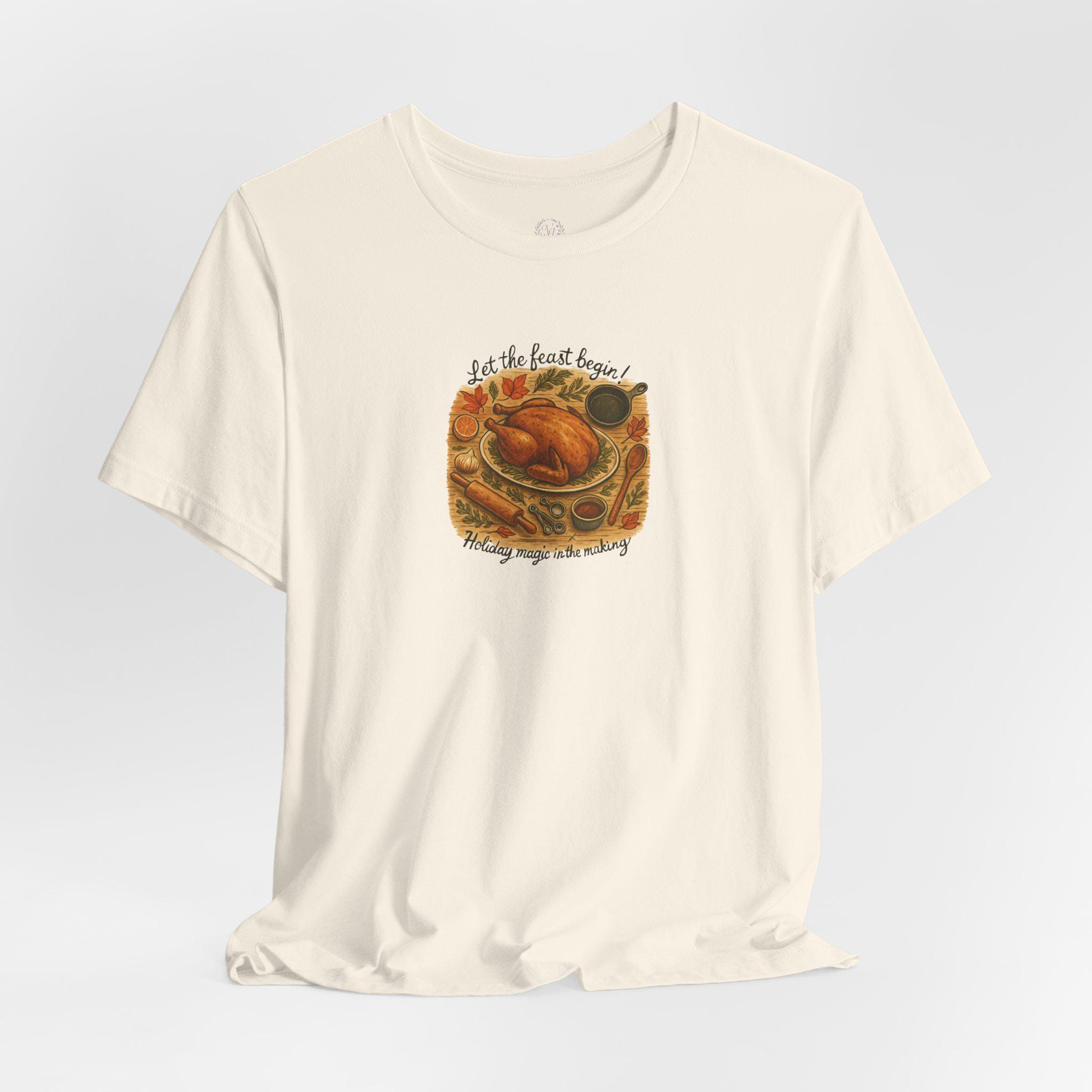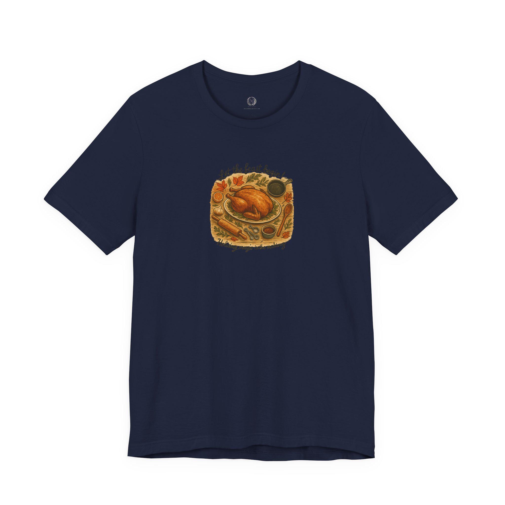 This lightweight jersey tee carries a warm, homespun holiday vibe with a hand-illustrated roast turkey centerpiece and cozy kitchen details. Soft Airlume combed and ring-spun cotton keeps it breathable for long family gatherings, while the retail crew neck and neat fit make it easy to layer under a cardigan or wear solo. The design’s vintage color palette—golden browns, muted oranges, and herb-green accents—feels like a kitchen full of spice and laughter. Wear it to cook, pass platters, or linger by the table; it’s made to feel lived-in from the first wash and to bring that slow, savory moment of the season into everyday wear.