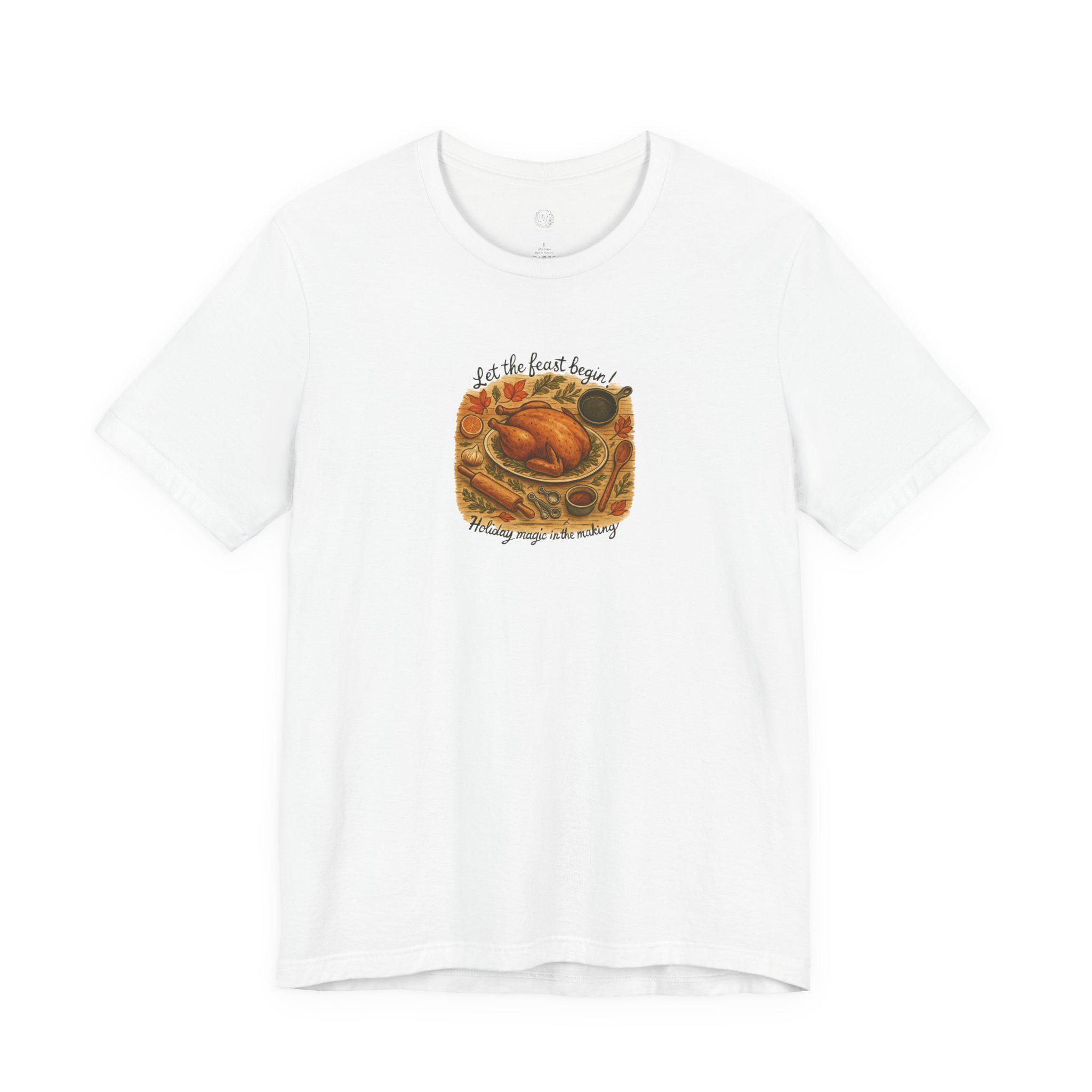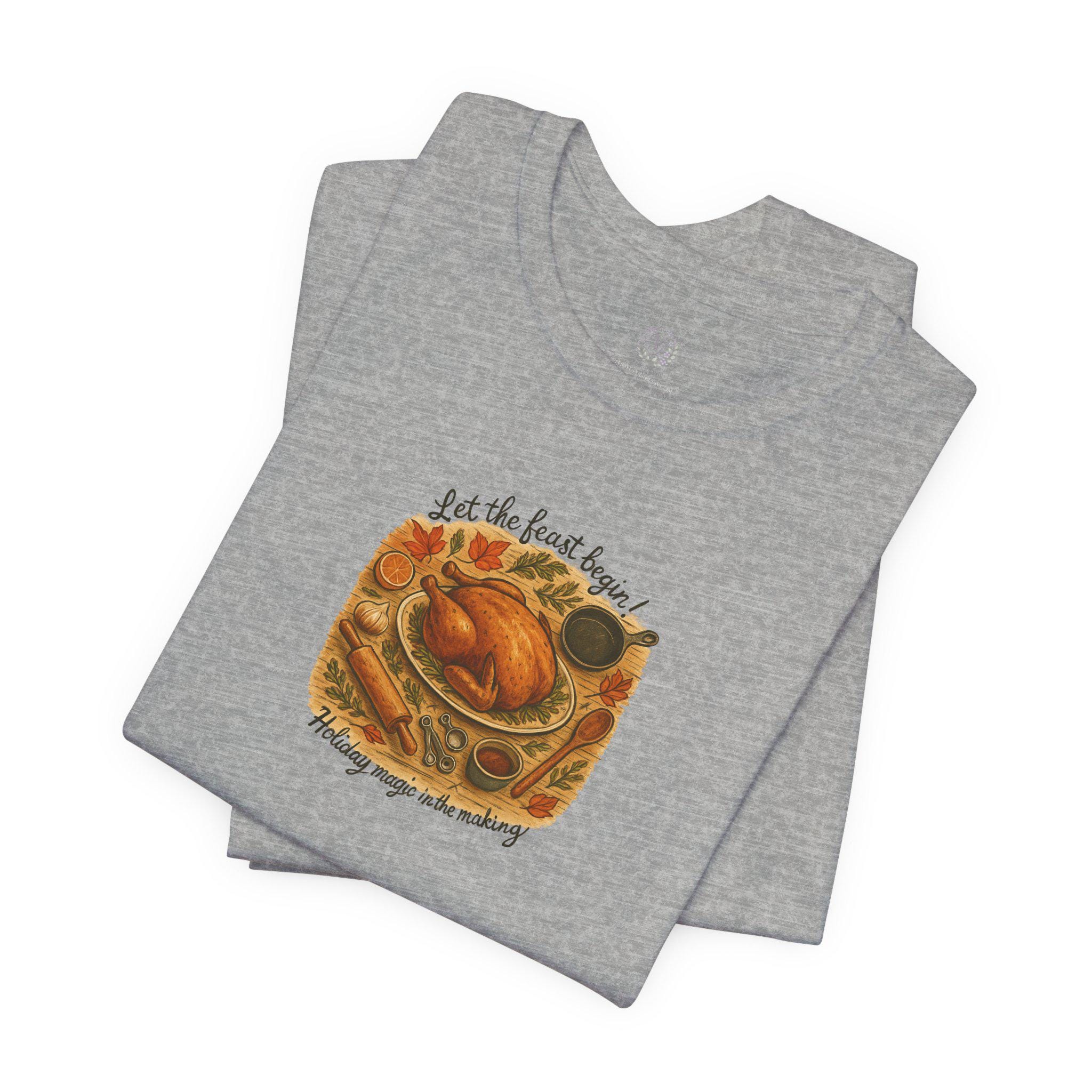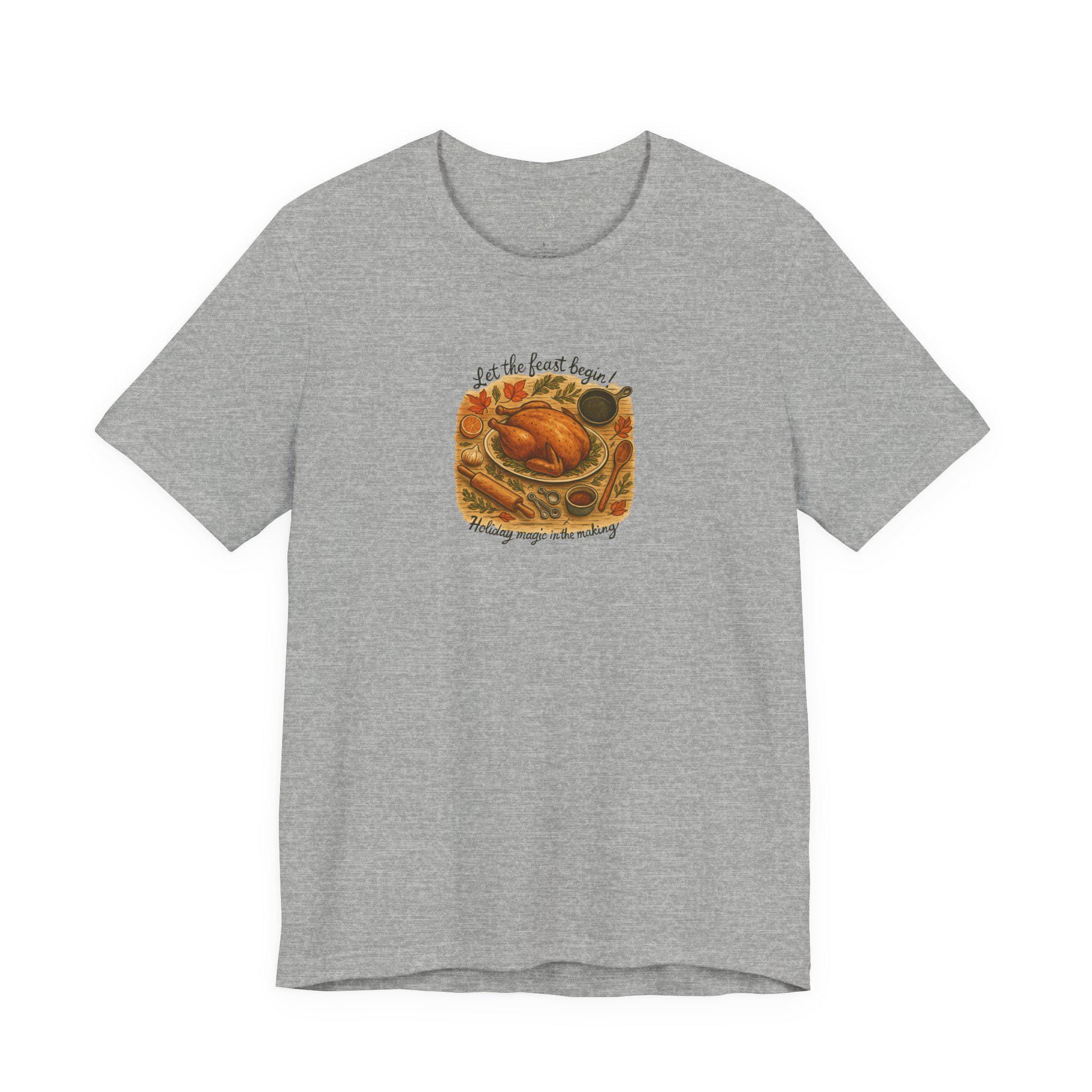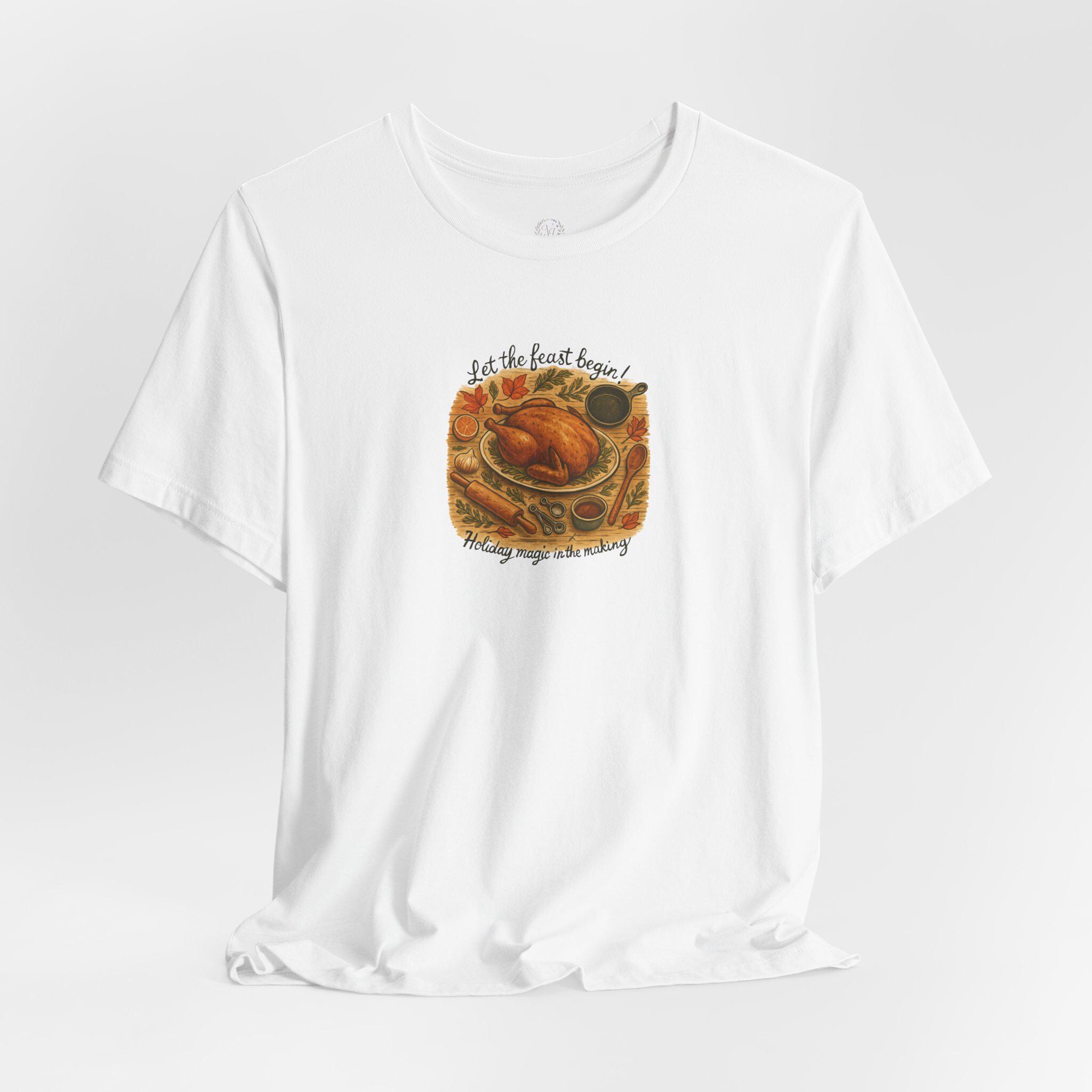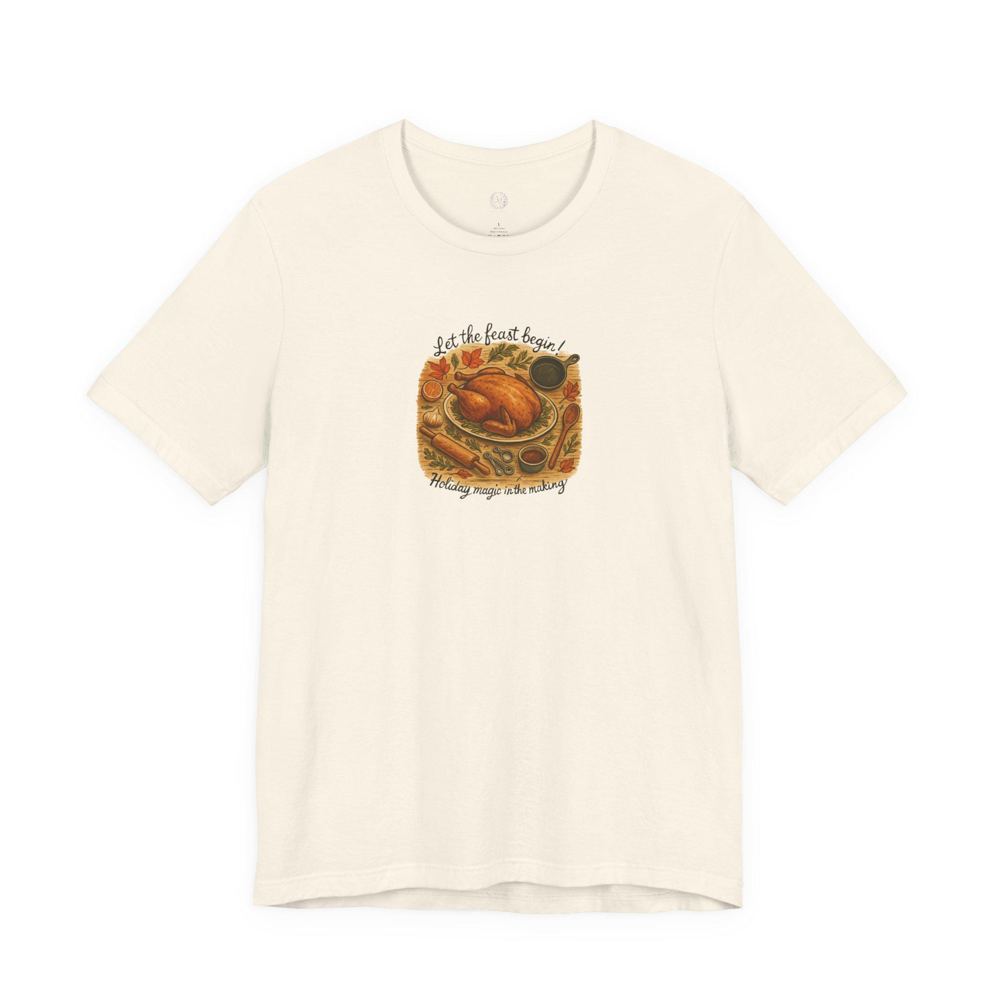 This lightweight jersey tee carries a warm, homespun holiday vibe with a hand-illustrated roast turkey centerpiece and cozy kitchen details. Soft Airlume combed and ring-spun cotton keeps it breathable for long family gatherings, while the retail crew neck and neat fit make it easy to layer under a cardigan or wear solo. The design’s vintage color palette—golden browns, muted oranges, and herb-green accents—feels like a kitchen full of spice and laughter. Wear it to cook, pass platters, or linger by the table; it’s made to feel lived-in from the first wash and to bring that slow, savory moment of the season into everyday wear.