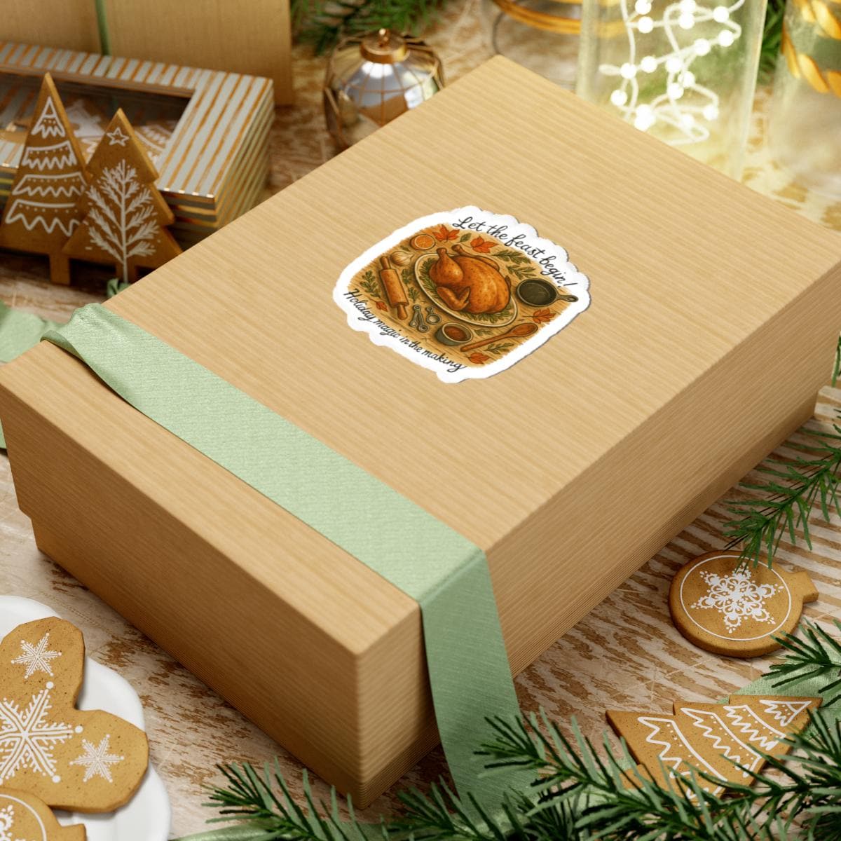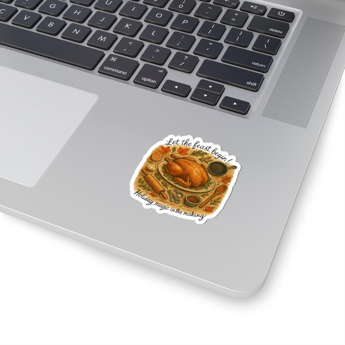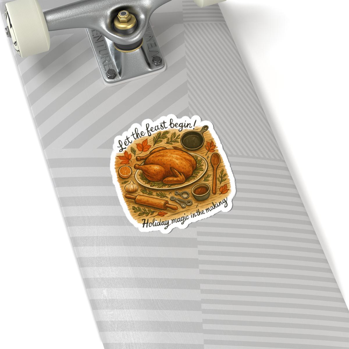 A warm, seasonal kiss-cut sticker that captures the cozy chaos of holiday cooking. Hand-illustrated in rich autumnal tones, the design centers on a golden roast turkey surrounded by herbs, citrus, and kitchen tools, with the phrases “Let the feast begin!” and “Holiday magic in the making.” The glossy finish gives colors a luminous pop while protecting the art from light scuffs. Sized to fit laptops, journals, and recipe boxes, this sticker brings a touch of festive kitchen nostalgia to everyday gear — a little reminder of gatherings, simmering spices, and the slow, delicious work of feeding people you love.