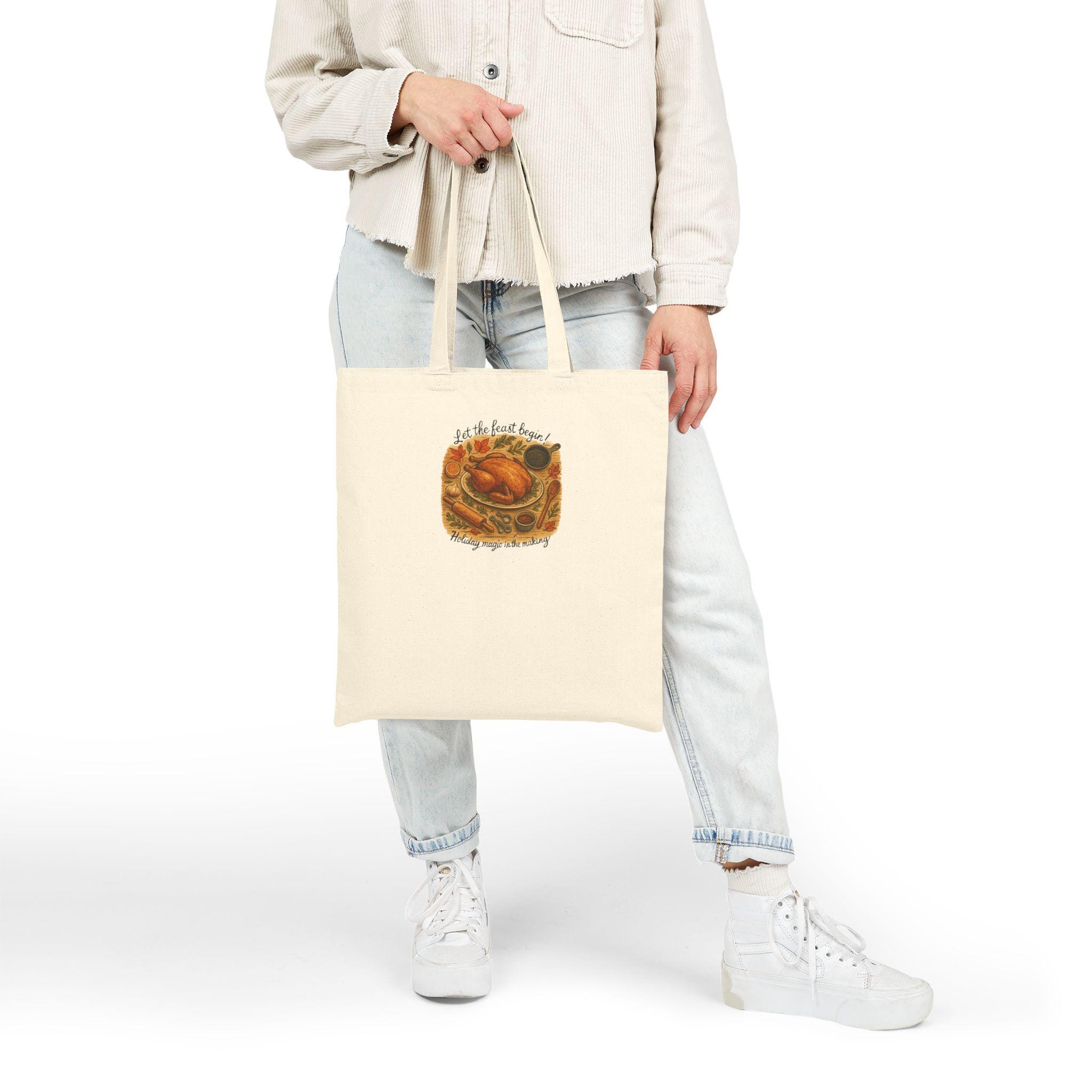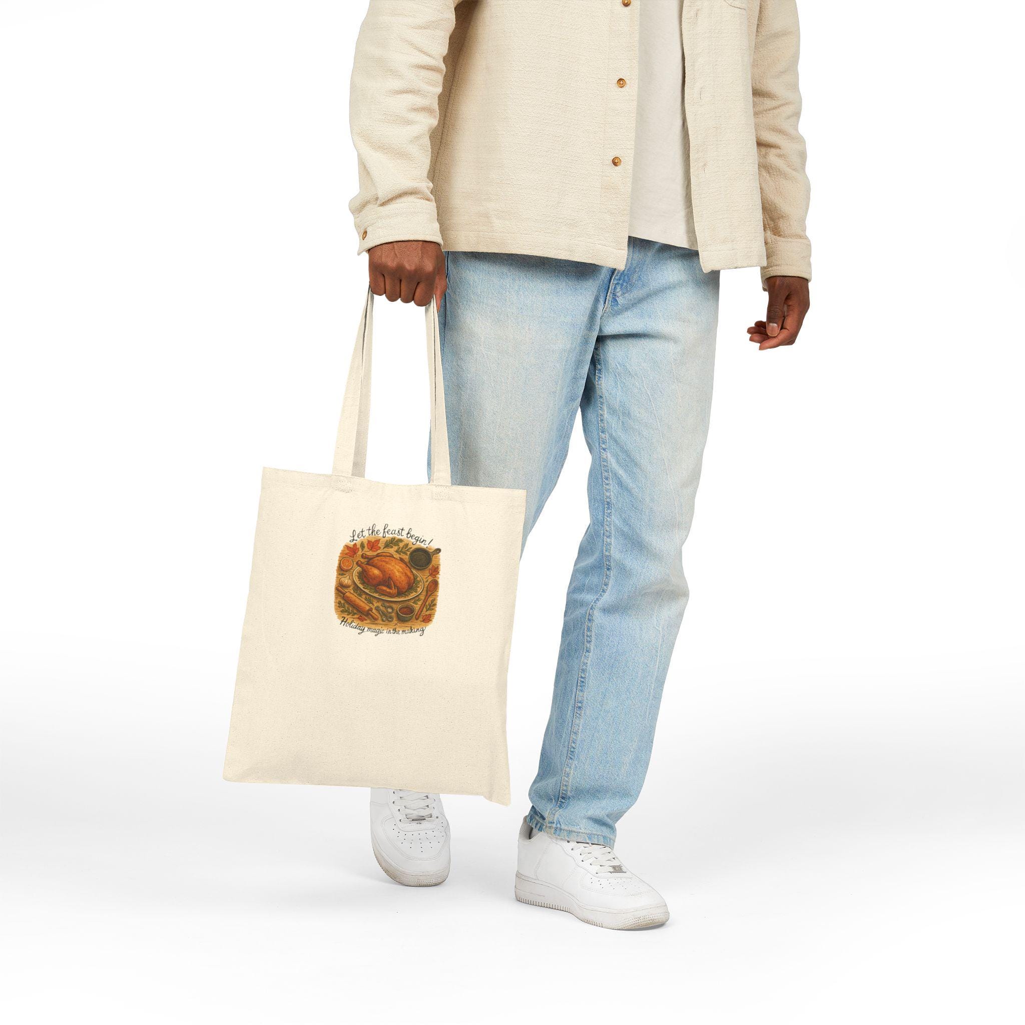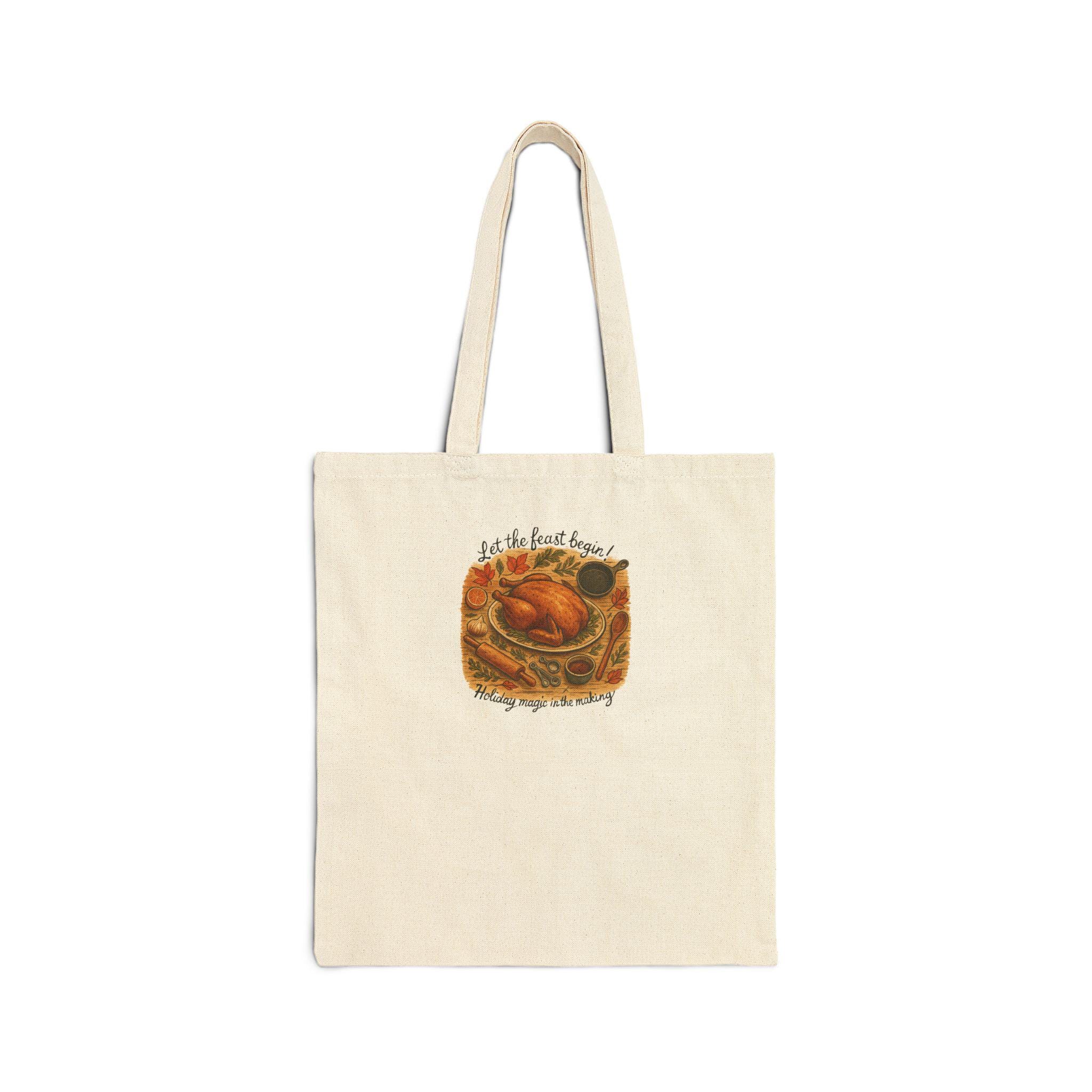 This sturdy cotton canvas tote carries the warmth of a family table. The printed roast turkey and harvest spread sit softly on heavy natural canvas, inviting memories of slow-roasted dinners and laughter around the table. It’s roomy enough for a market run or a weekend of cozy errands, yet light enough to sling over a shoulder. The reinforced self-fabric handles and flat corners give it a utilitarian feel while the autumnal artwork keeps it charming and seasonal. Bring a touch of home-cooked comfort to grocery trips, farmer’s markets, or holiday gatherings.