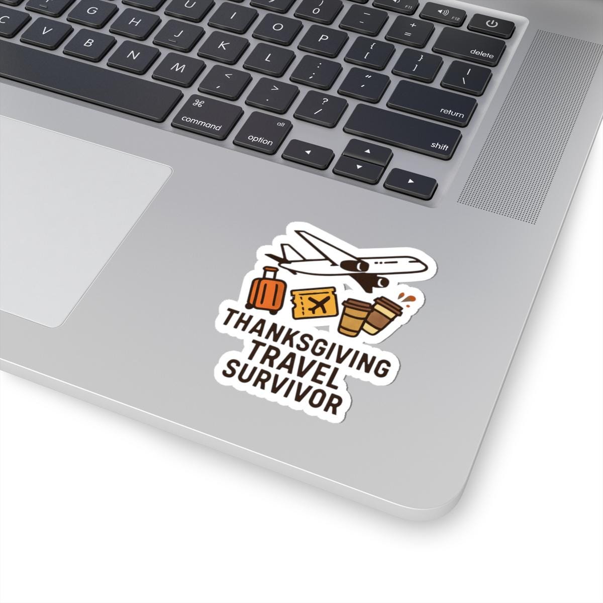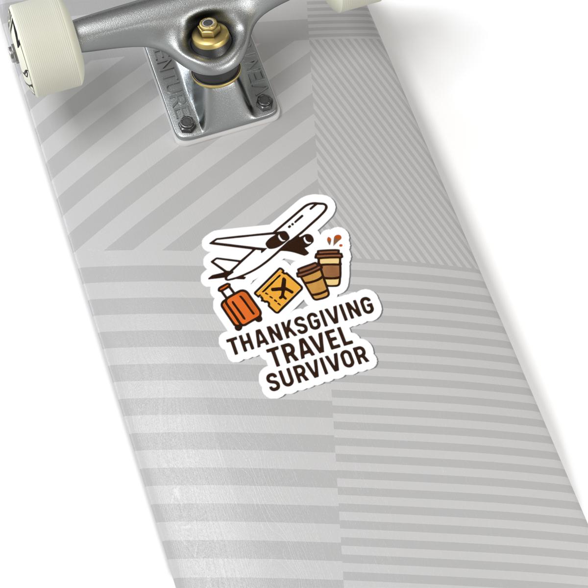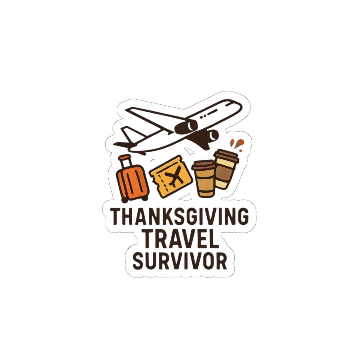 This glossy kiss-cut sticker captures the frazzled, triumphant spirit of holiday travel with a playful illustration: an airplane, luggage, coffee cups and a boarding pass clustered above the bold phrase “THANKSGIVING TRAVEL SURVIVOR.” Stick it on laptops, journals, water bottles, or travel gear to quietly celebrate making it through crowded terminals, delayed flights, and family logistics. The bright, eco-solvent inks and glossy finish give the tiny scene a pop of warmth and humor — a little badge of honor for anyone who’s navigated the holiday rush and lived to tell the tale.