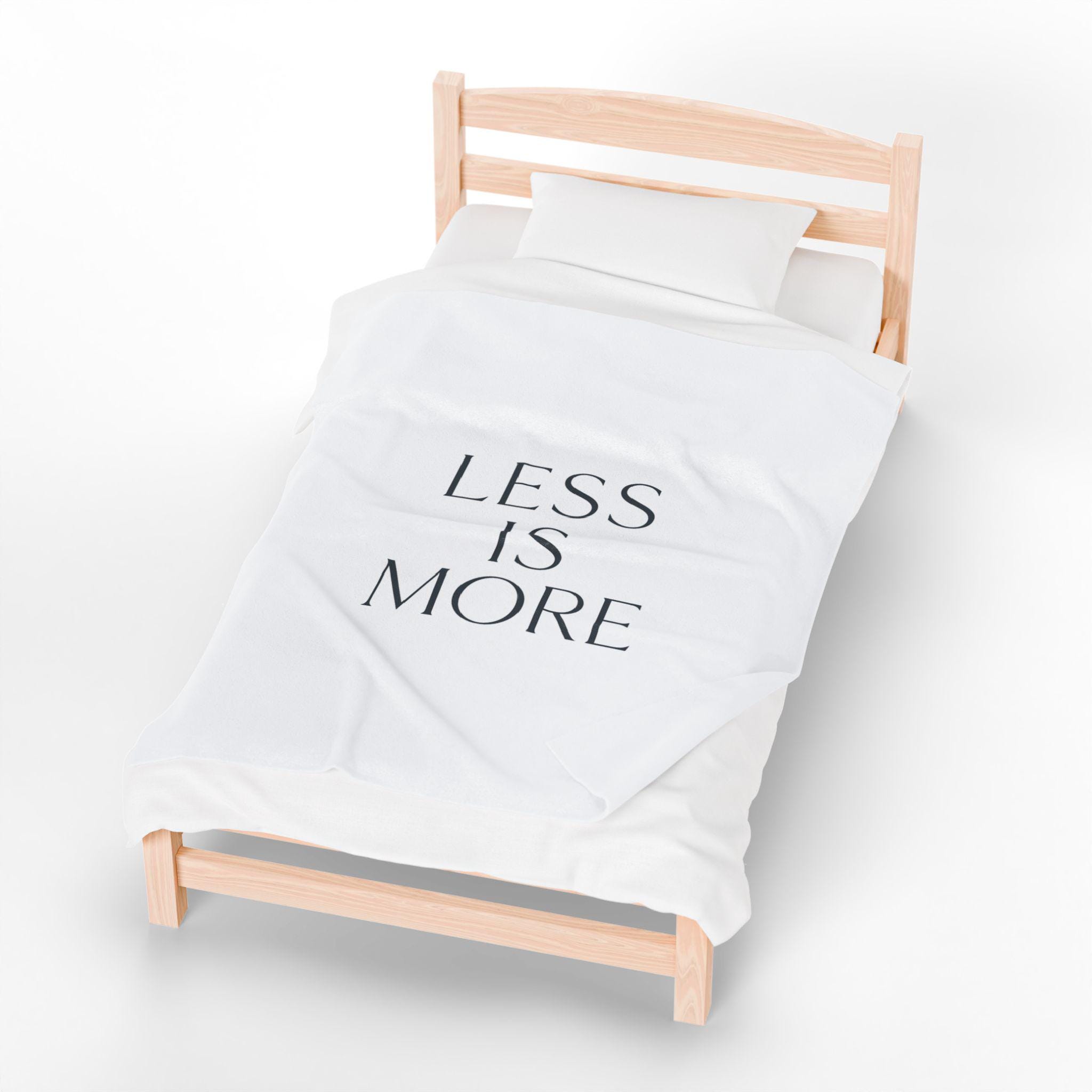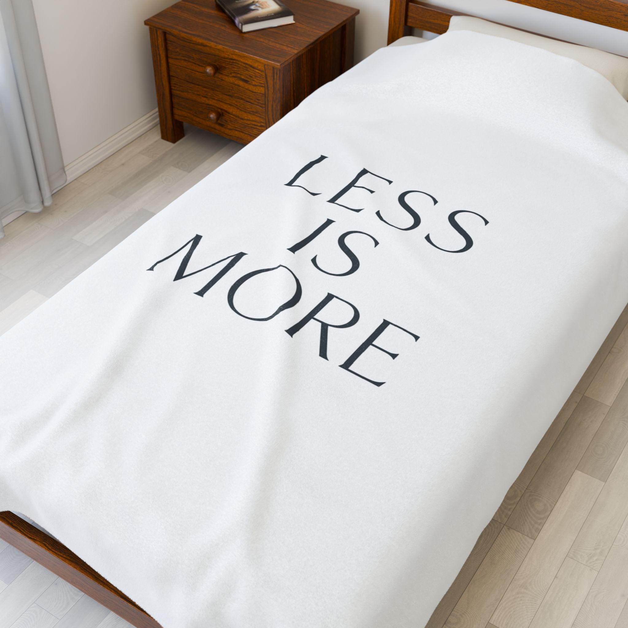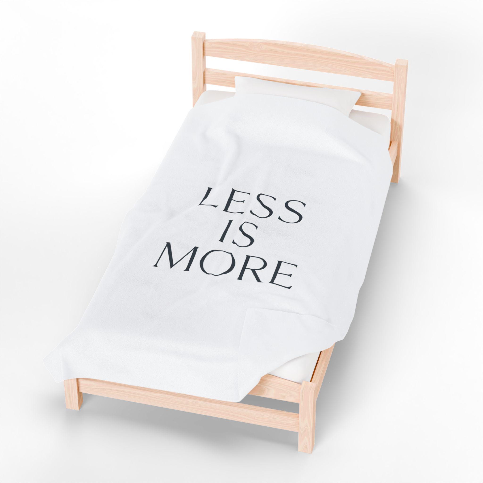 Soft, quietly stylish velveteen blanket printed with a minimalist “LESS IS MORE” message. The medium-weight plush feels warm without weight, draping easily over shoulders or the end of a bed. Subtle topstitching reinforces the edges so this blanket stays neat through repeated use. Its clean white field and refined type make it a calm accent in a modern living room, a cozy layer for late-night reading, or a gentle backdrop during slow weekend mornings. Designed for adults who appreciate simple, intentional interiors and tactile comfort.