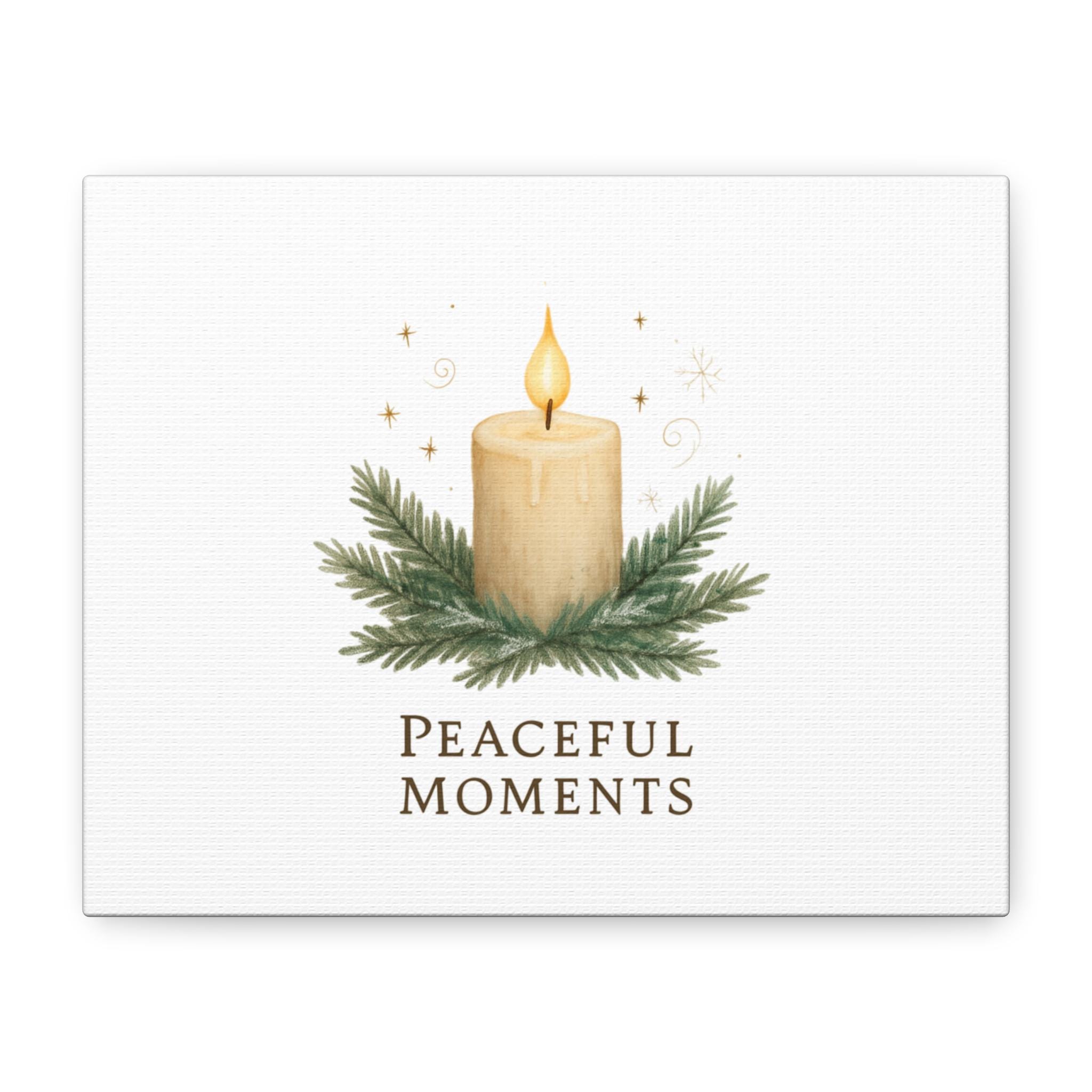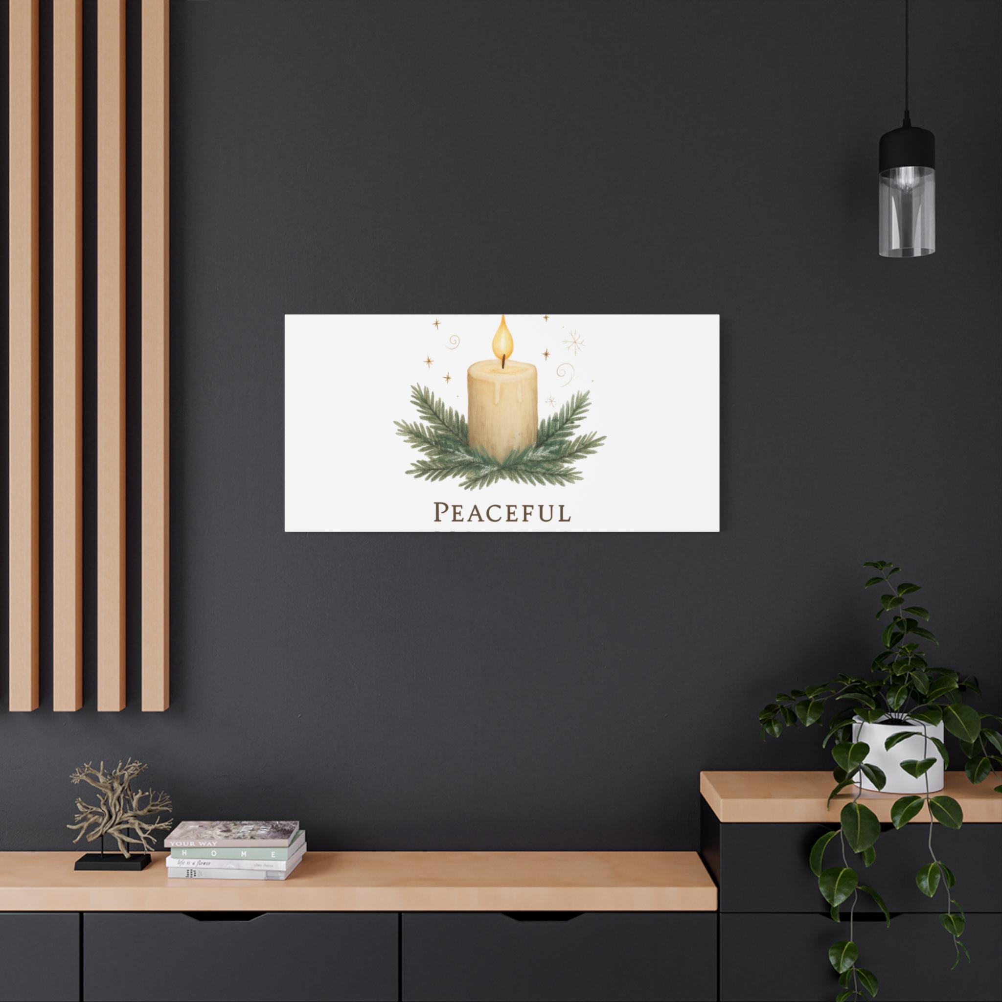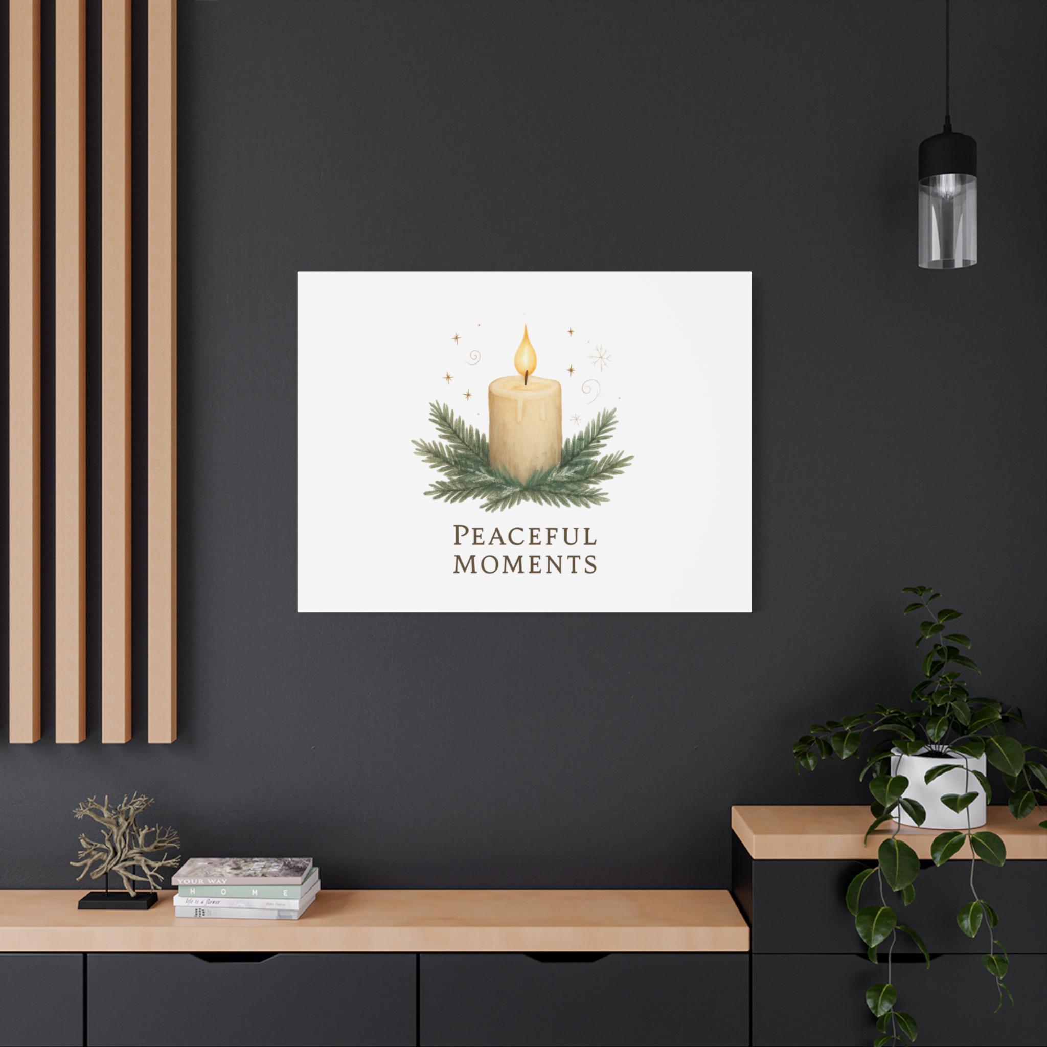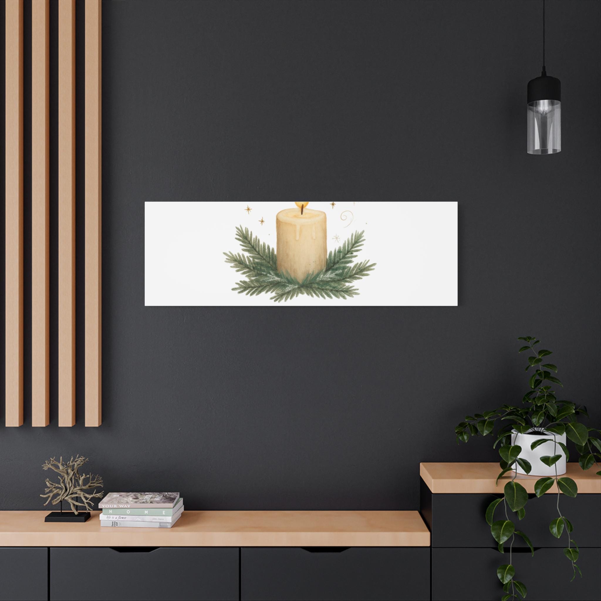 Soft and serene, this stretched matte canvas brings a quiet, candlelit moment into any room. A warm ivory candle rests on a bed of pine sprigs, tiny gold sparks drifting upward — an image that reads like a slow exhale. The muted palette and textured matte finish give the artwork a hand-painted feel that calms a hallway, living room, or cozy reading nook. Lightweight yet substantial, the canvas arrives ready to hang and sits flush against the wall thanks to soft rubber dots that protect surfaces and keep the frame steady. Printed with low-VOC, UL-certified Greenguard Gold latex inks on a cotton-poly canvas and mounted on responsibly sourced pine, it blends quiet beauty with mindful materials.