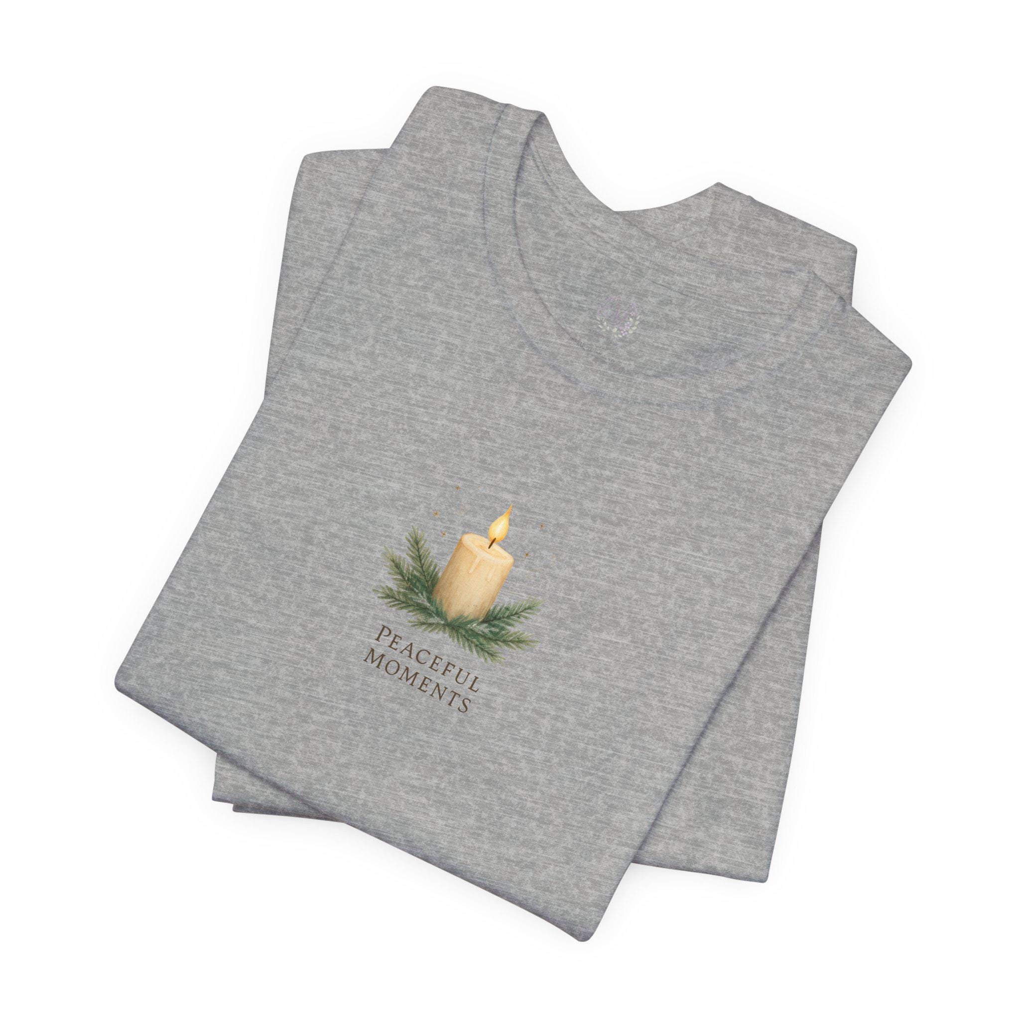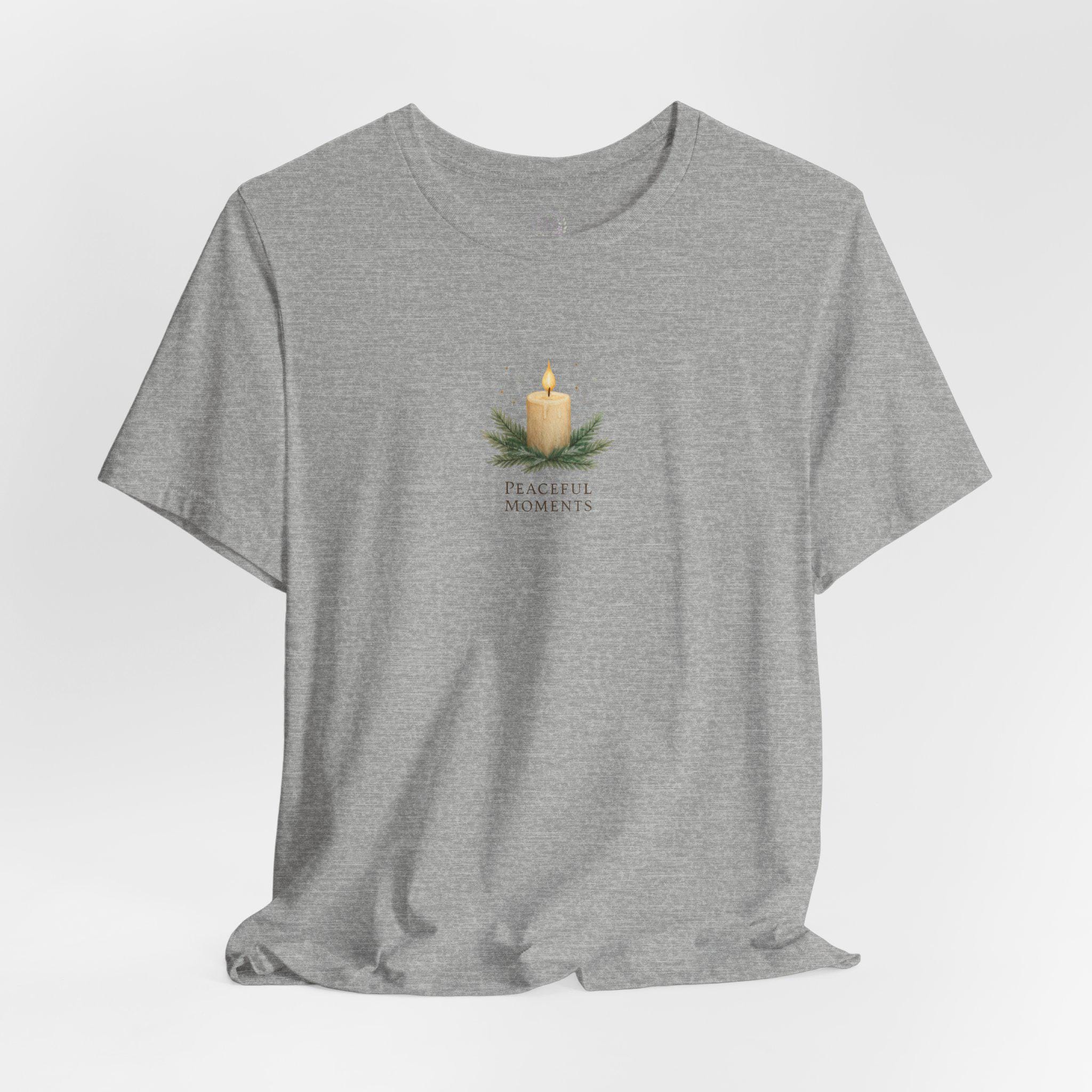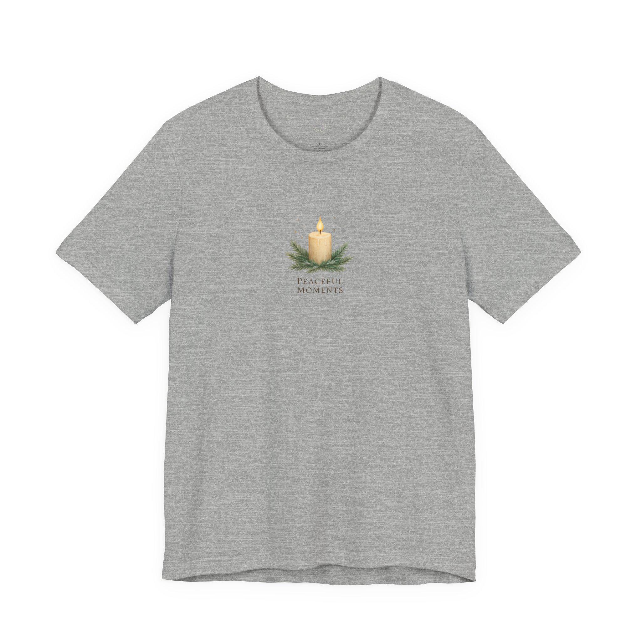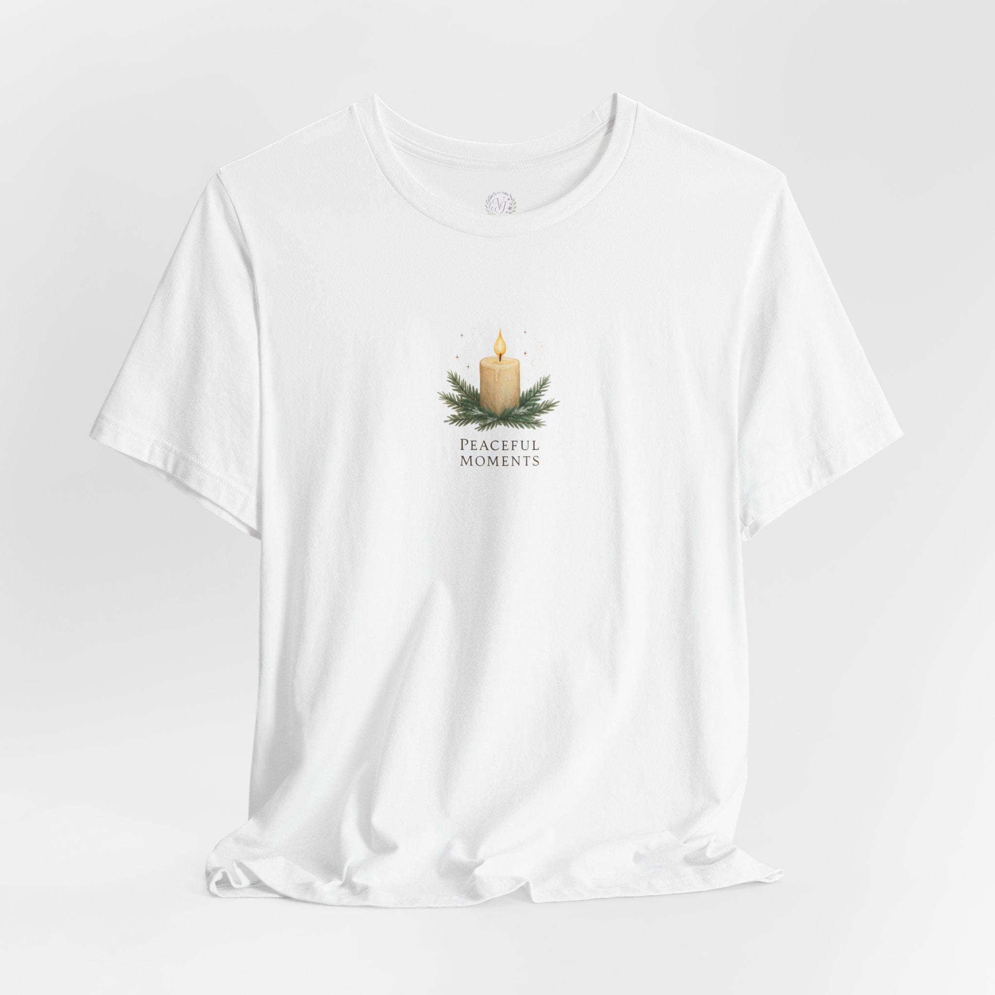 A soft, breathable tee that channels quiet, reflective moments. The lightweight Airlume combed cotton feels gentle against skin while the ribbed crew neck and shoulder tape keep the silhouette neat after repeated wear. A hand-painted candle and evergreen sprig sit at the center, accompanied by the understated words “Peaceful Moments.” It reads like a quiet pause — a shirt for slow mornings, candlelit evenings, and small rituals that slow time. Wear it layered under a cardigan for mellow afternoons, or alone when you want a simple reminder to breathe and be present.